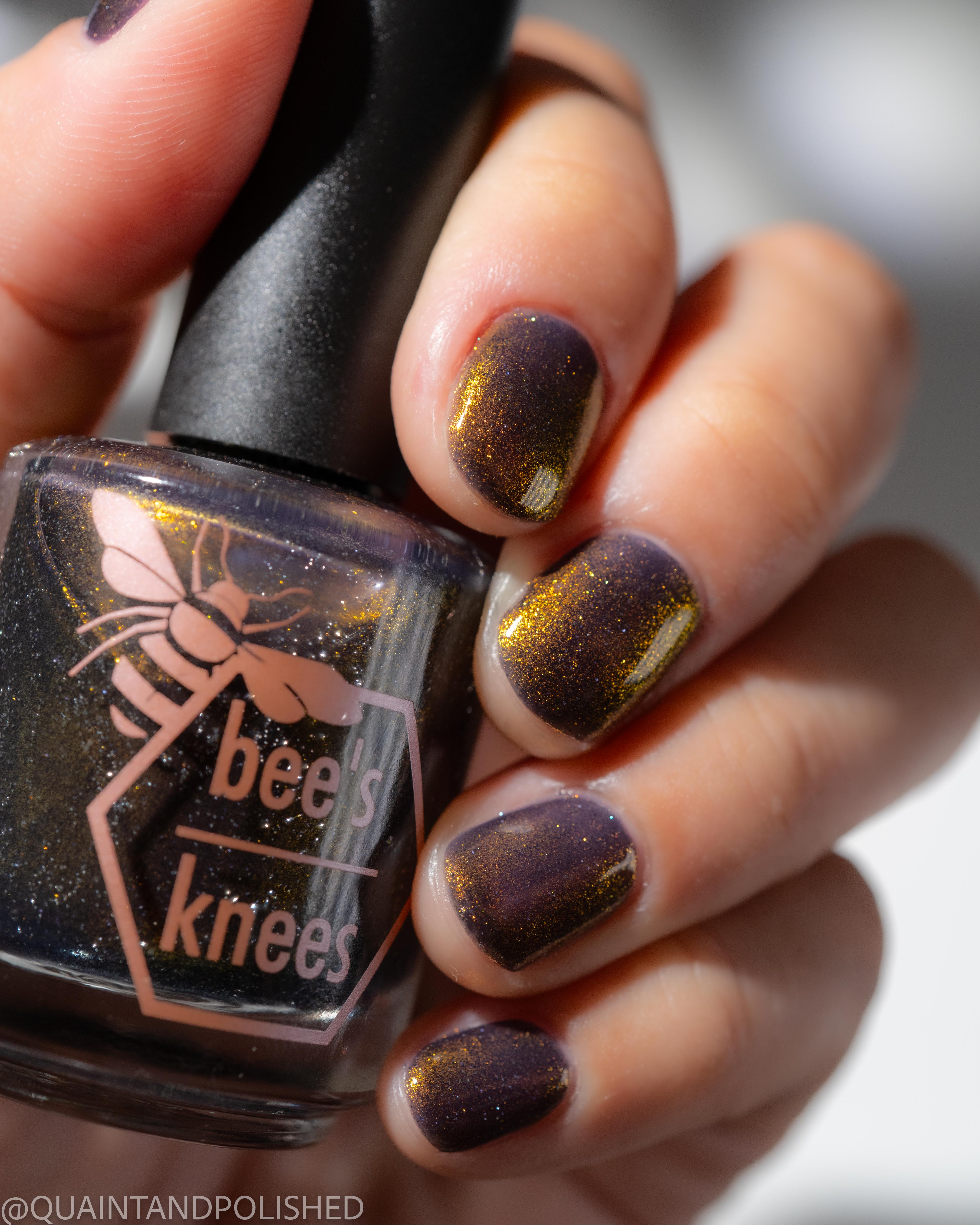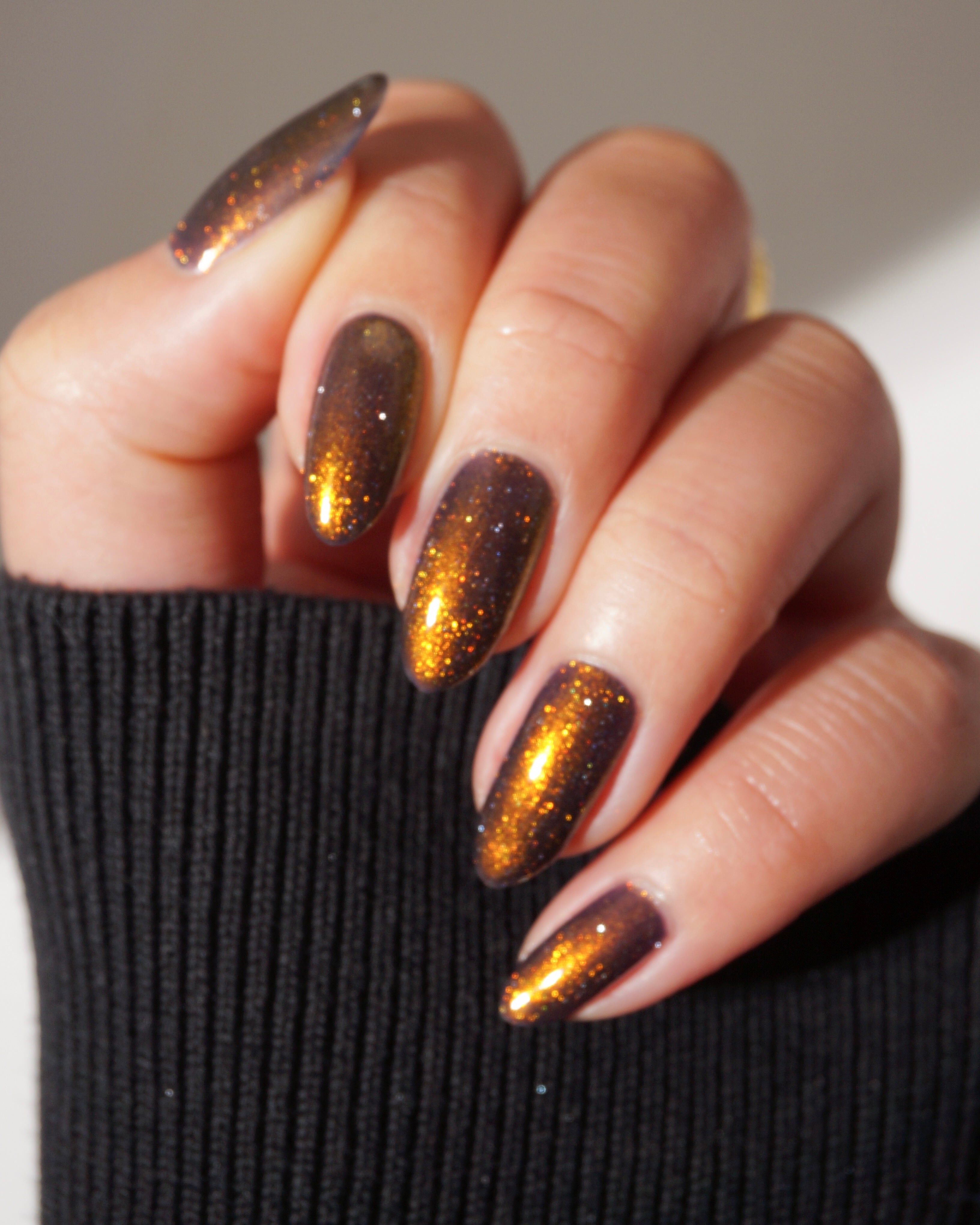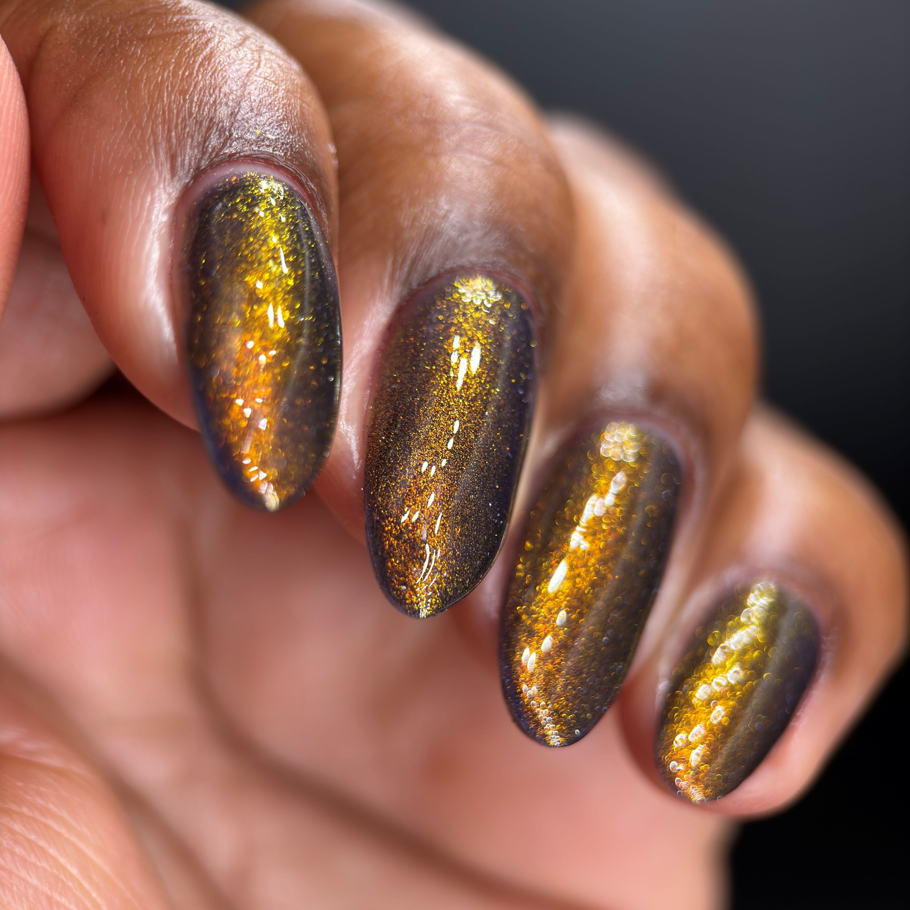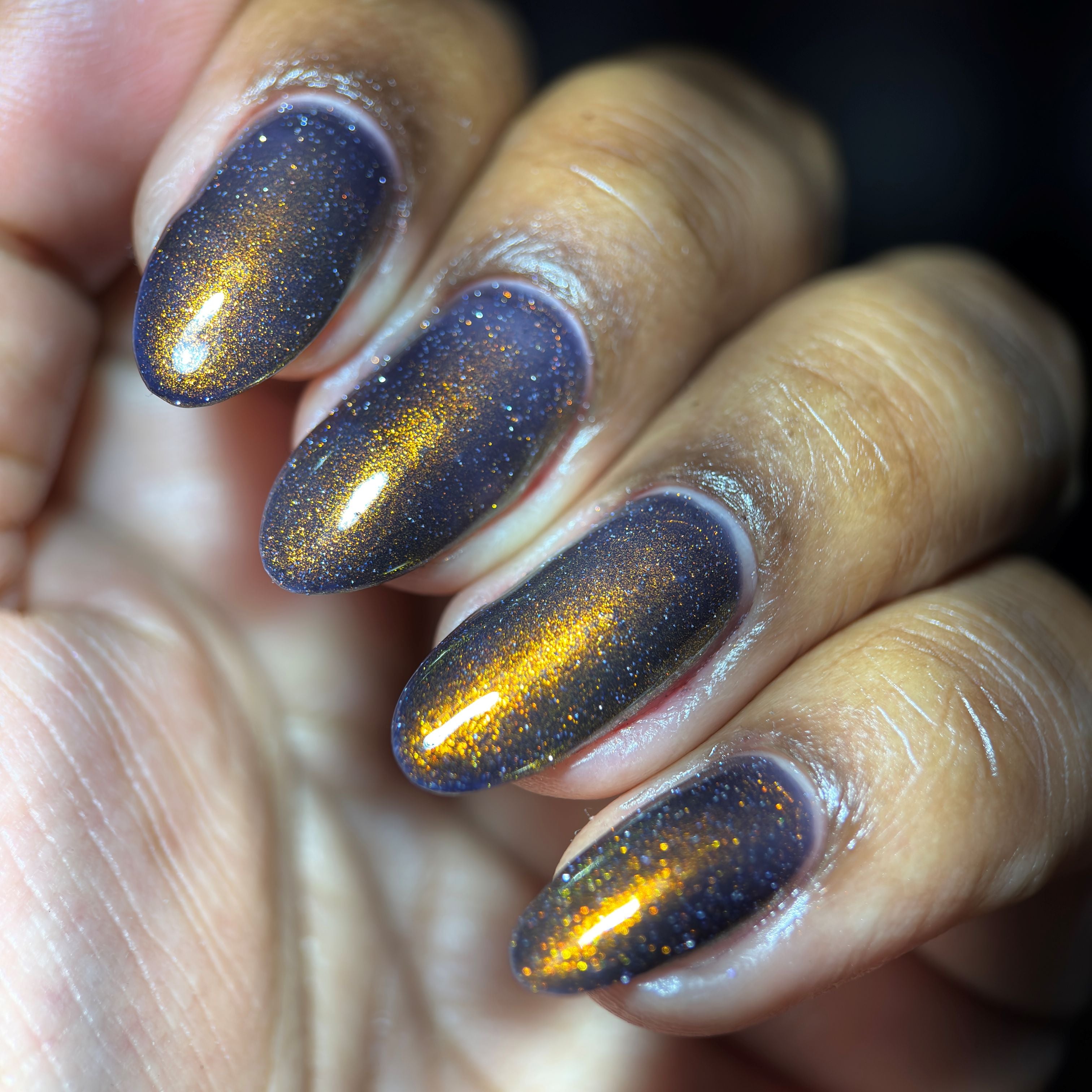a sheer but buildable indigo with strong gold shimmer and a scattering of silver light reflective glitter