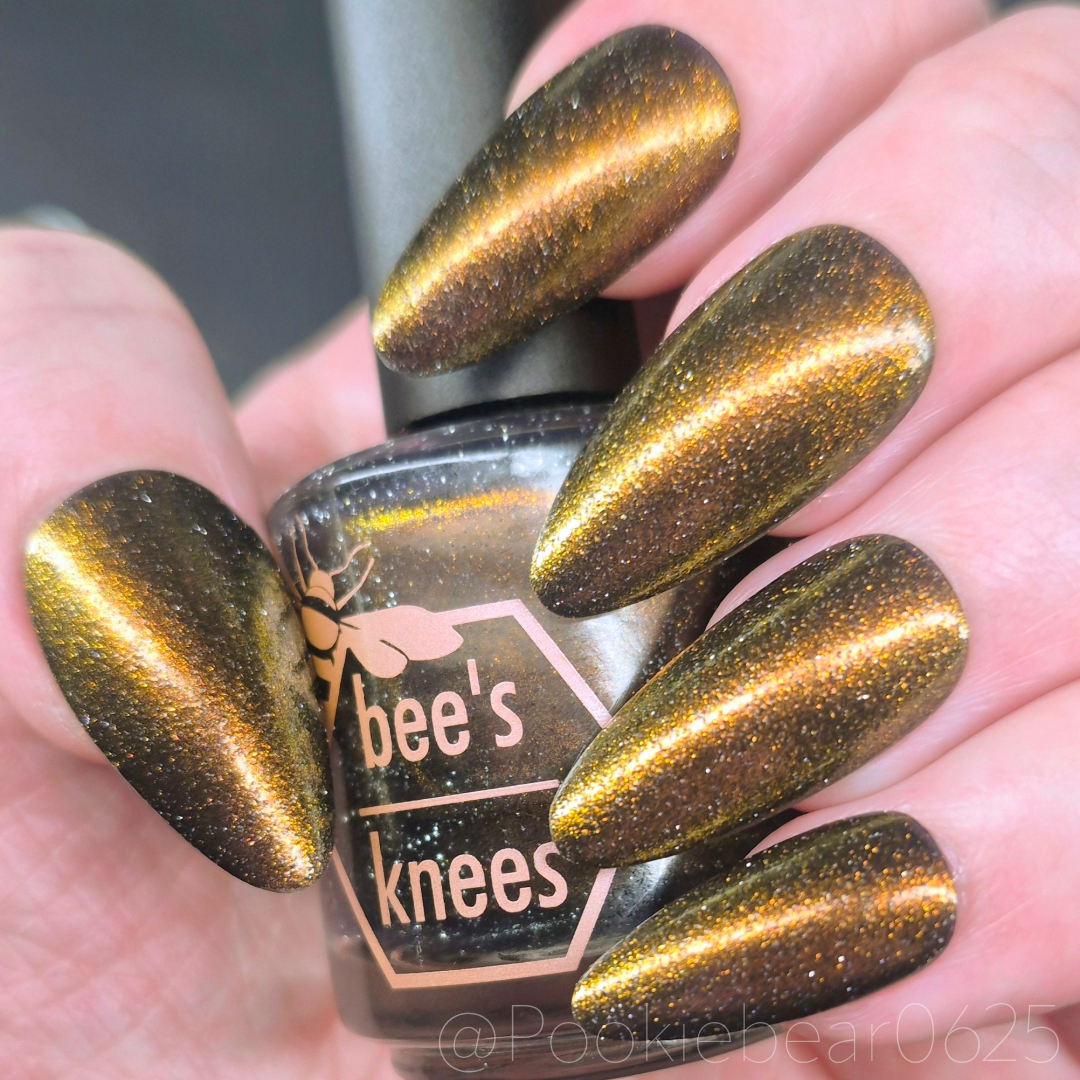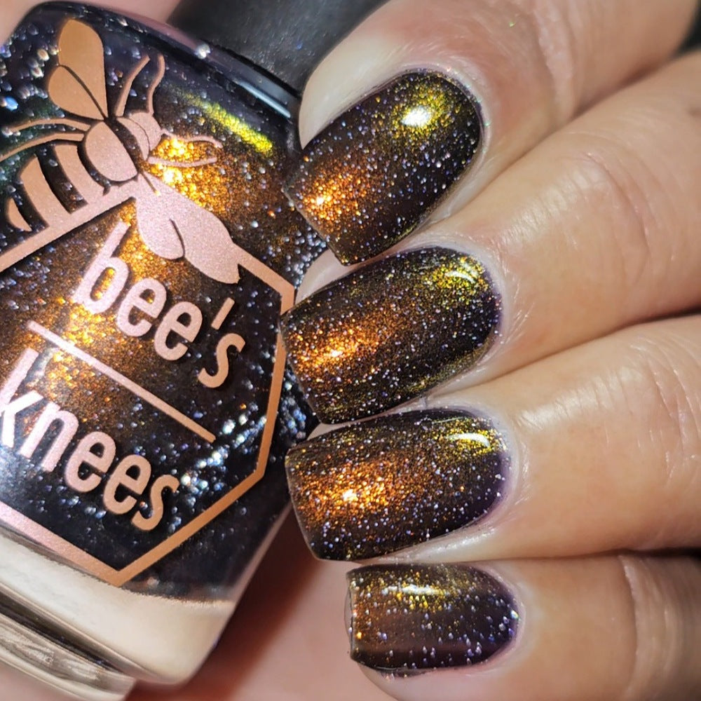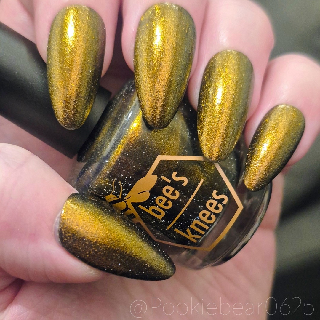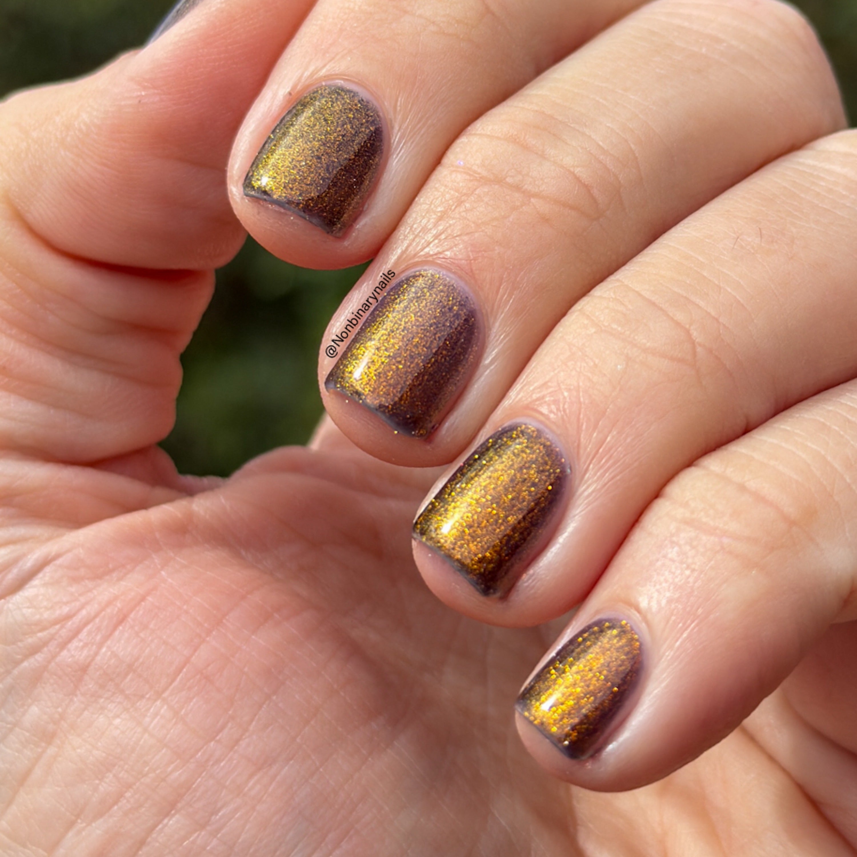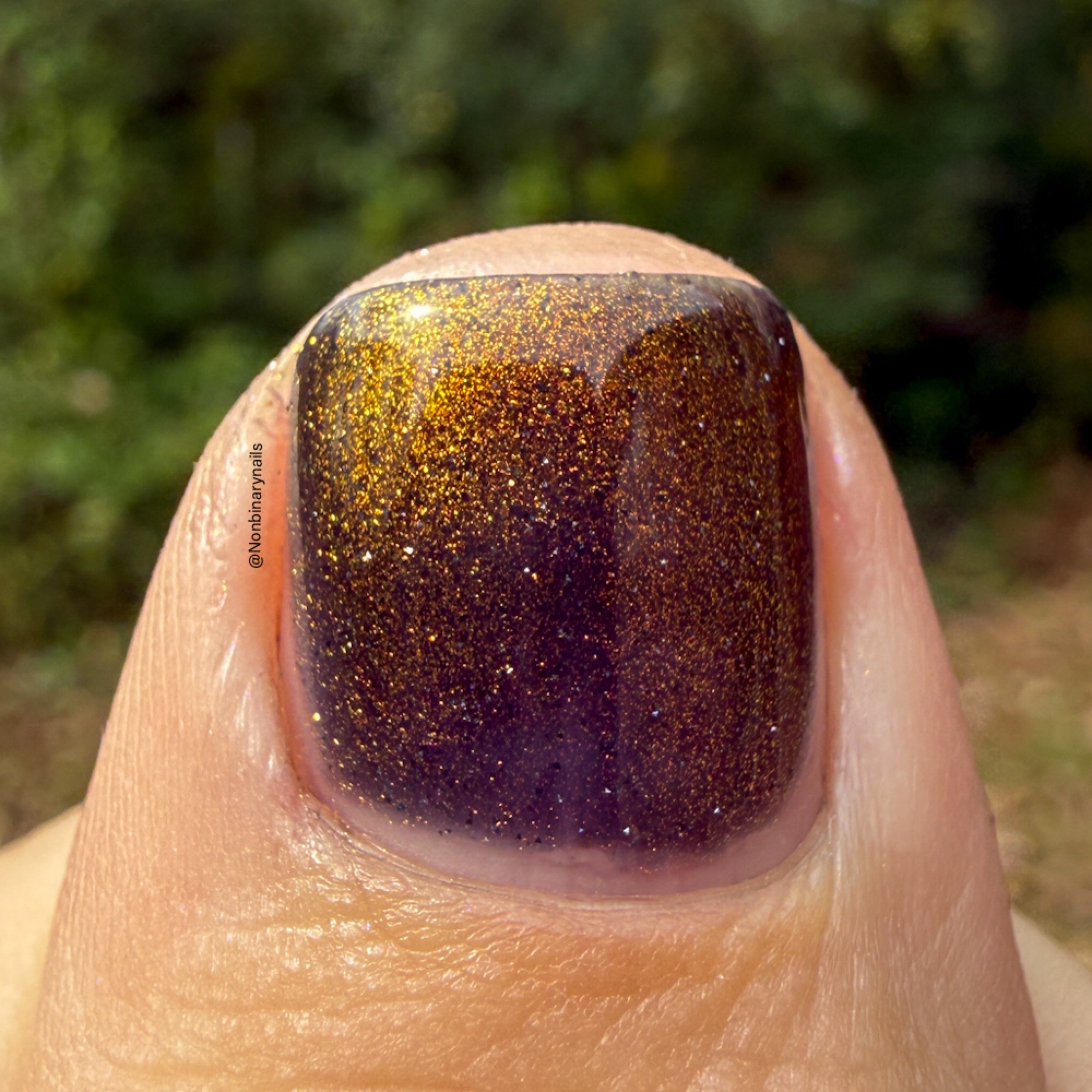 a sheer but buildable indigo with strong gold shimmer and a scattering of silver light reflective glitter