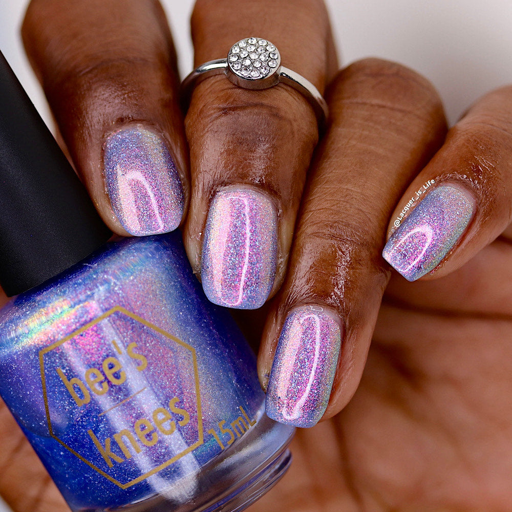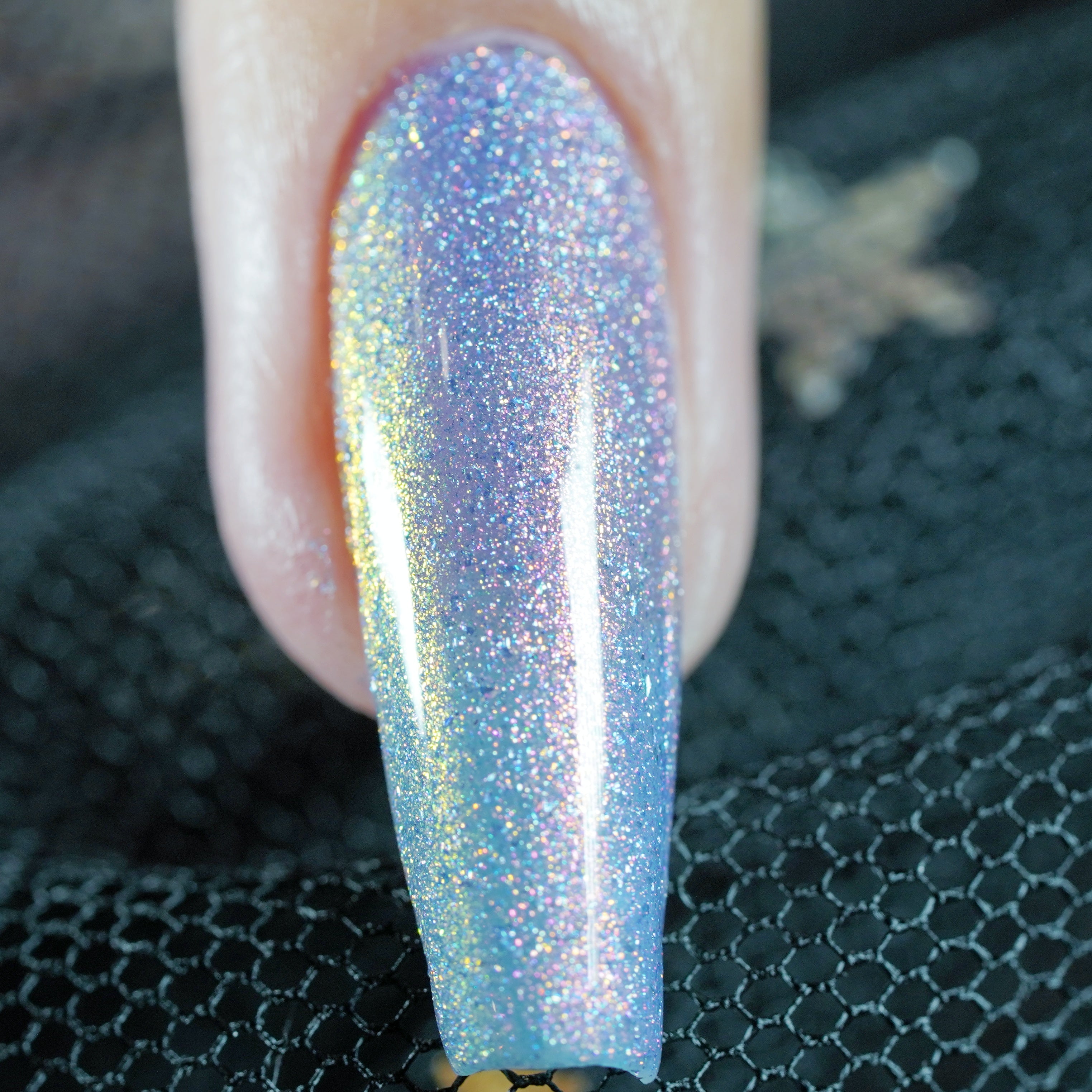 a soft periwinkle blue with pink to green shimmer and holo flakes