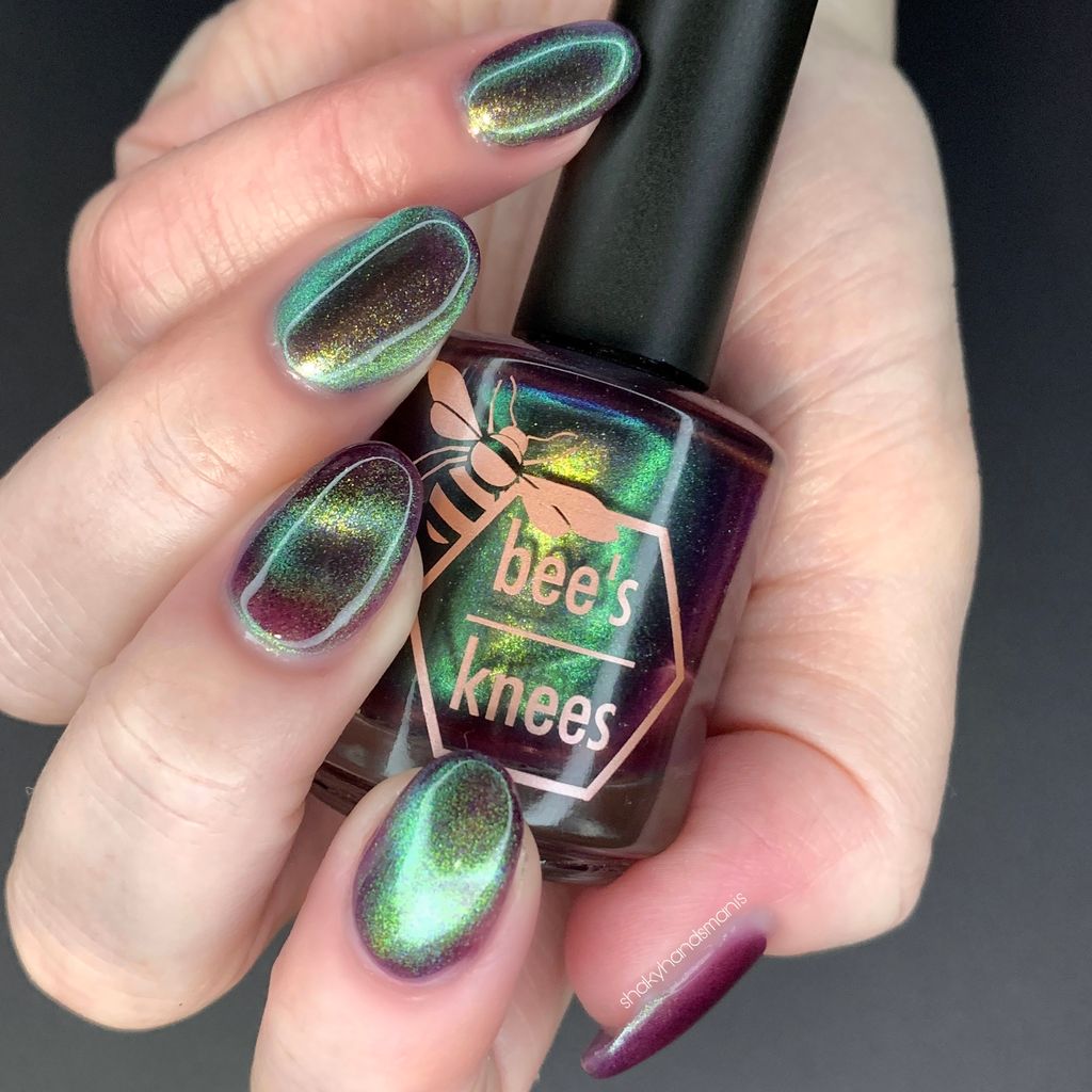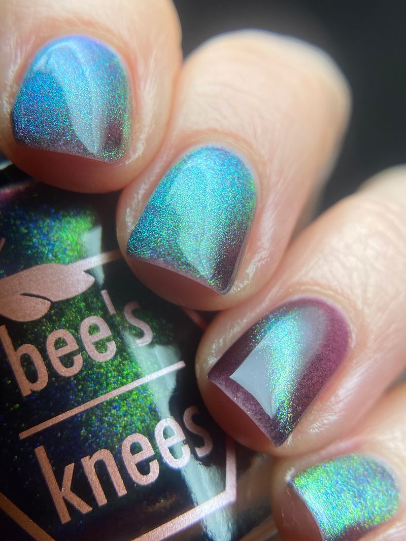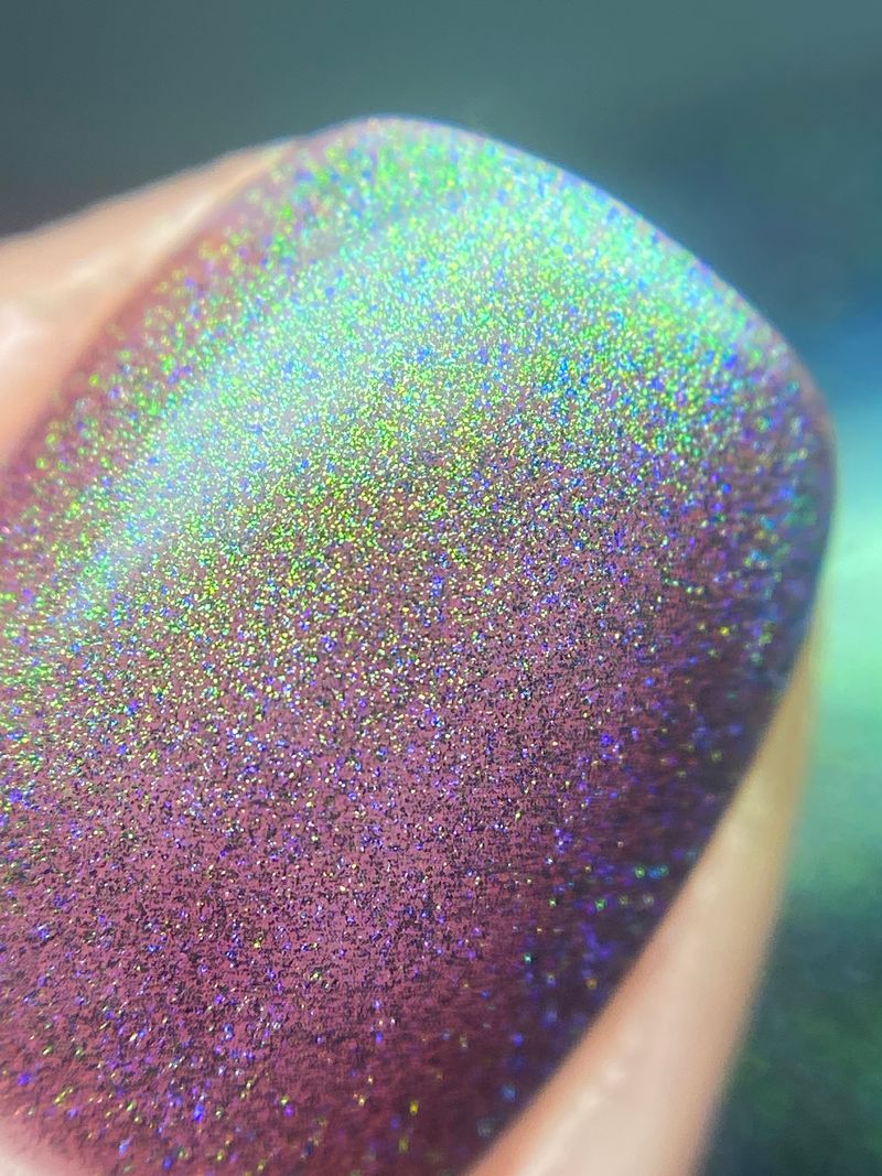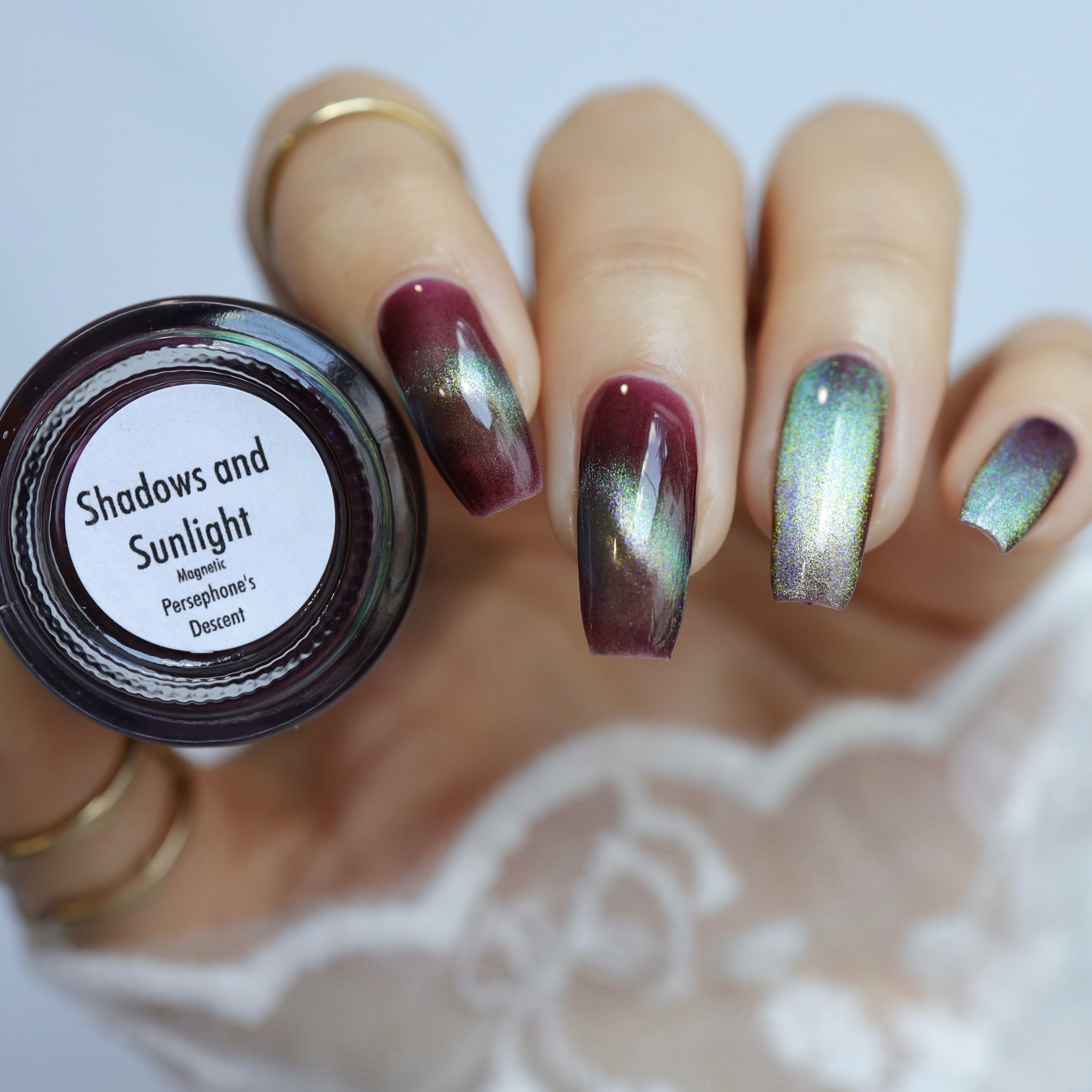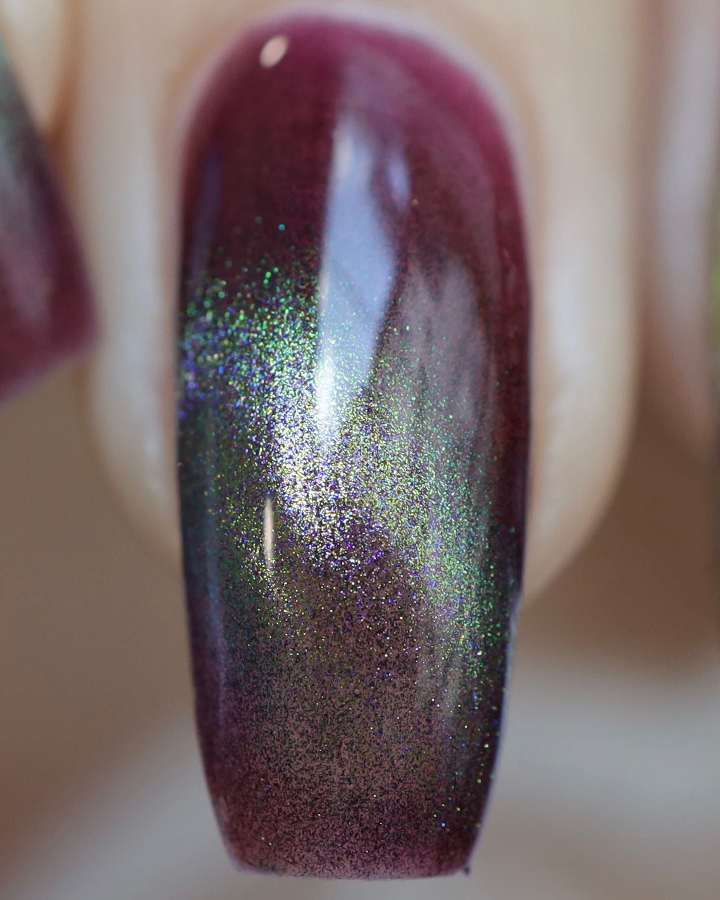 imperial purple with a mosaic magnetic that upon first glance looks like an ordinary green multichrome. When magnetized you will see both a bright green as well as a powder blue magnetic pigment