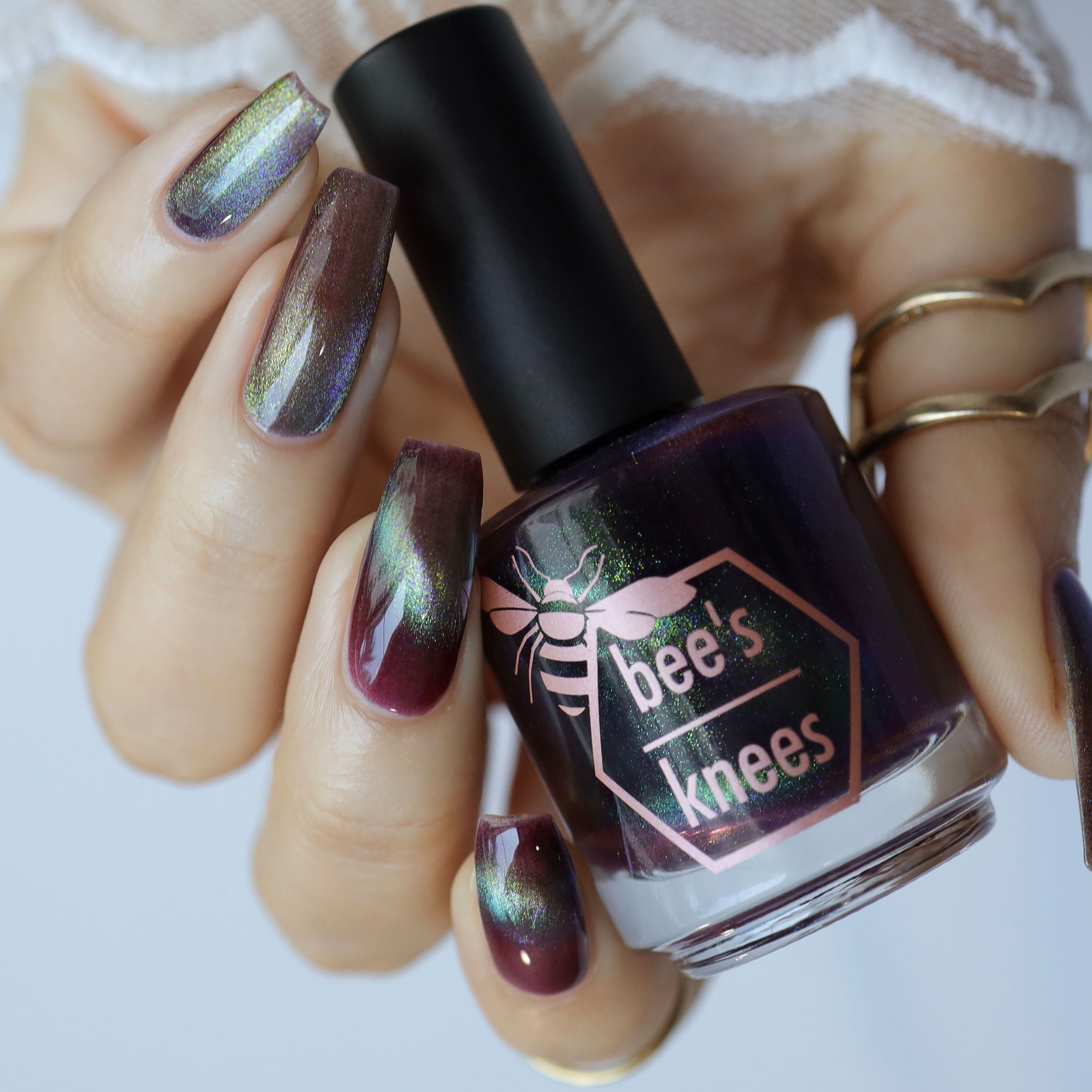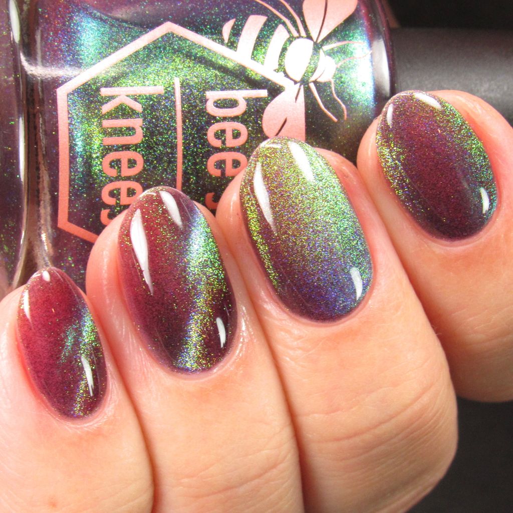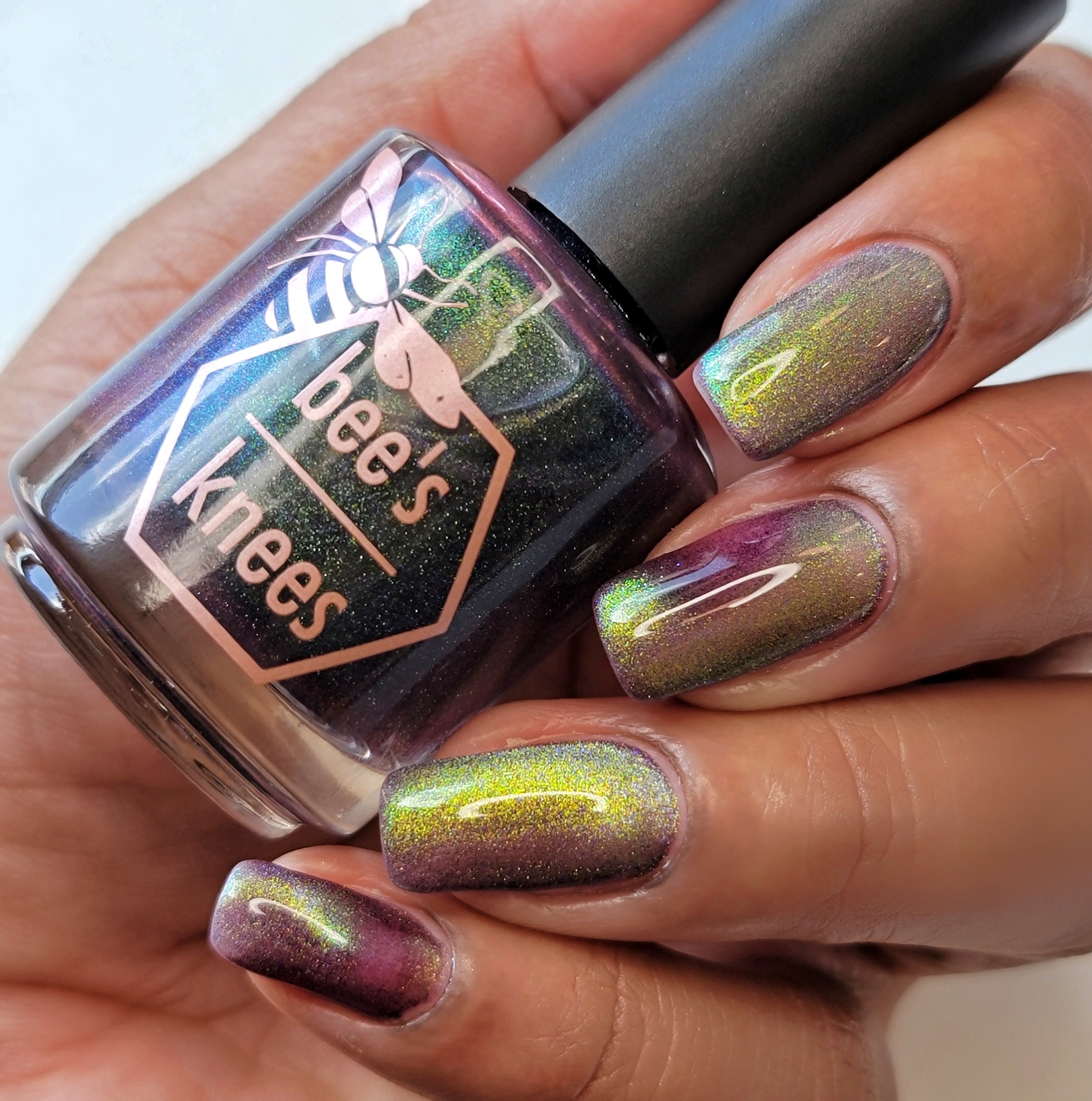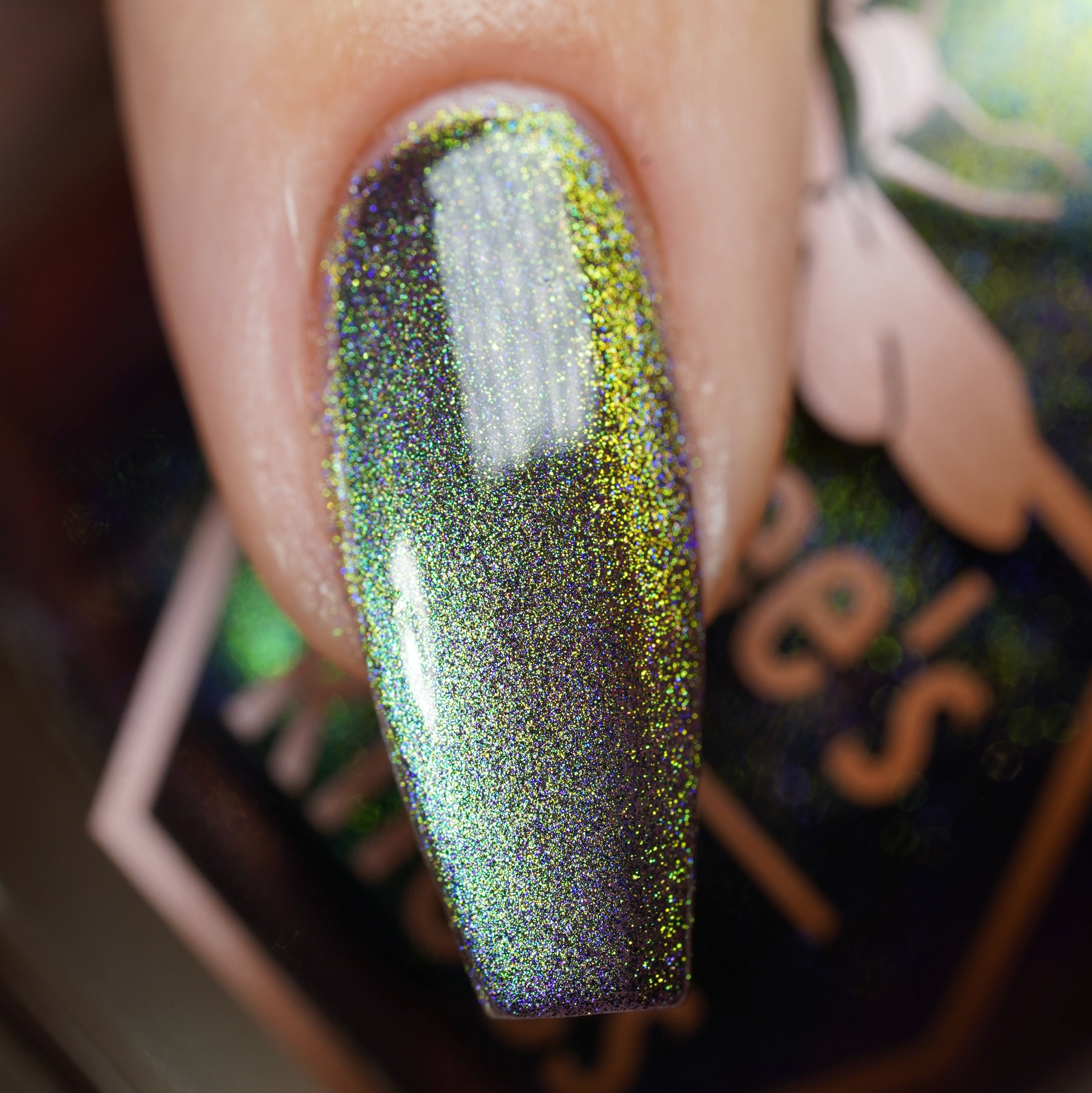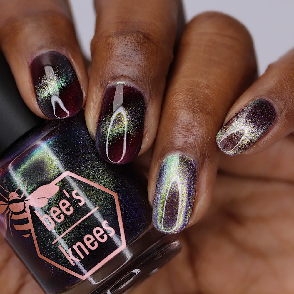 imperial purple with a mosaic magnetic that upon first glance looks like an ordinary green multichrome. When magnetized you will see both a bright green as well as a powder blue magnetic pigment