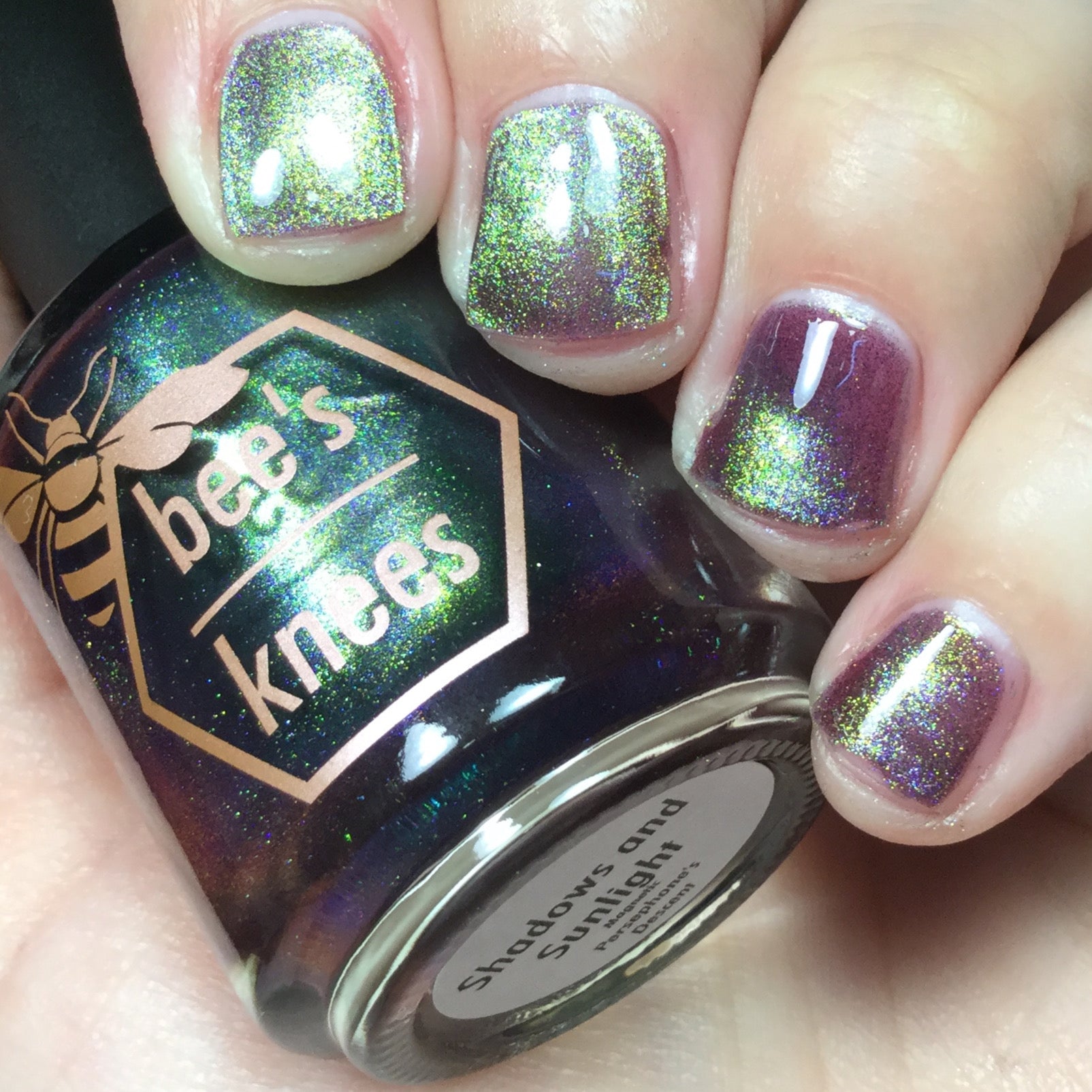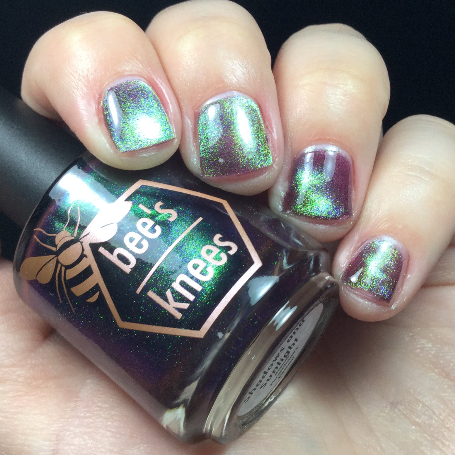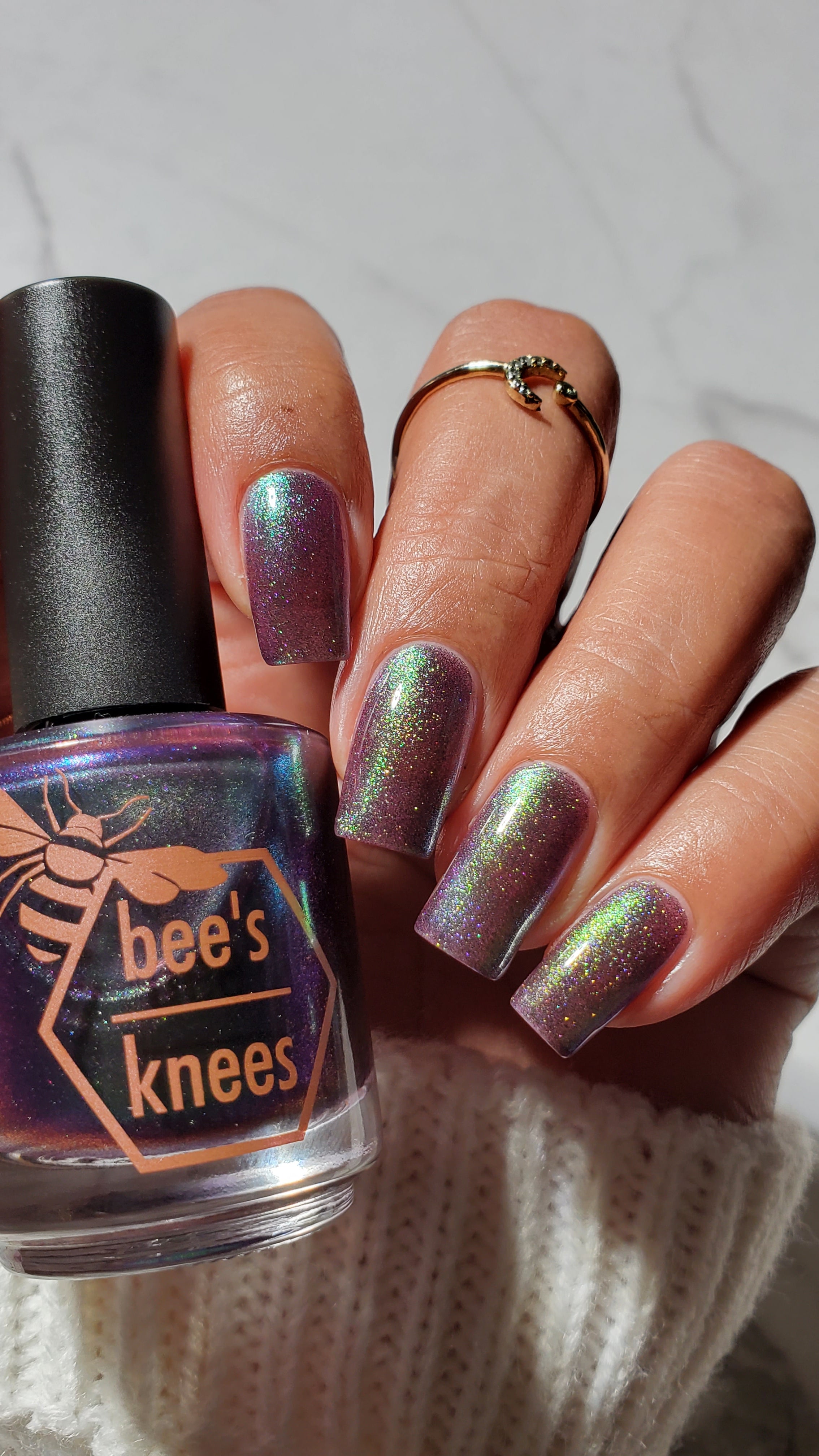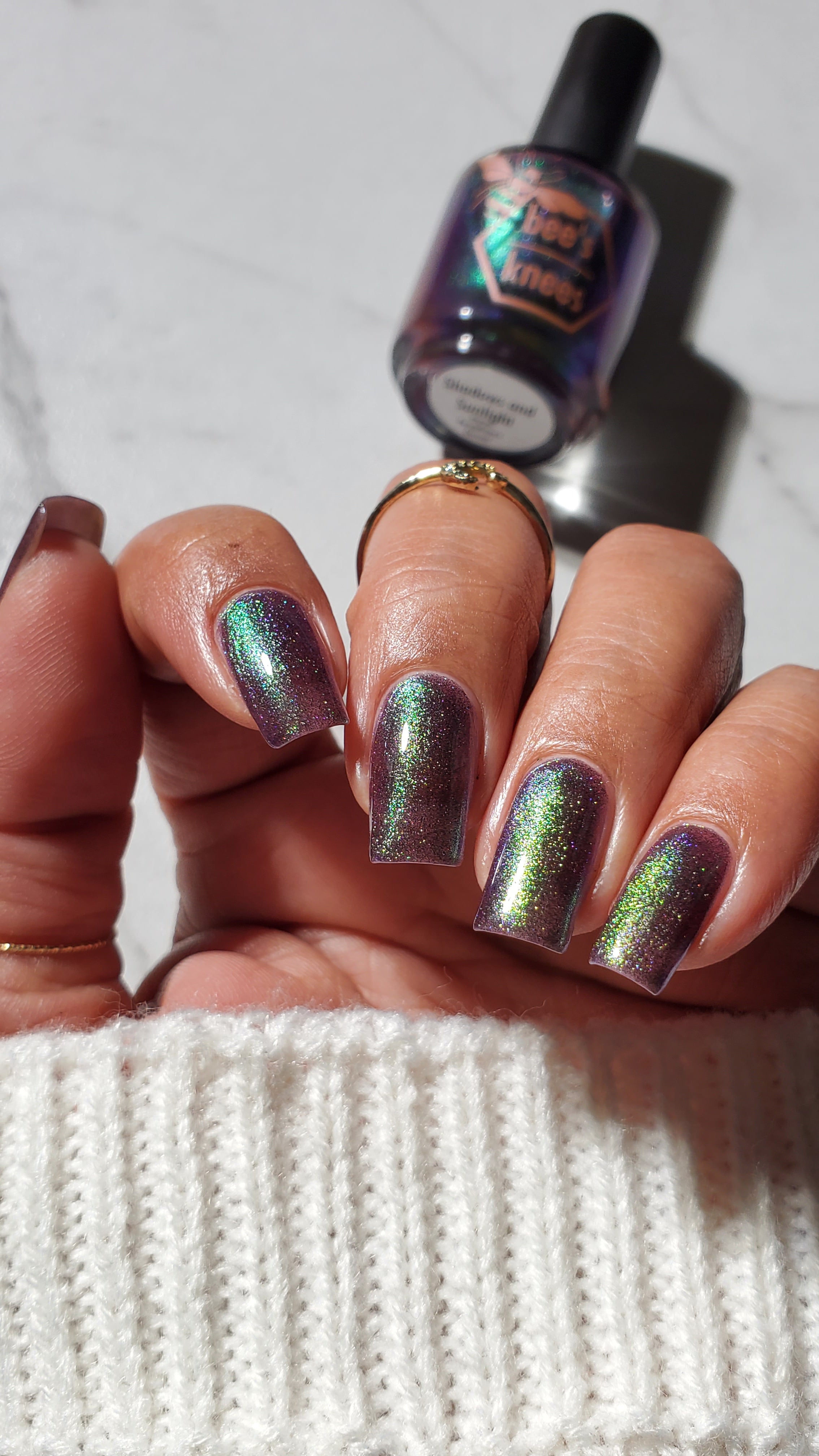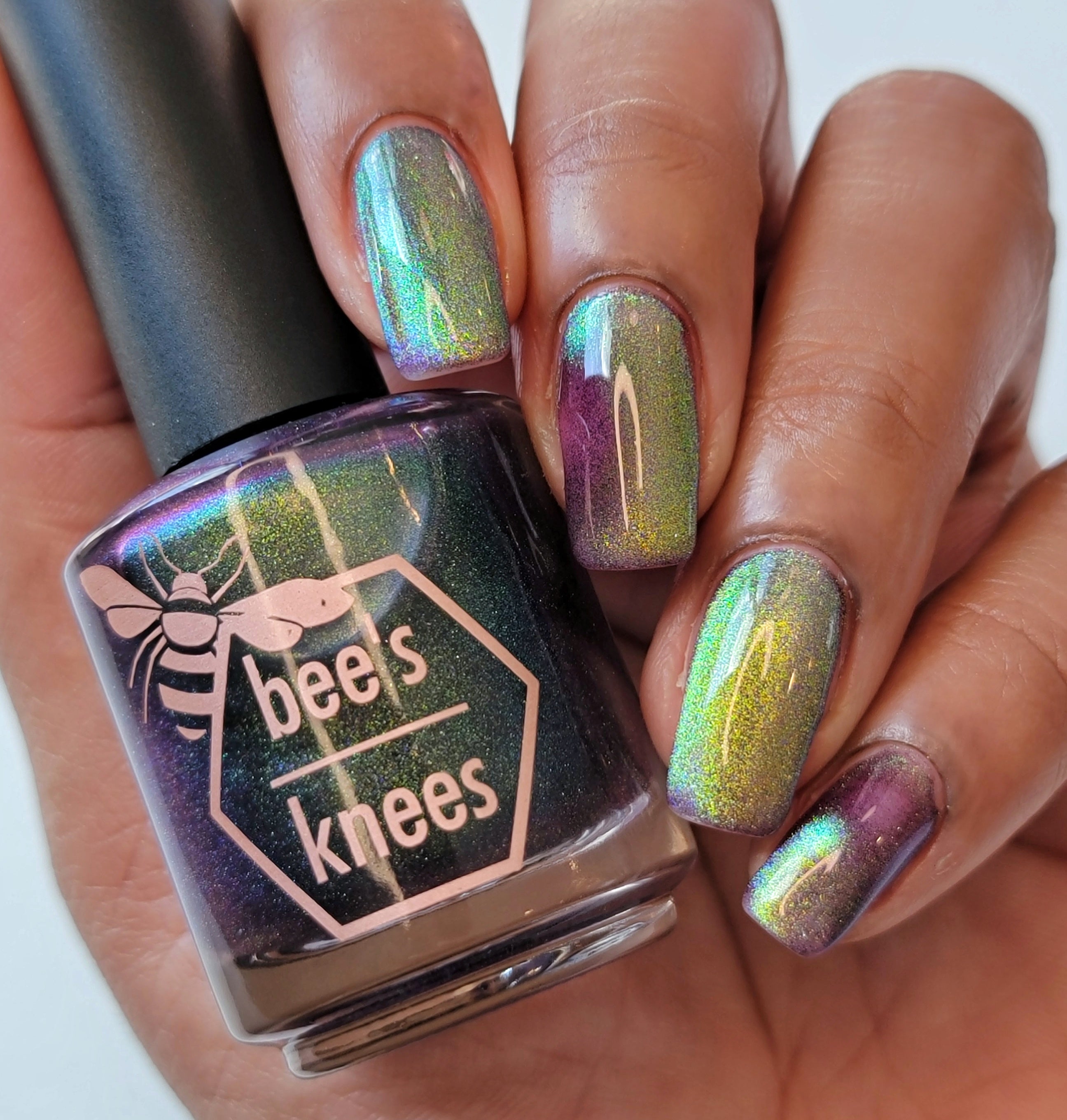 imperial purple with a mosaic magnetic that upon first glance looks like an ordinary green multichrome. When magnetized you will see both a bright green as well as a powder blue magnetic pigment