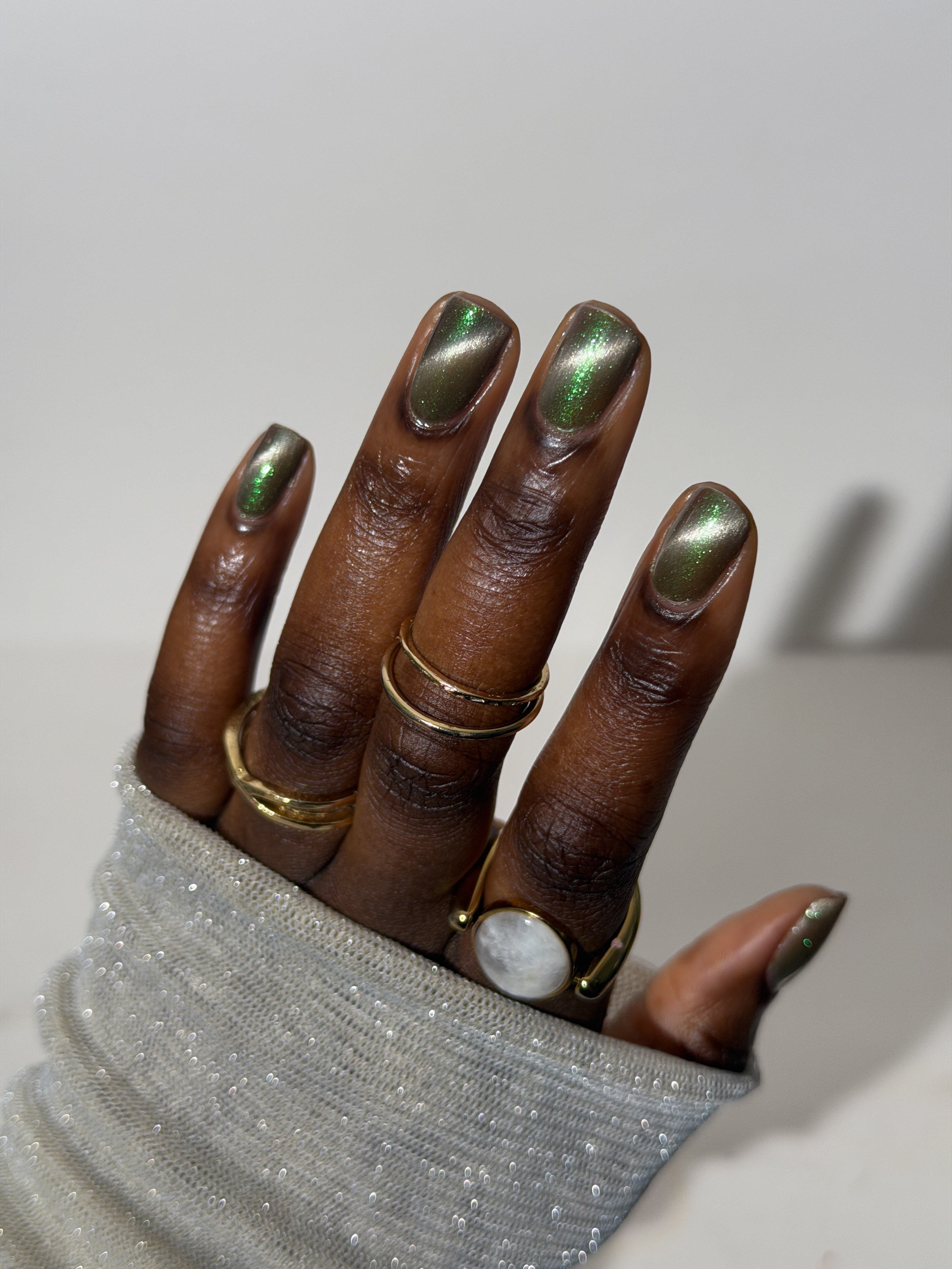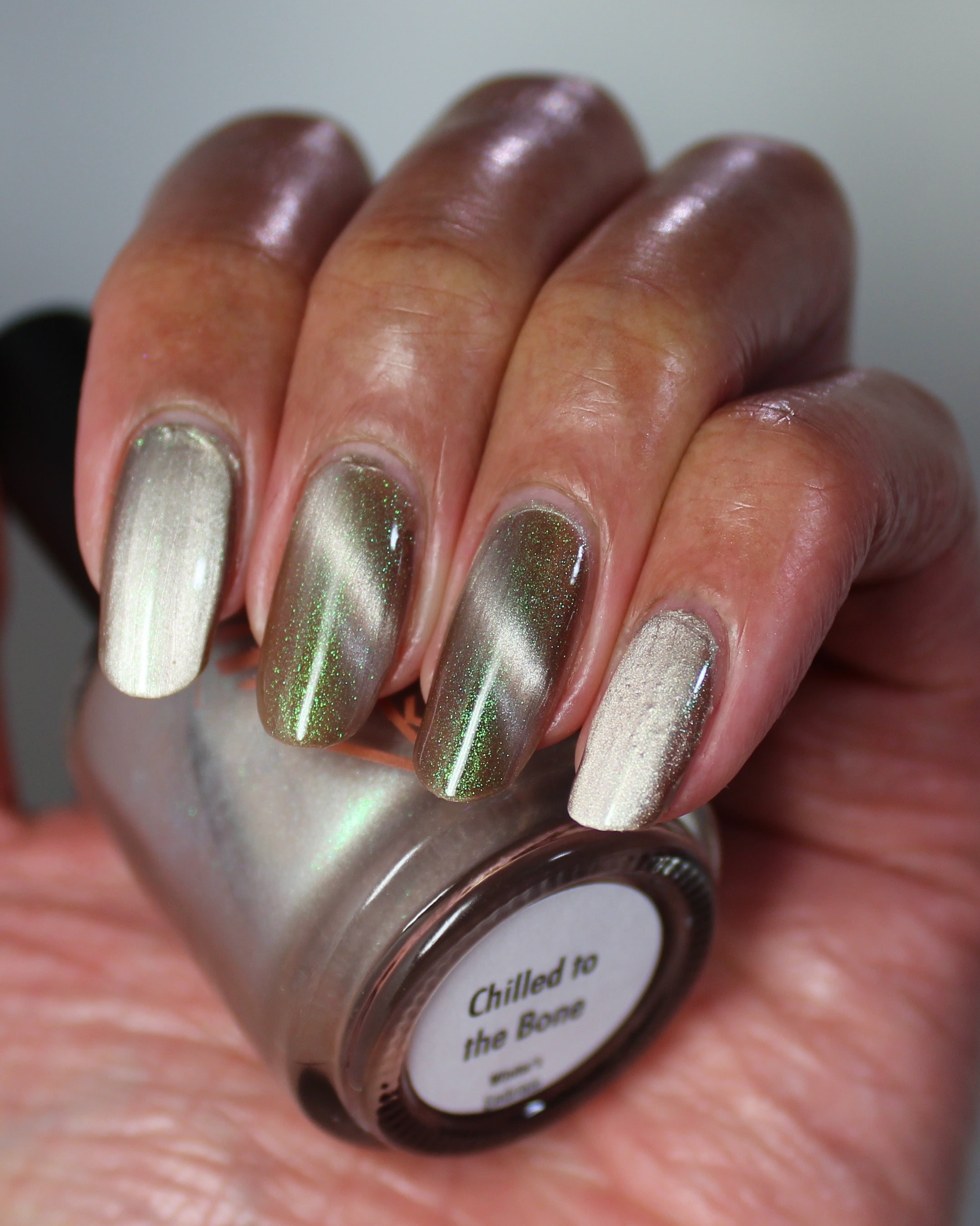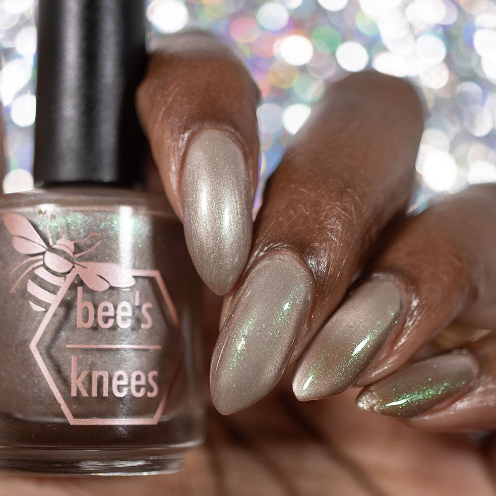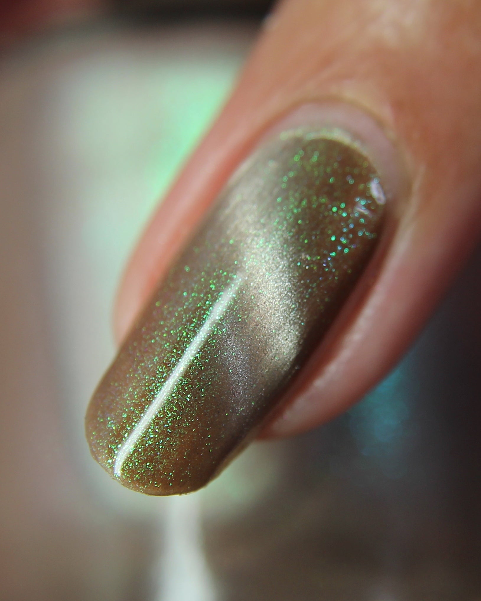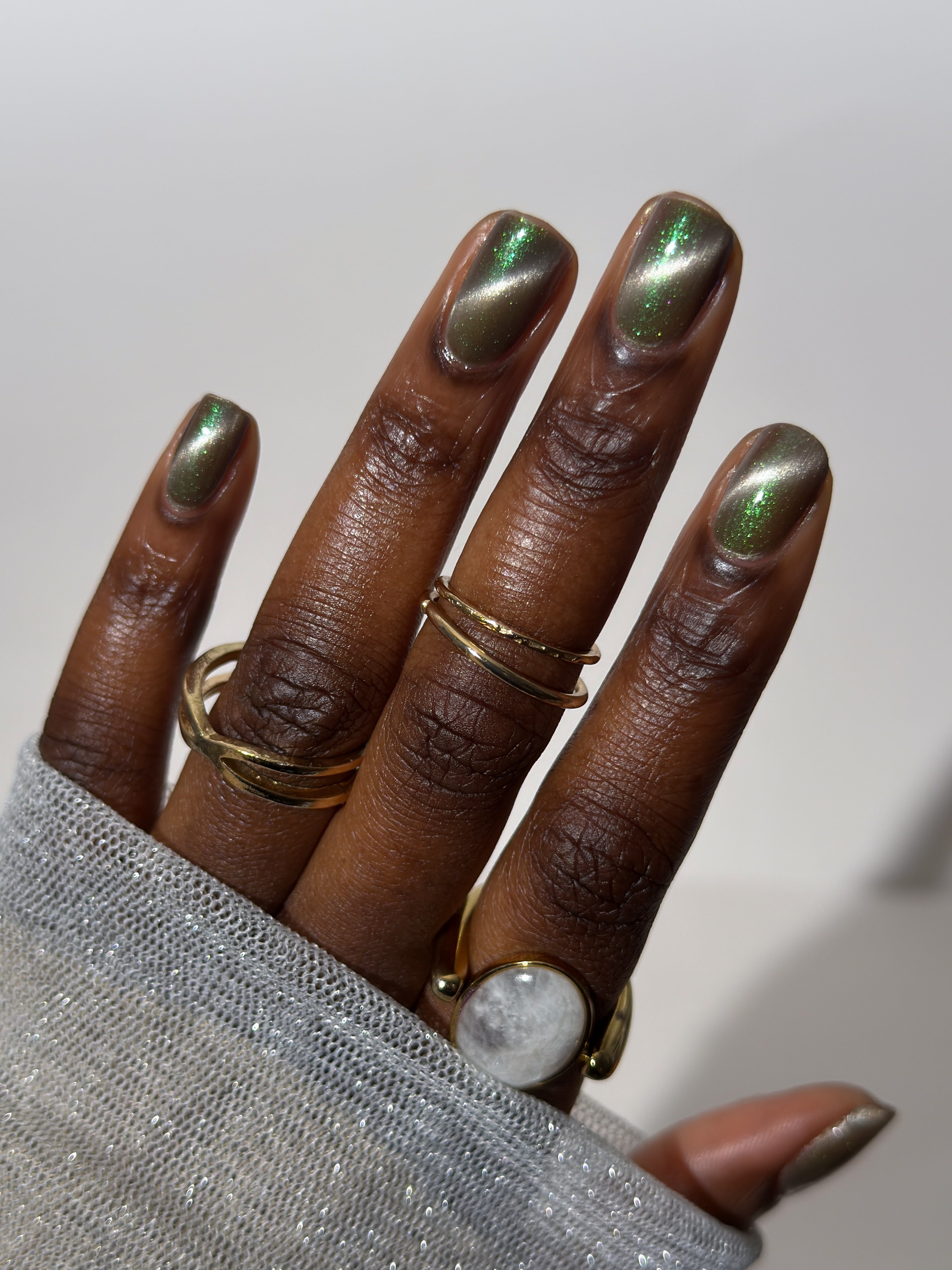 a weathered bone with antique gold magnetic shimmer and green shimmer