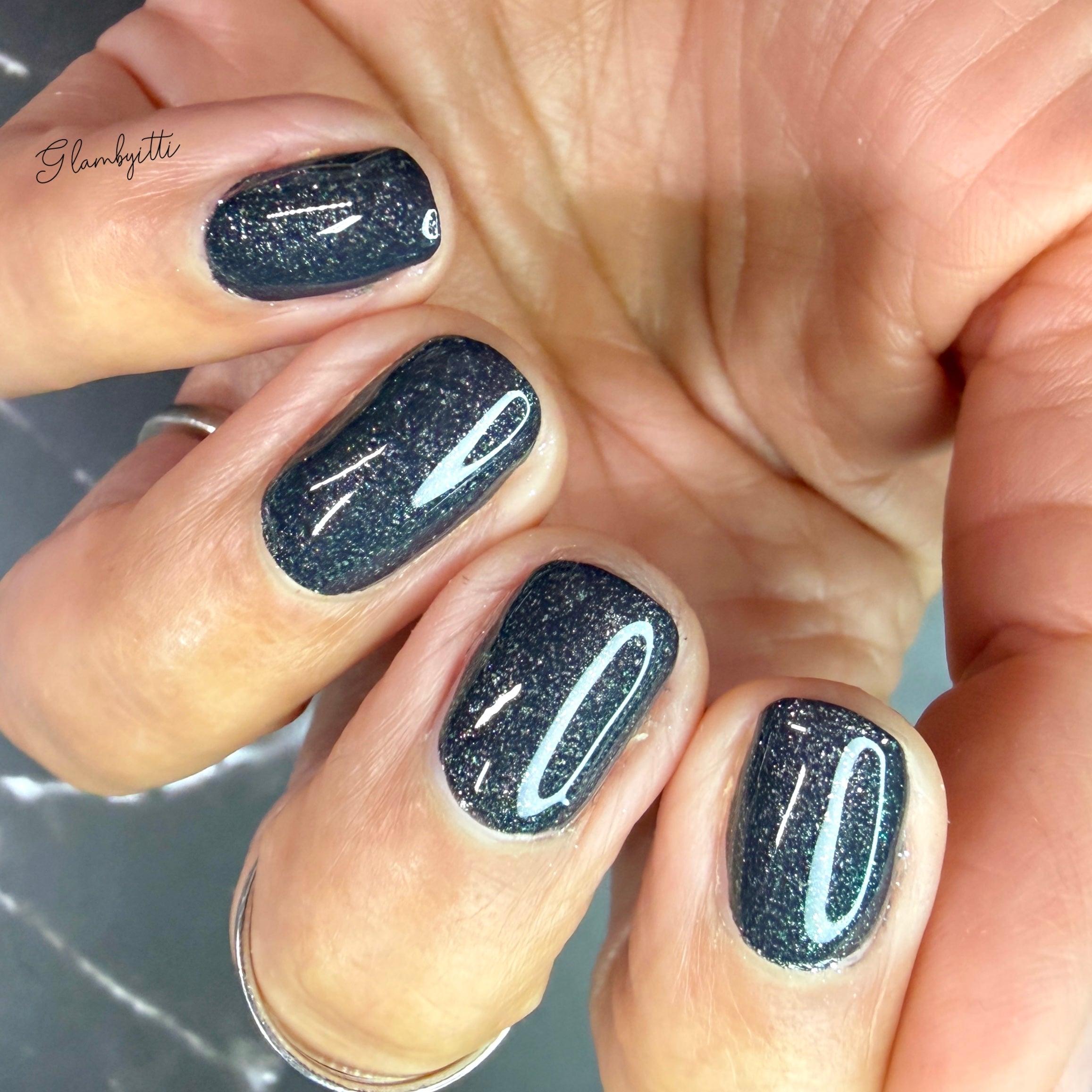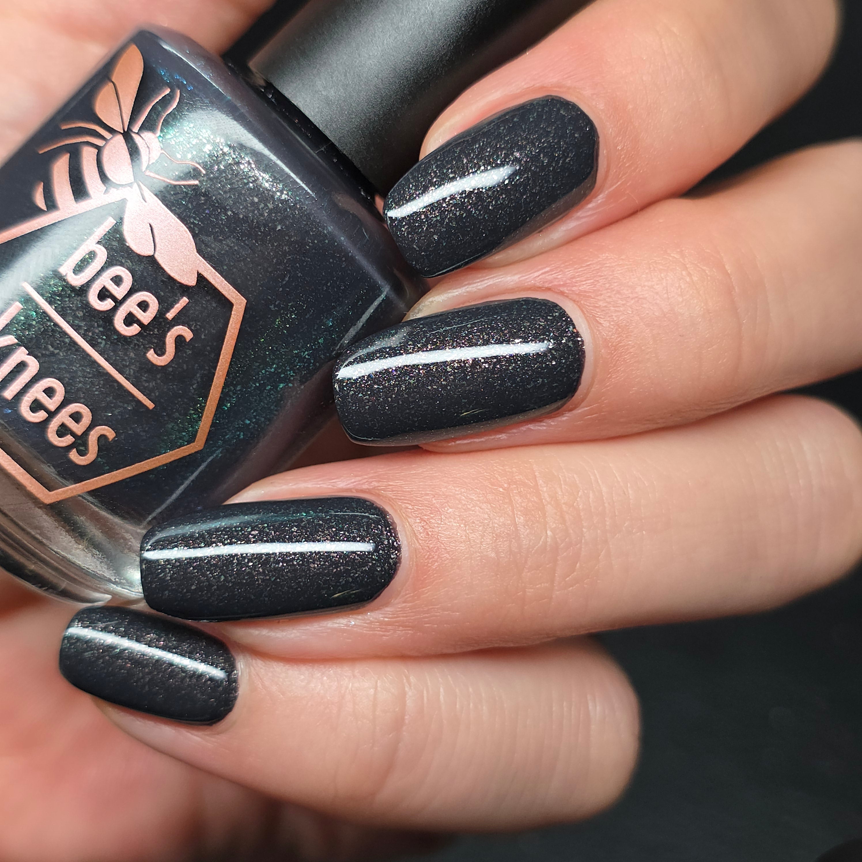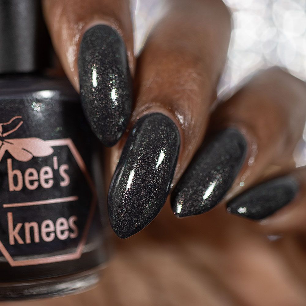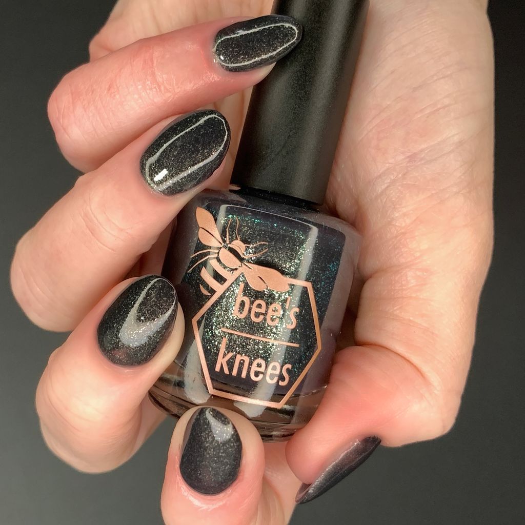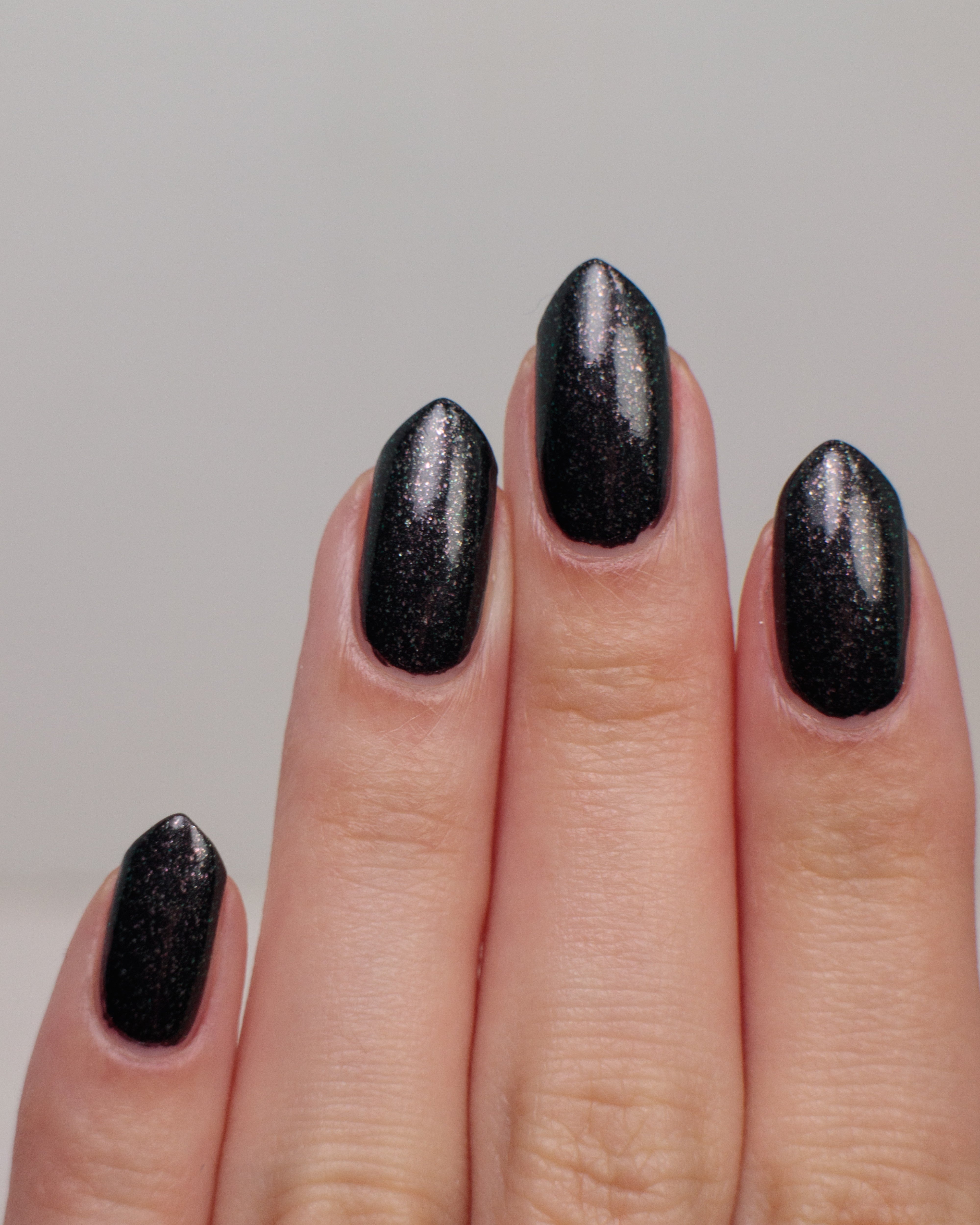 a charcoal polish frosted with a dusting of silver to green shimmer