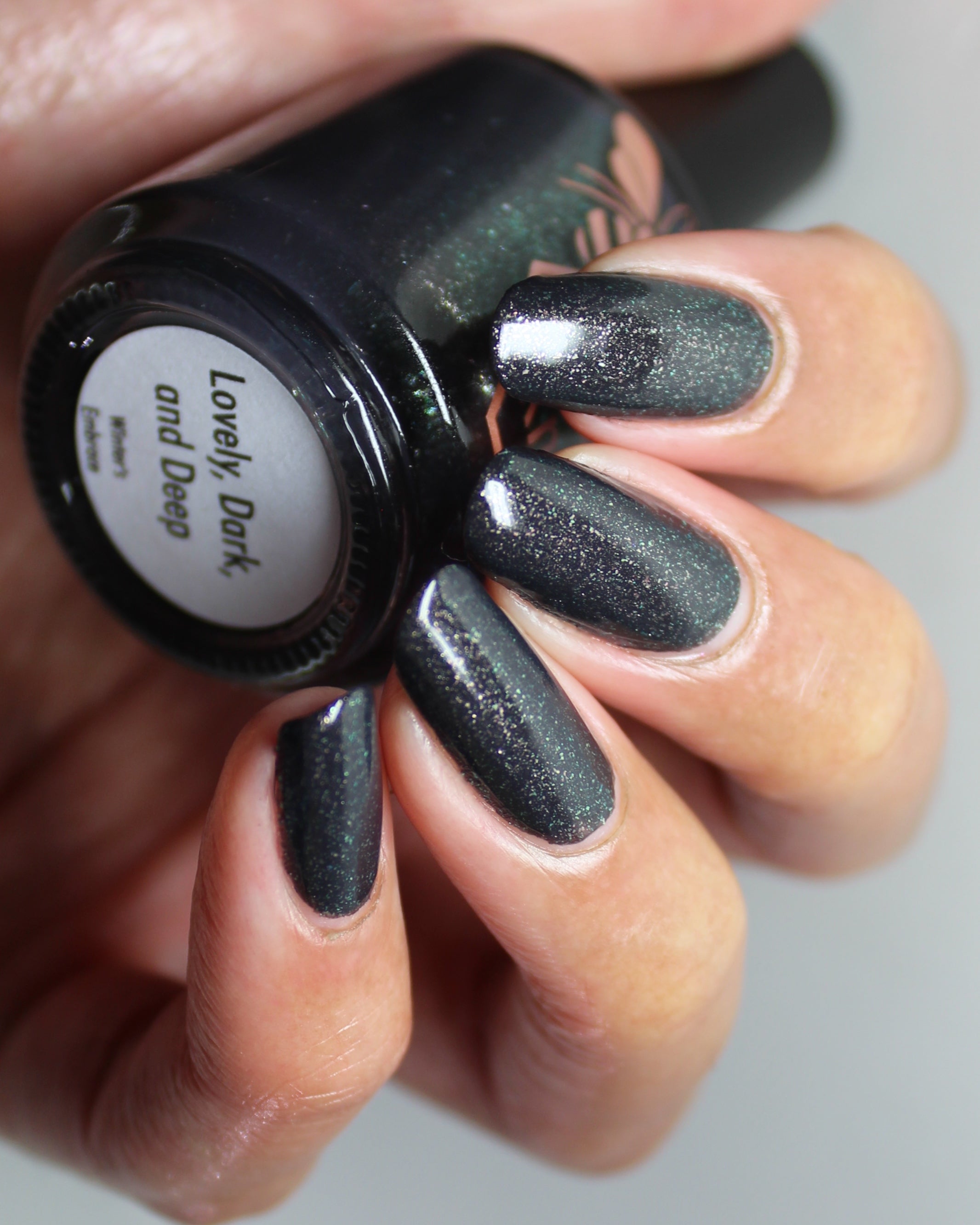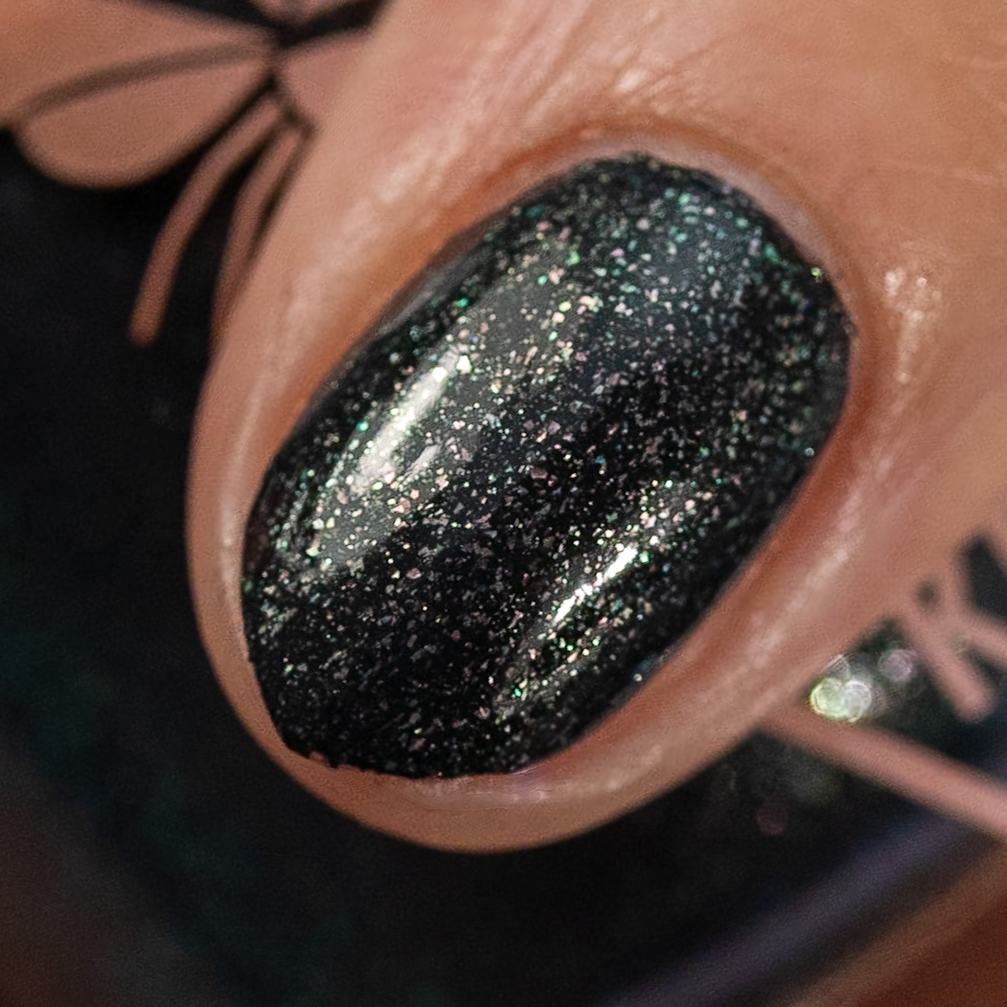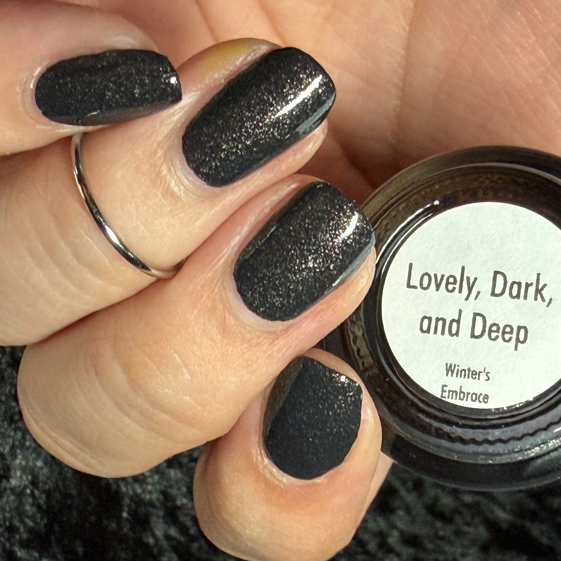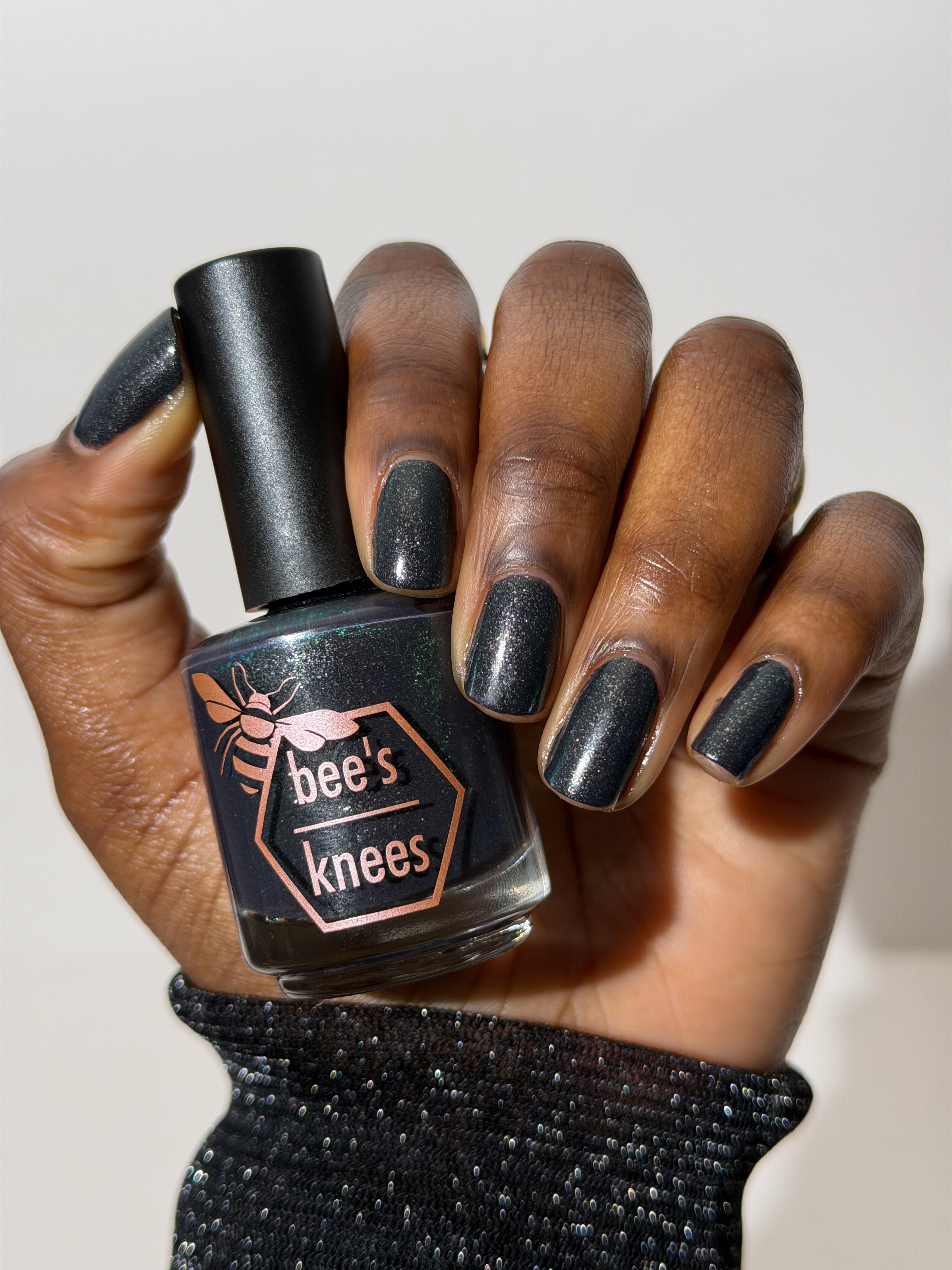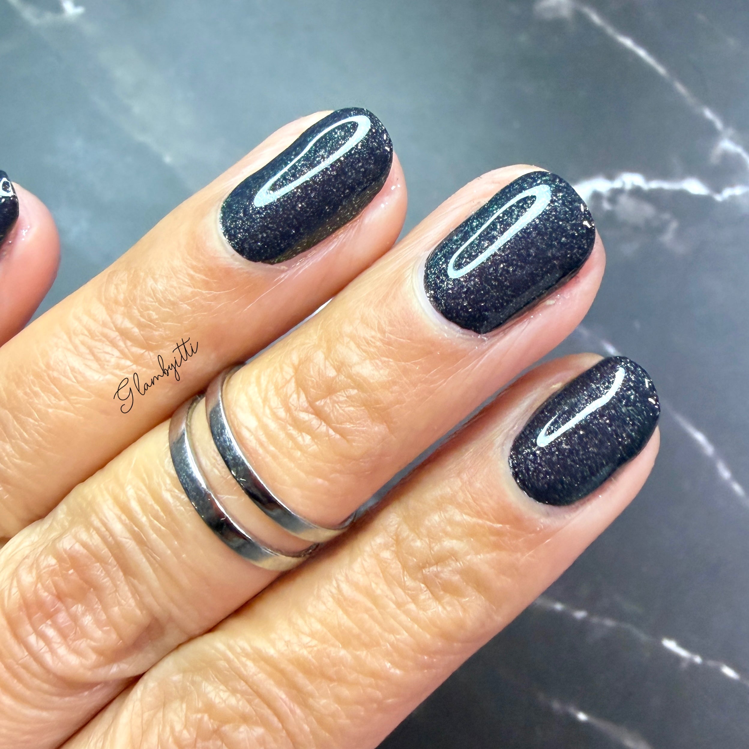 a charcoal polish frosted with a dusting of silver to green shimmer