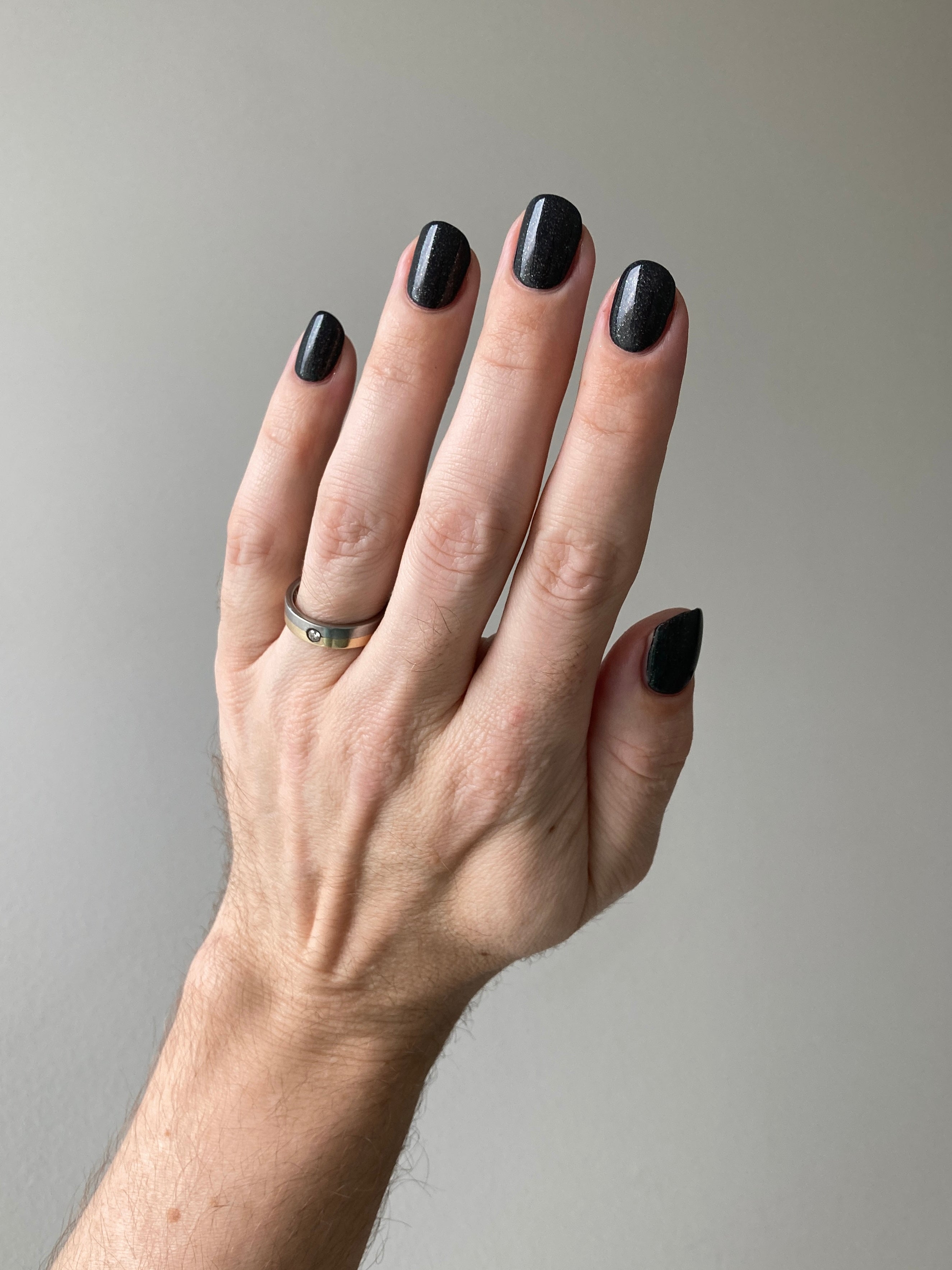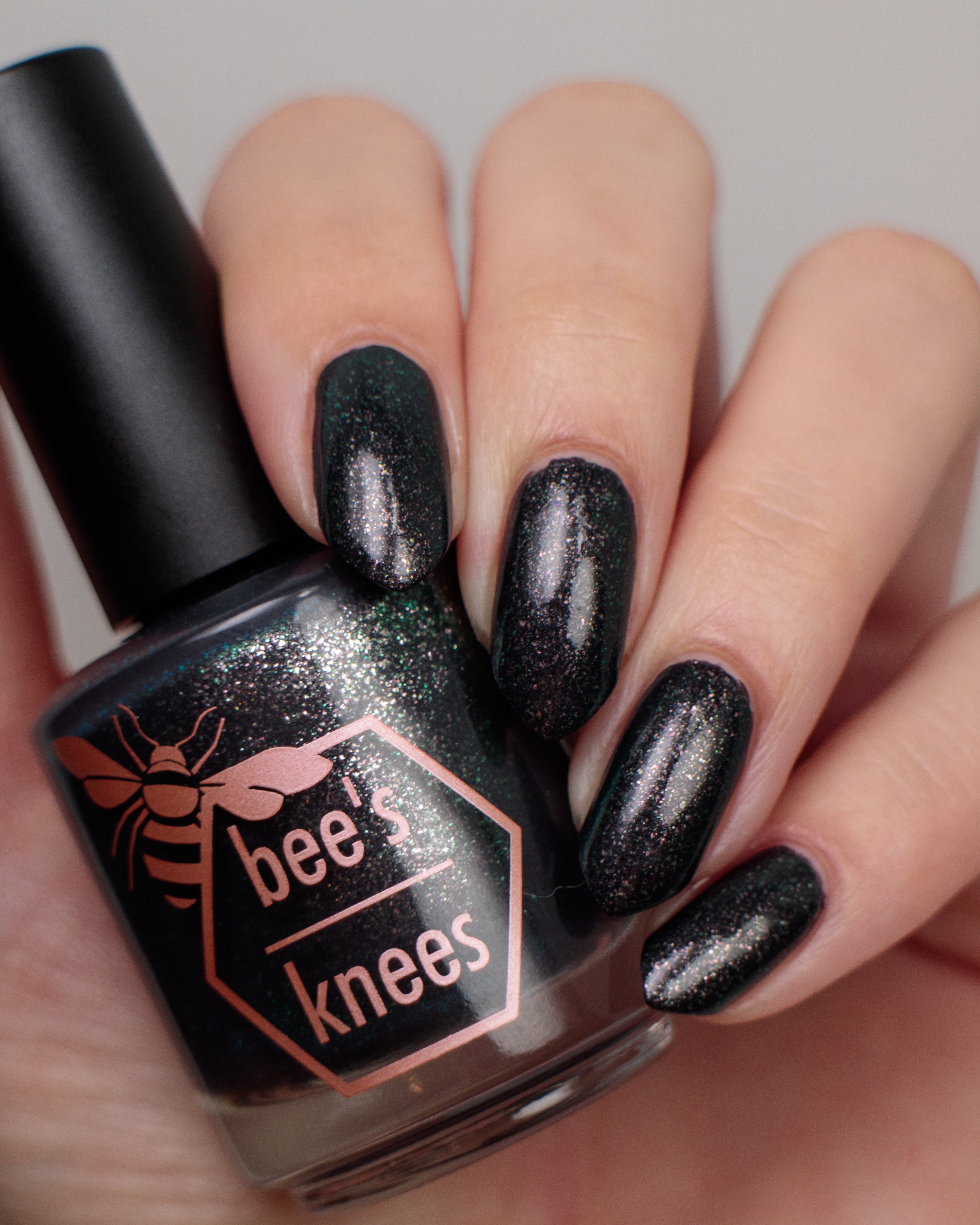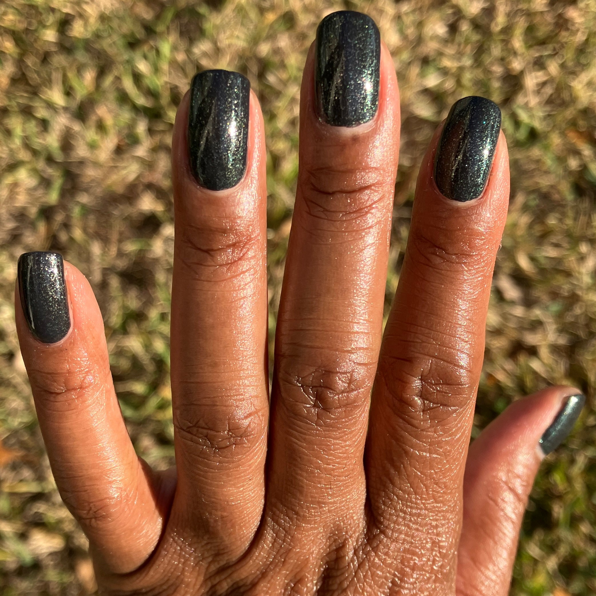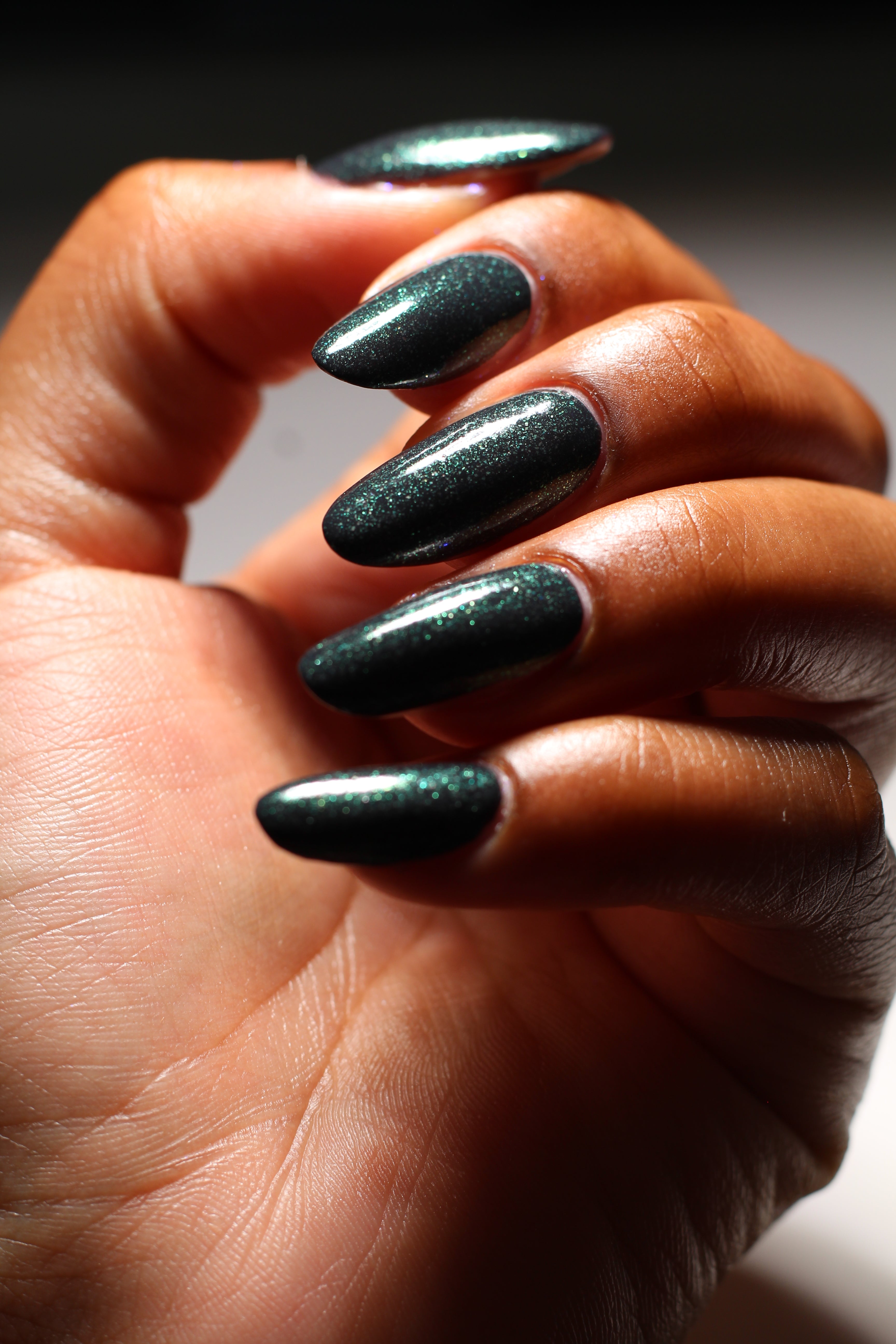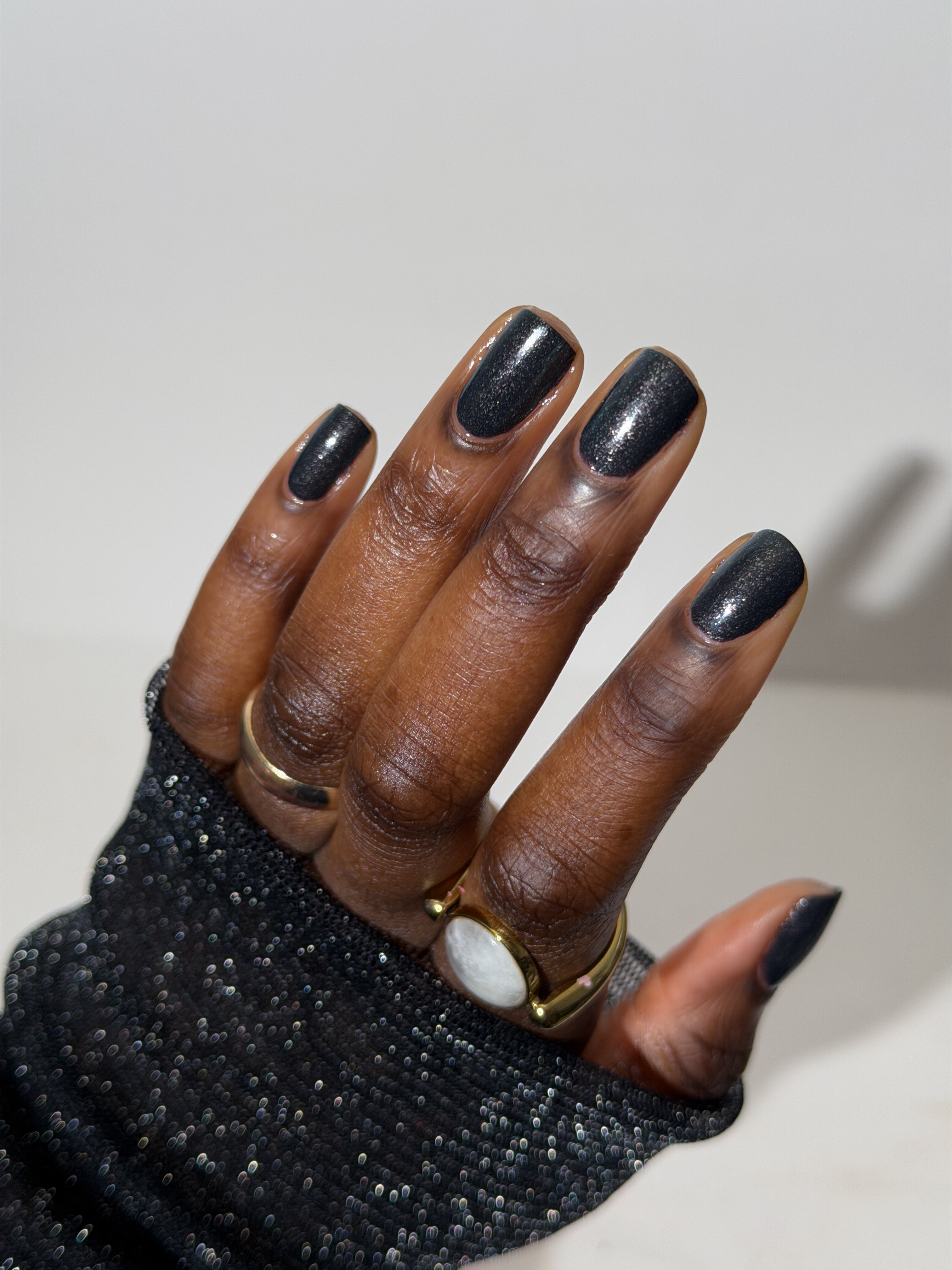 a charcoal polish frosted with a dusting of silver to green shimmer