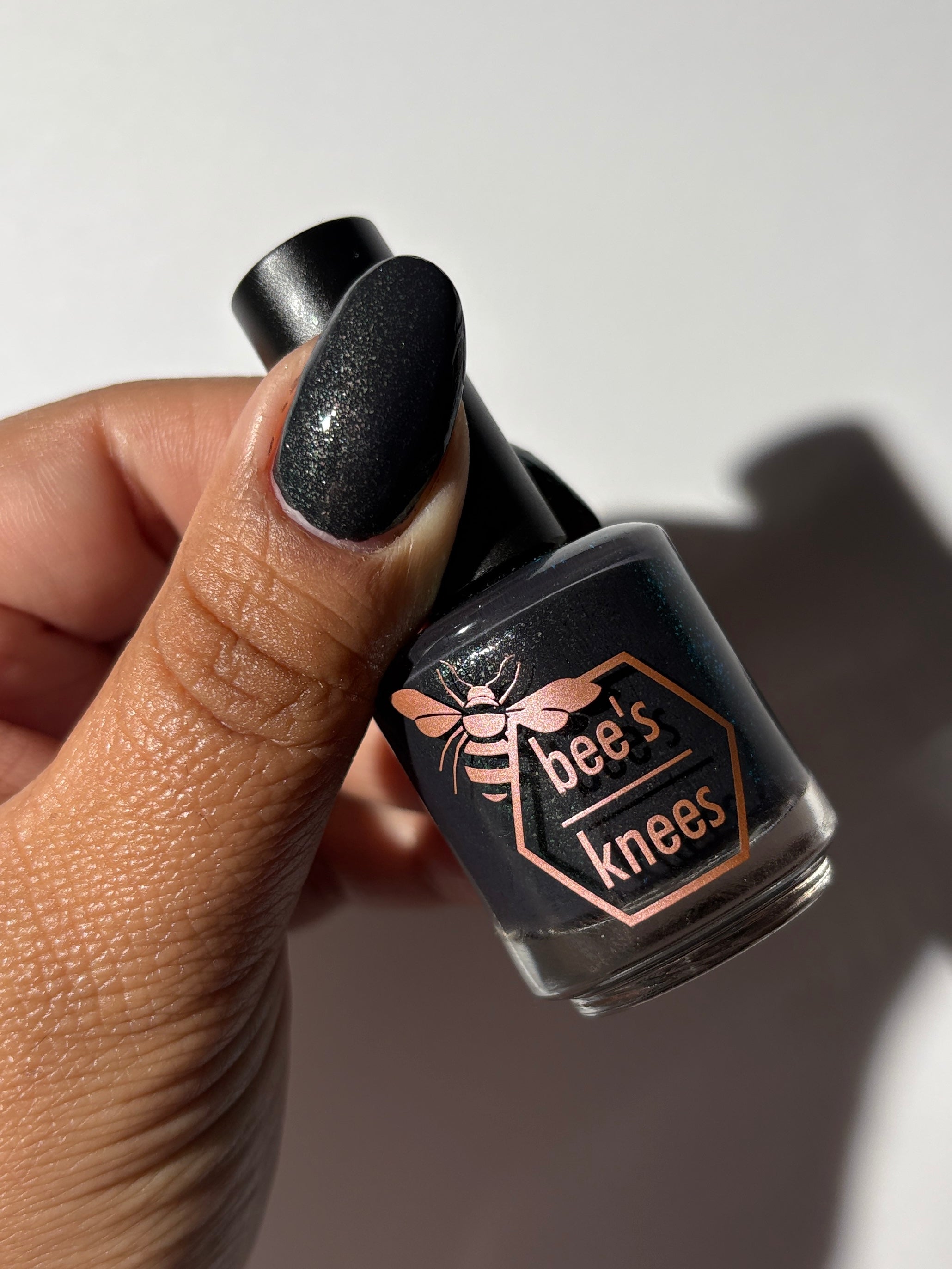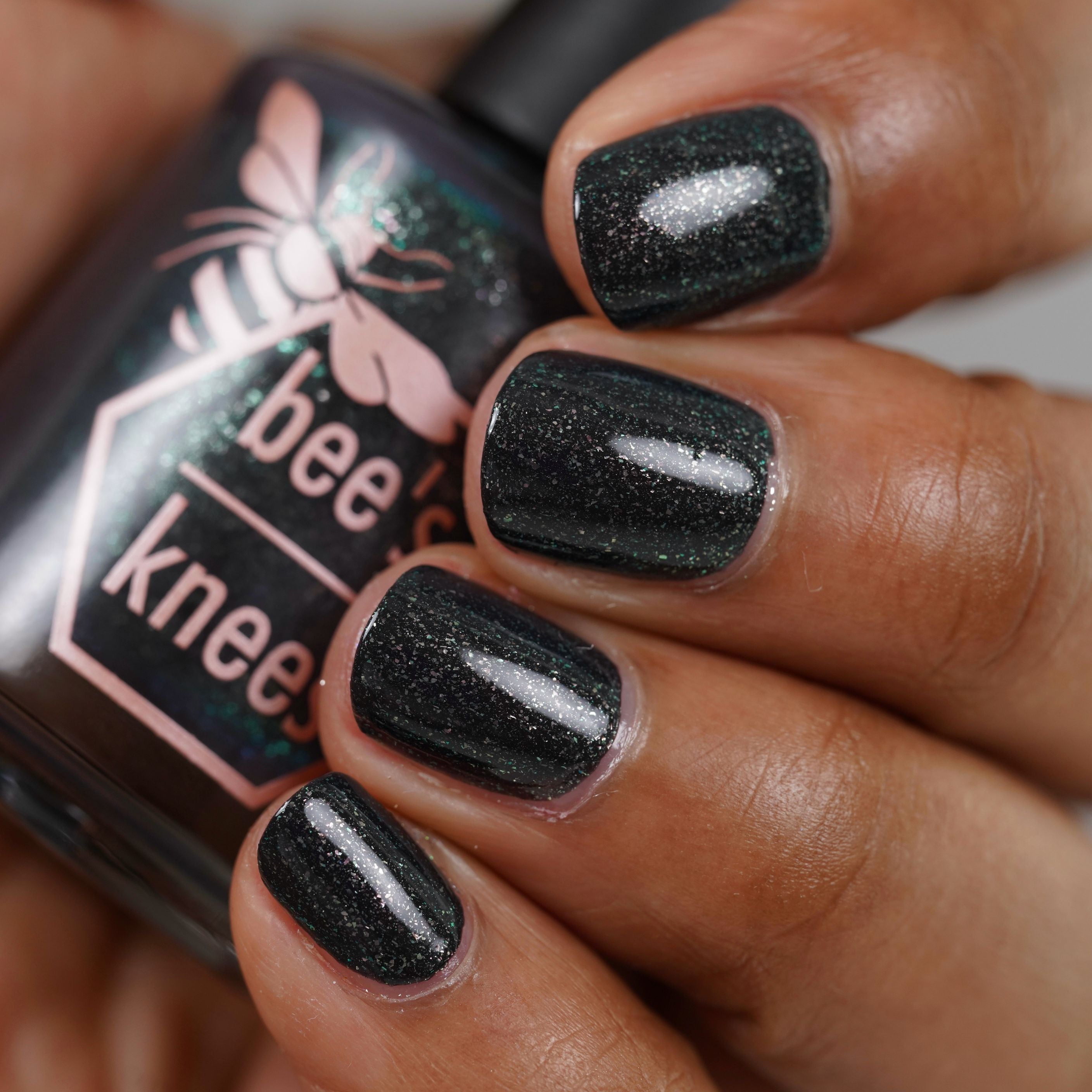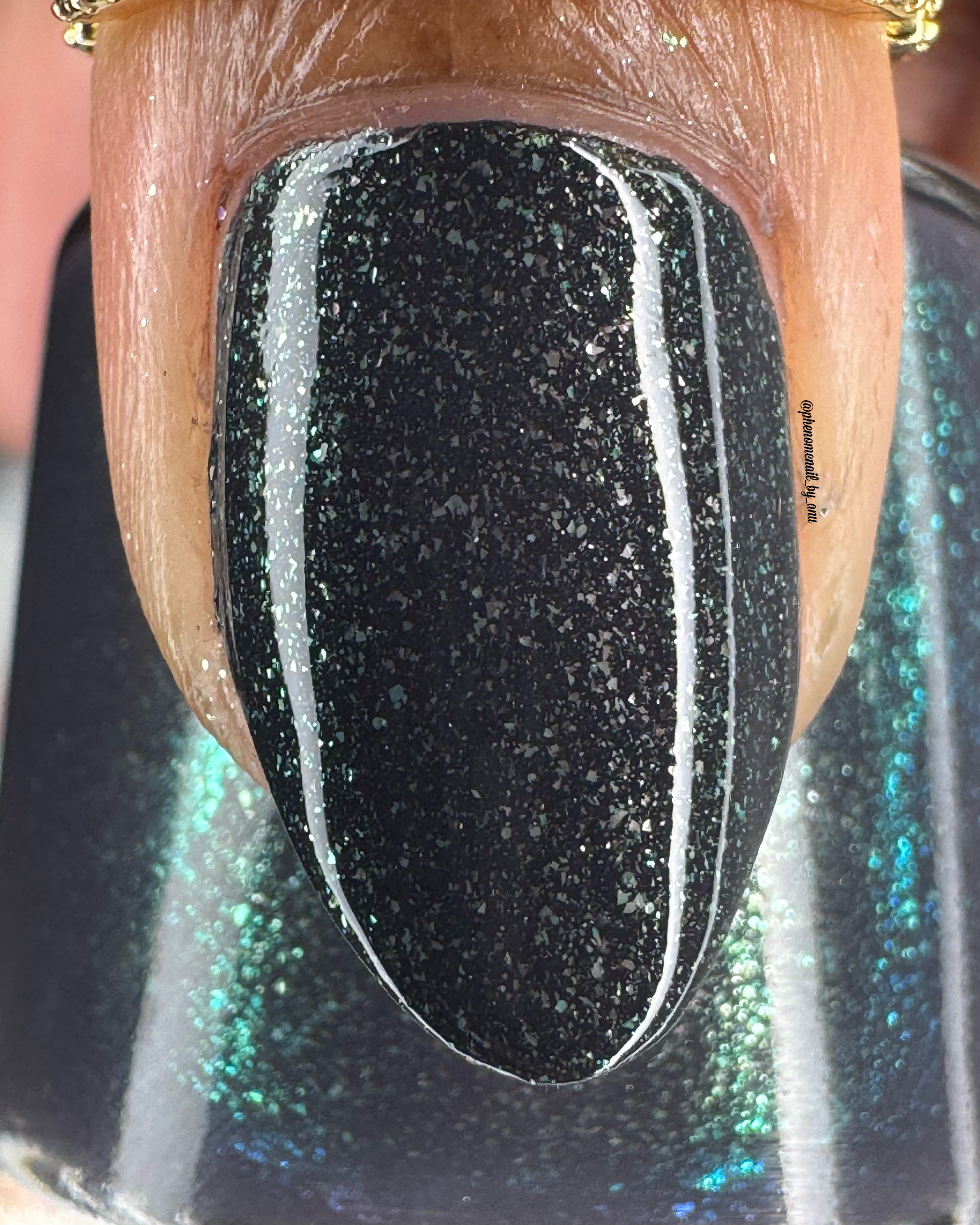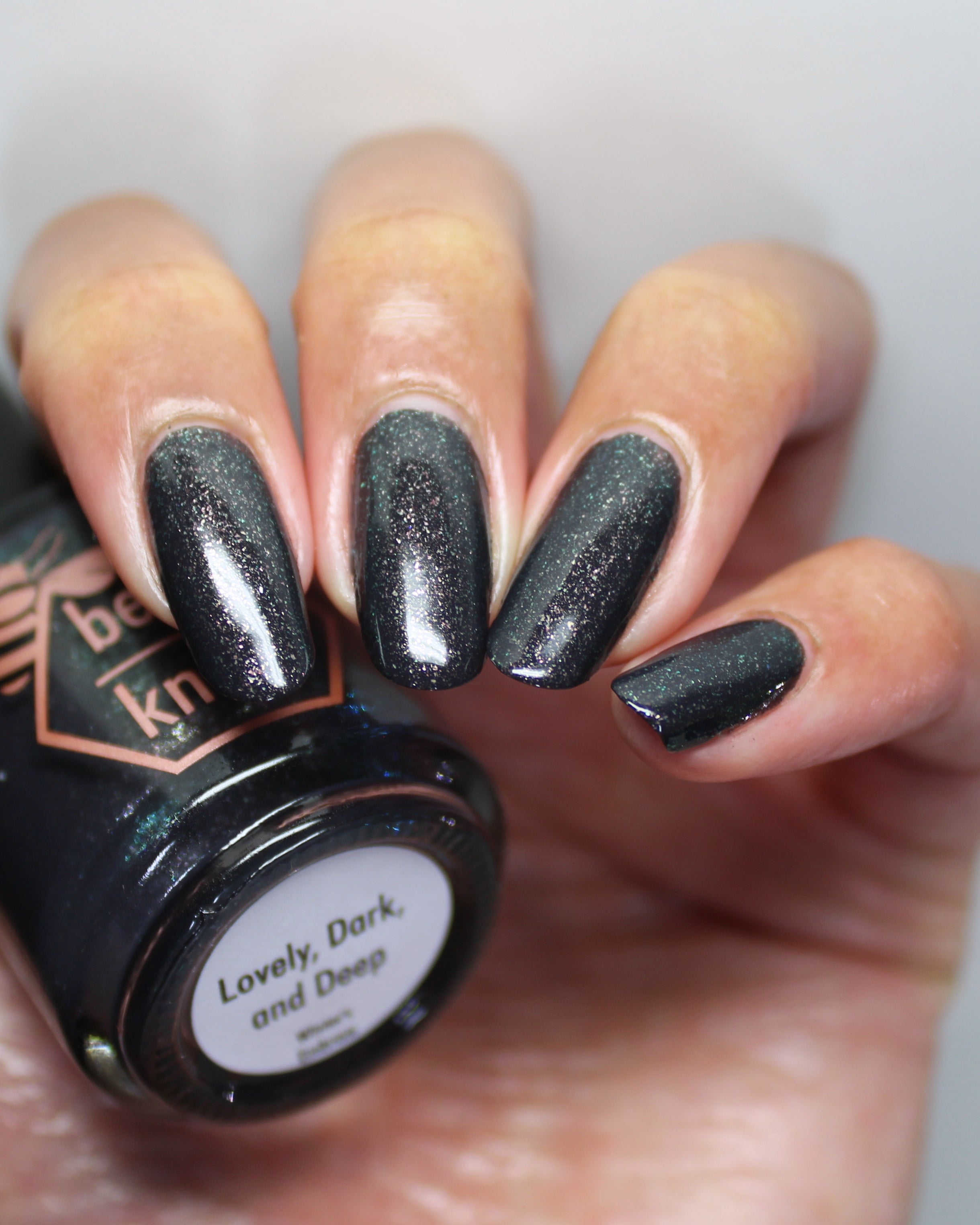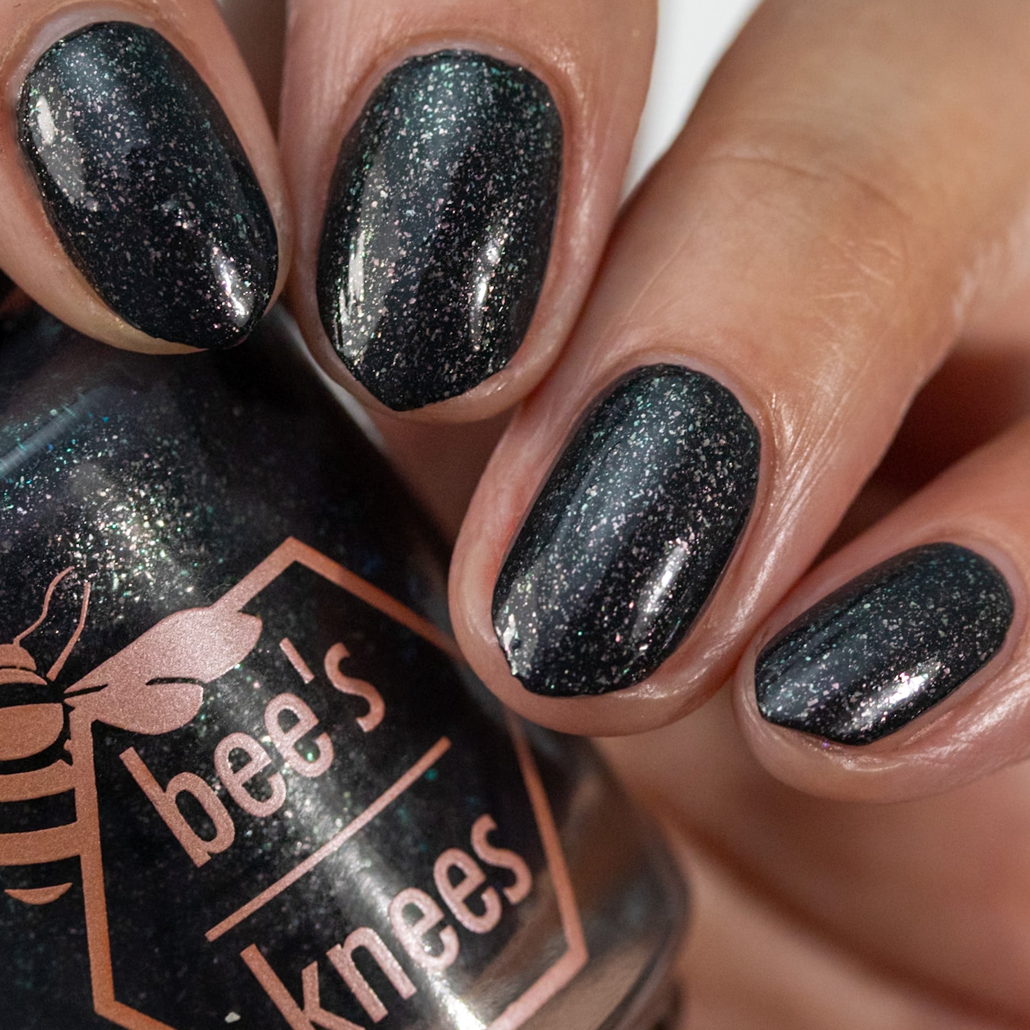 a charcoal polish frosted with a dusting of silver to green shimmer
