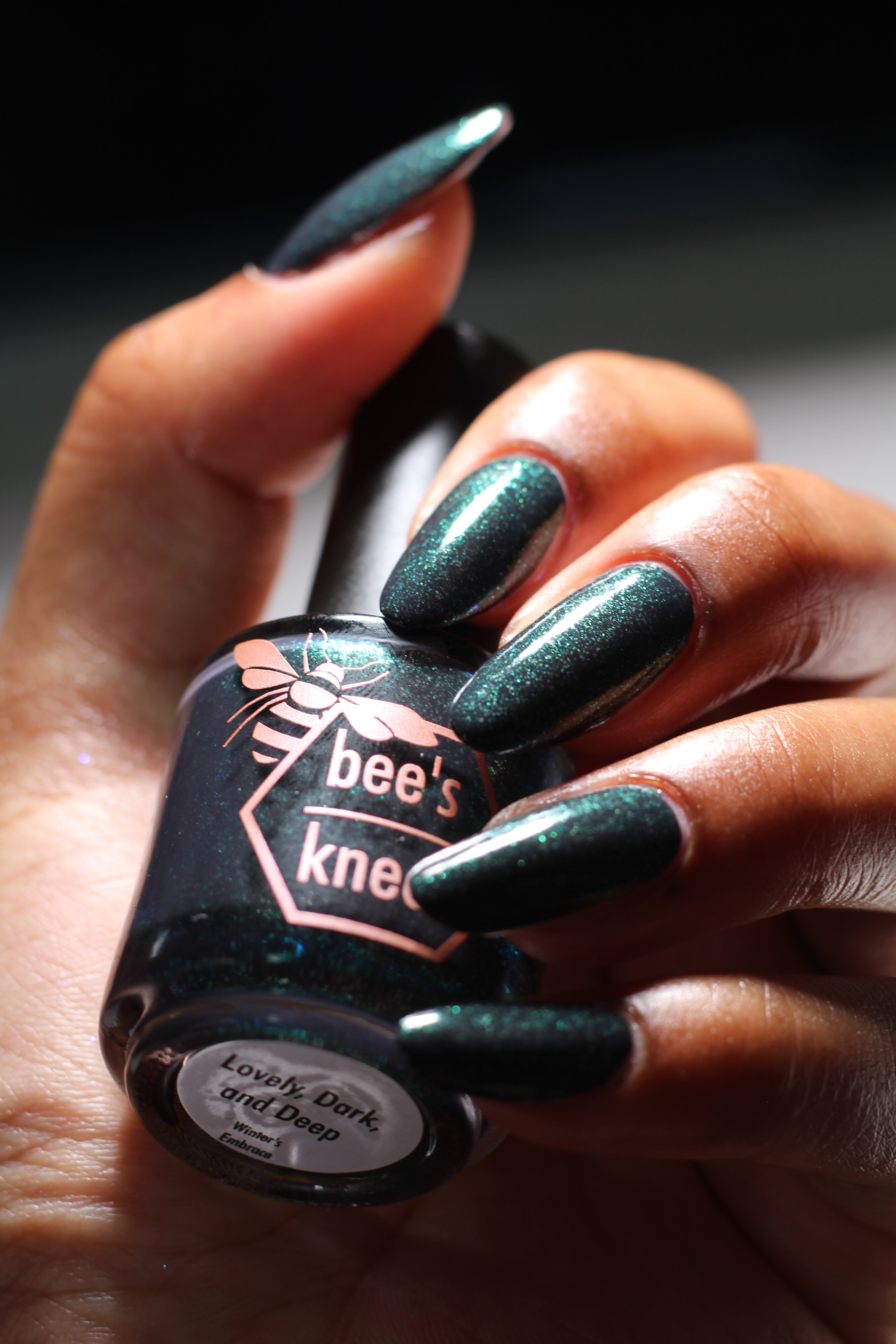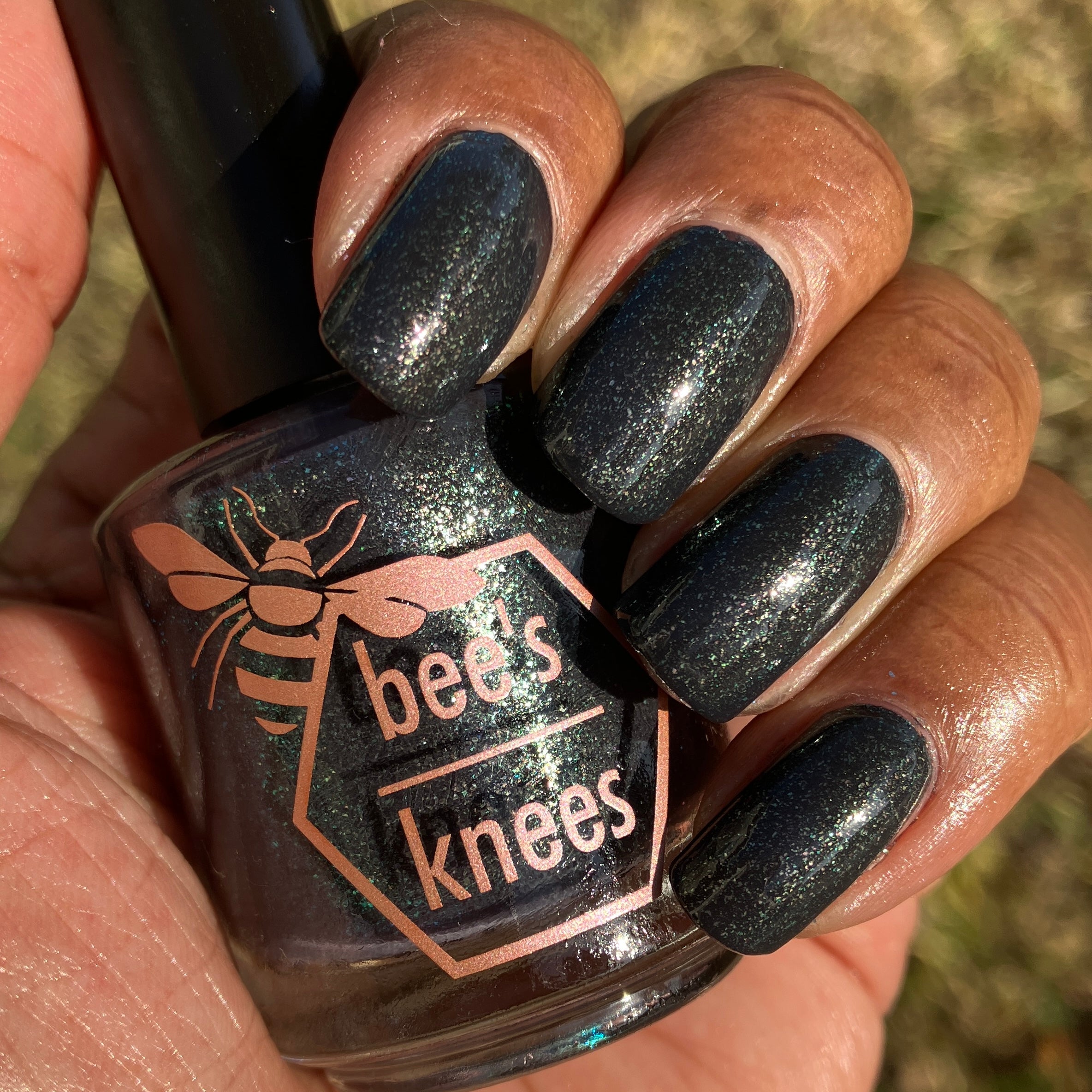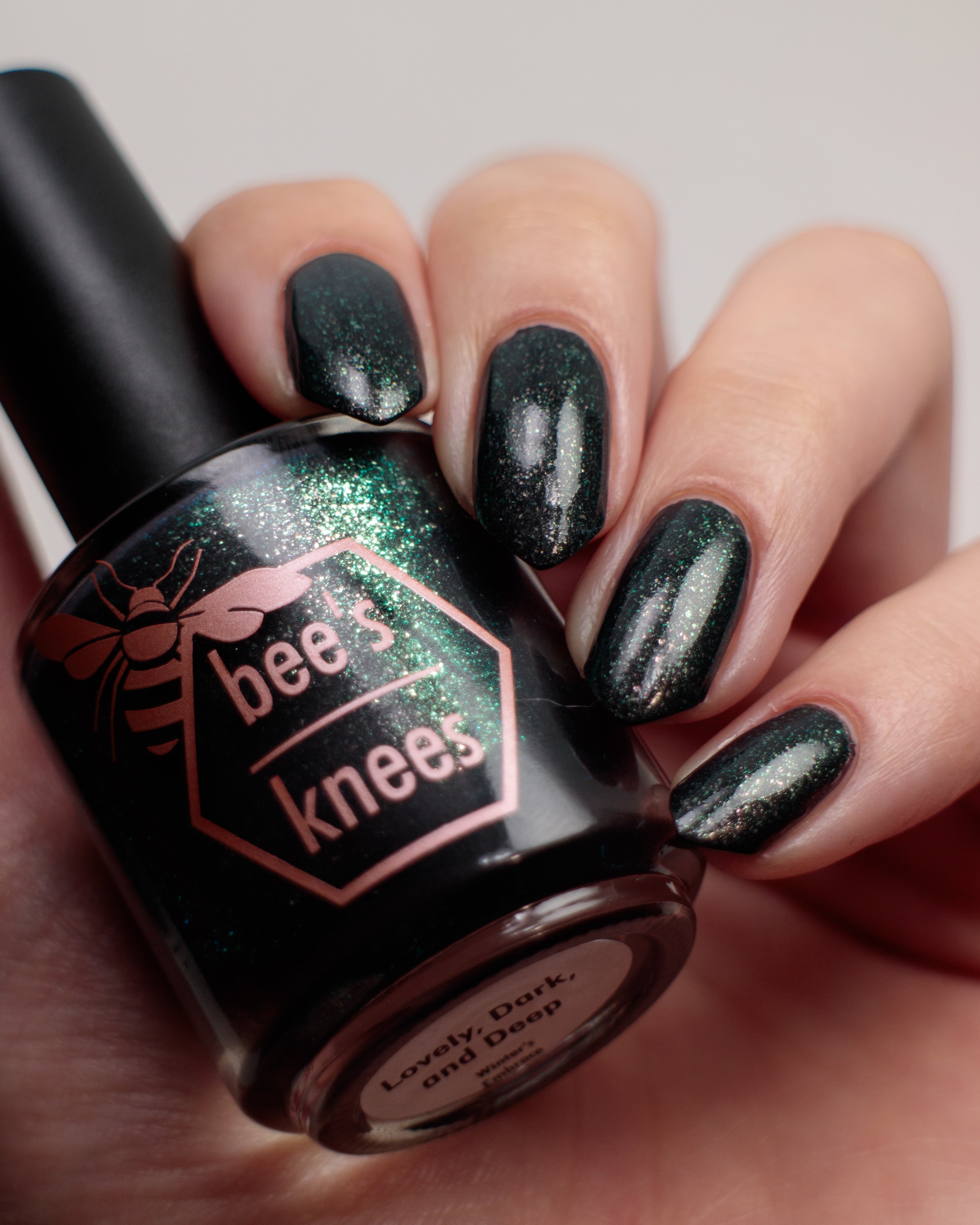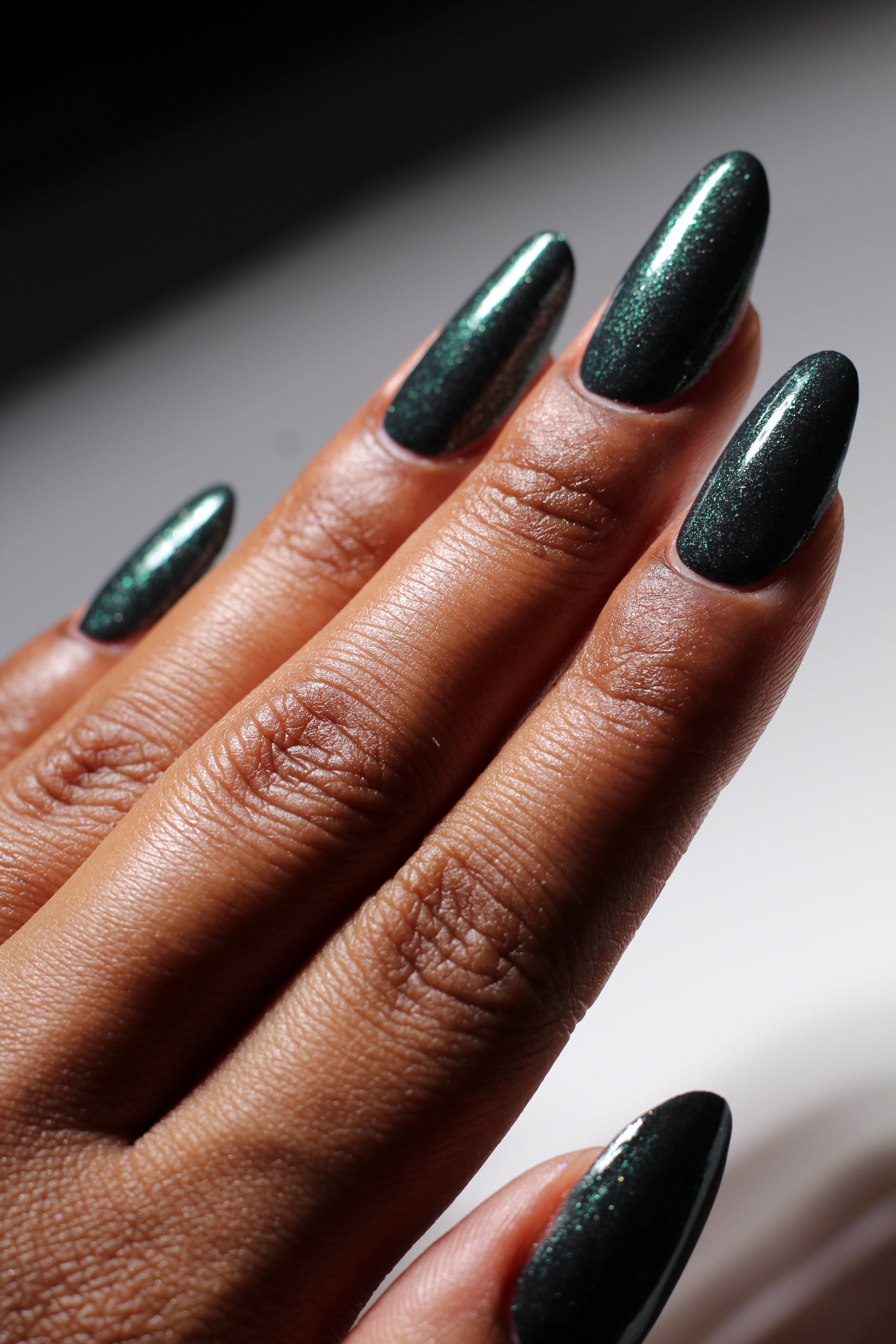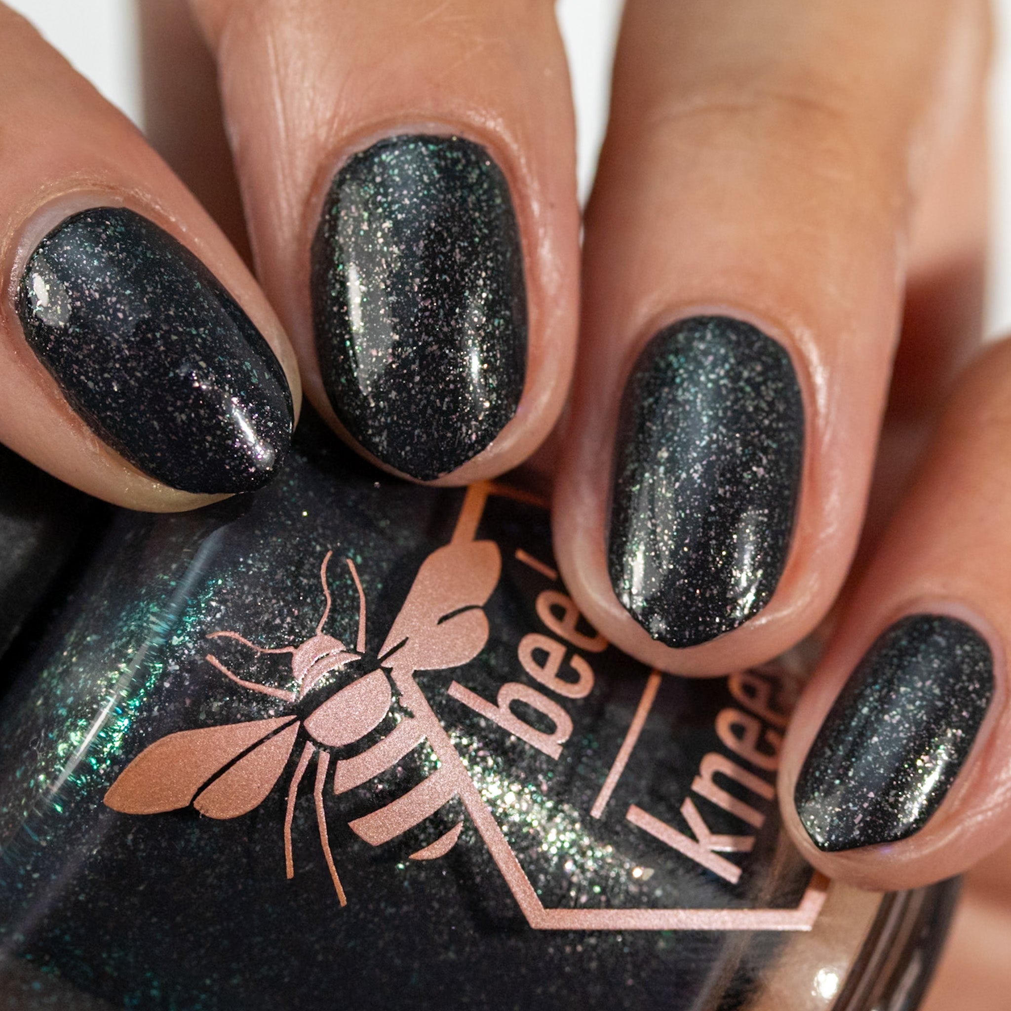 a charcoal polish frosted with a dusting of silver to green shimmer