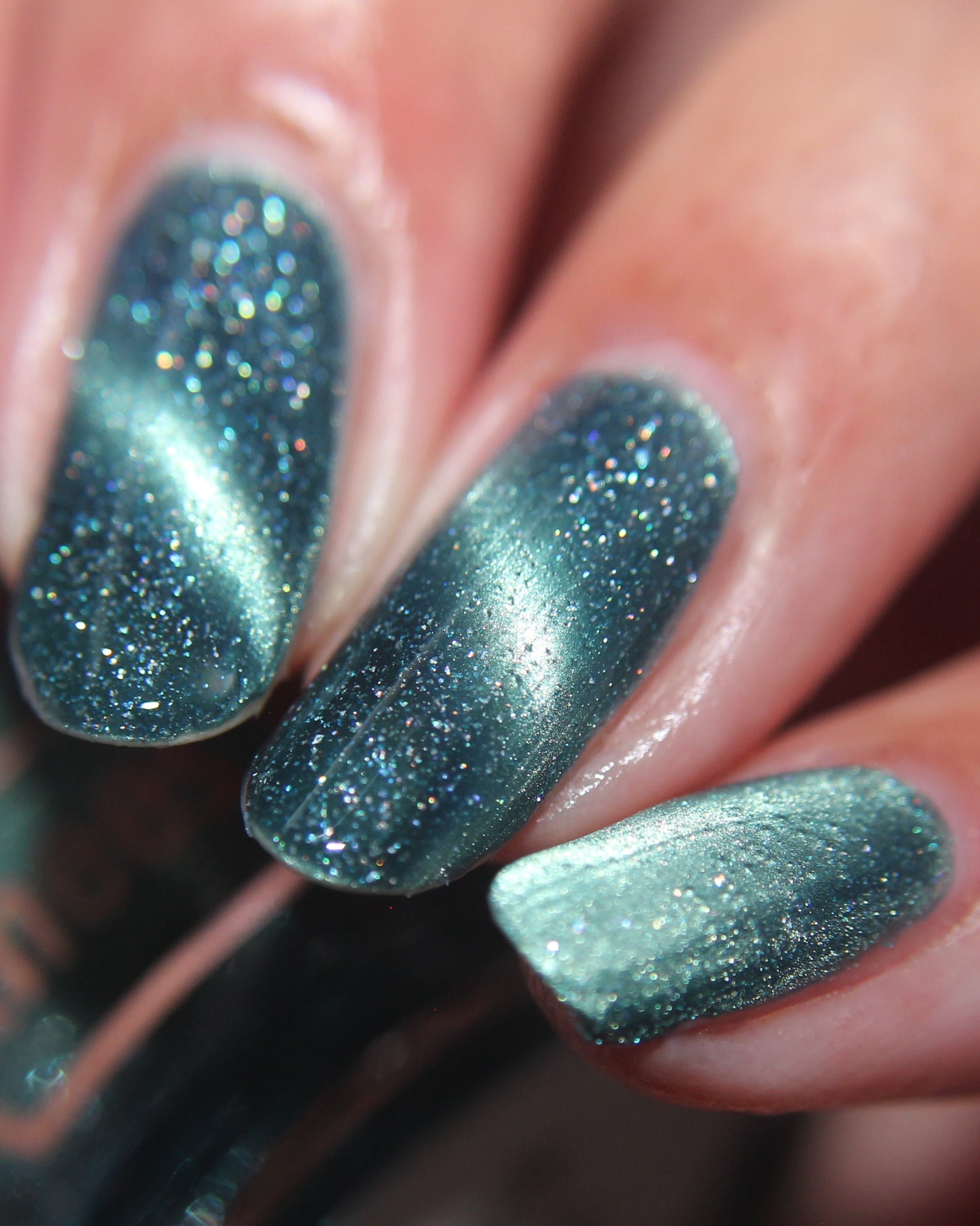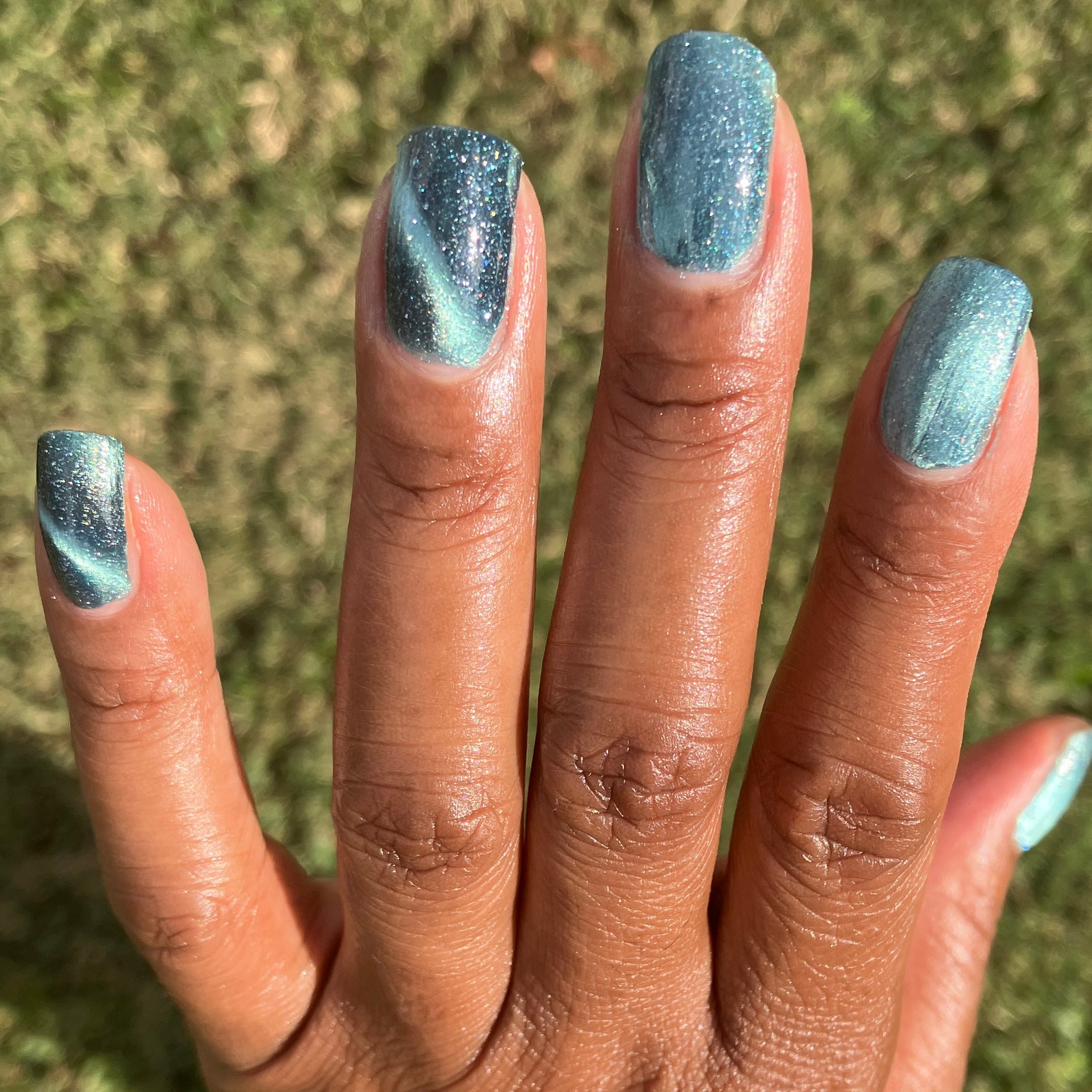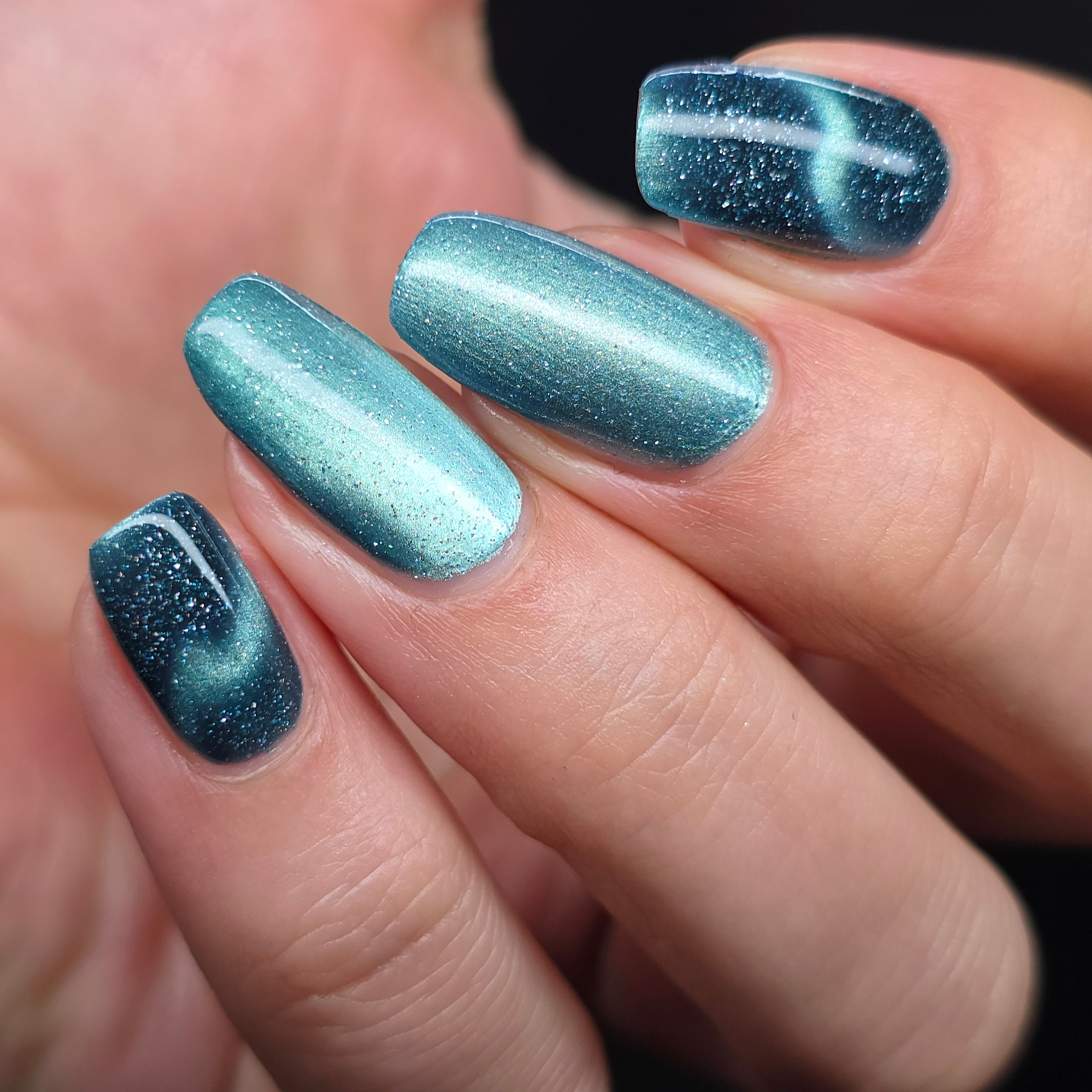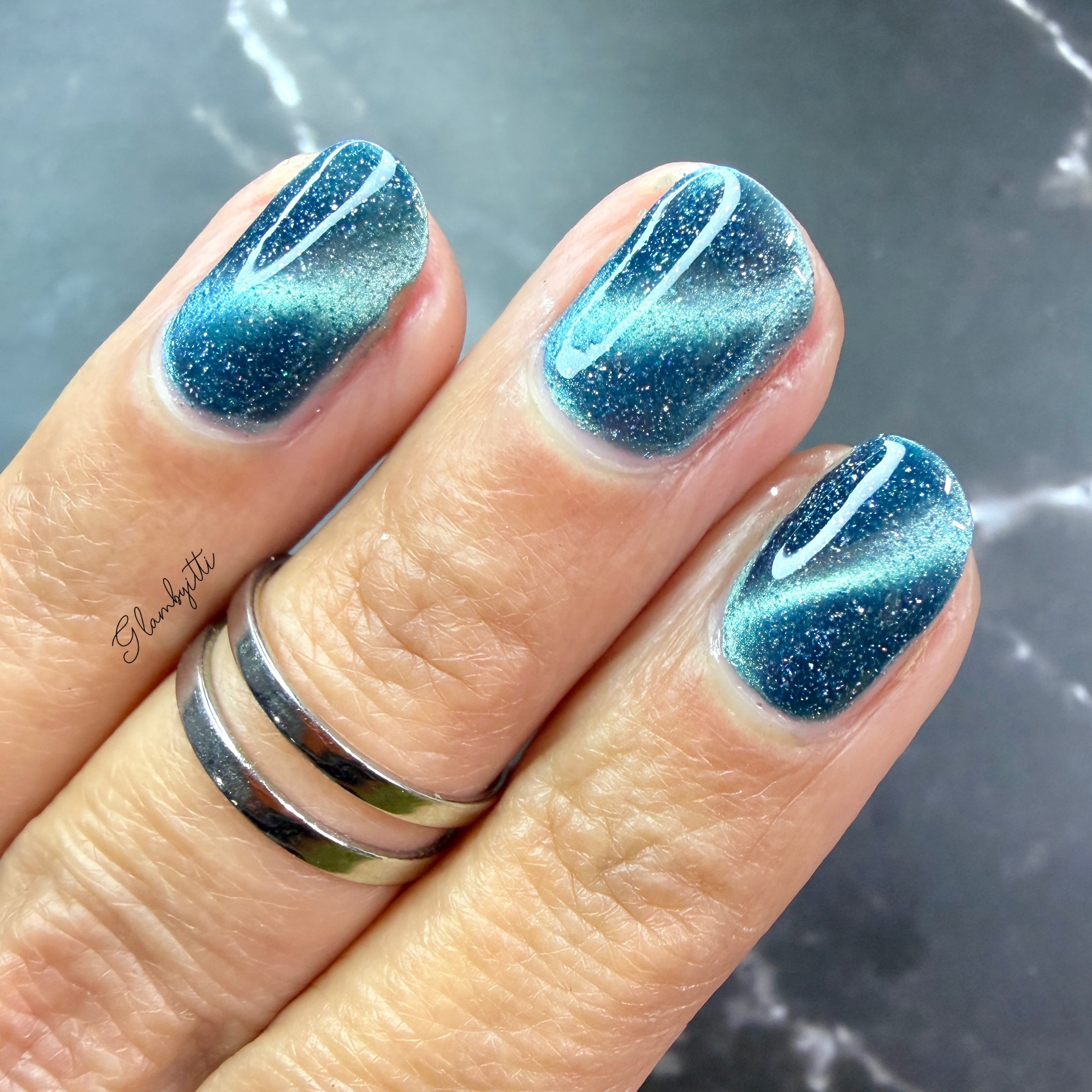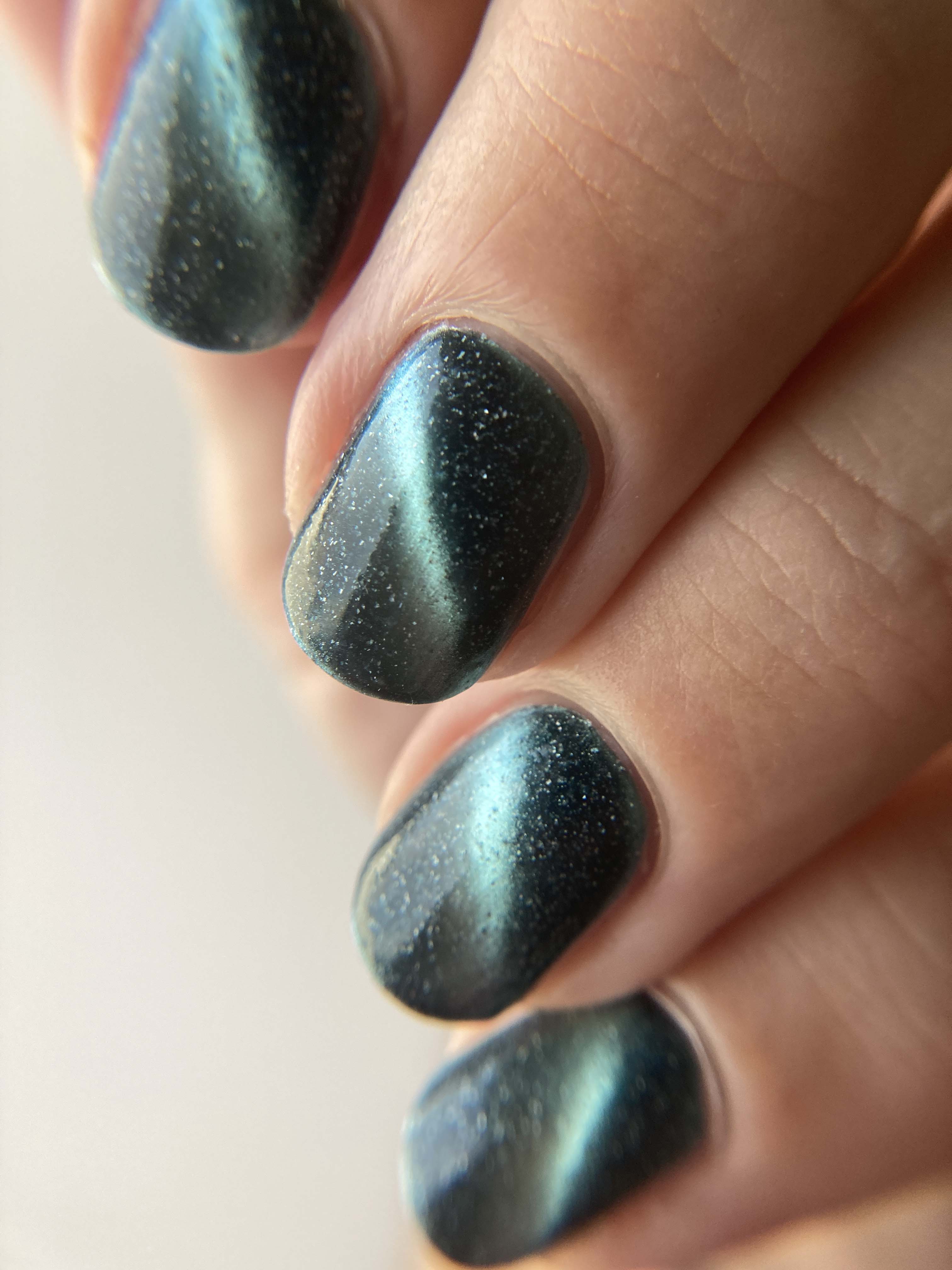 a cool blue base with icy blue magnetic shimmer as well as holo flakes and silver and sapphire light reflective glitter