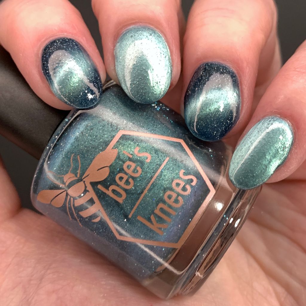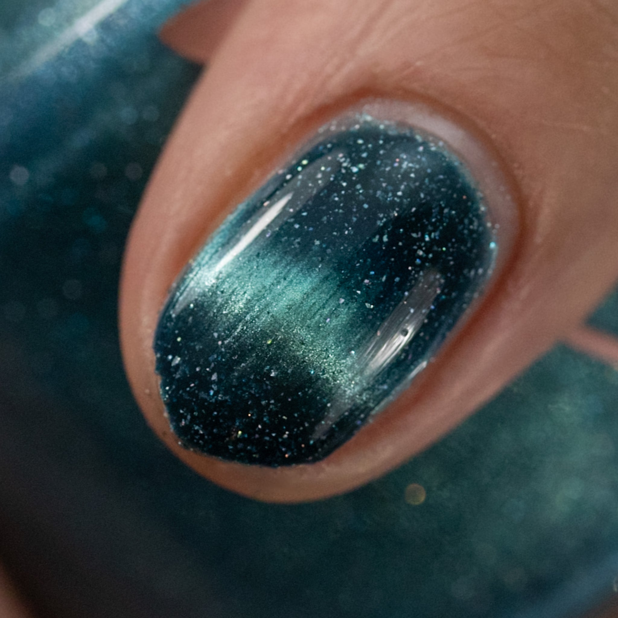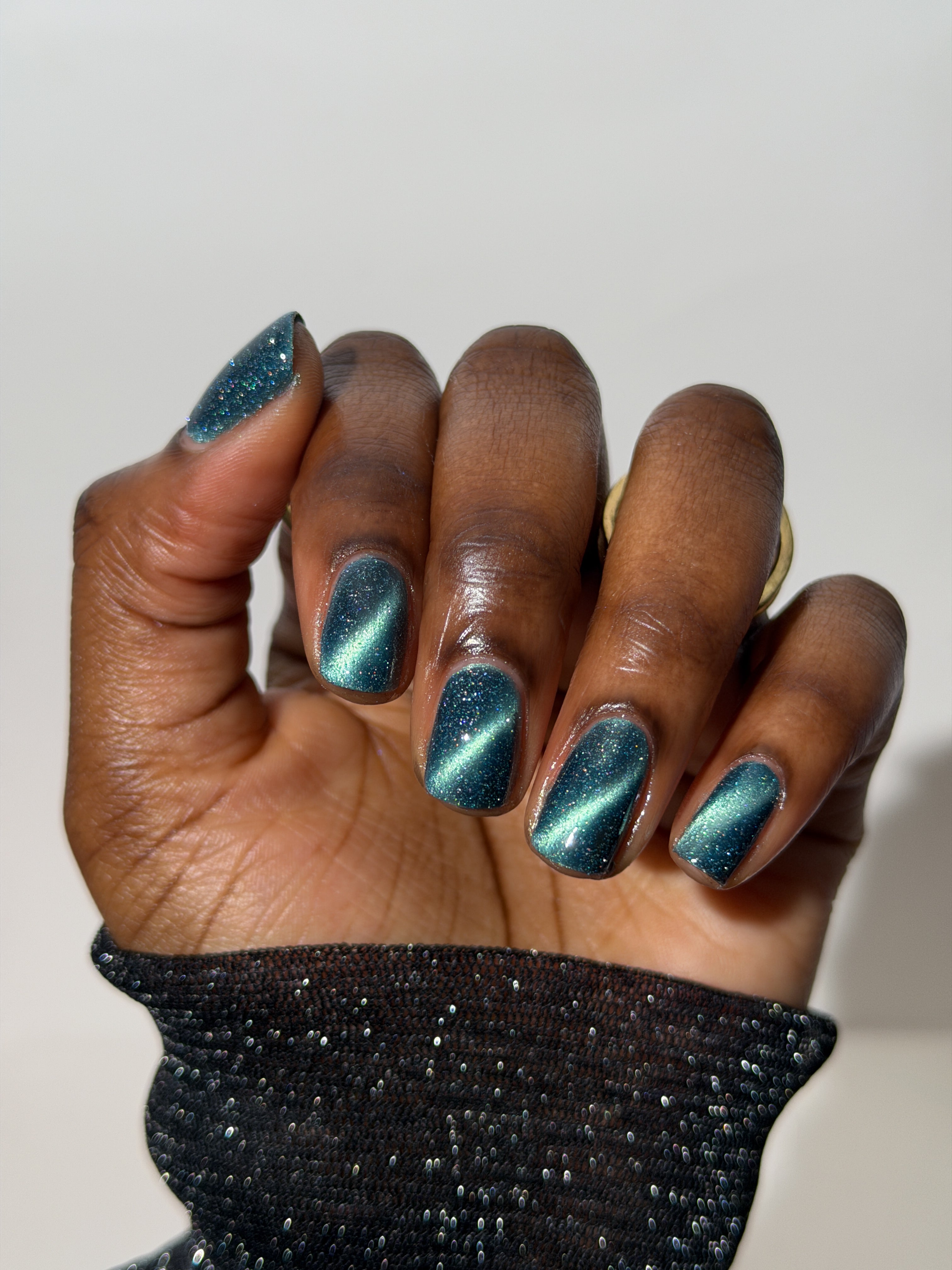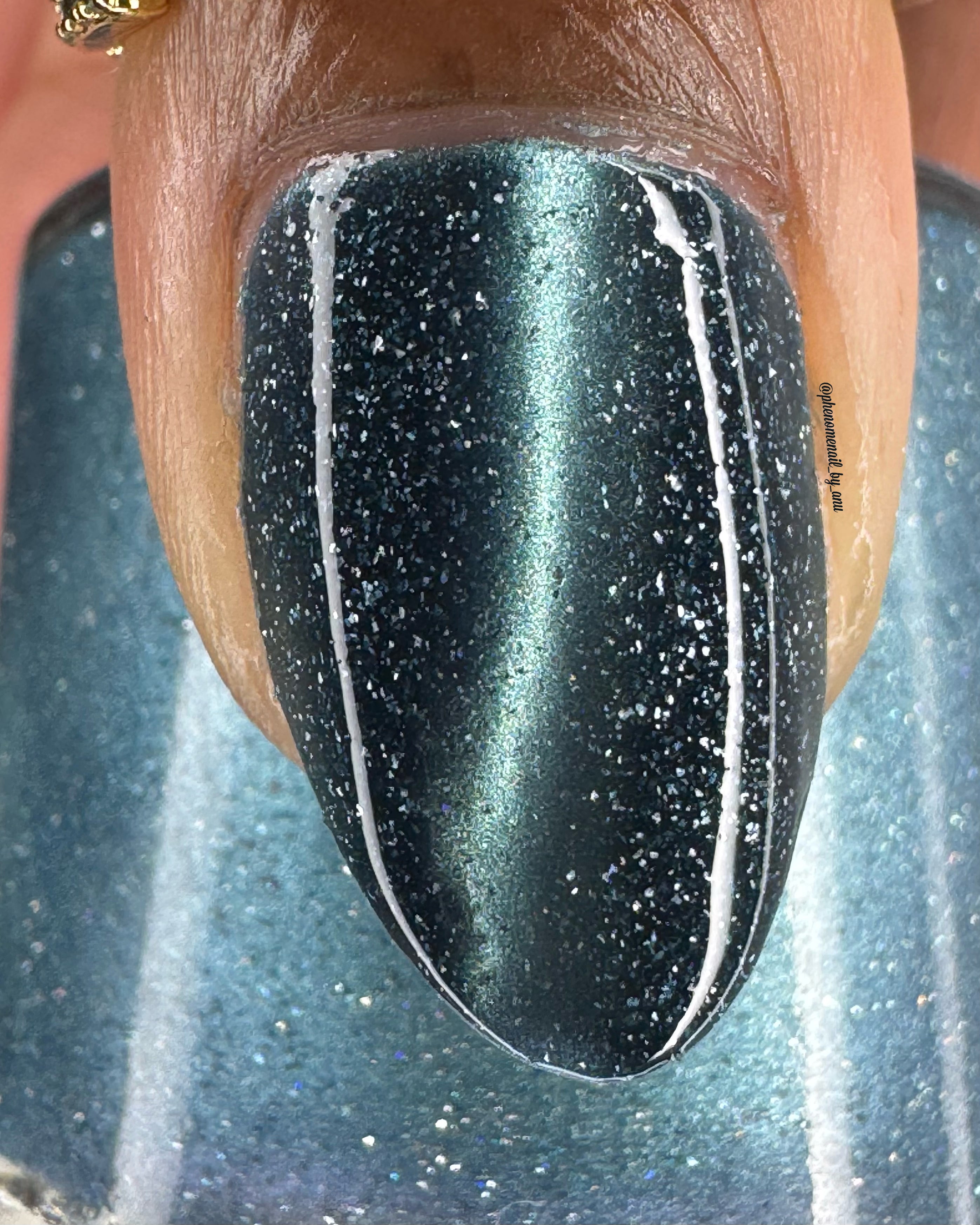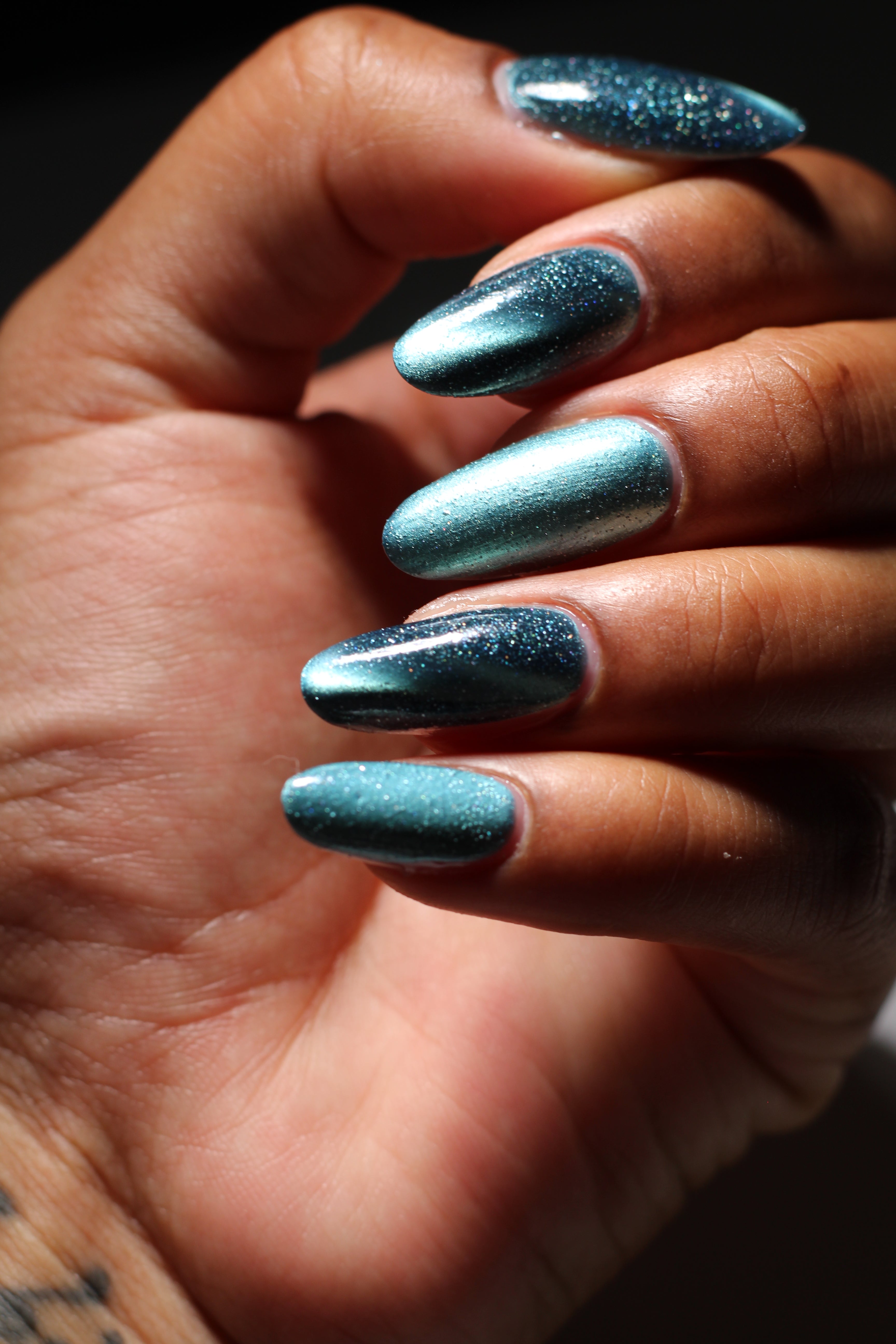 a cool blue base with icy blue magnetic shimmer as well as holo flakes and silver and sapphire light reflective glitter
