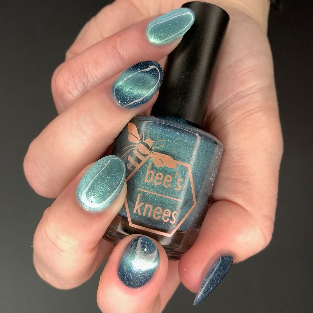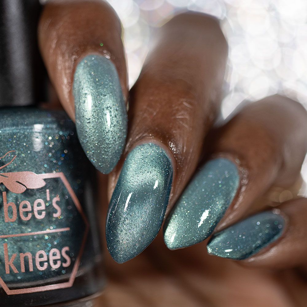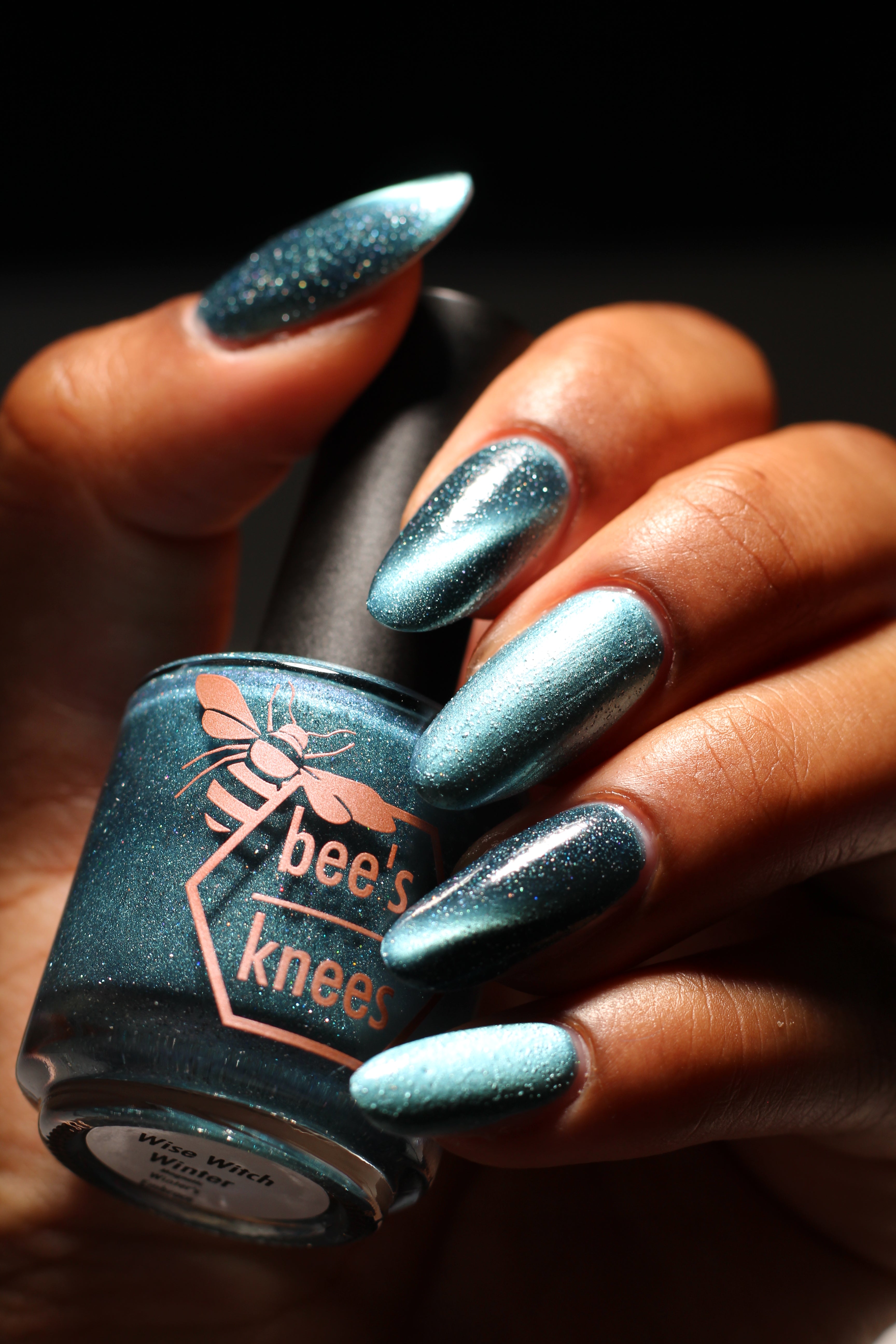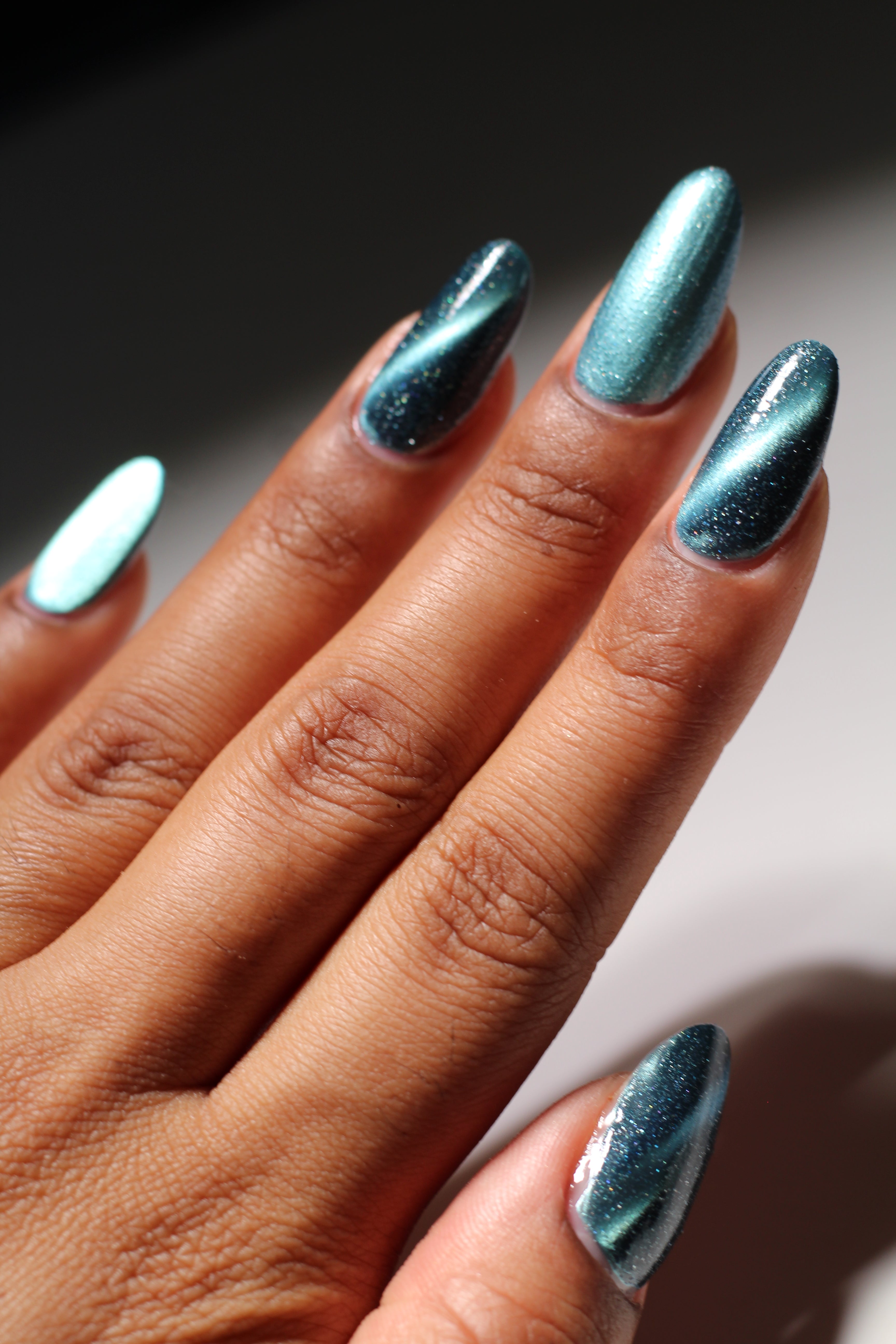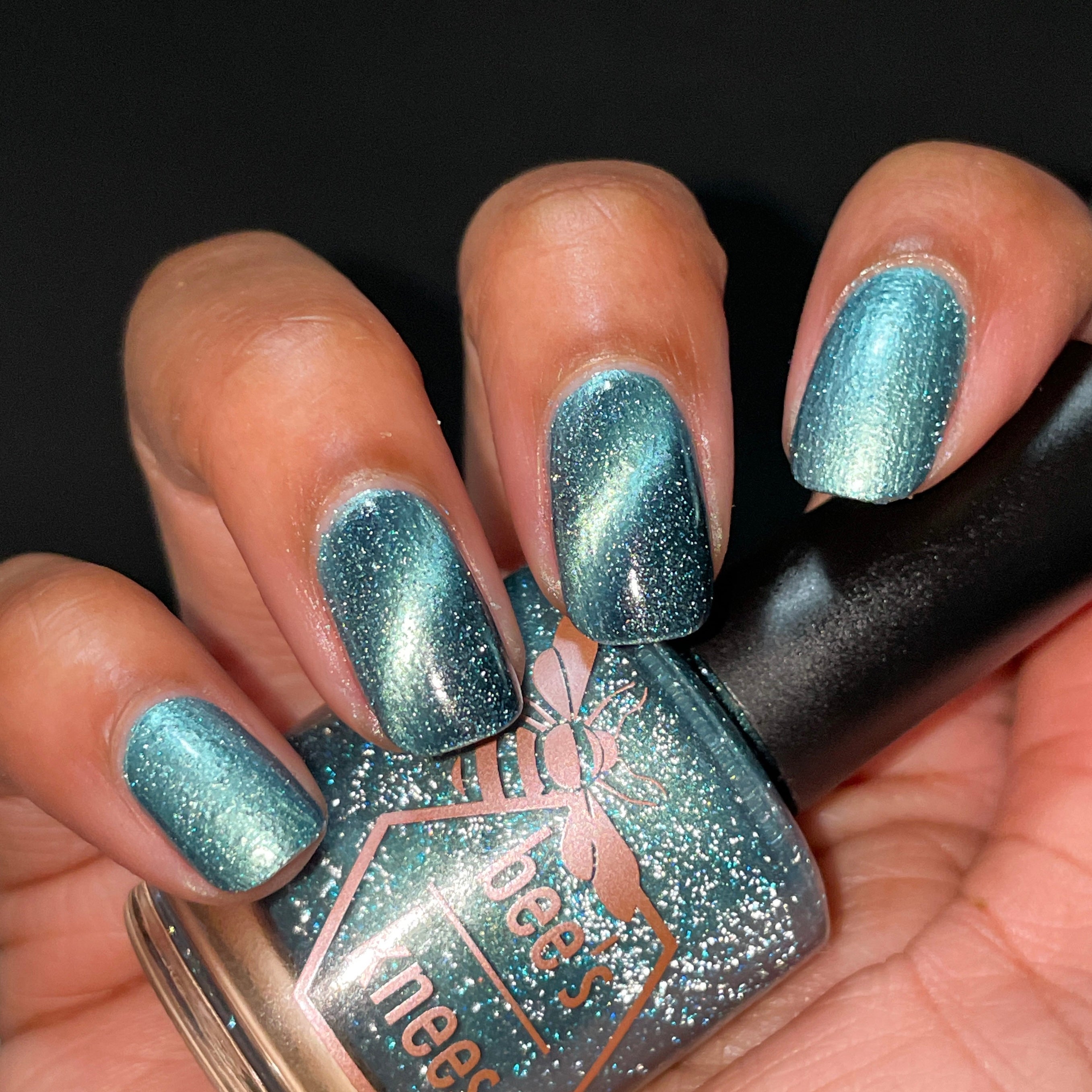 a cool blue base with icy blue magnetic shimmer as well as holo flakes and silver and sapphire light reflective glitter