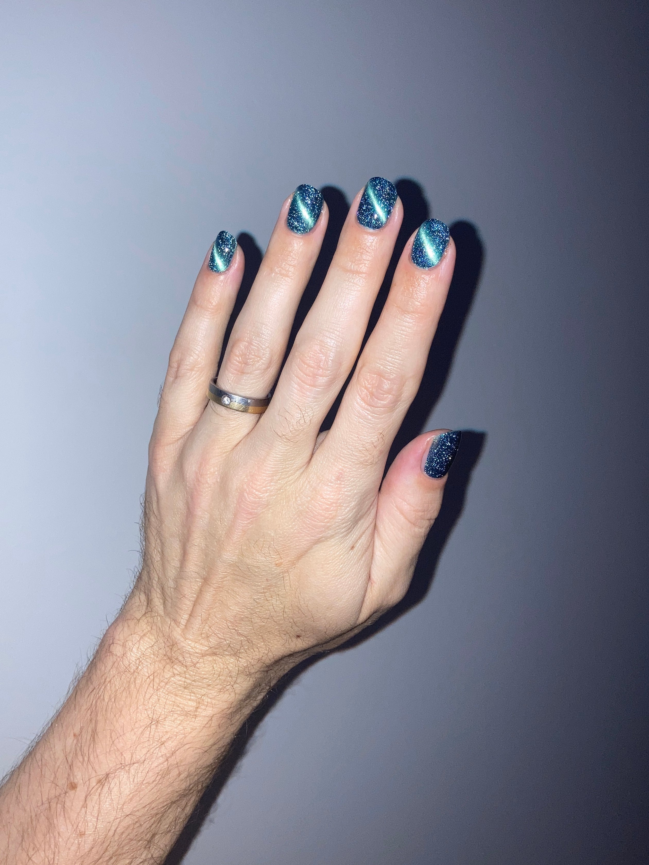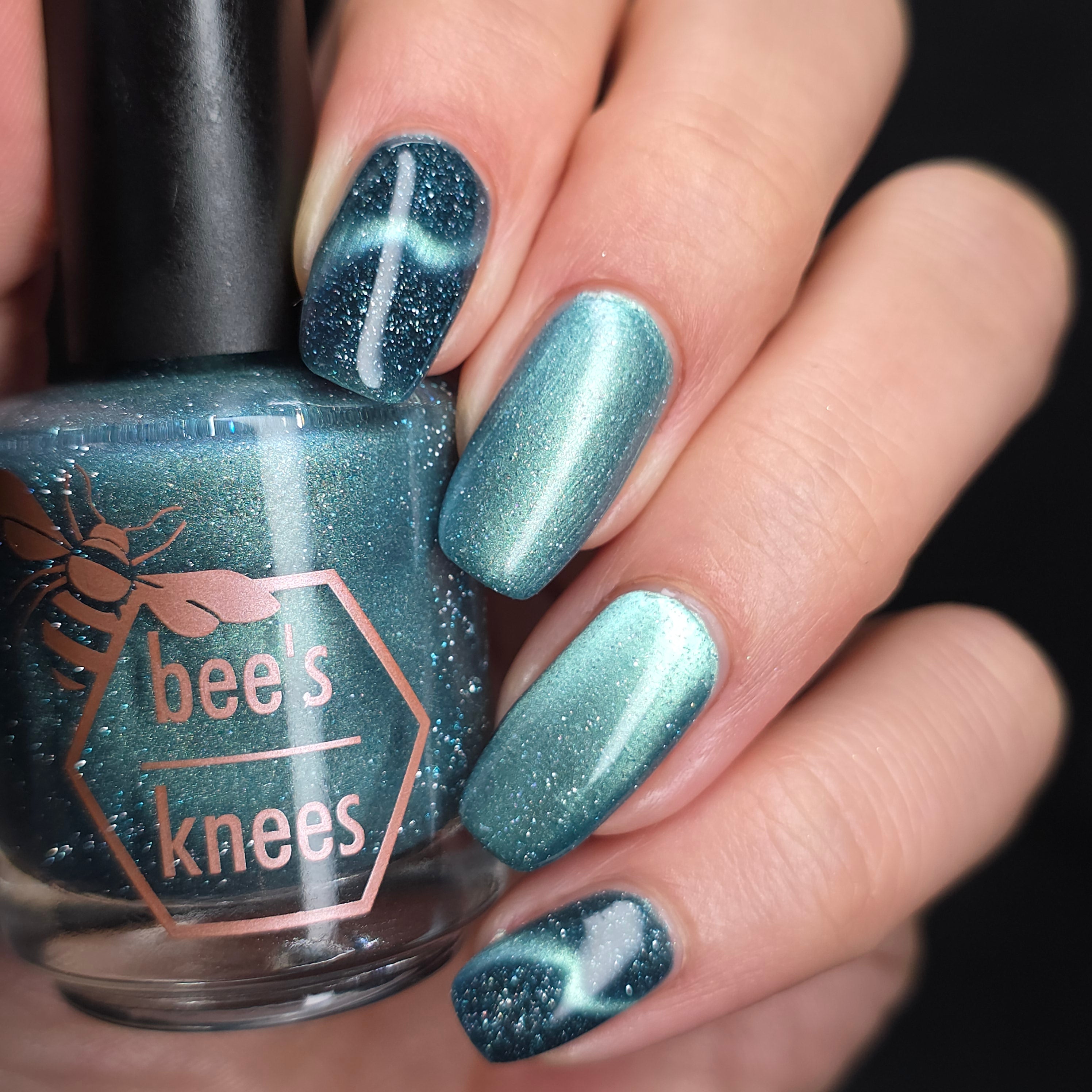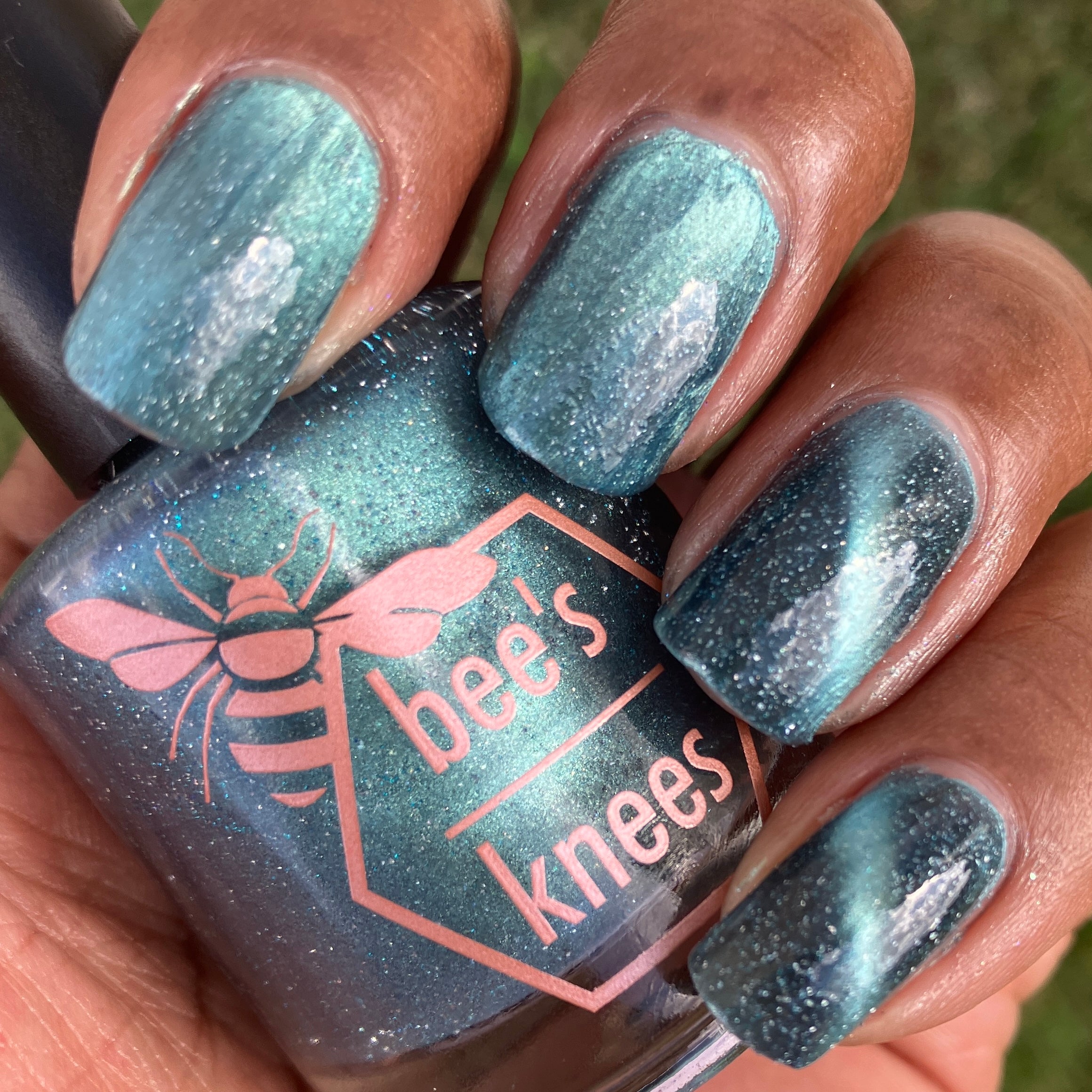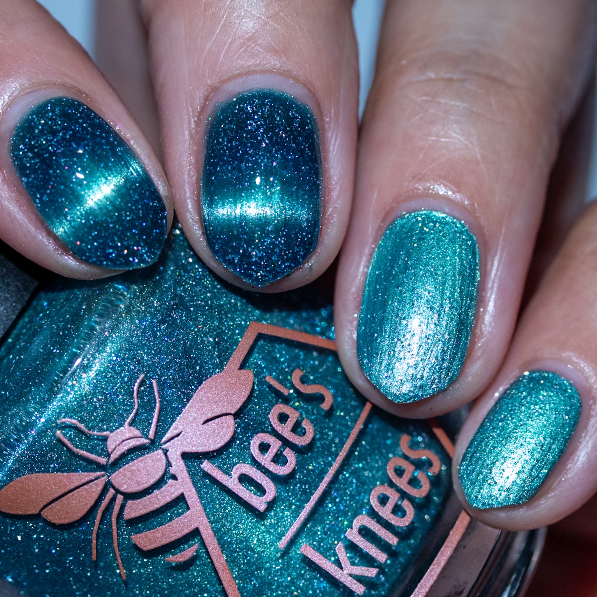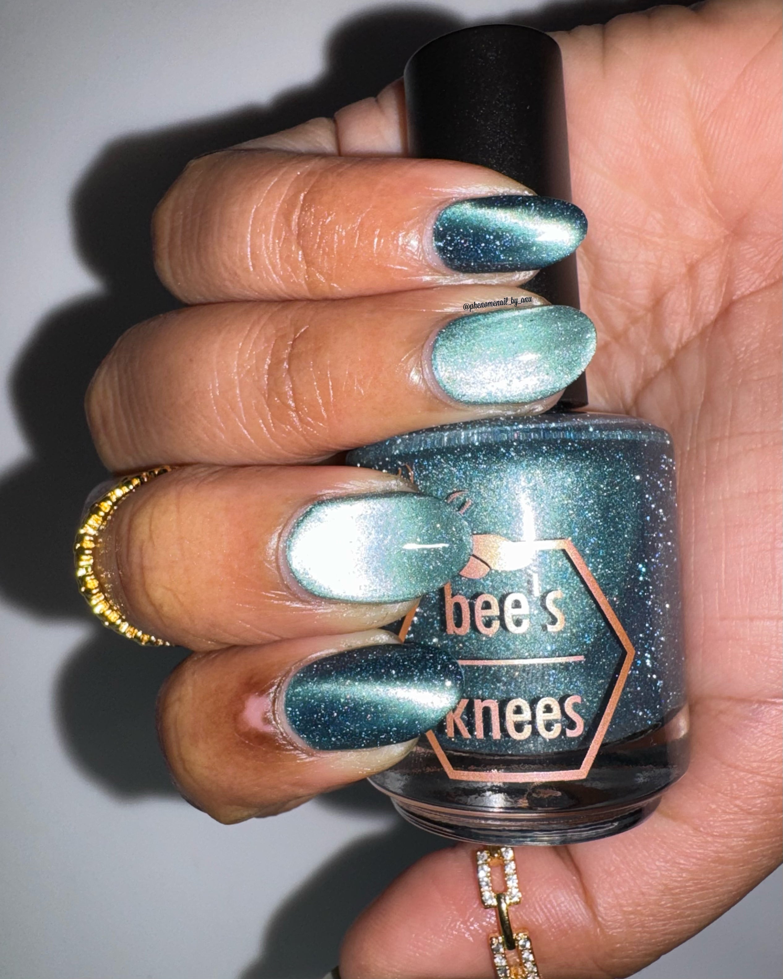 a cool blue base with icy blue magnetic shimmer as well as holo flakes and silver and sapphire light reflective glitter