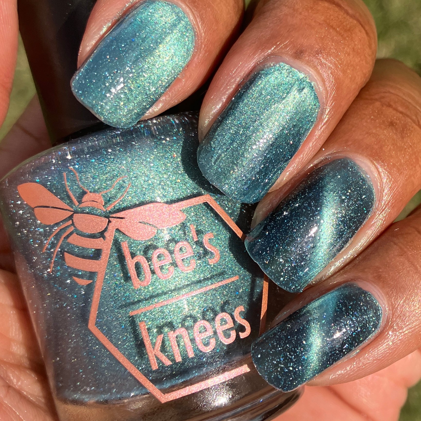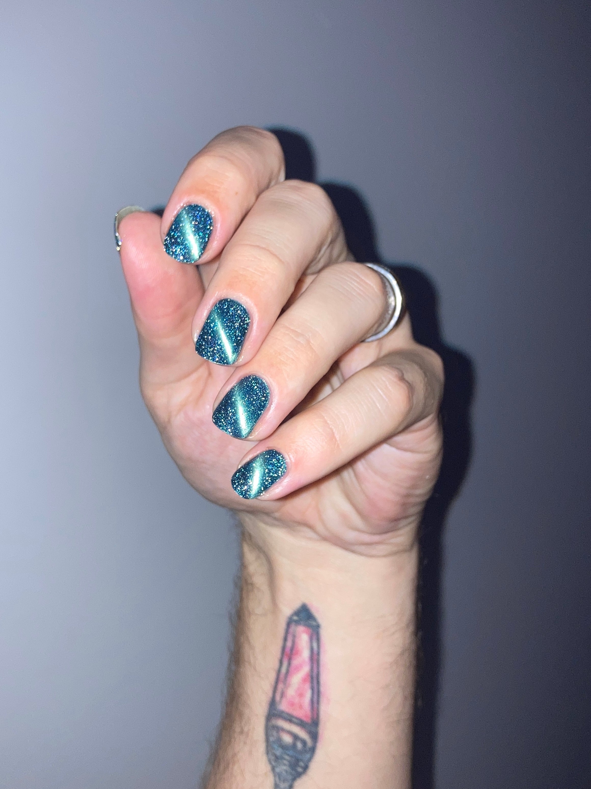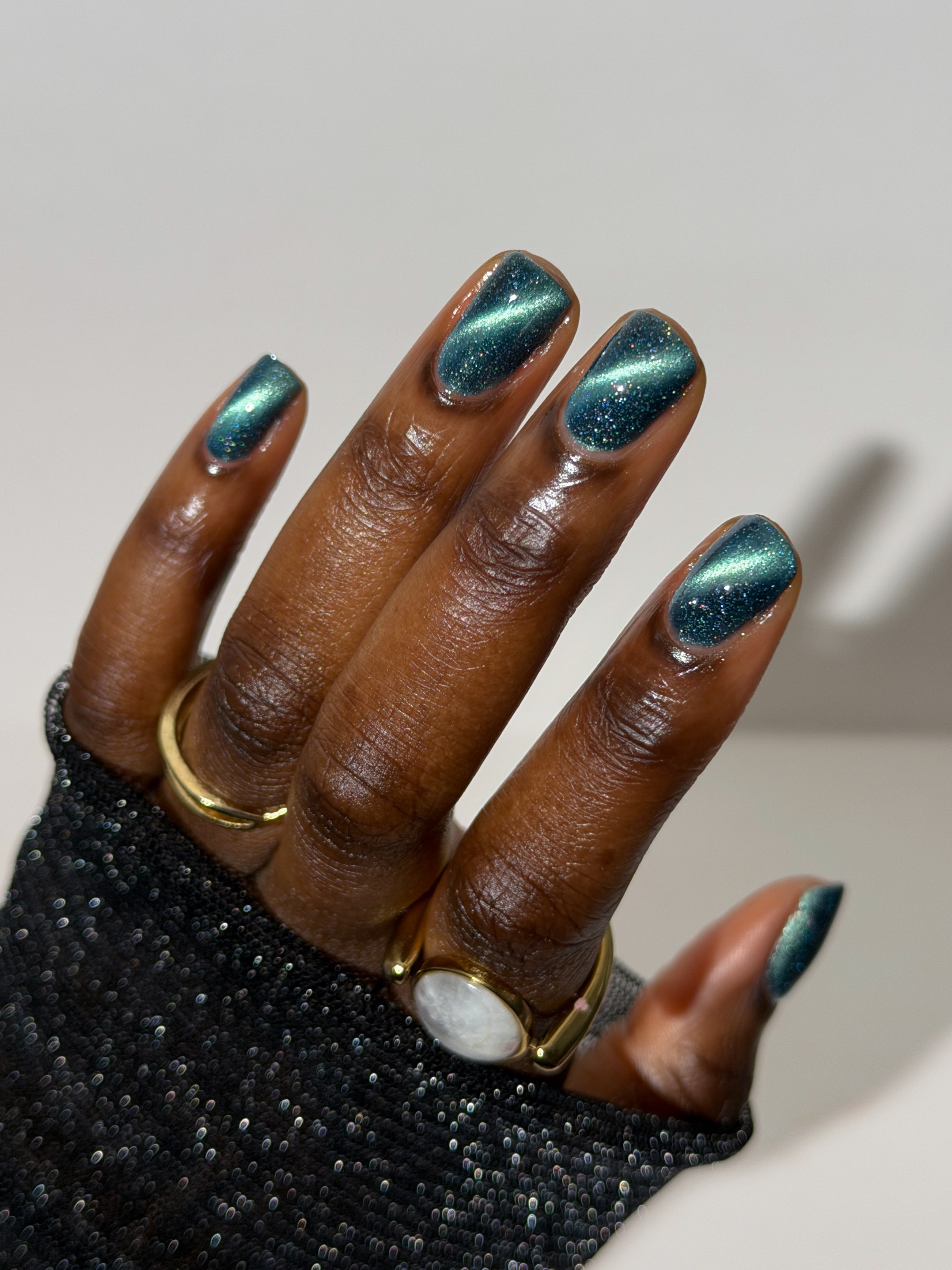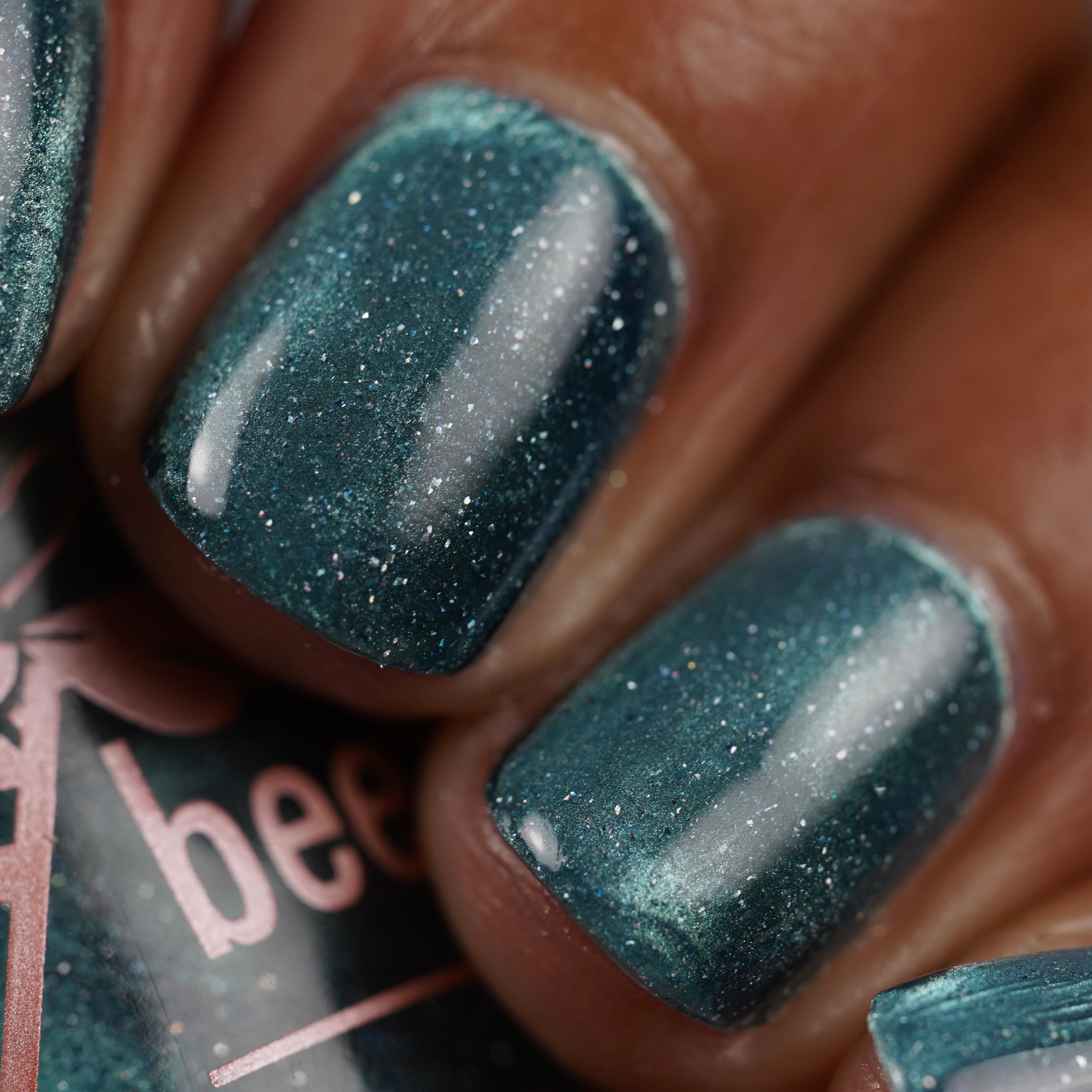 a cool blue base with icy blue magnetic shimmer as well as holo flakes and silver and sapphire light reflective glitter