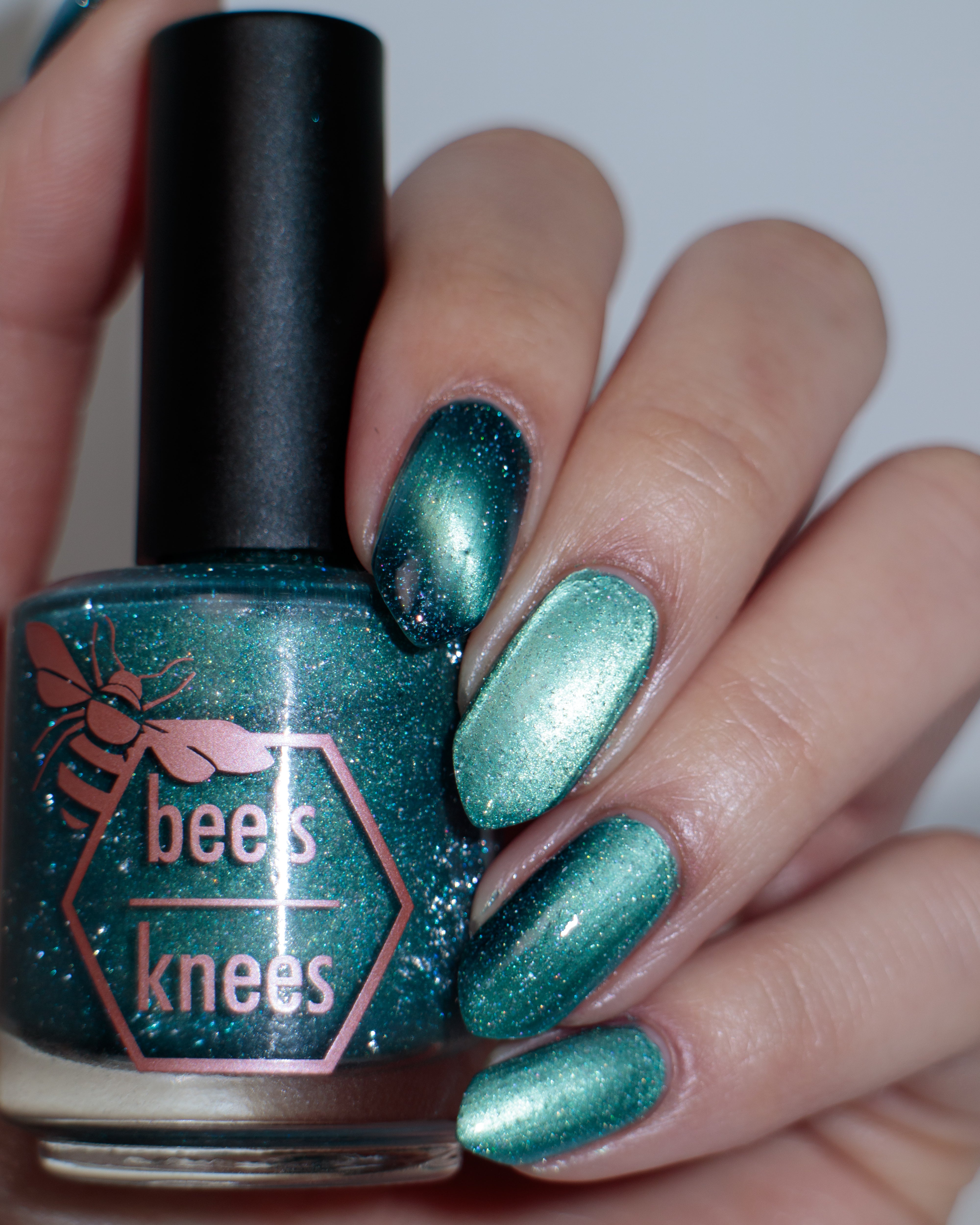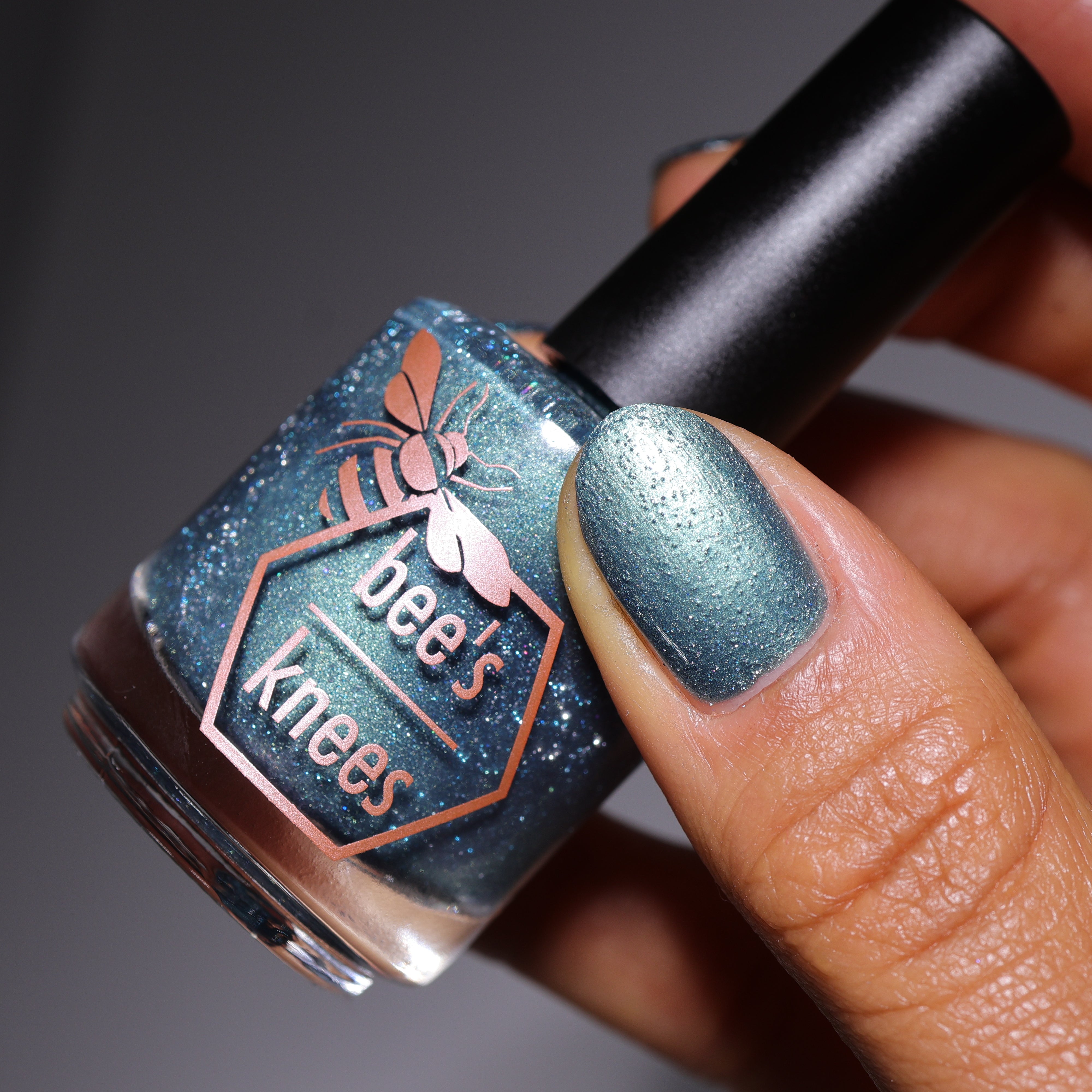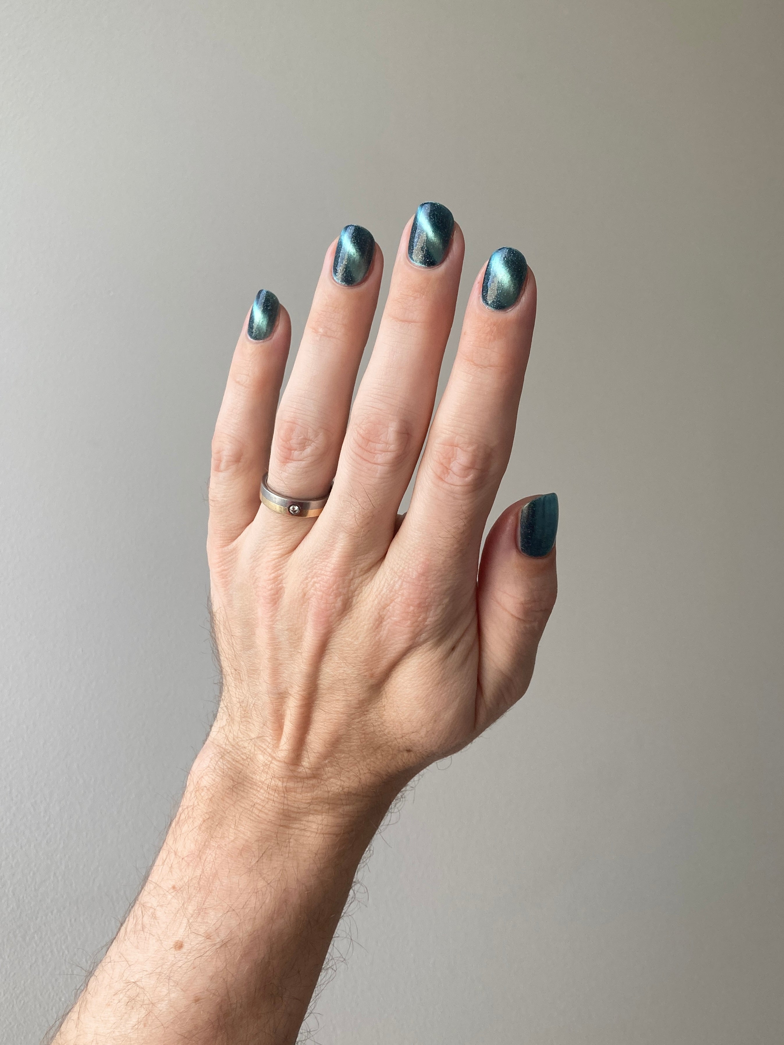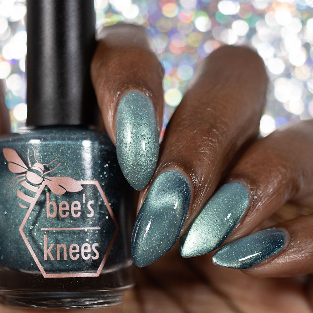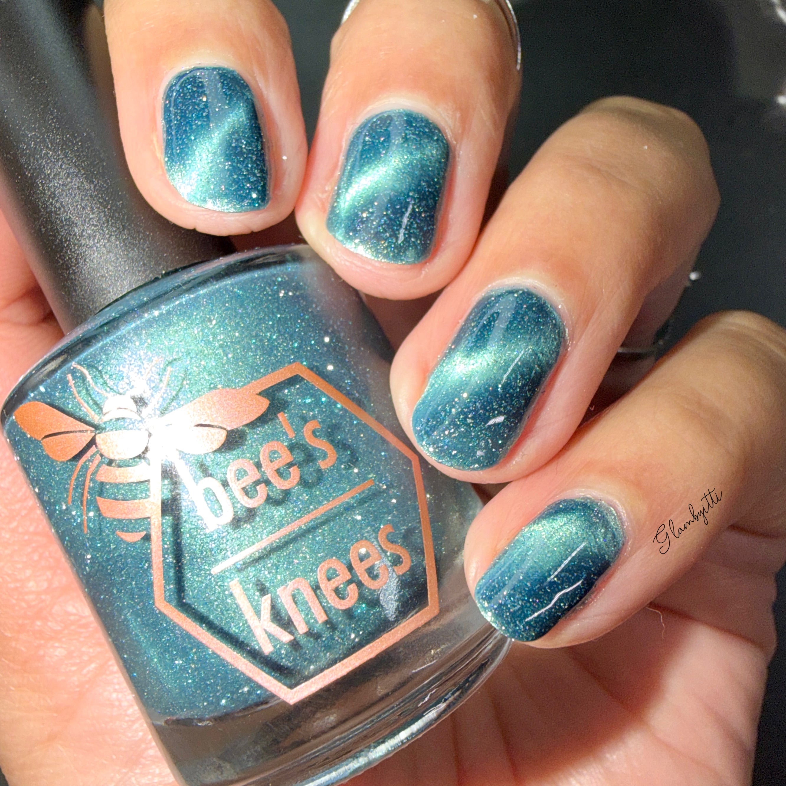 a cool blue base with icy blue magnetic shimmer as well as holo flakes and silver and sapphire light reflective glitter