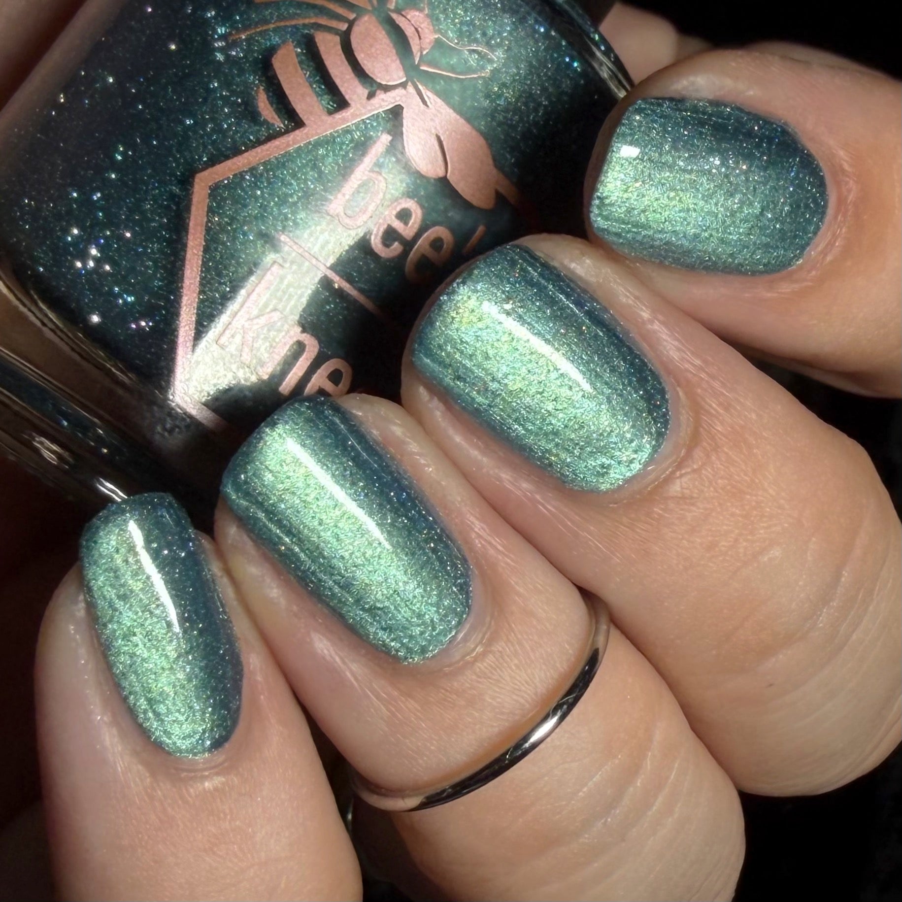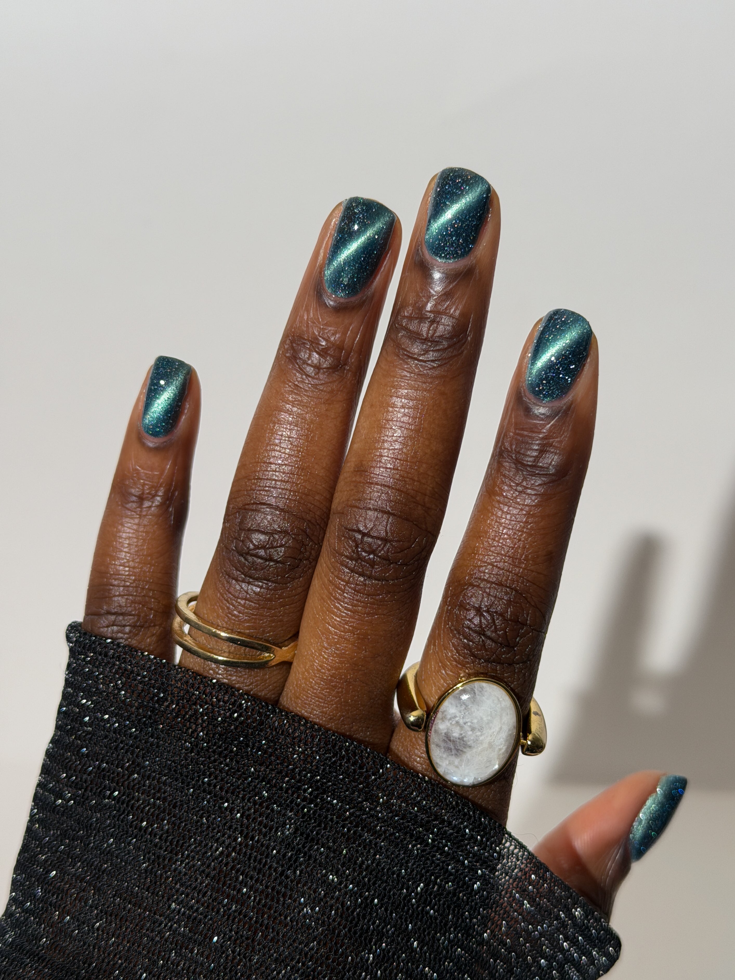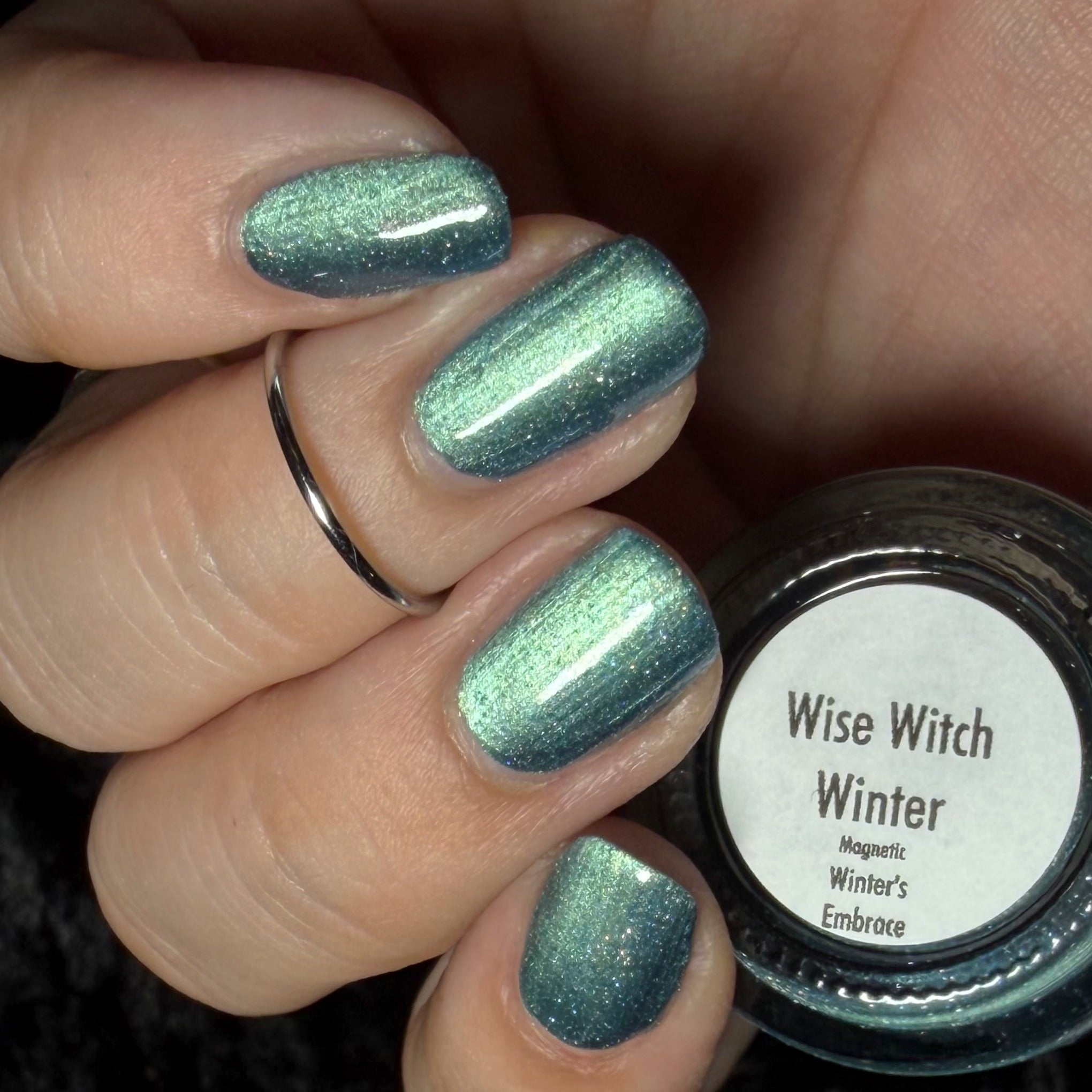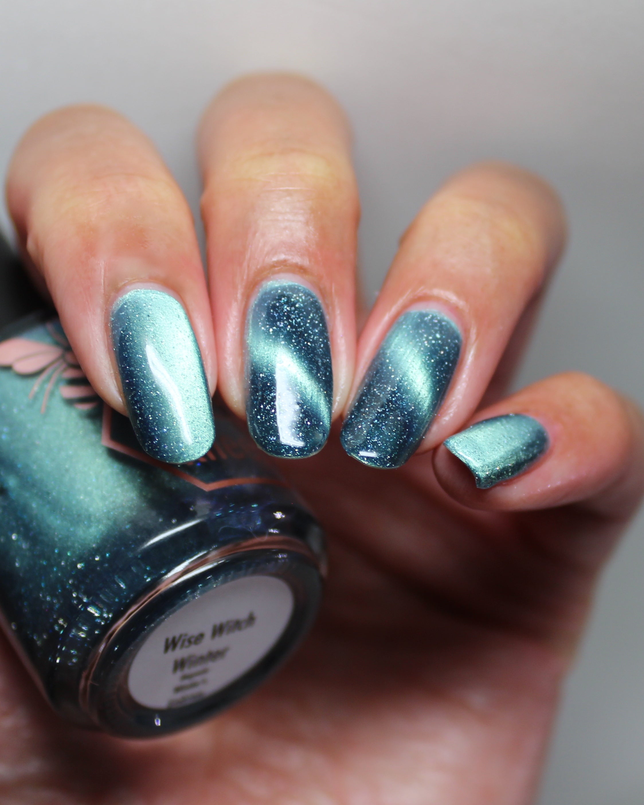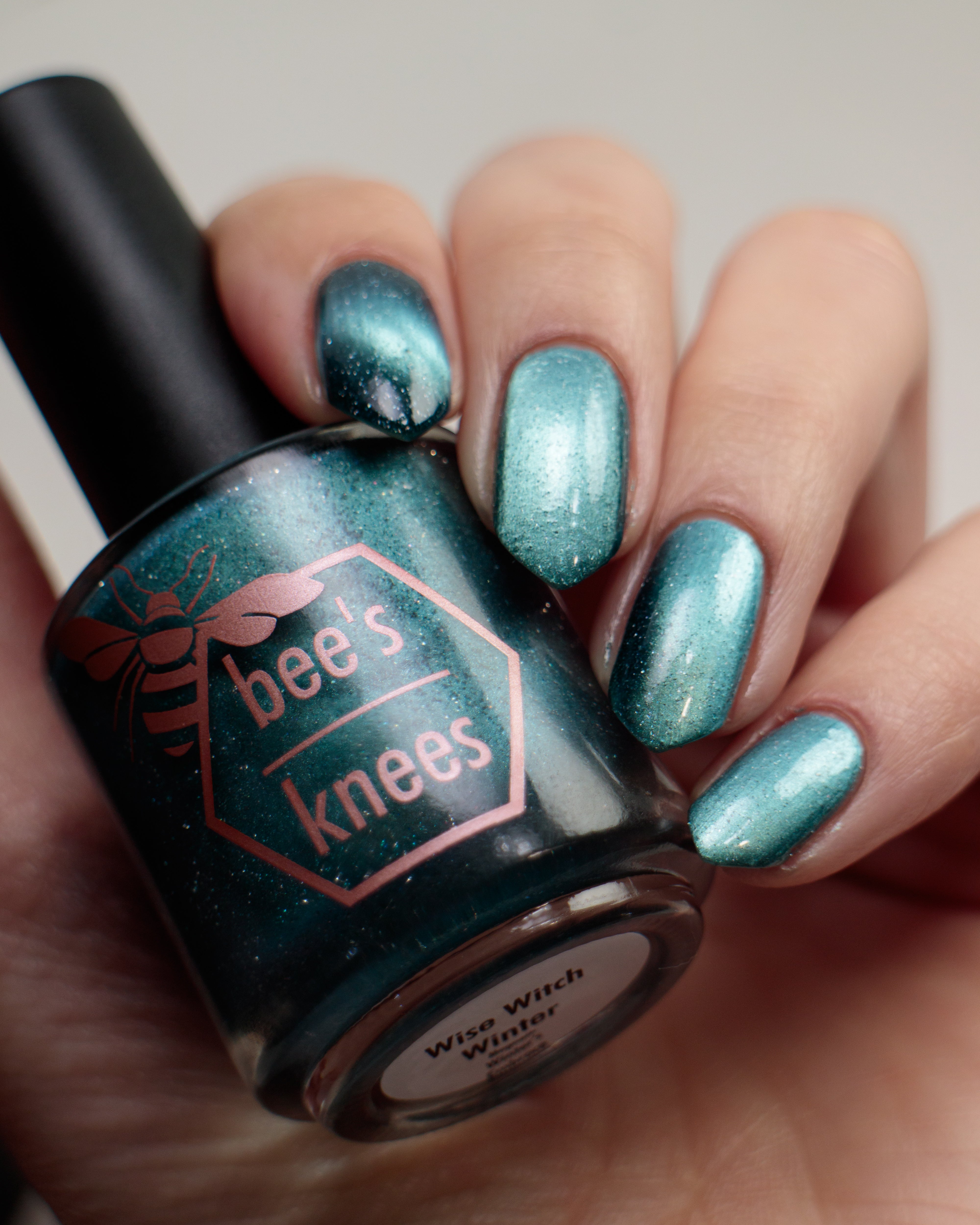 a cool blue base with icy blue magnetic shimmer as well as holo flakes and silver and sapphire light reflective glitter