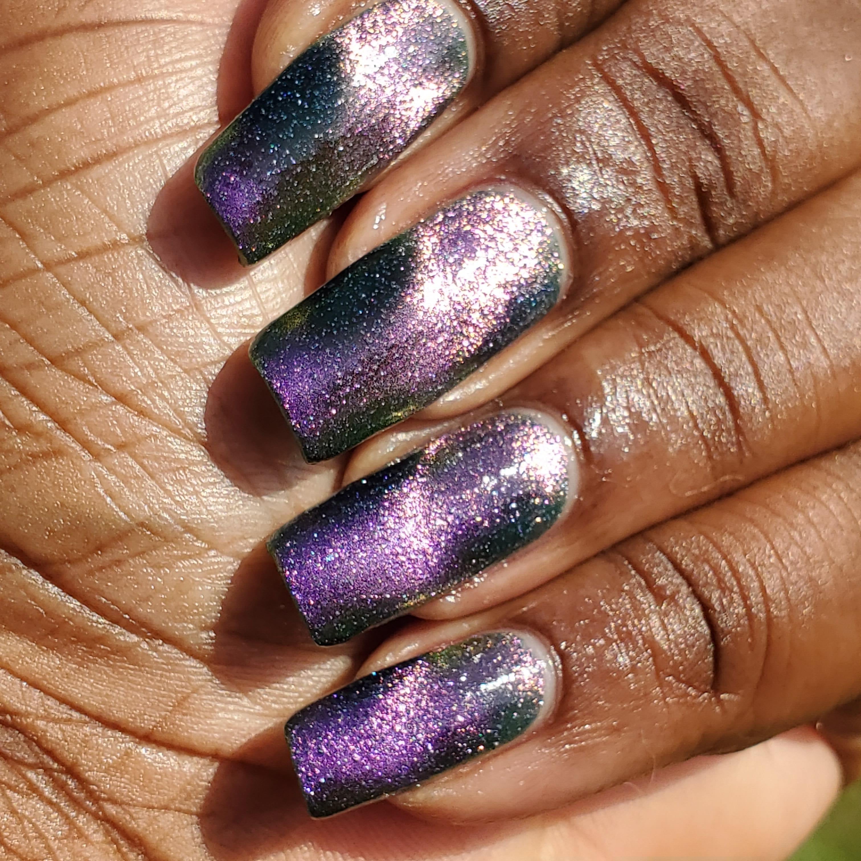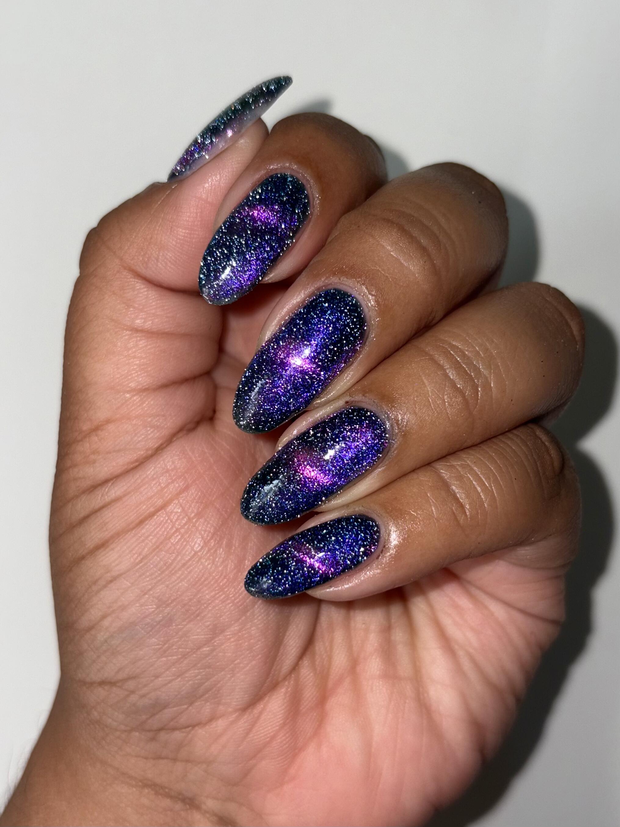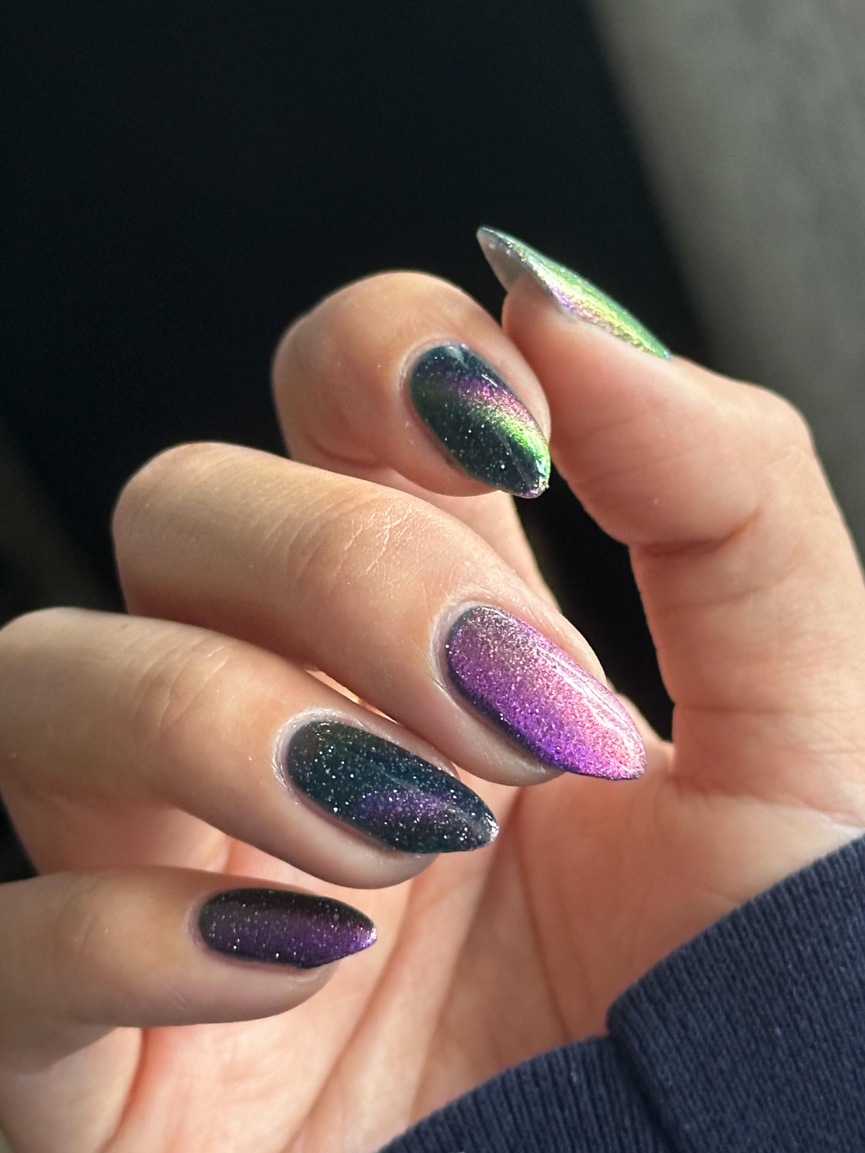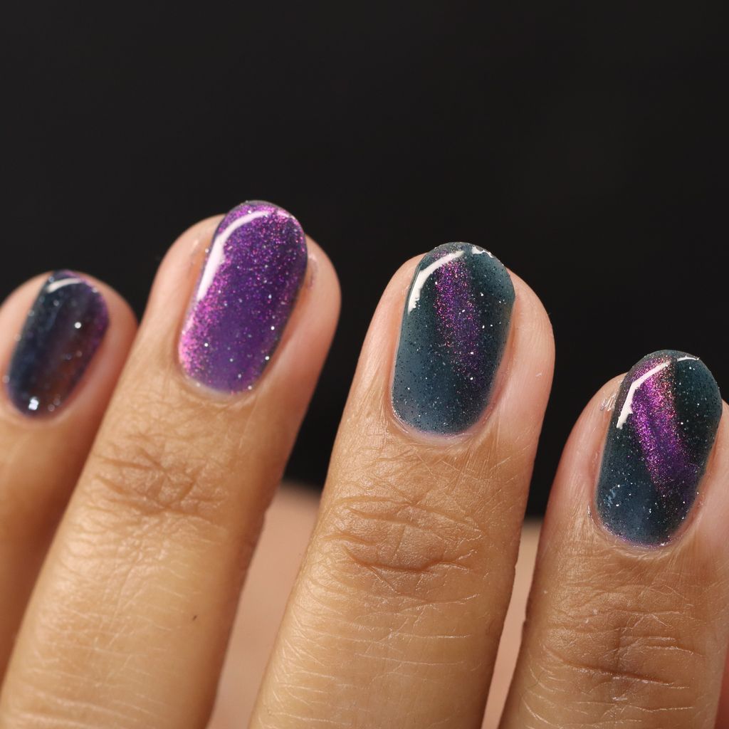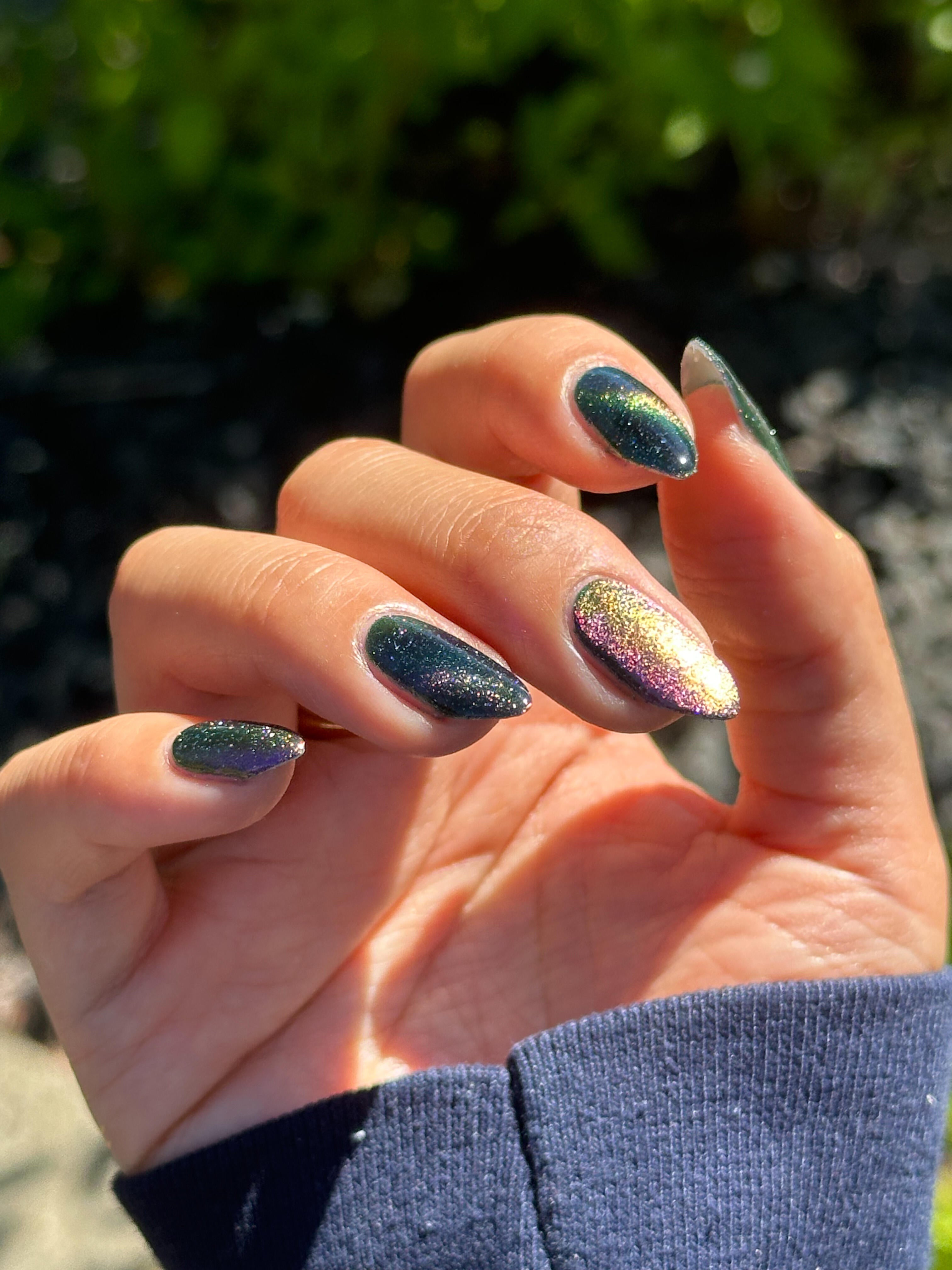 a dark, dusty blue with pink to green multichrome magnetic shimmer and silver light reflective glitter