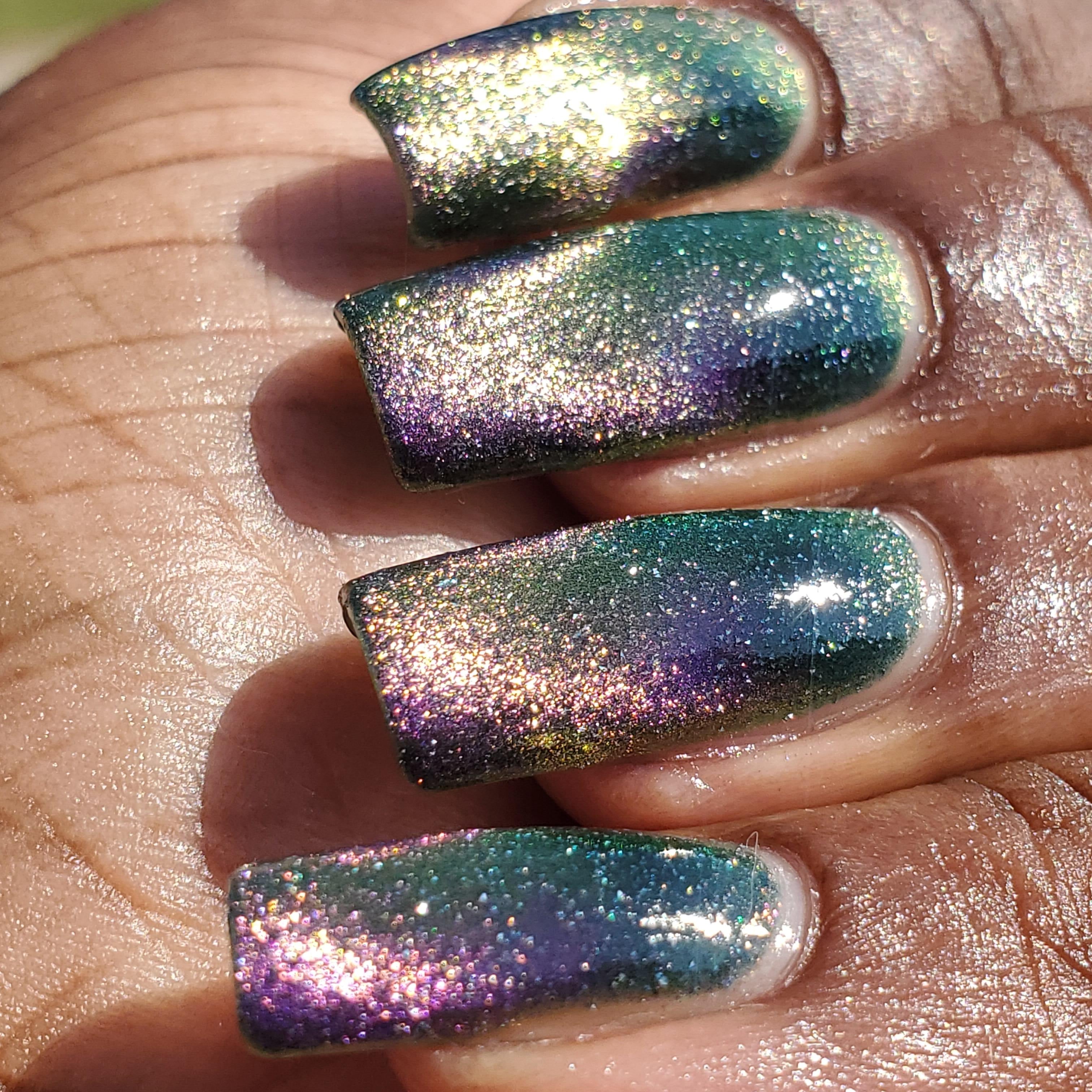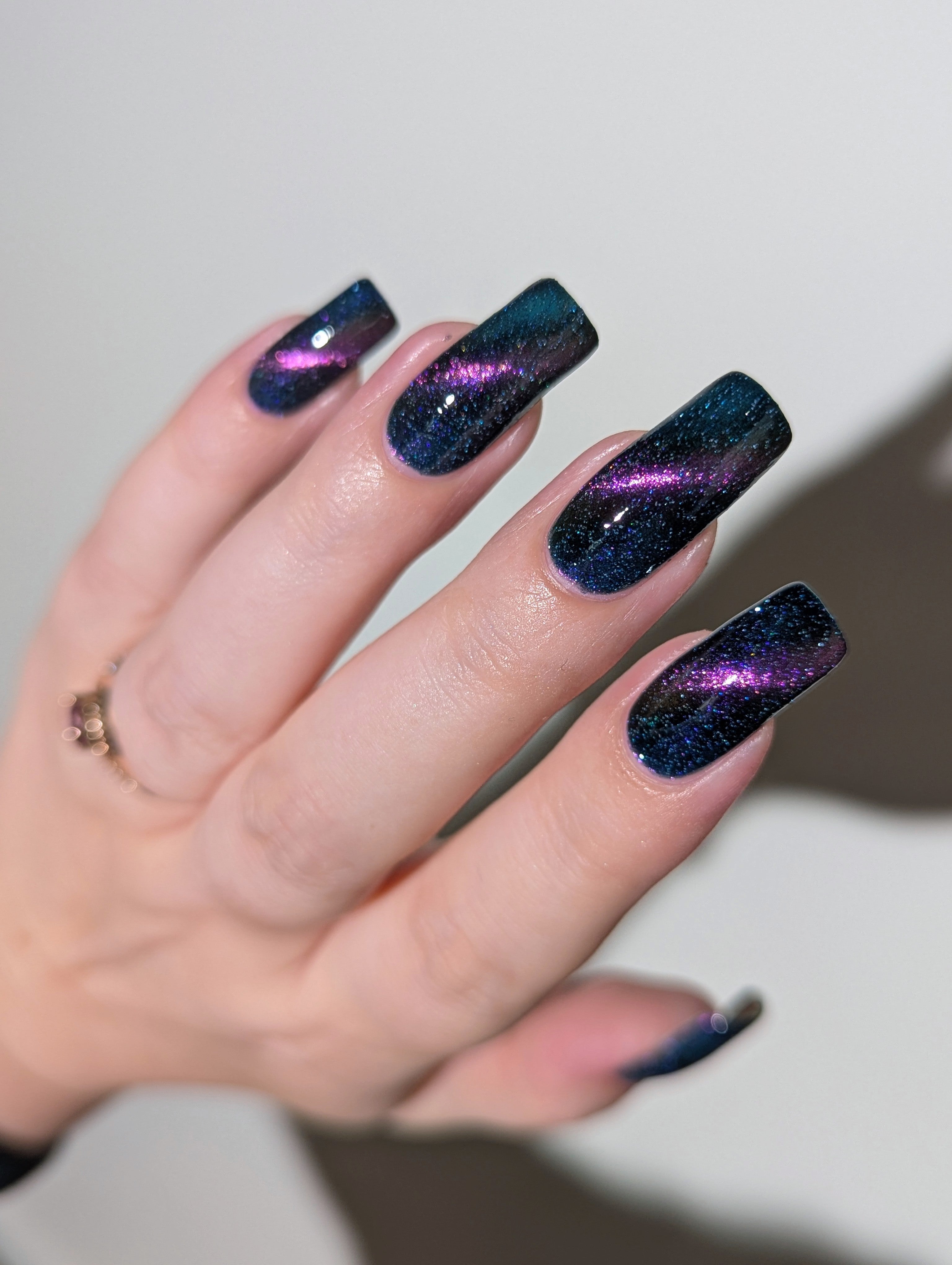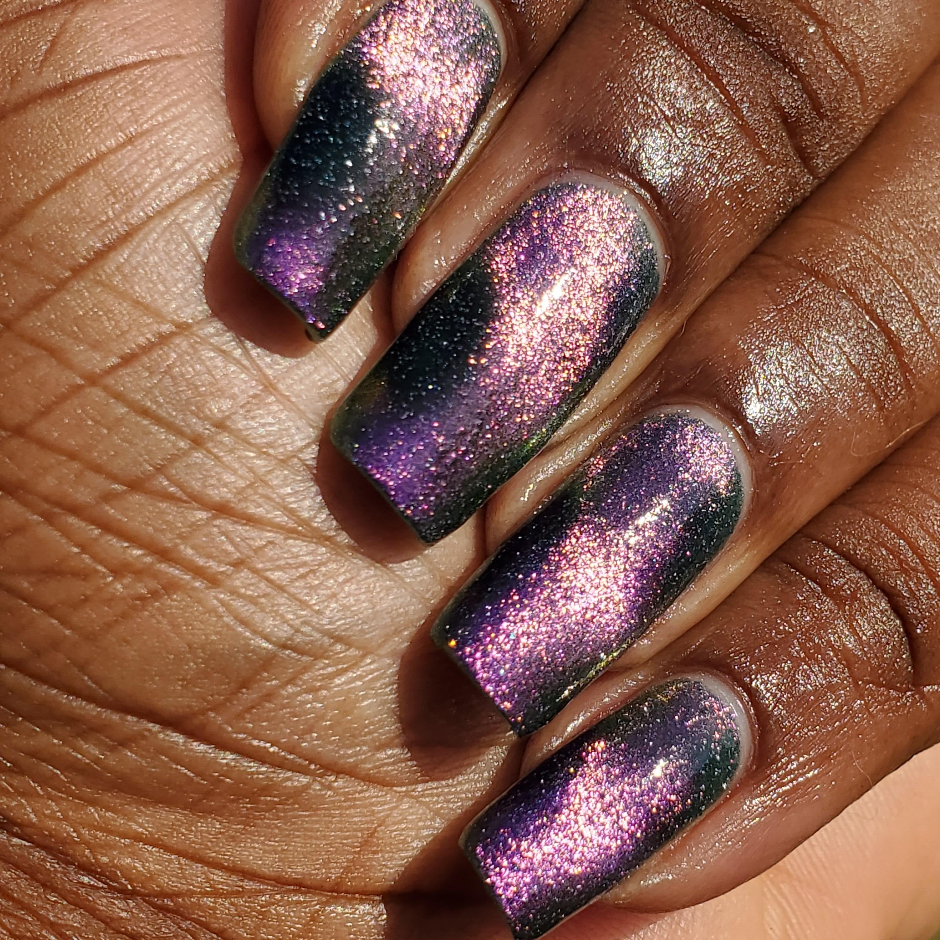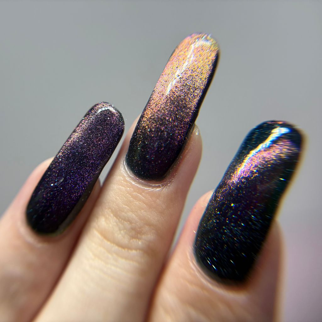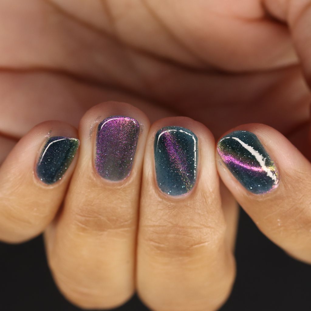 a dark, dusty blue with pink to green multichrome magnetic shimmer and silver light reflective glitter