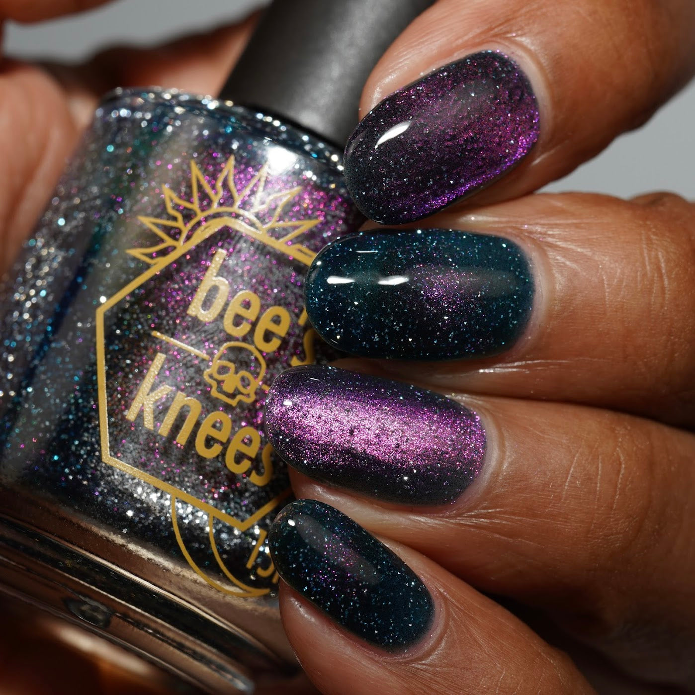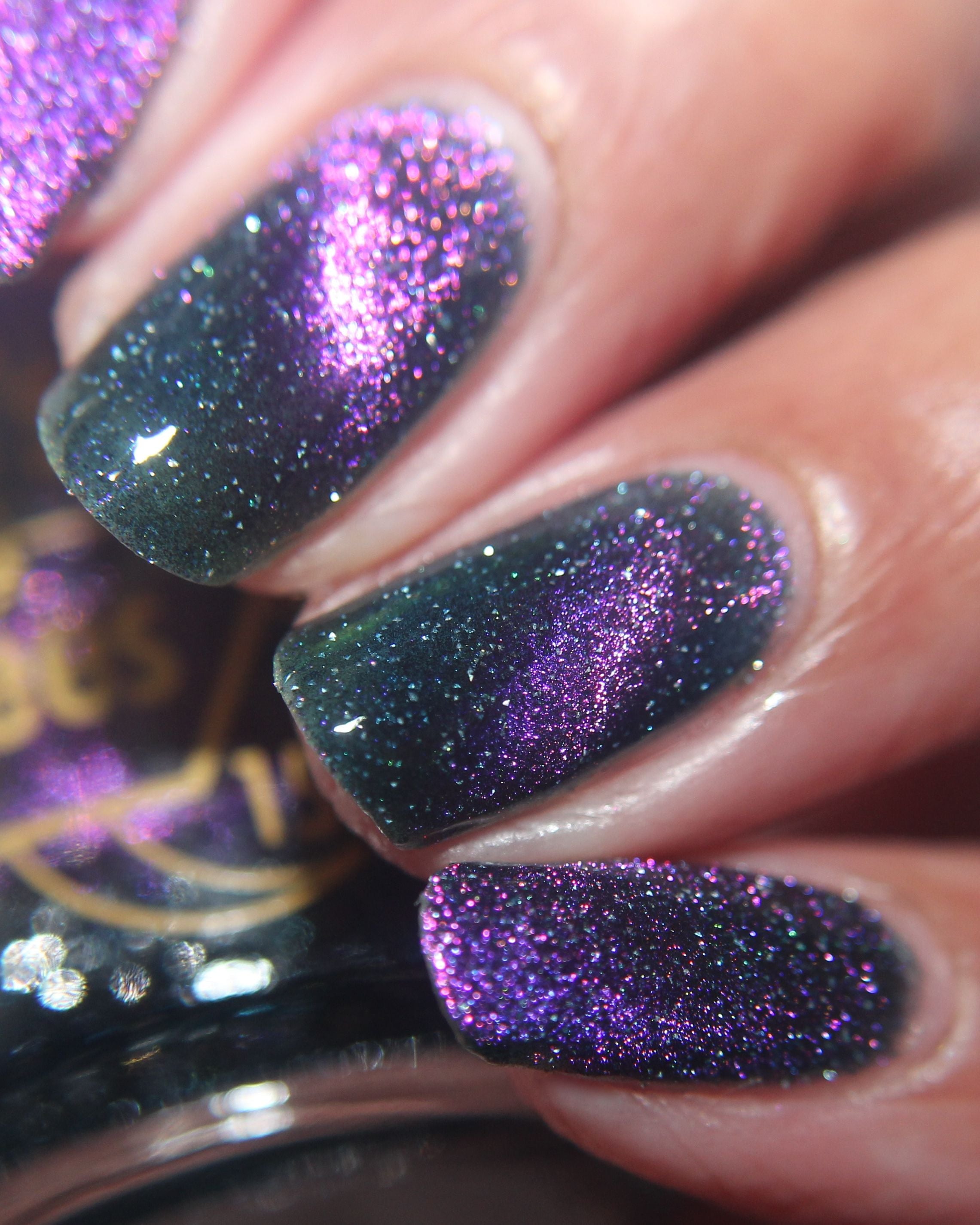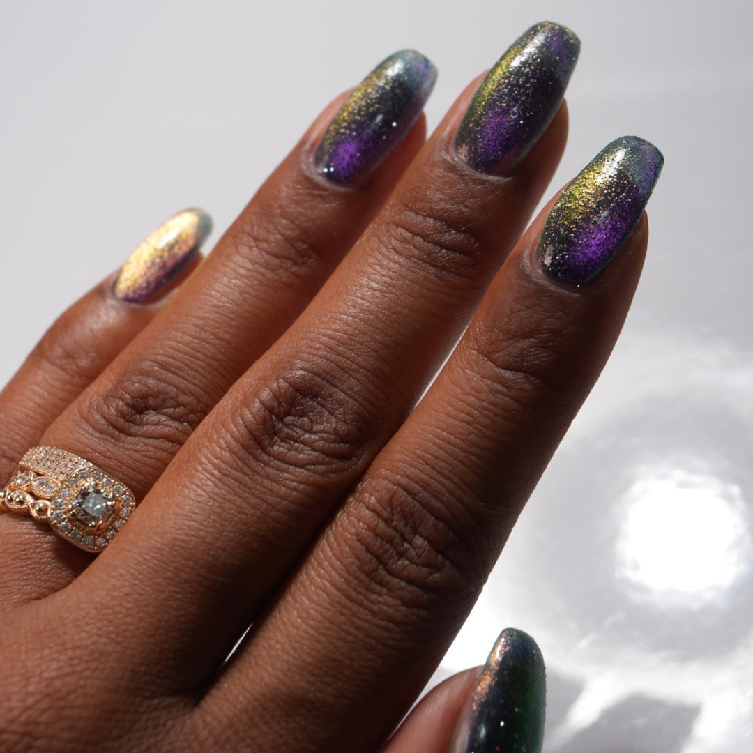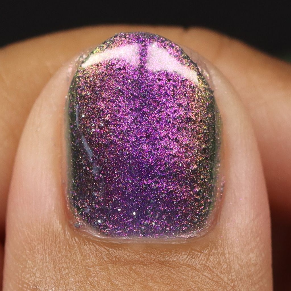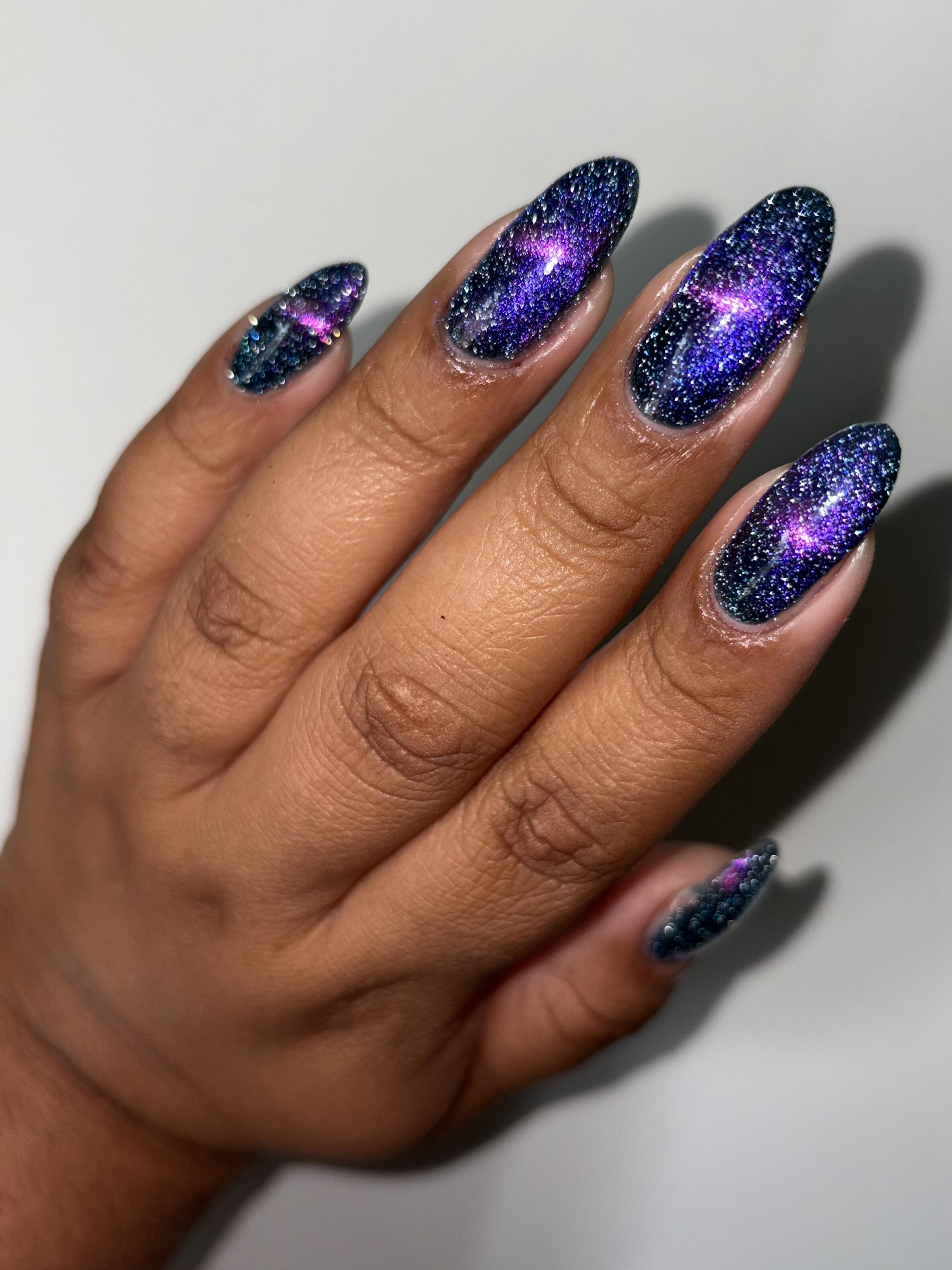 a dark, dusty blue with pink to green multichrome magnetic shimmer and silver light reflective glitter