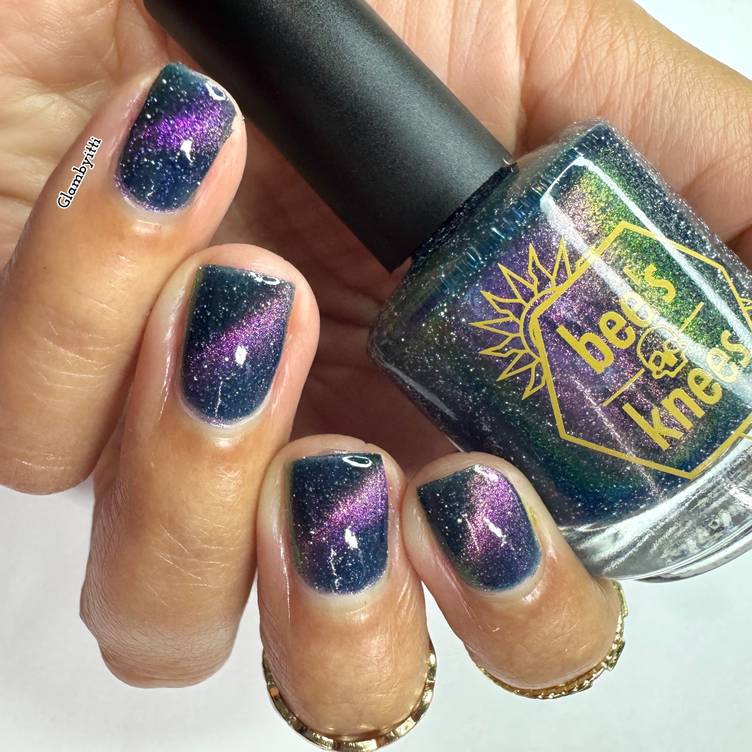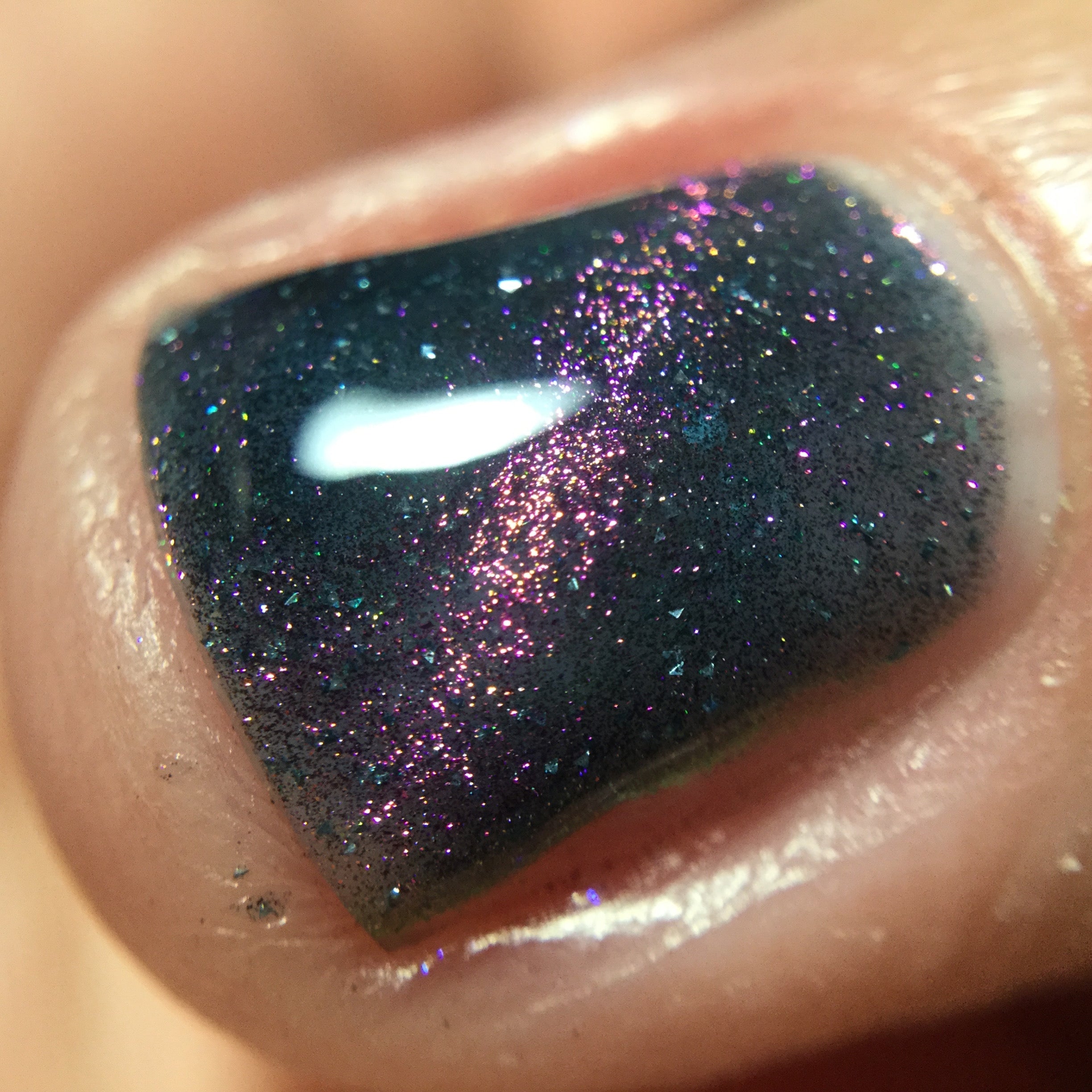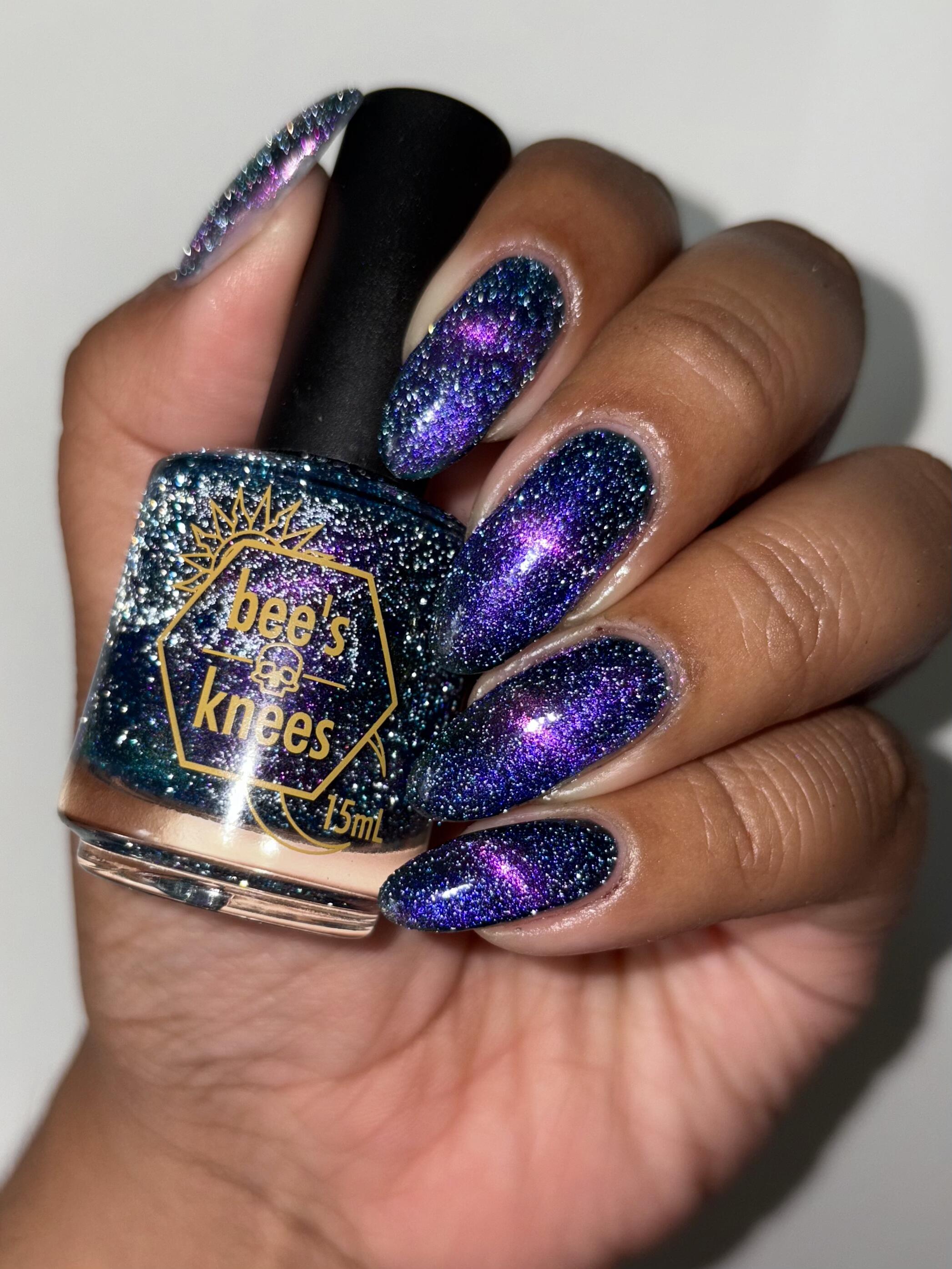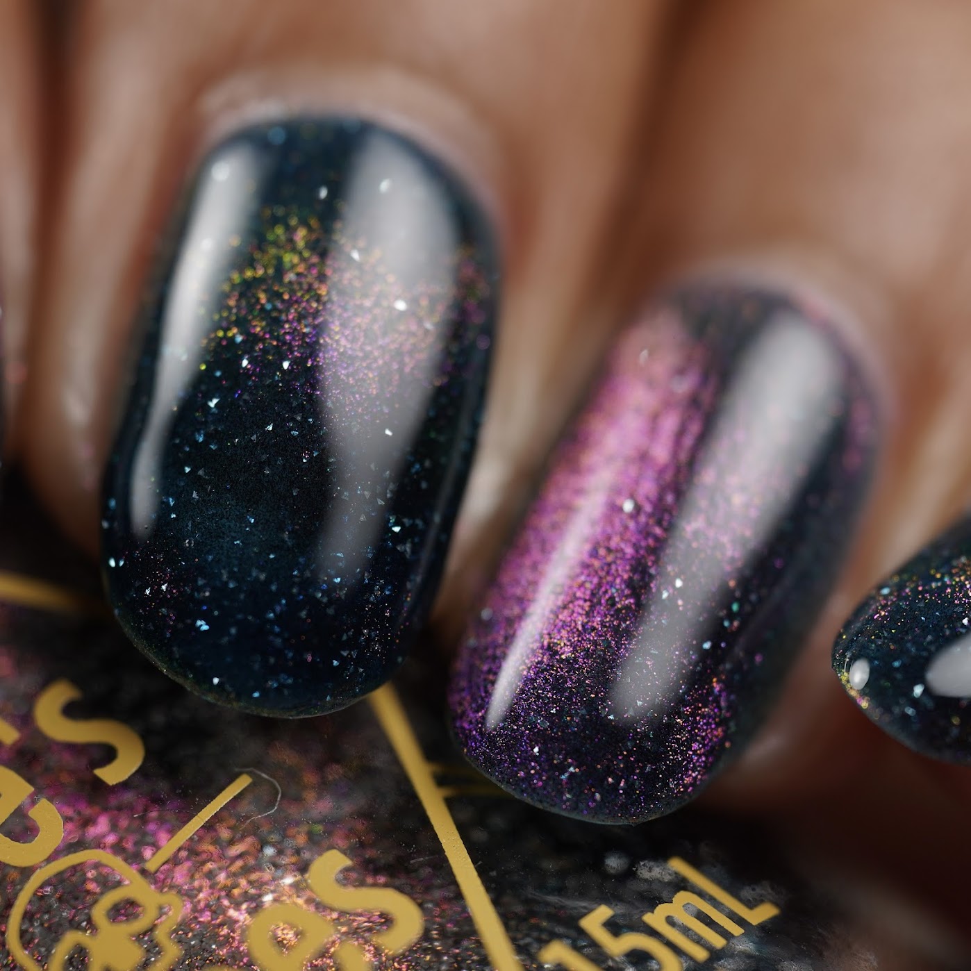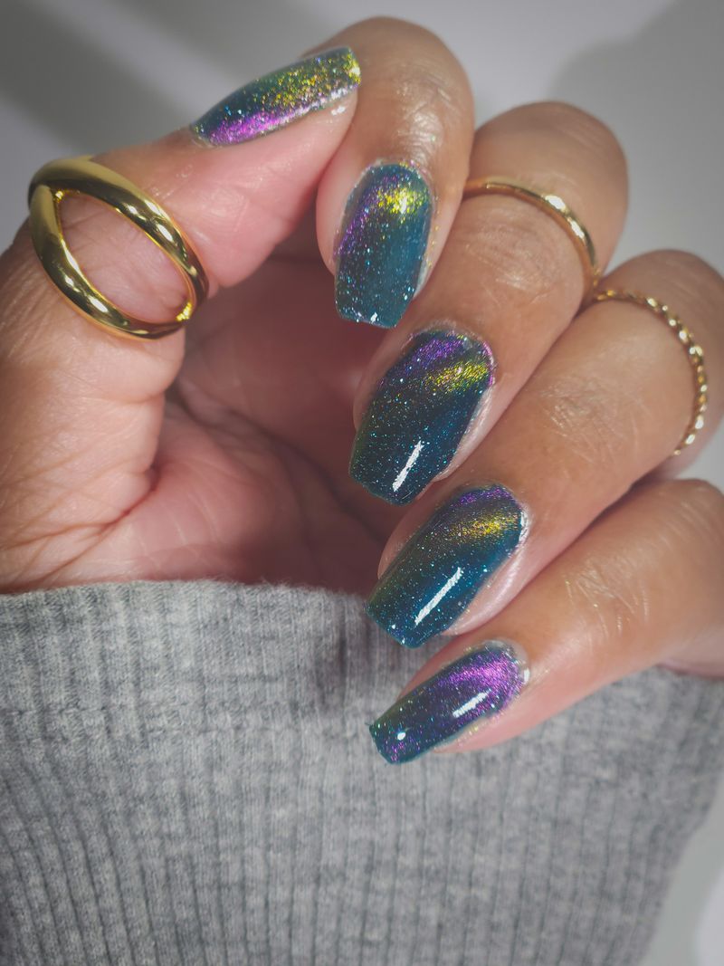 a dark, dusty blue with pink to green multichrome magnetic shimmer and silver light reflective glitter