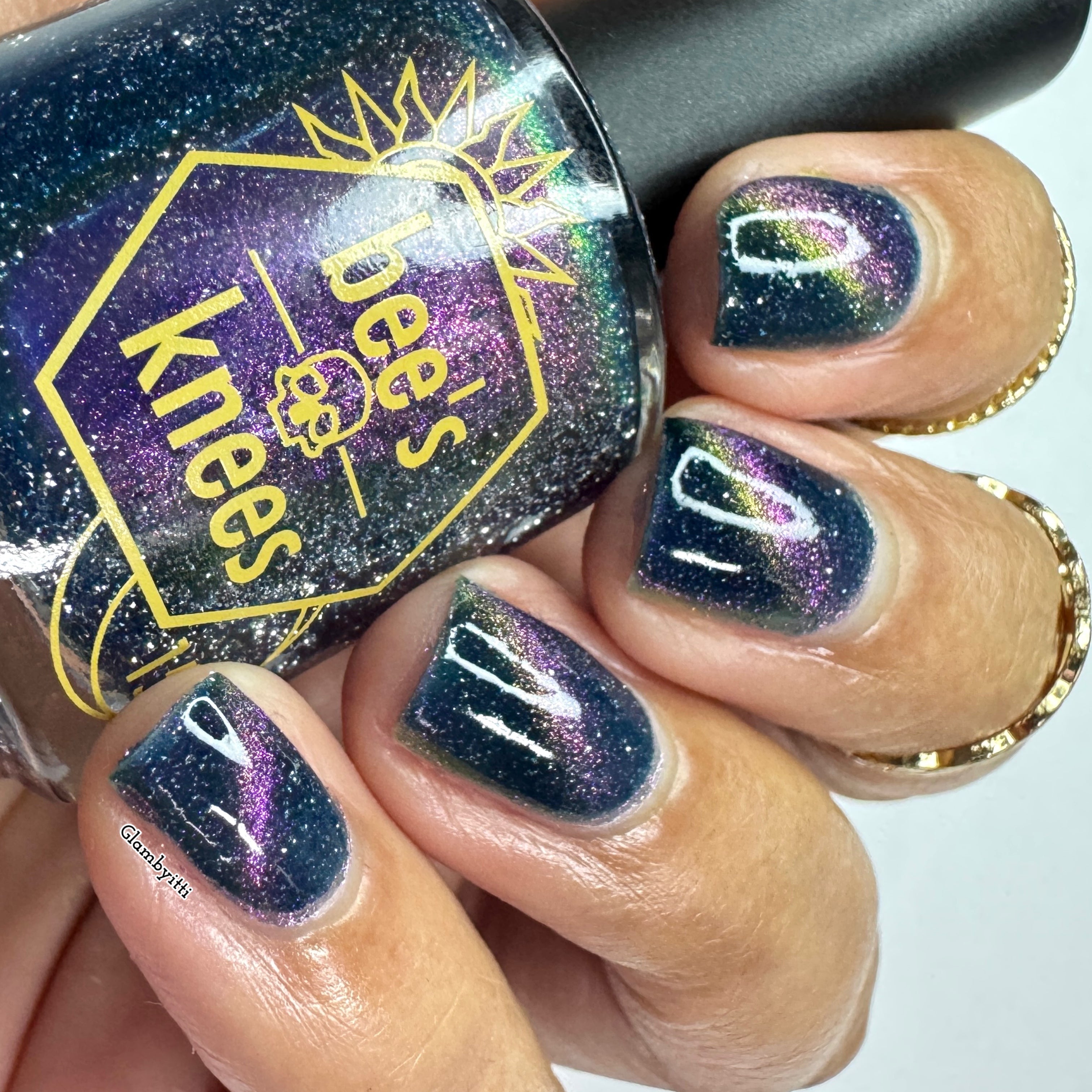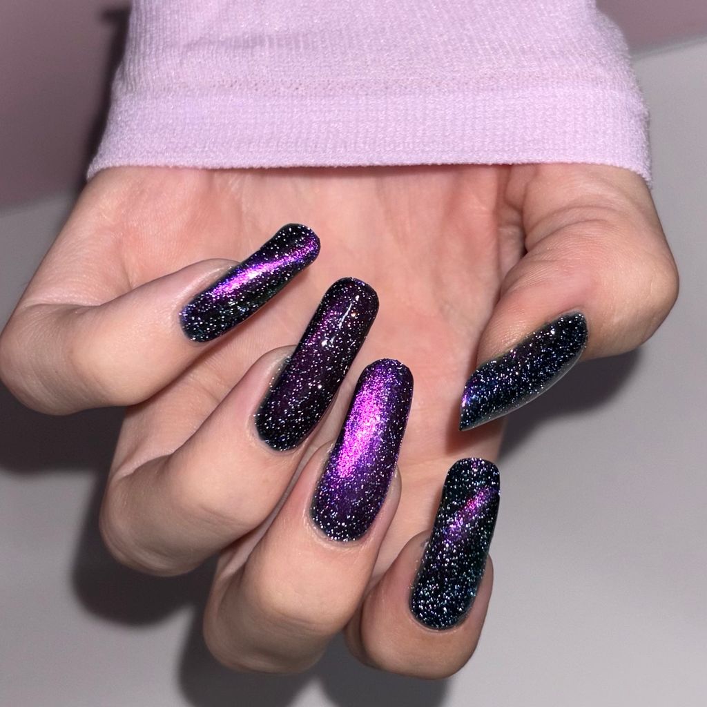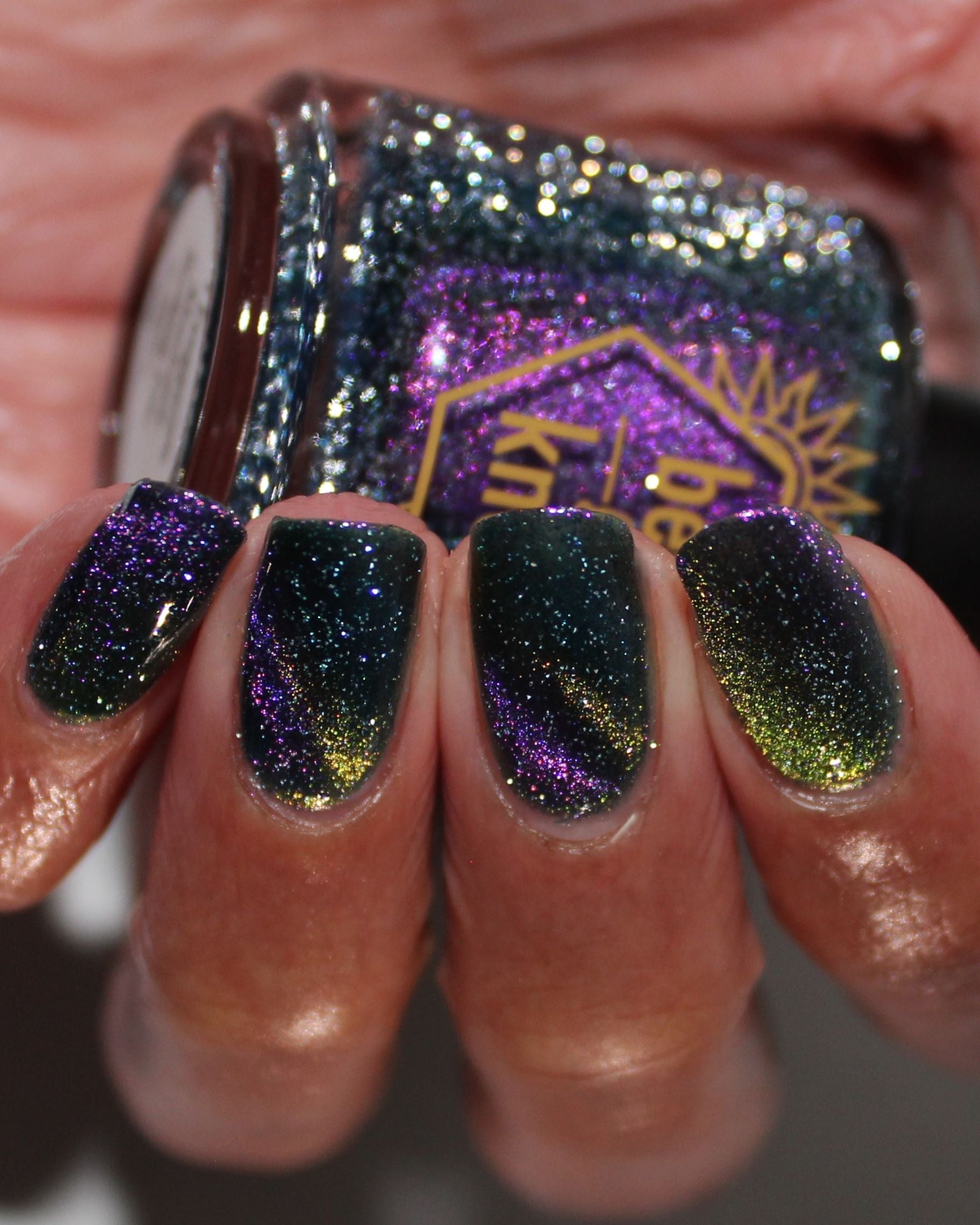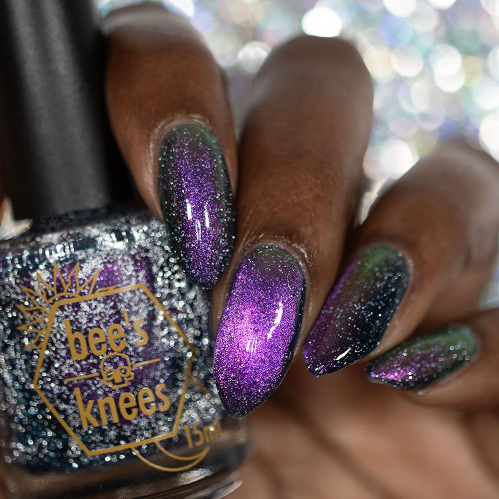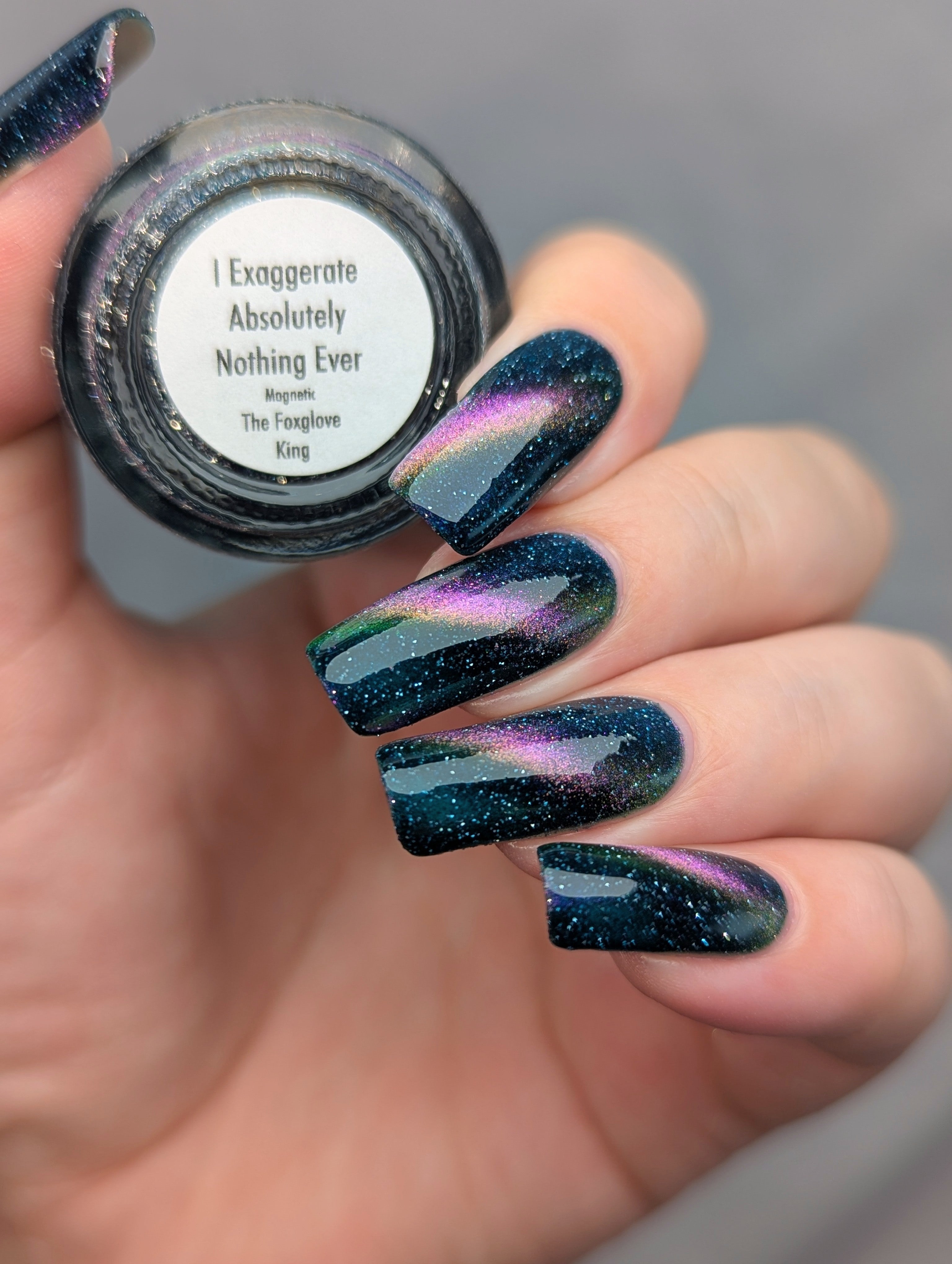 a dark, dusty blue with pink to green multichrome magnetic shimmer and silver light reflective glitter