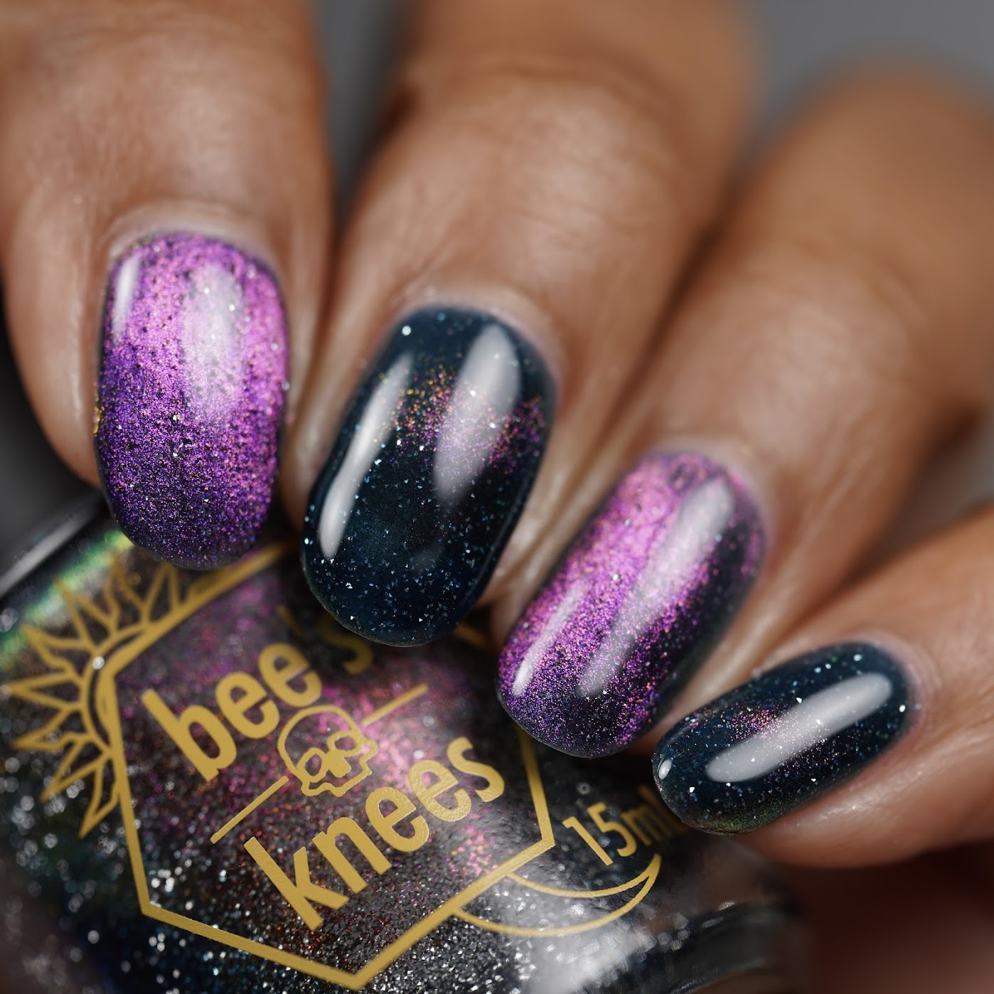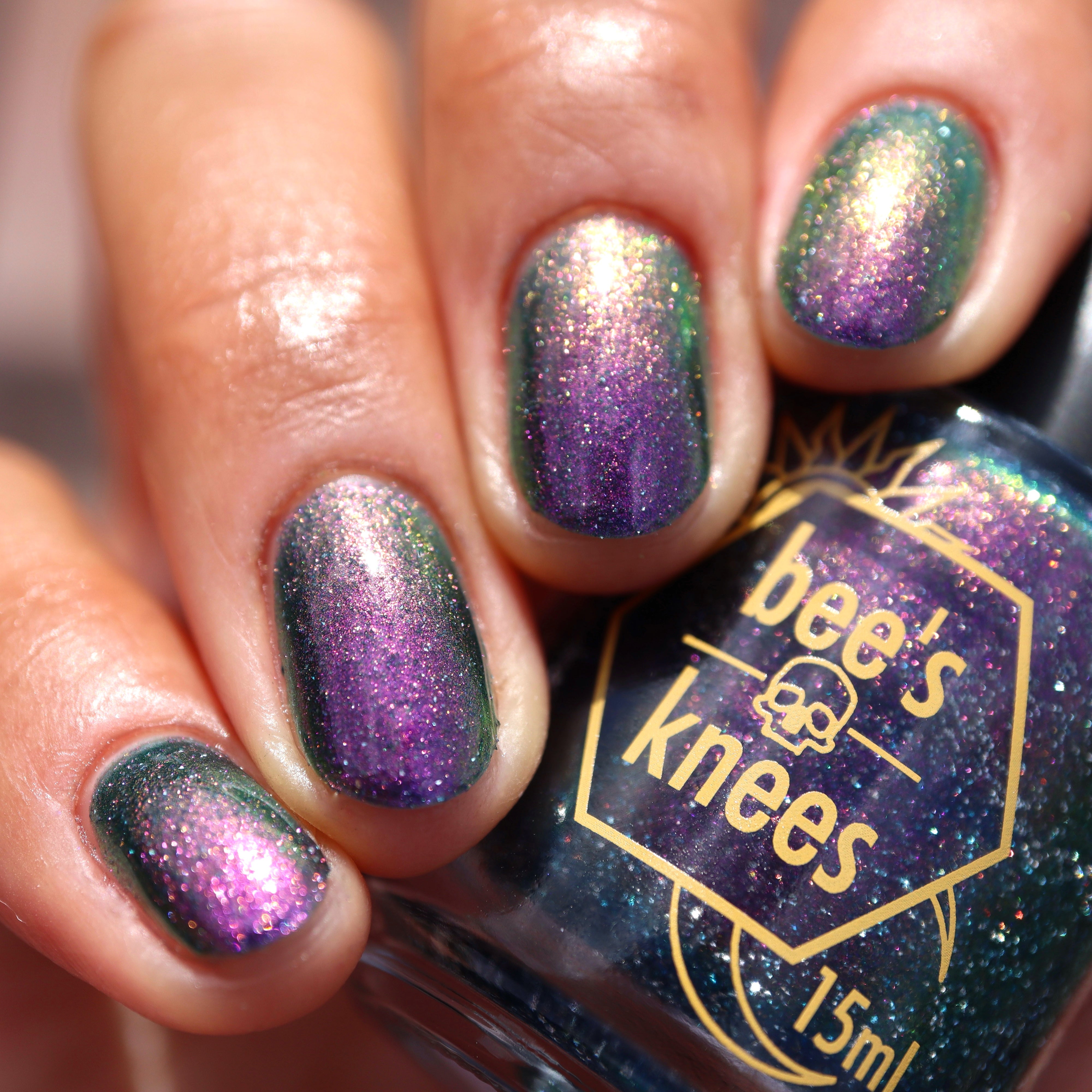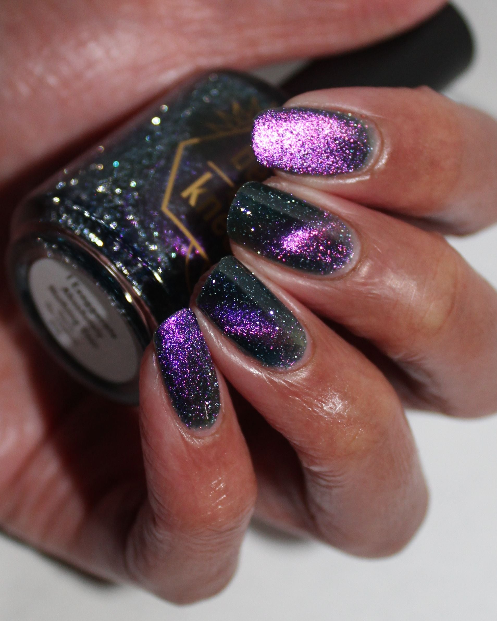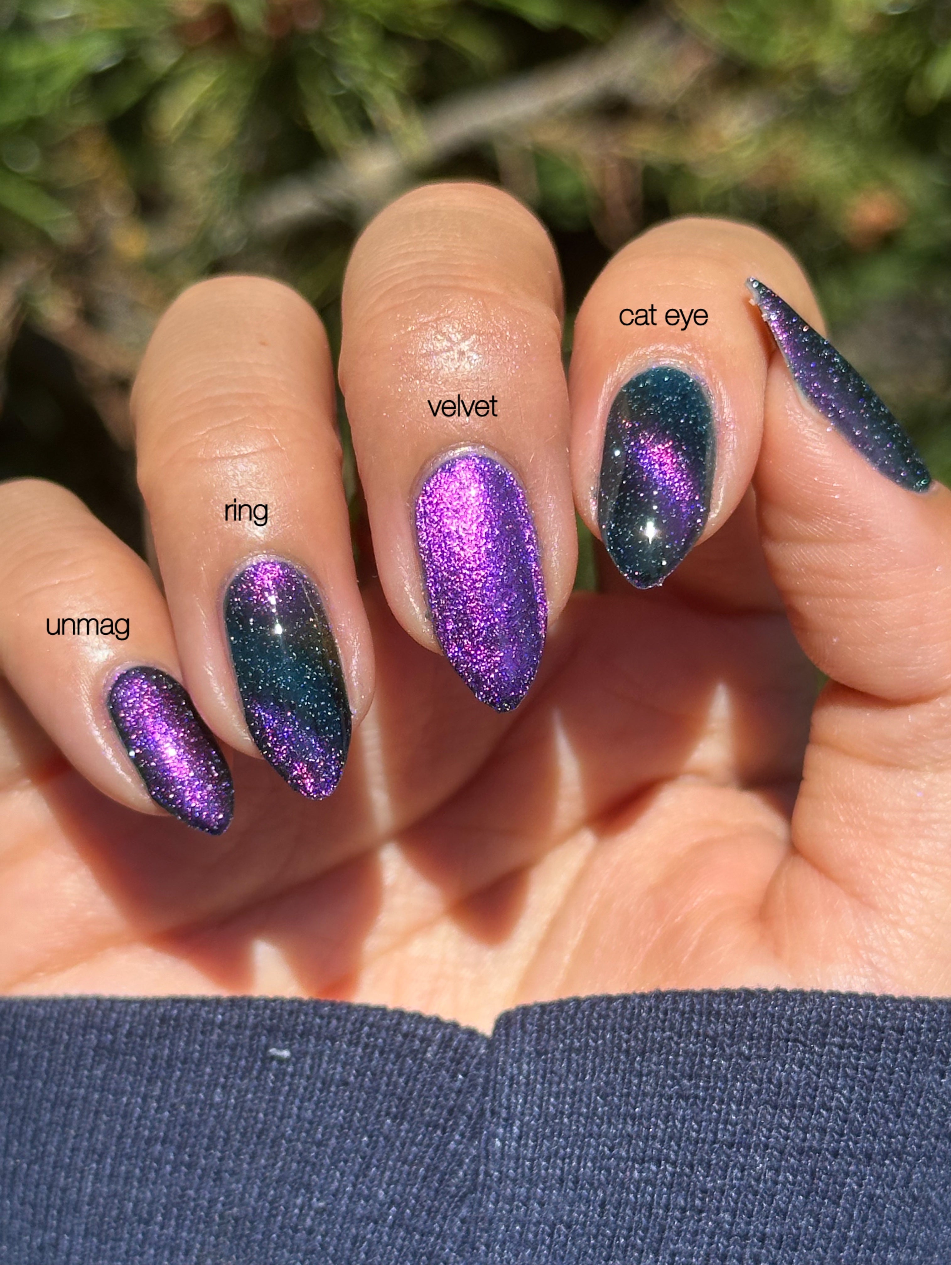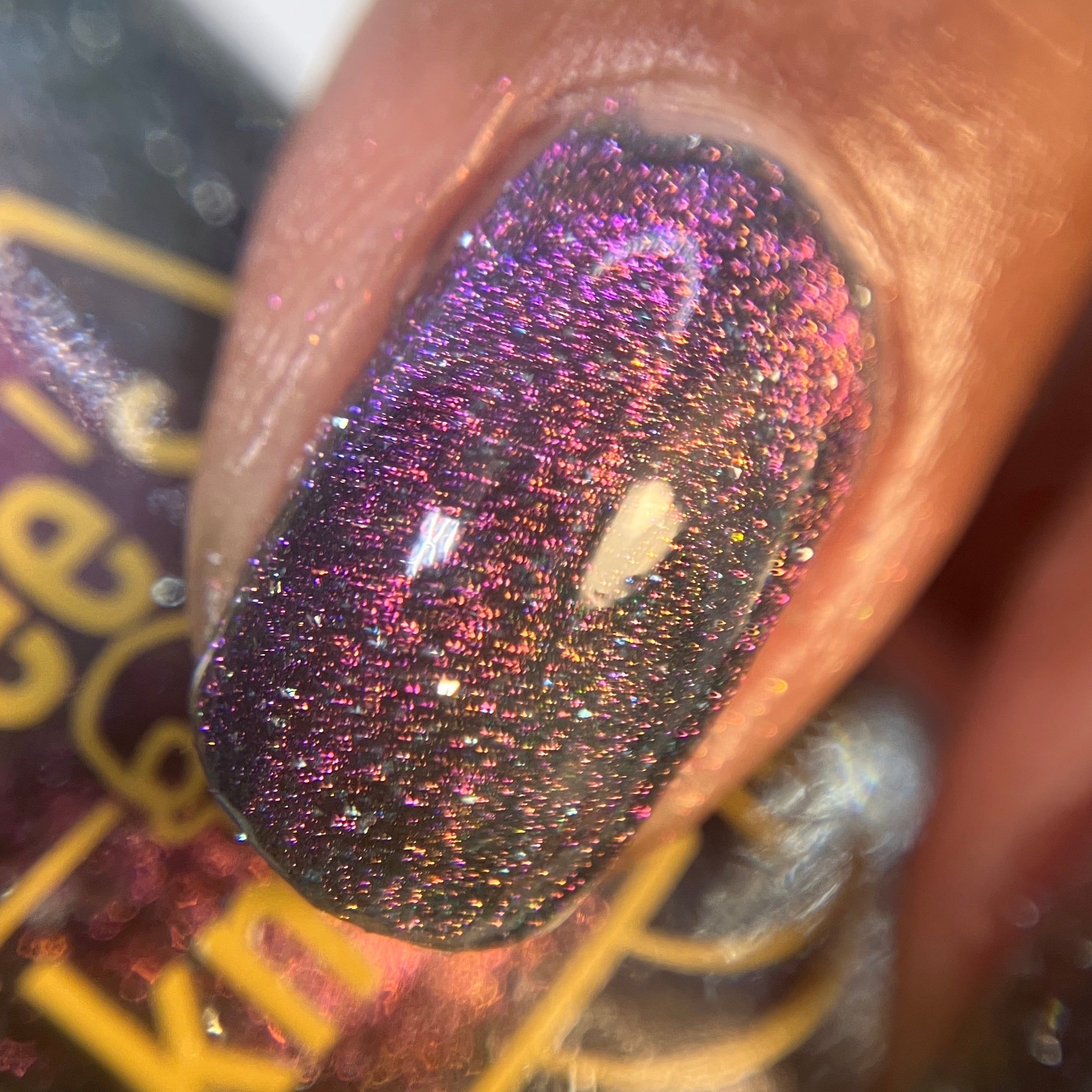 a dark, dusty blue with pink to green multichrome magnetic shimmer and silver light reflective glitter