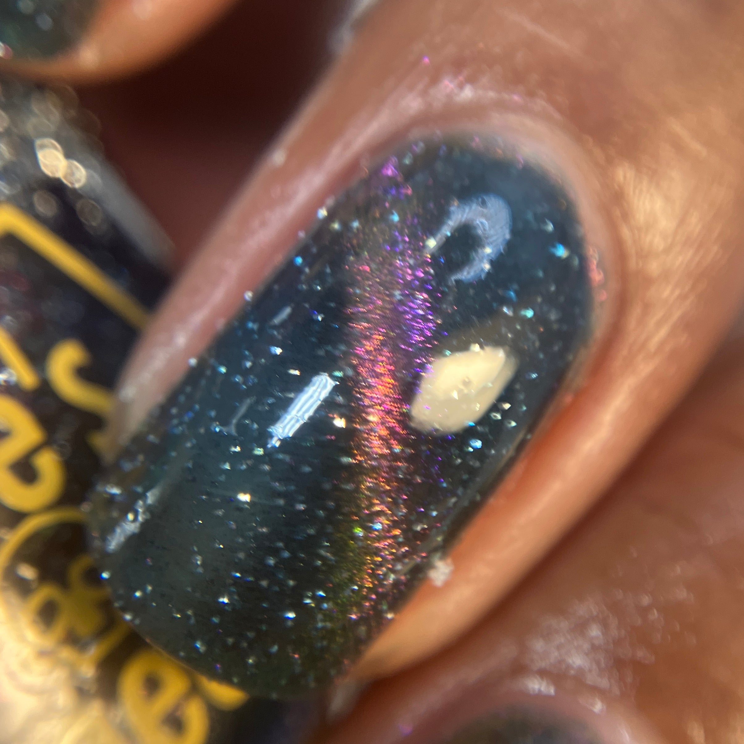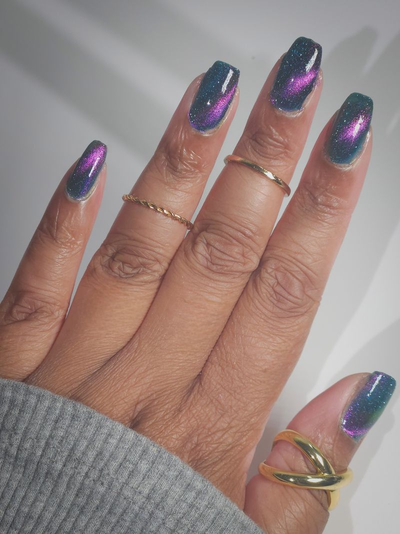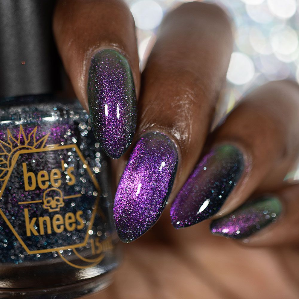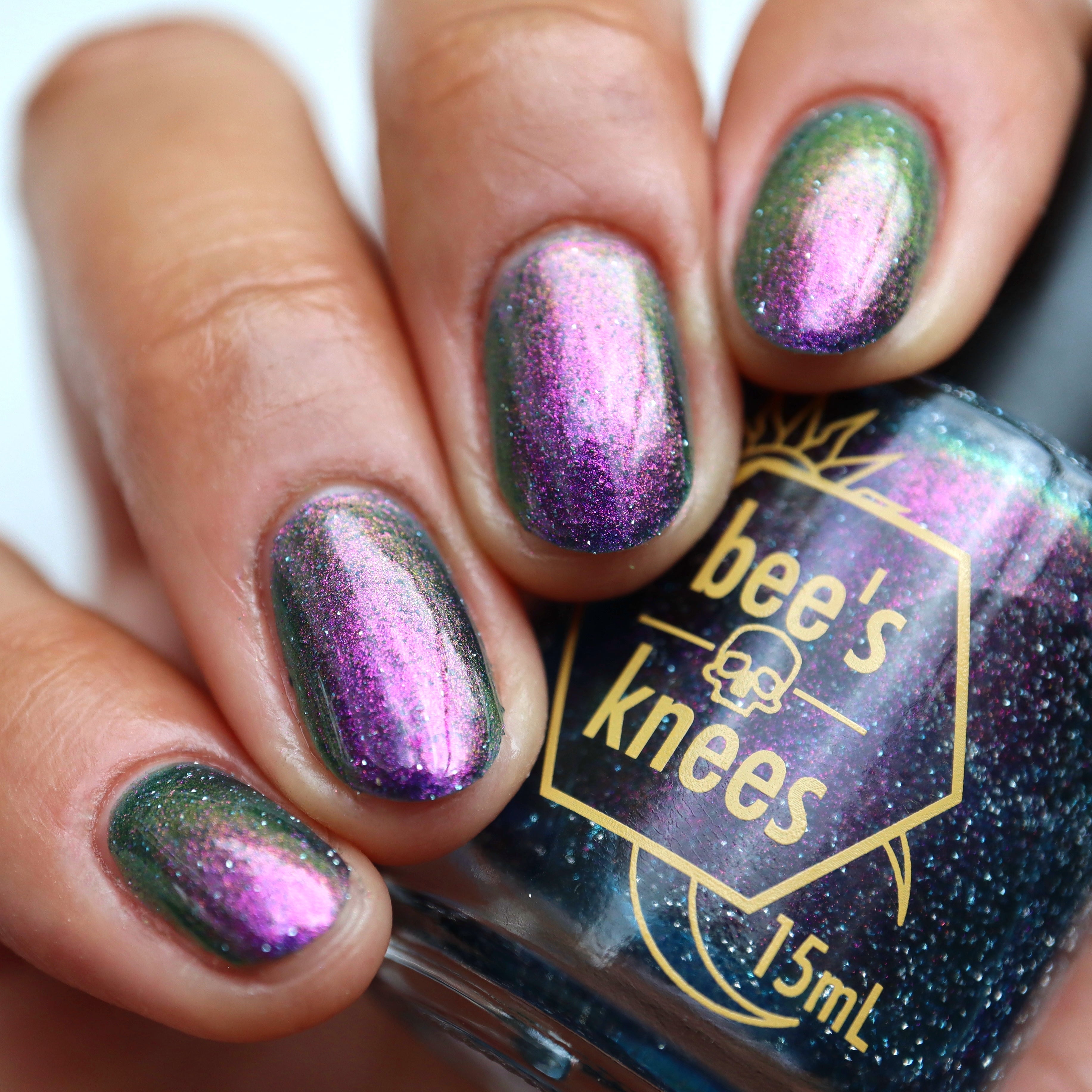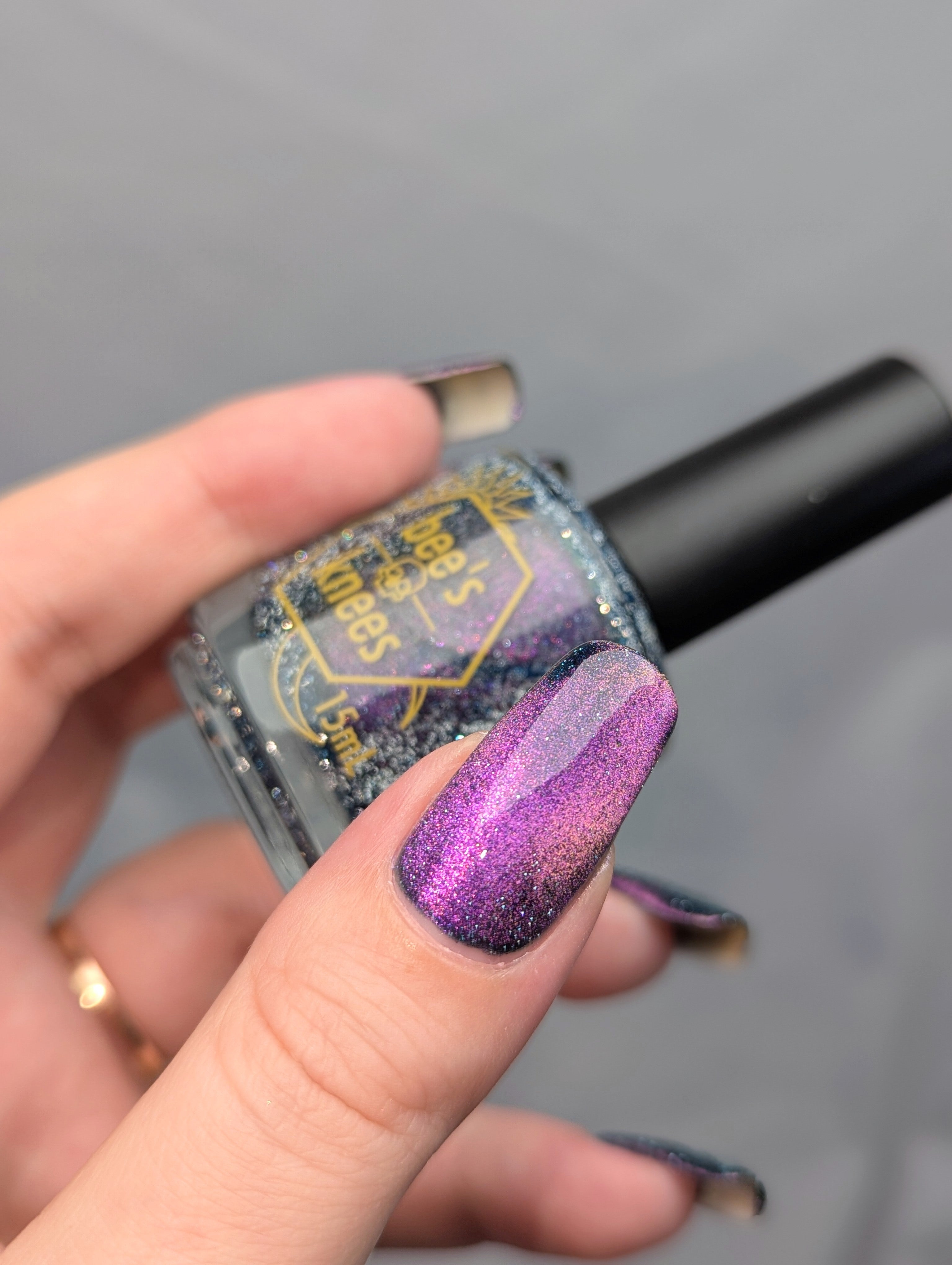 a dark, dusty blue with pink to green multichrome magnetic shimmer and silver light reflective glitter