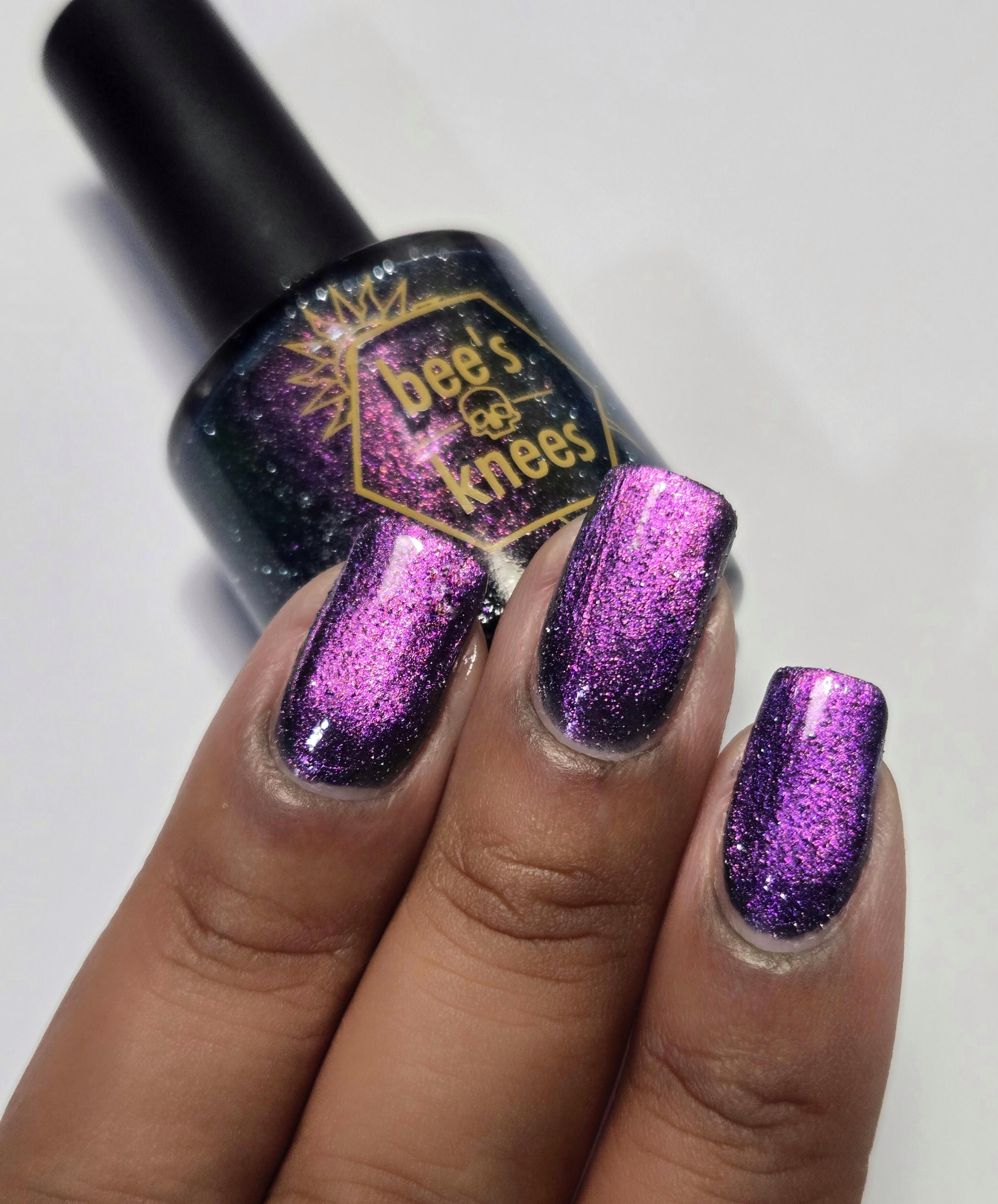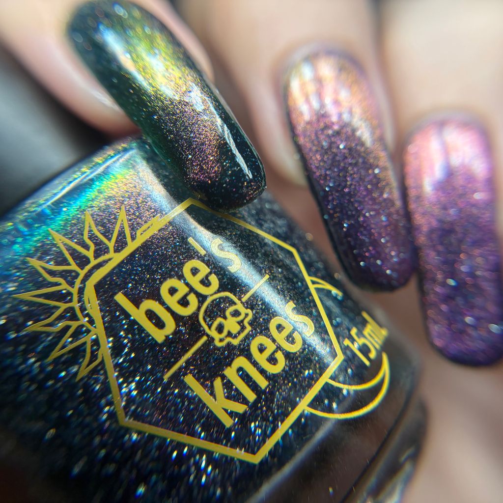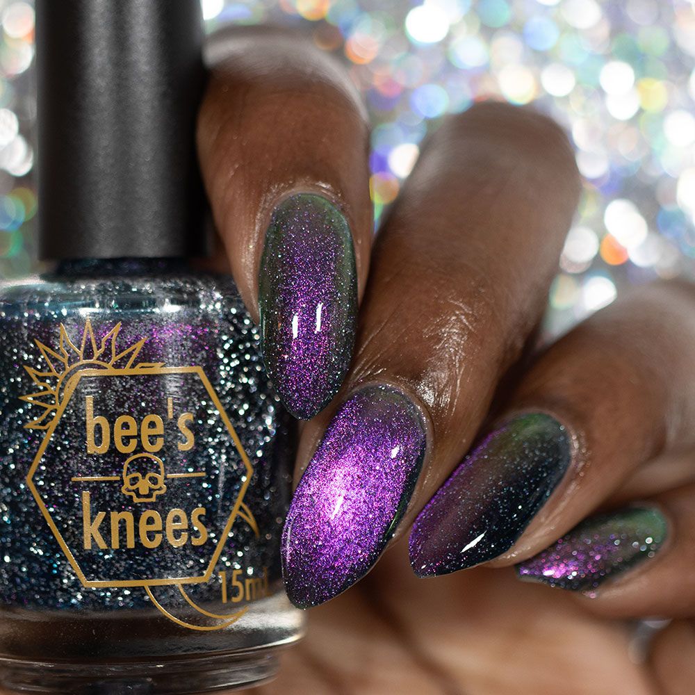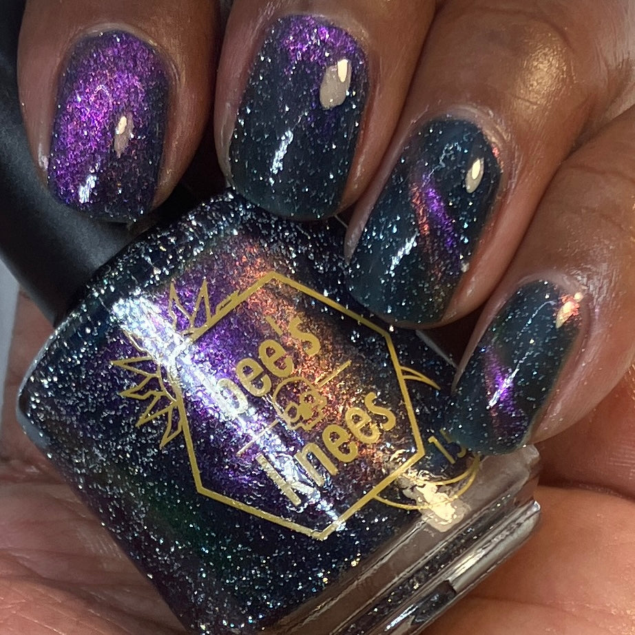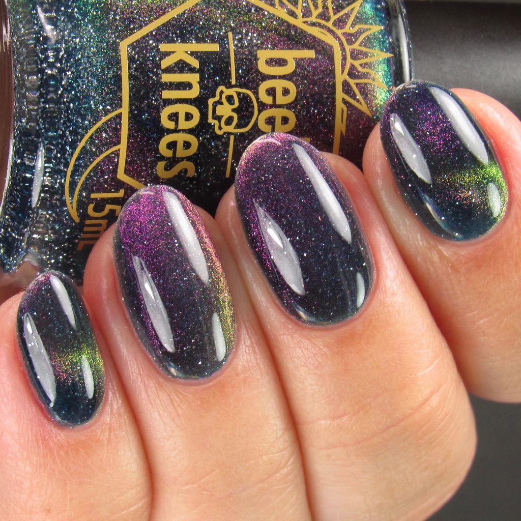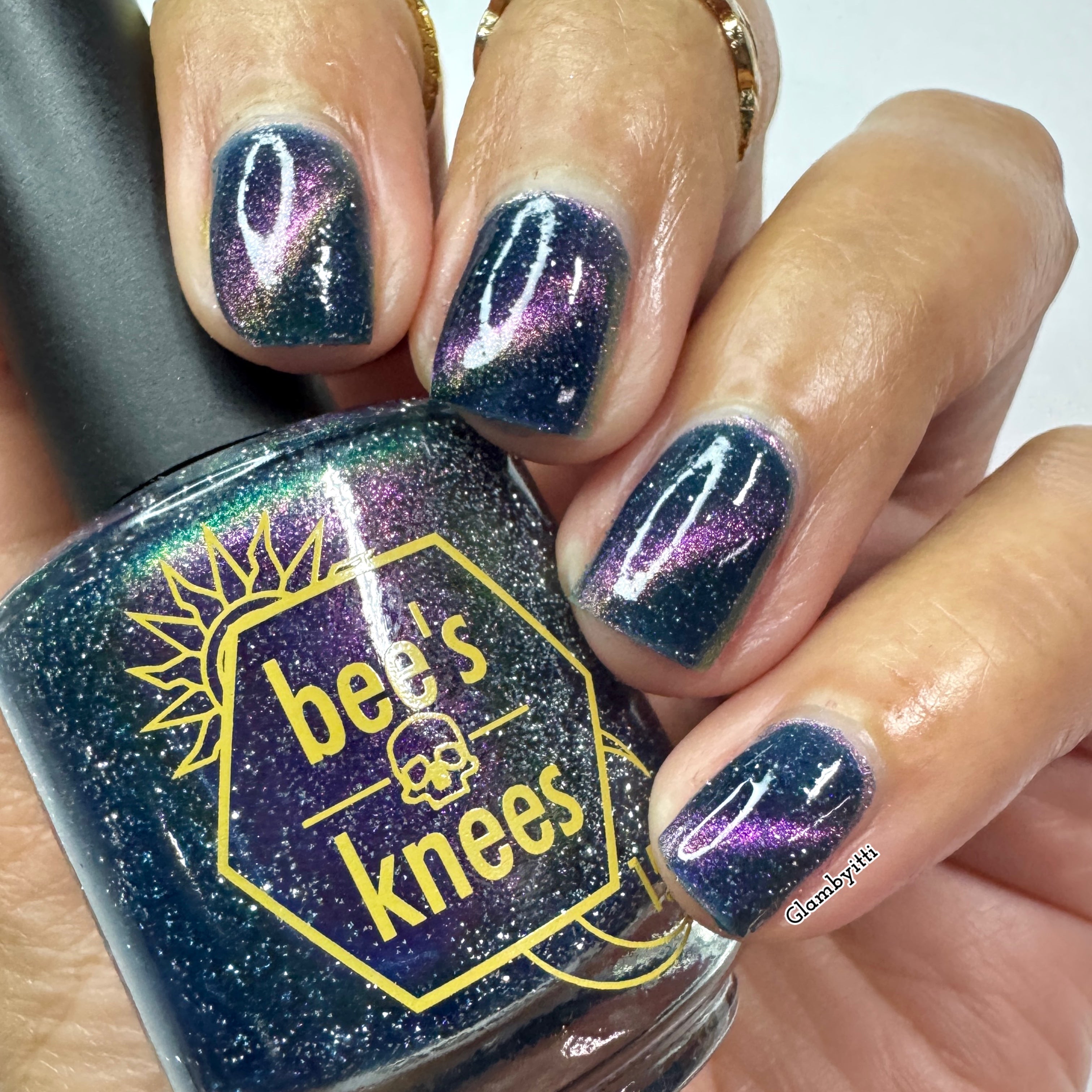 a dark, dusty blue with pink to green multichrome magnetic shimmer and silver light reflective glitter