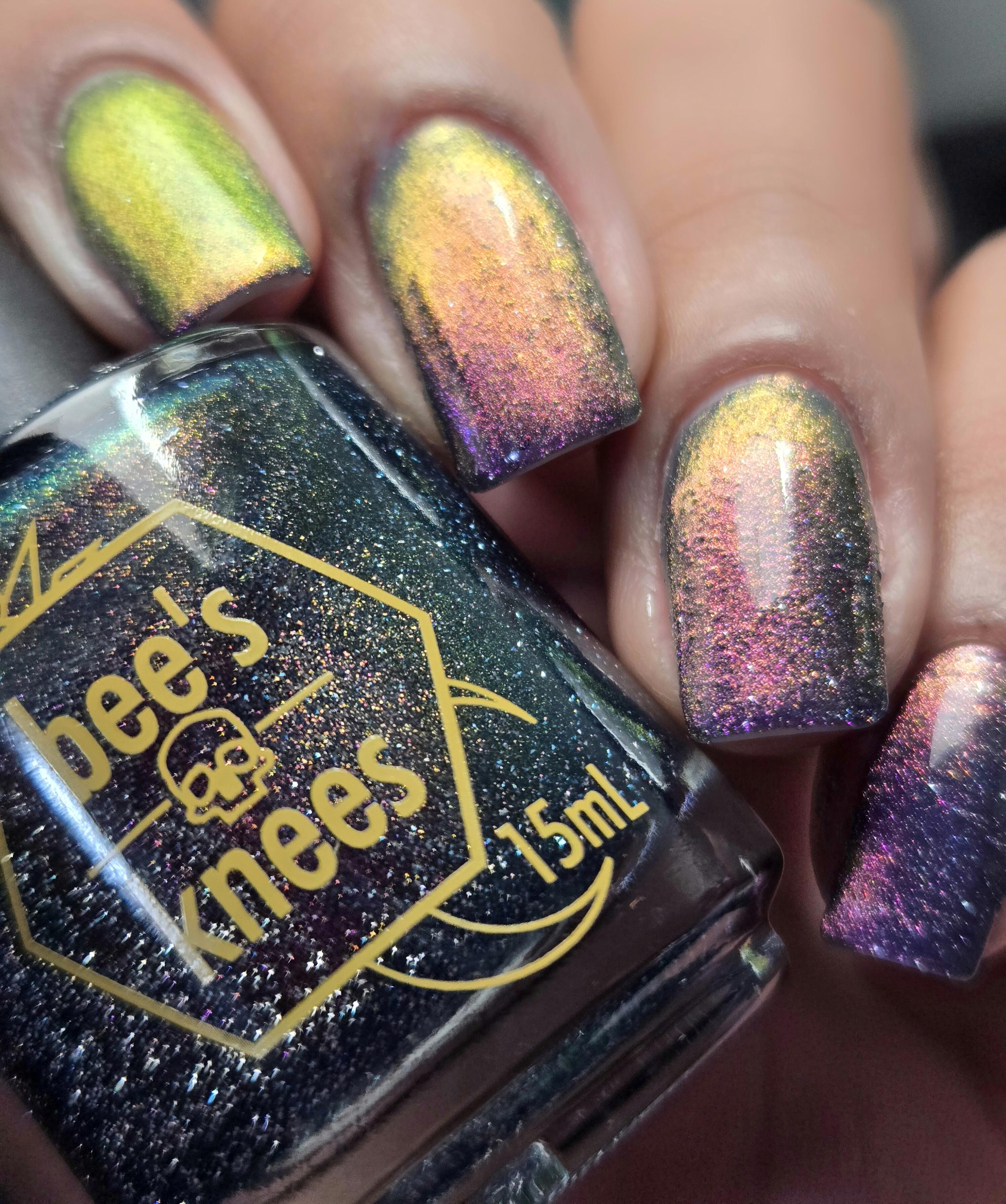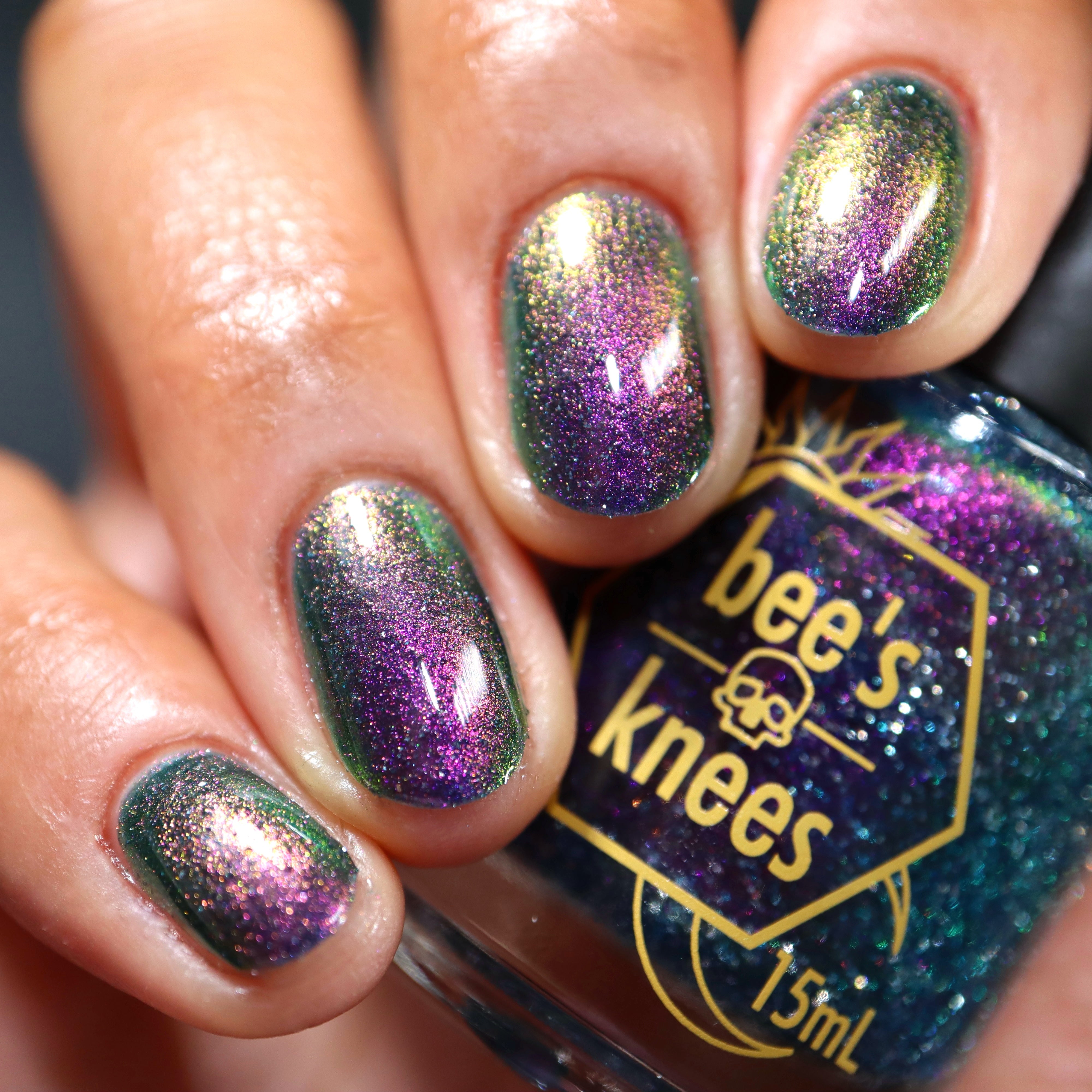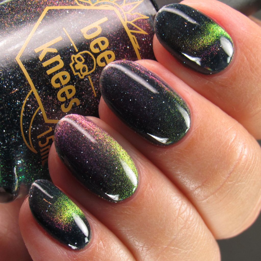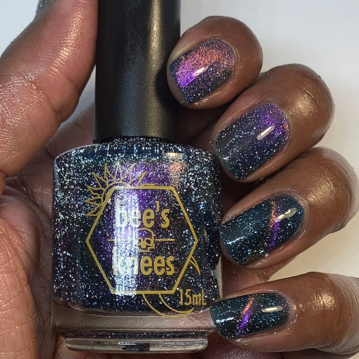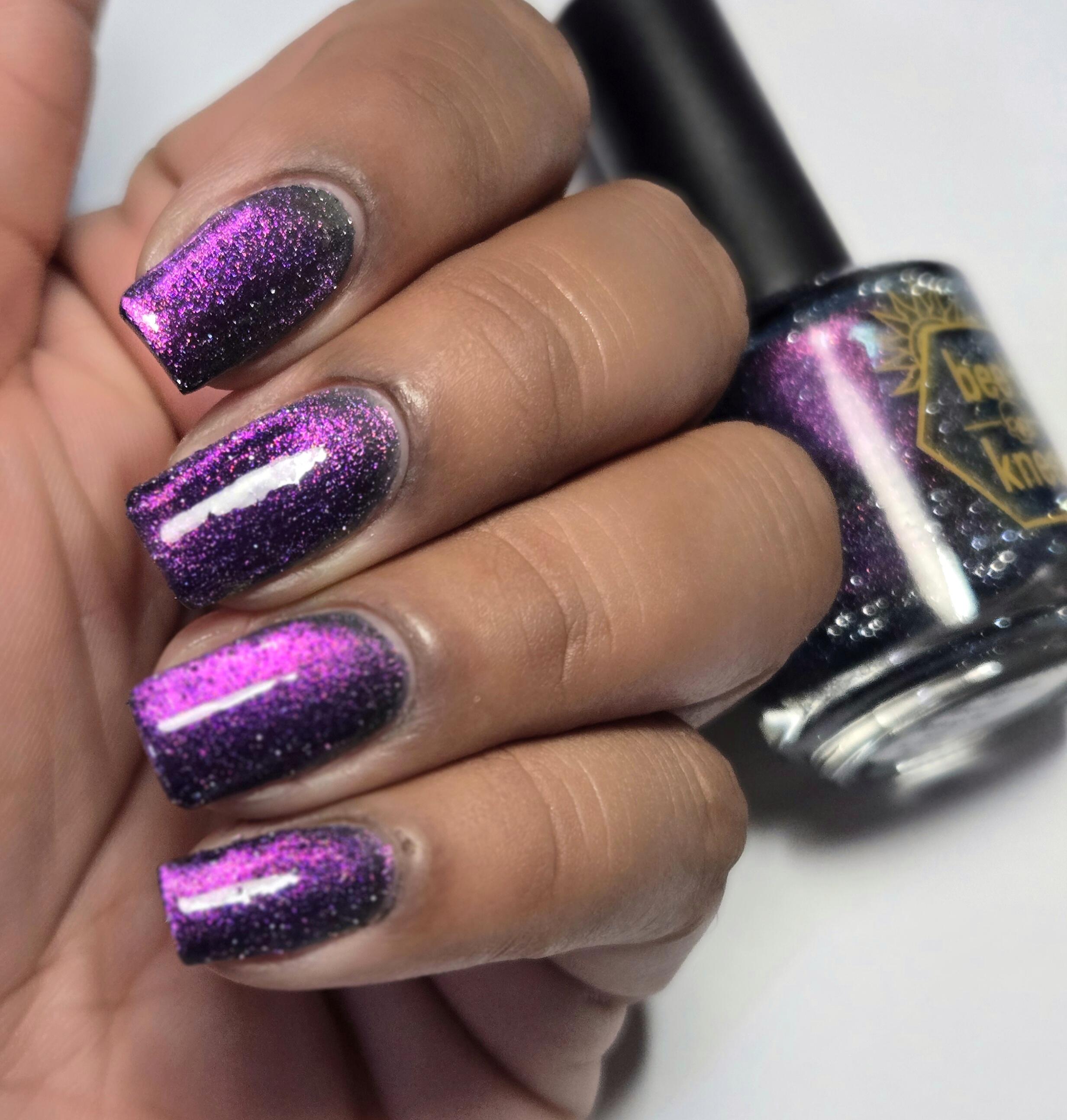 a dark, dusty blue with pink to green multichrome magnetic shimmer and silver light reflective glitter