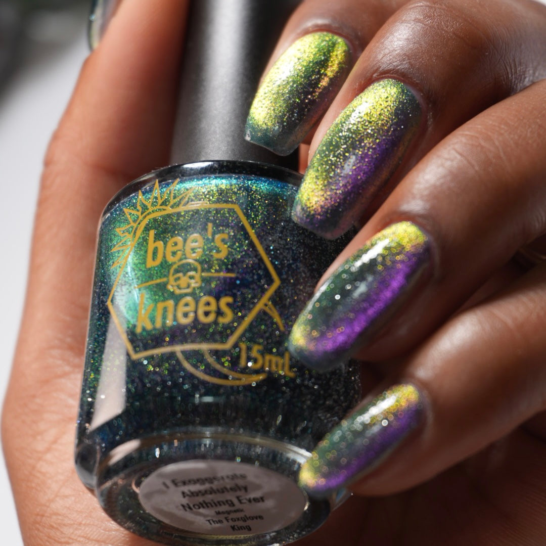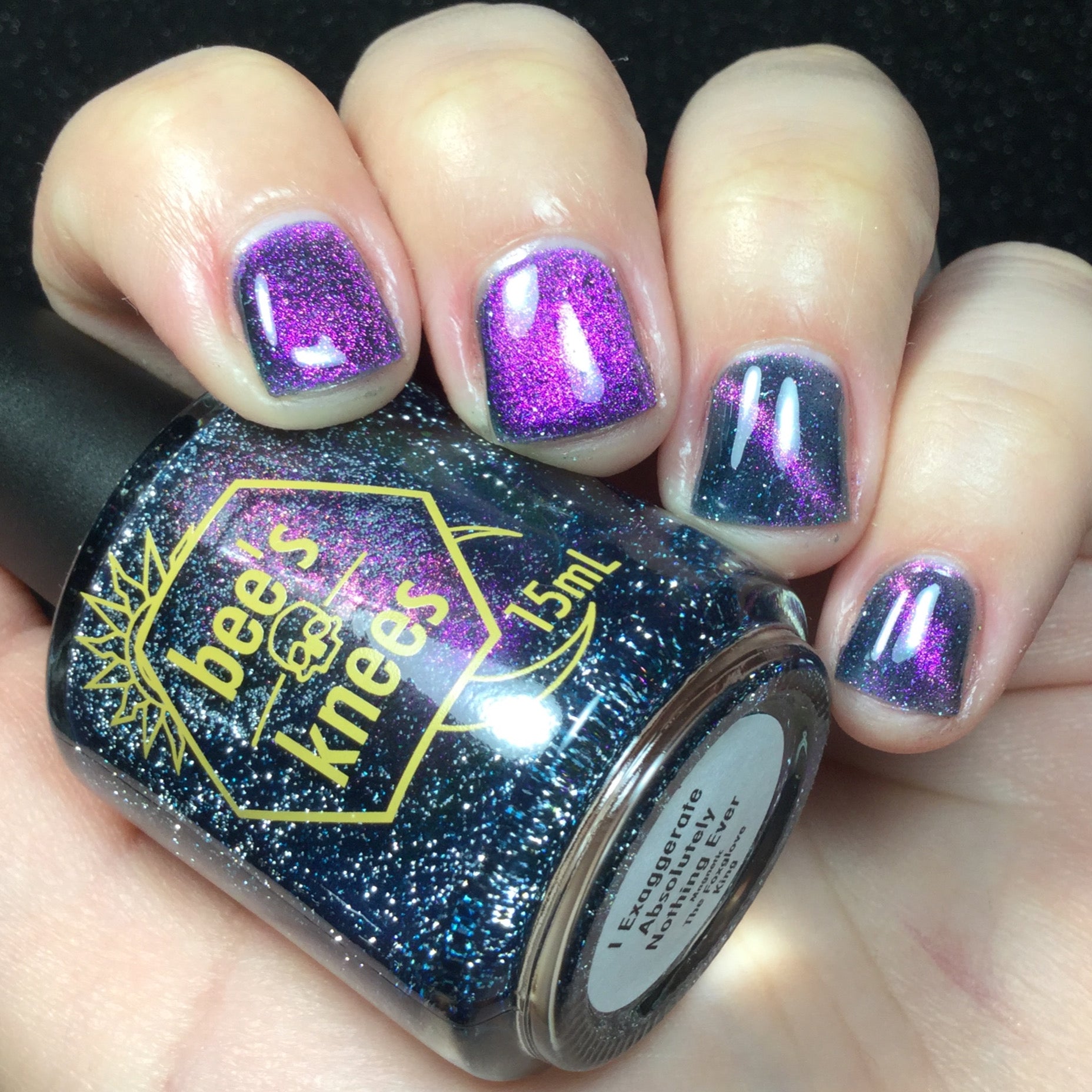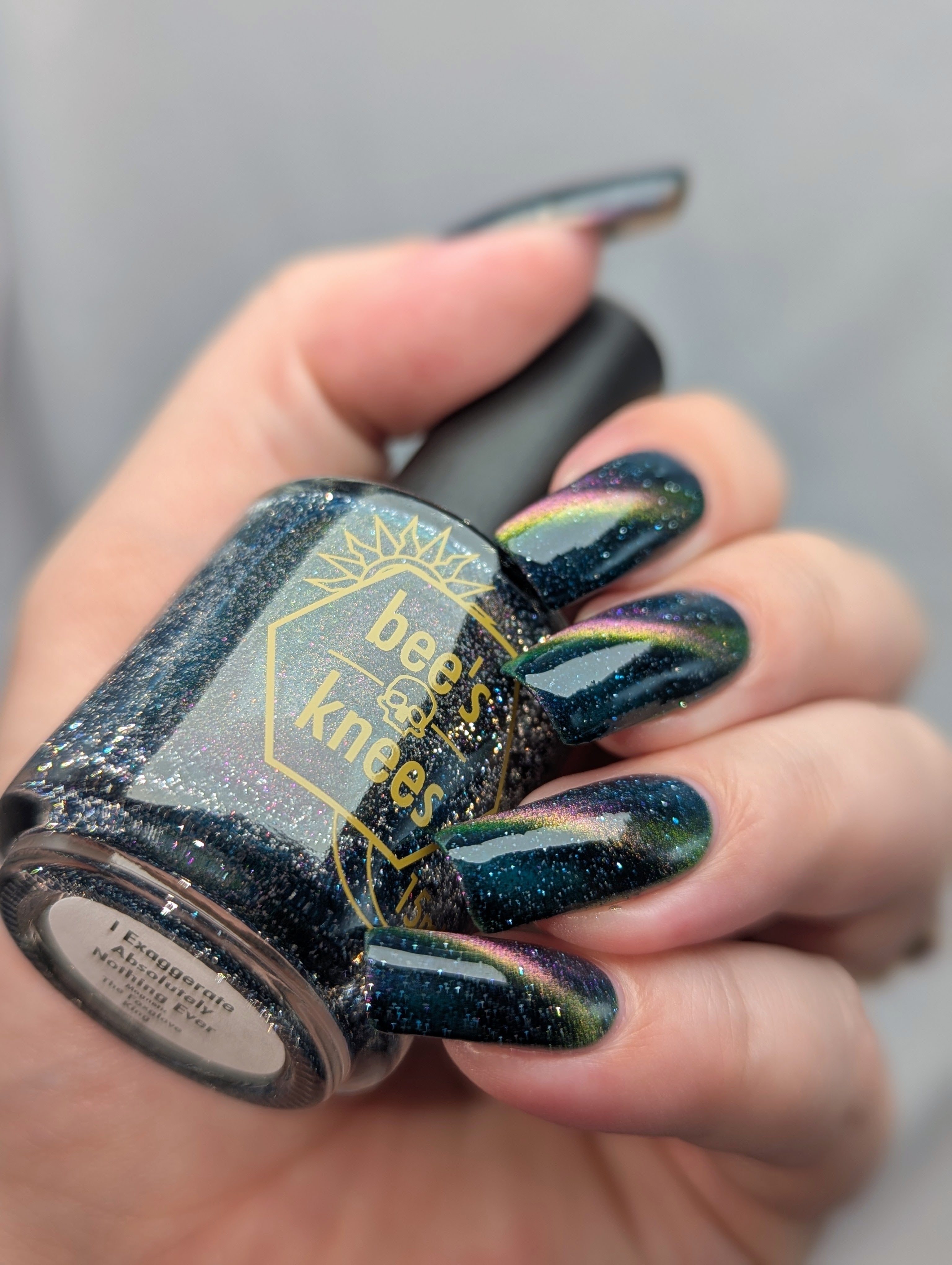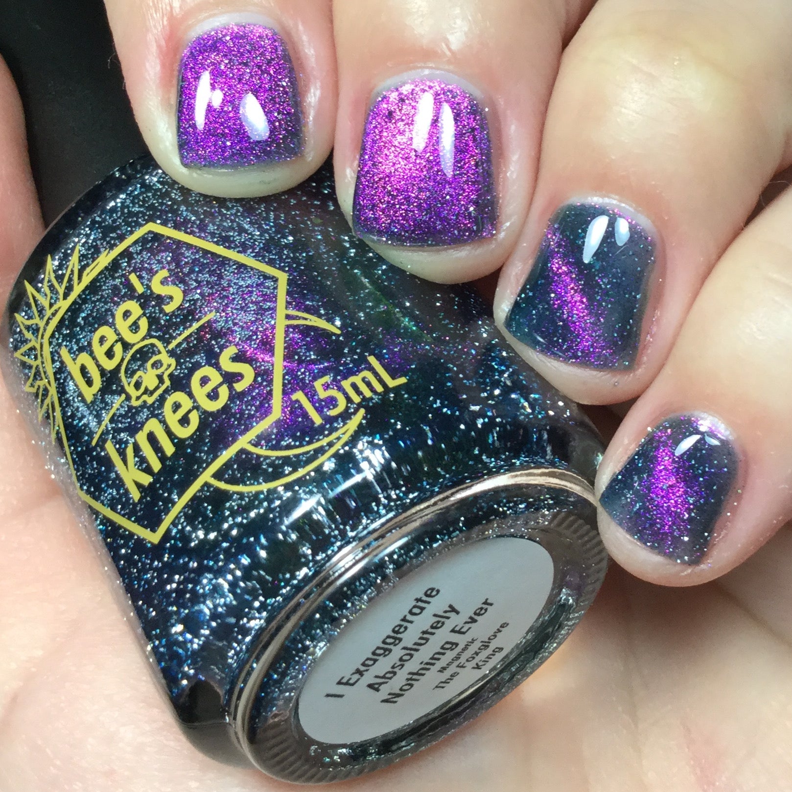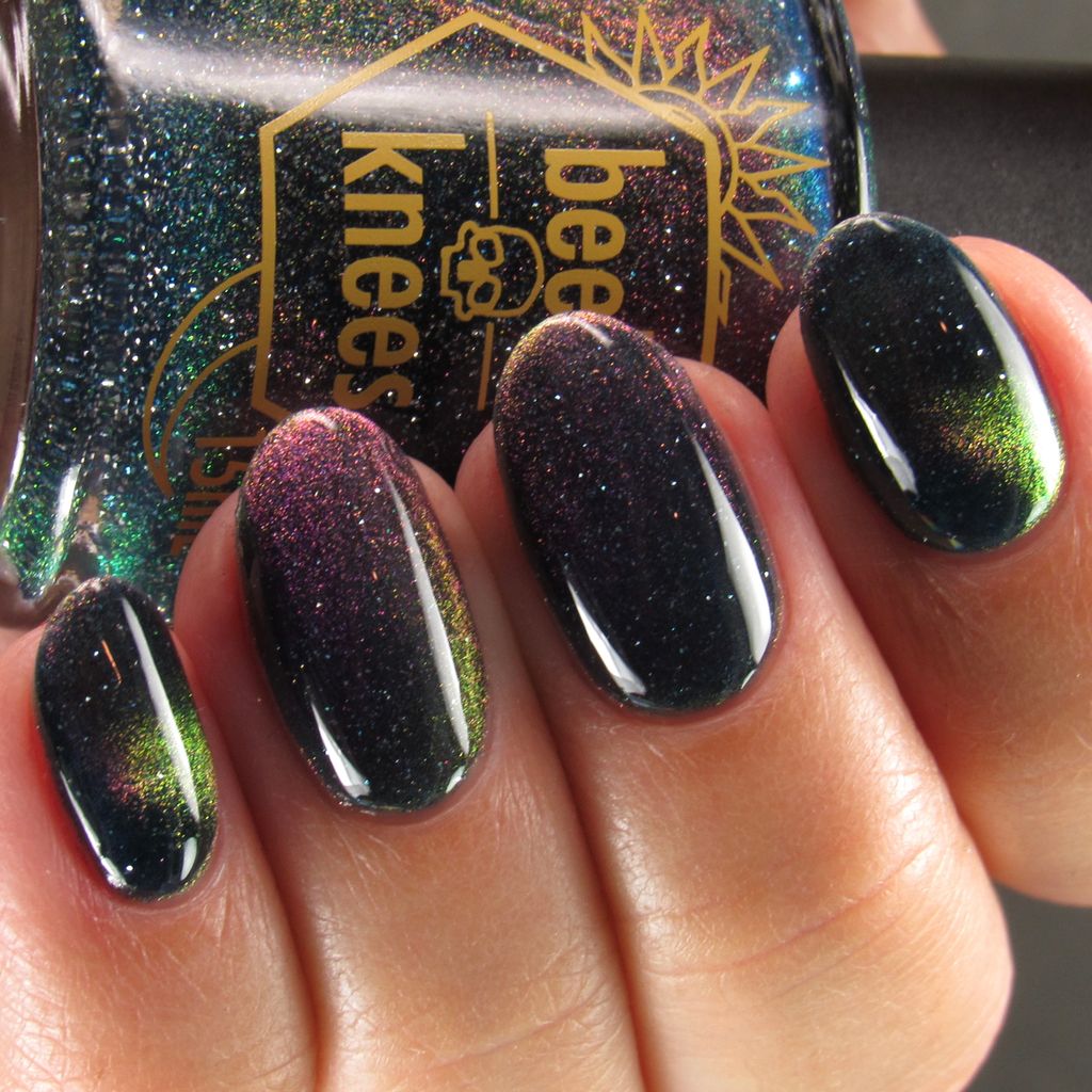 a dark, dusty blue with pink to green multichrome magnetic shimmer and silver light reflective glitter