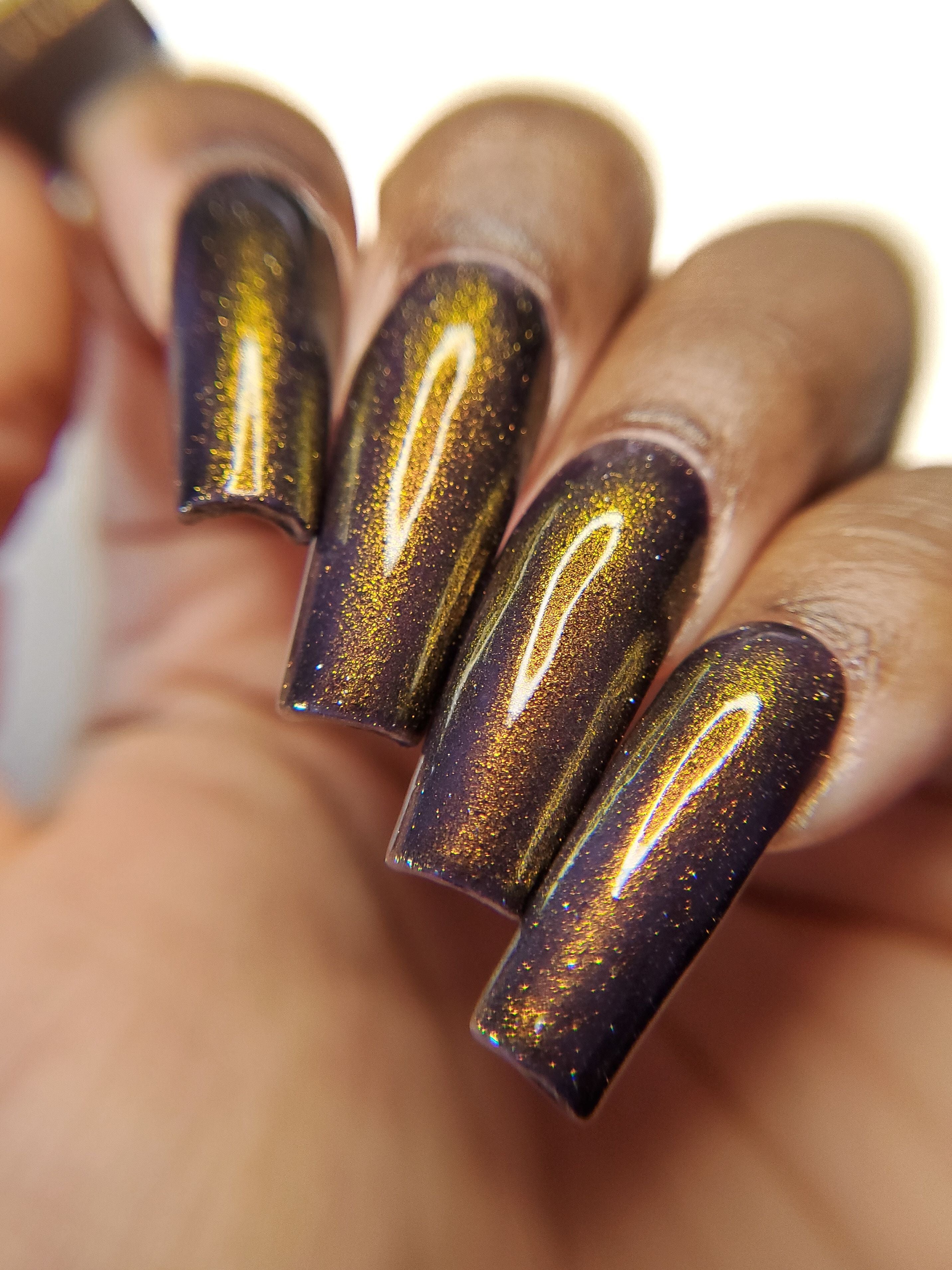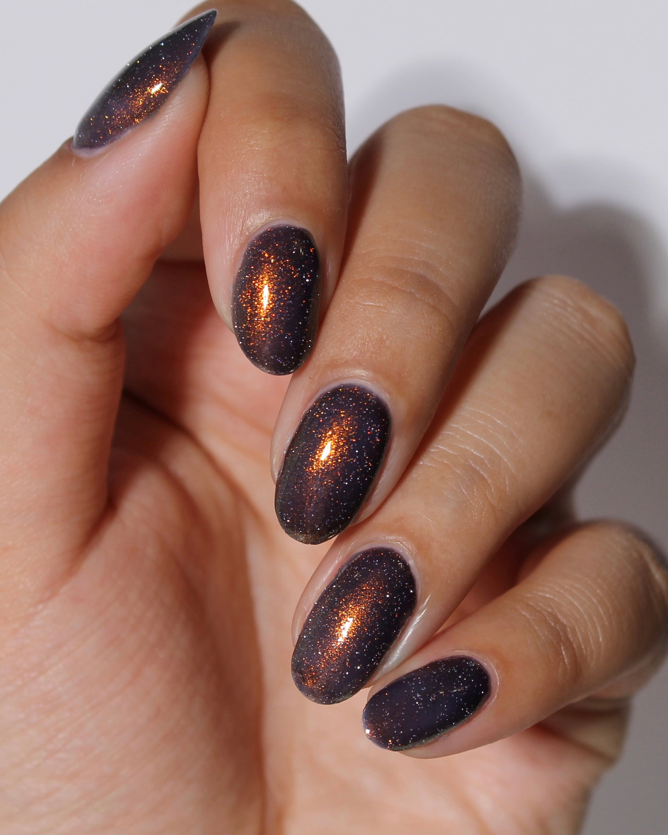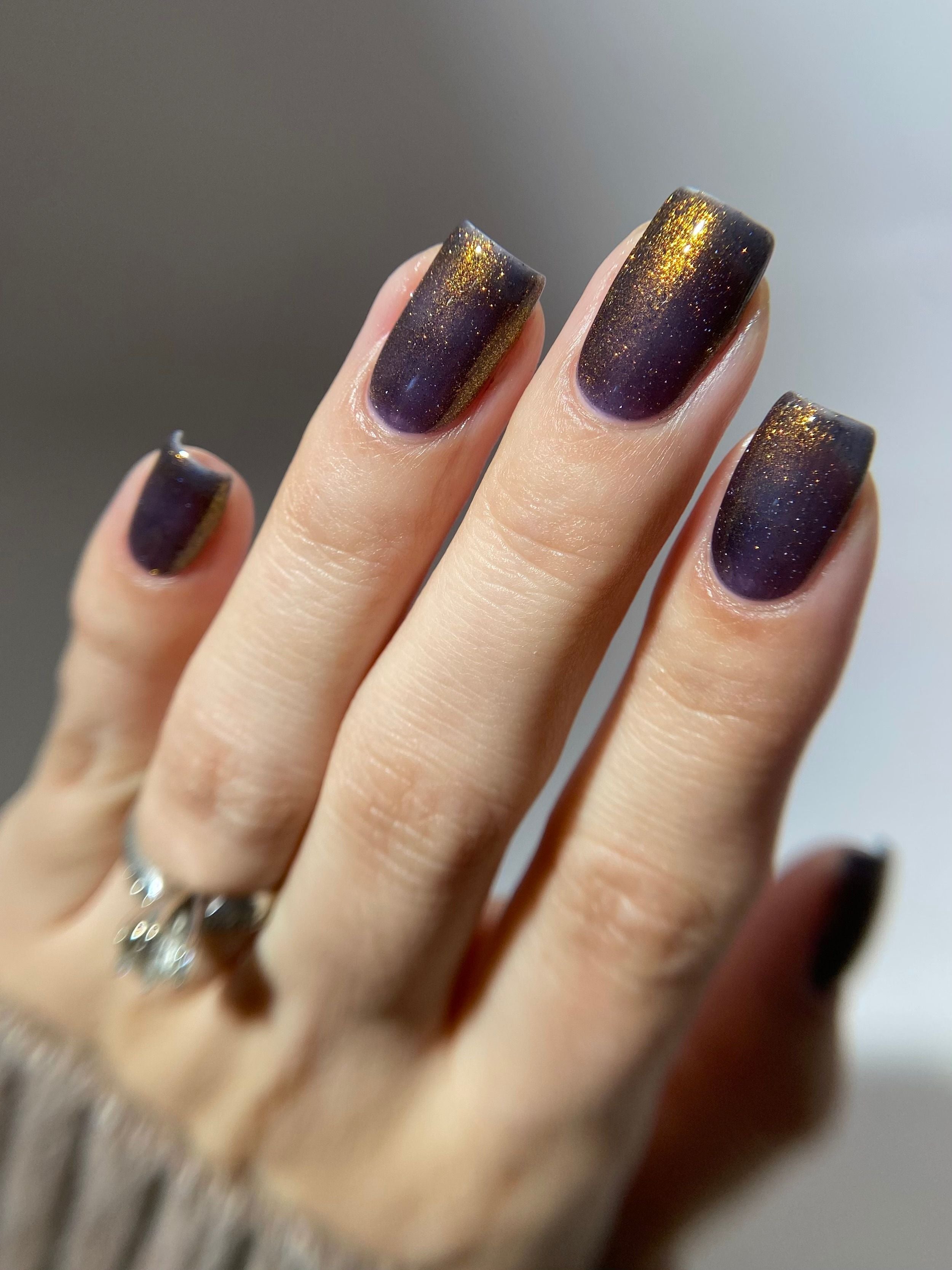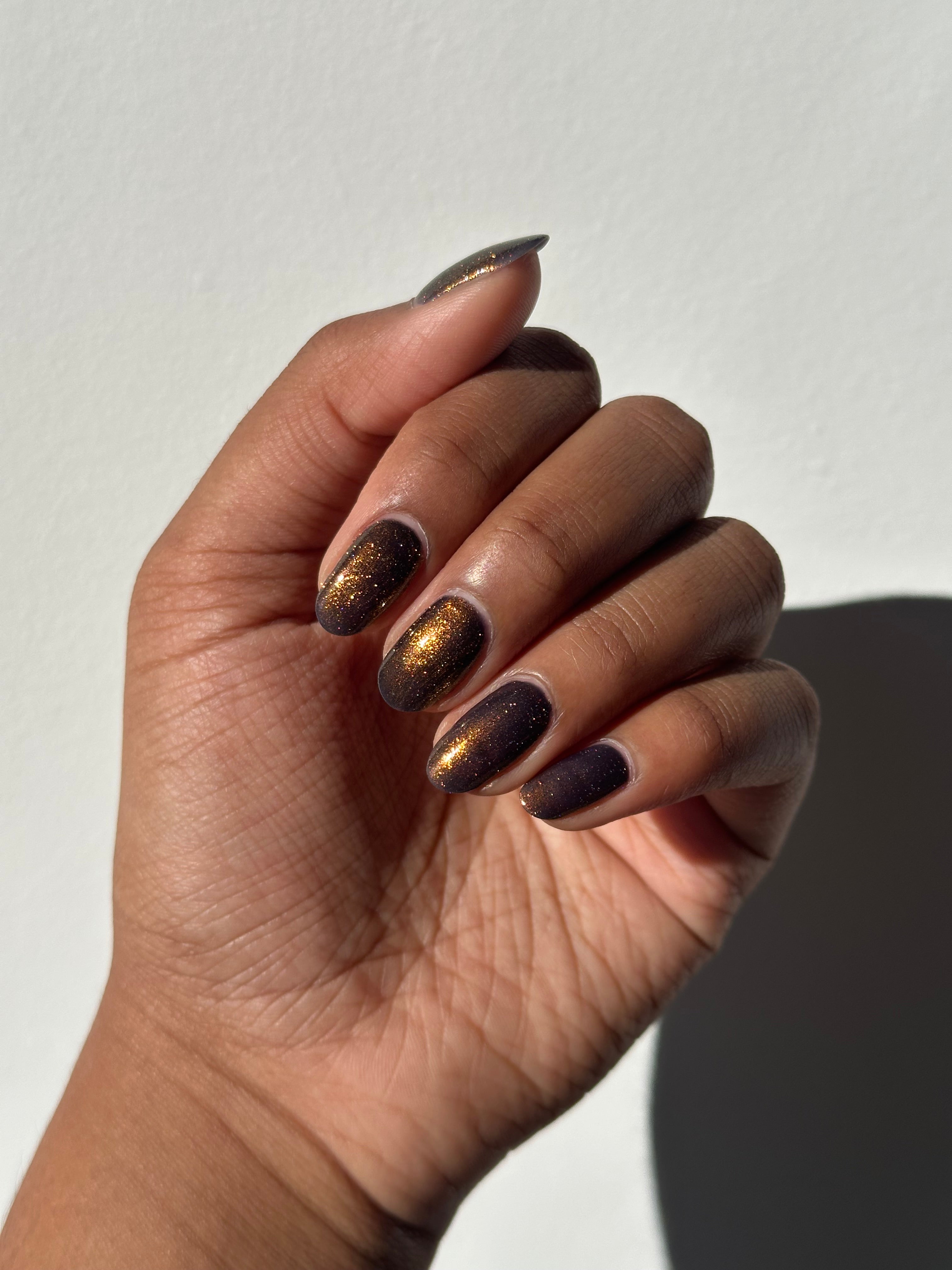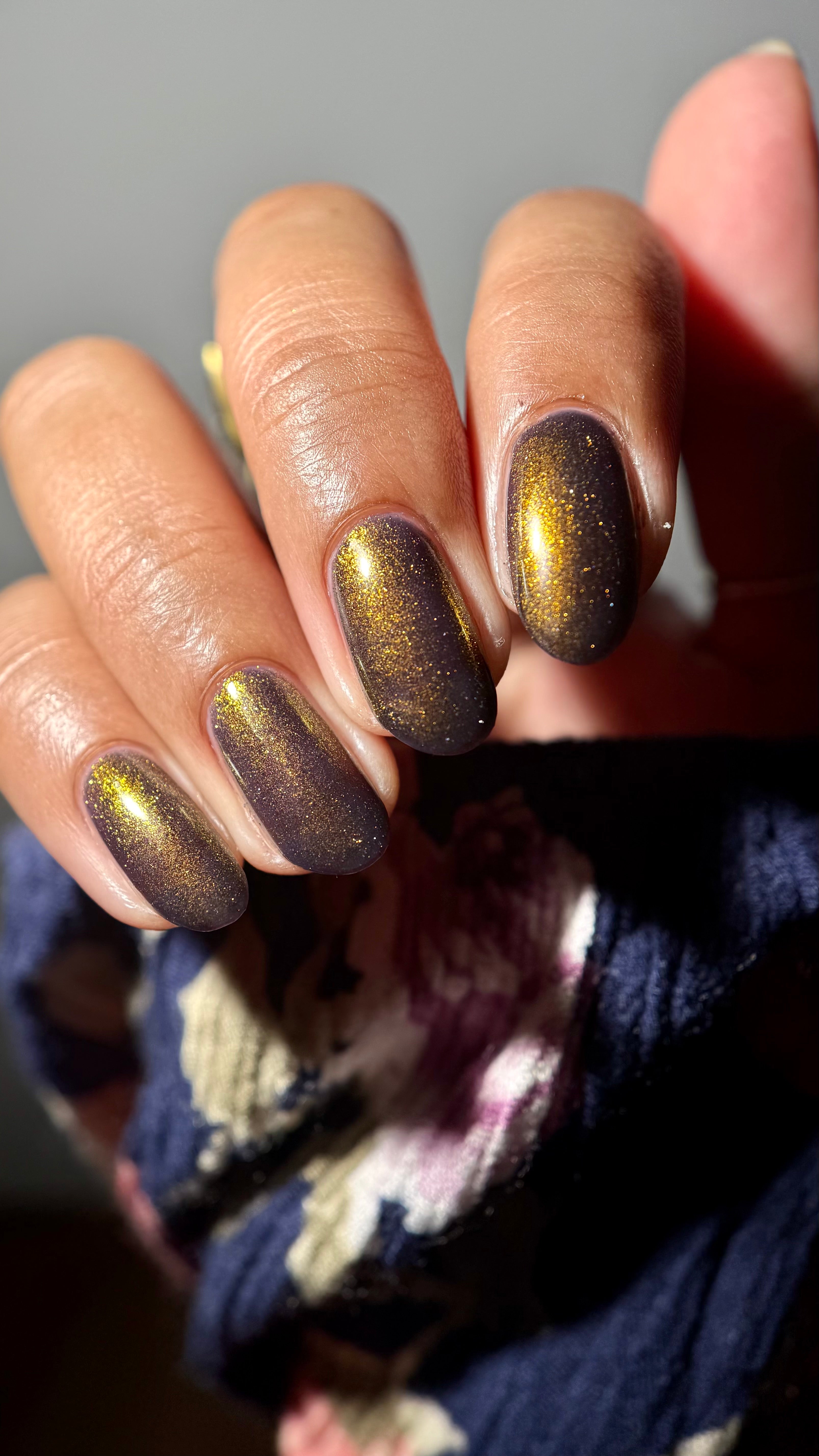 a sheer but buildable indigo with strong gold shimmer and a scattering of silver light reflective glitter