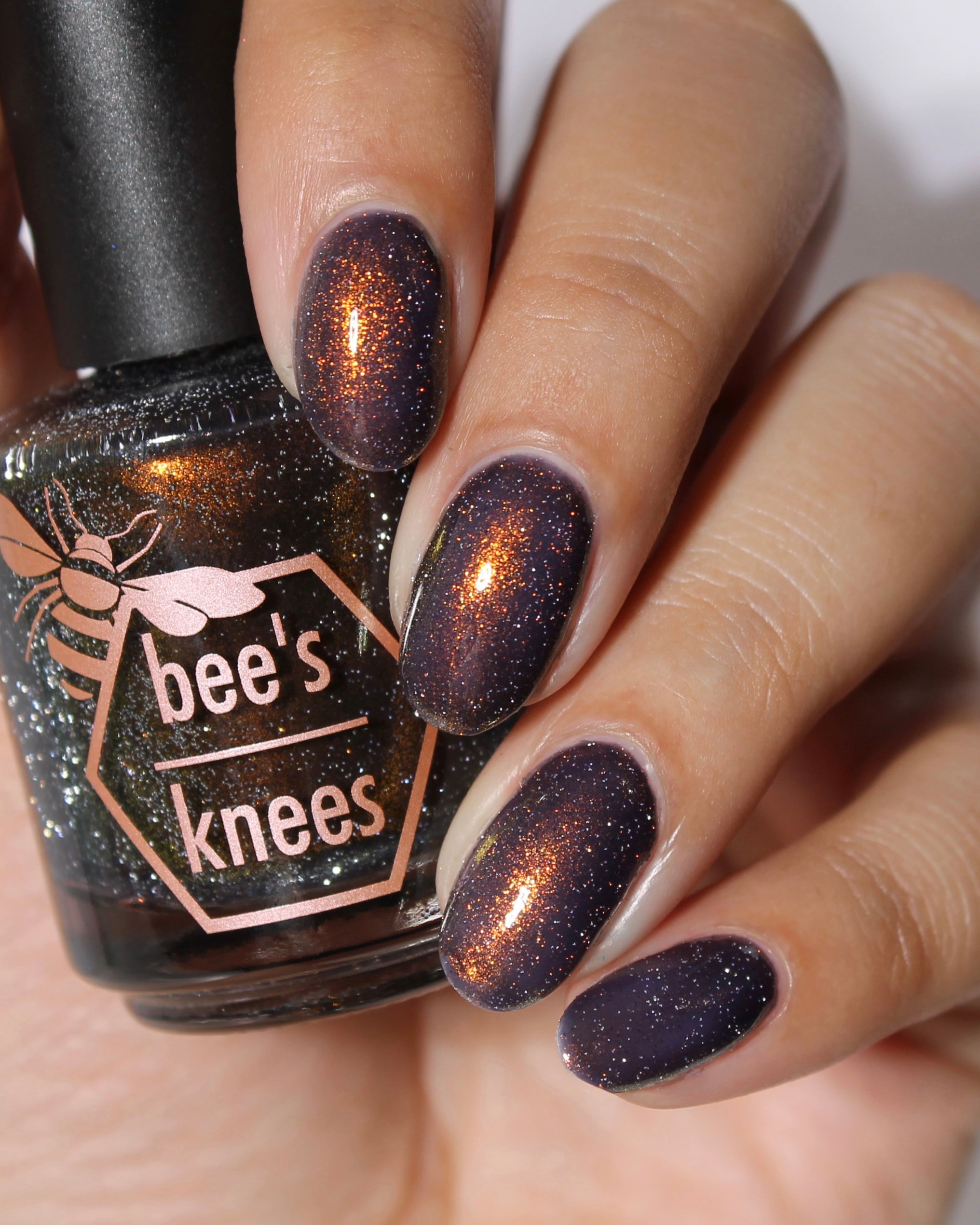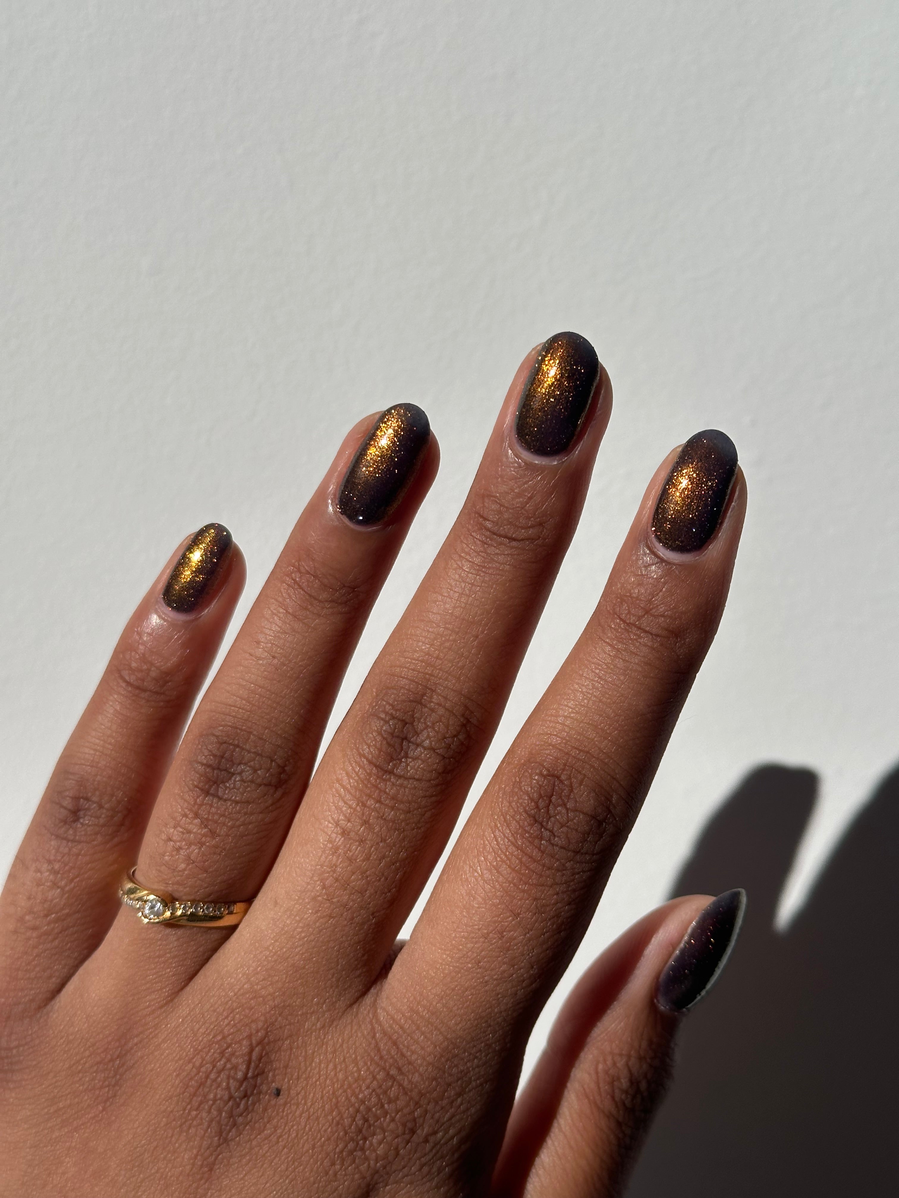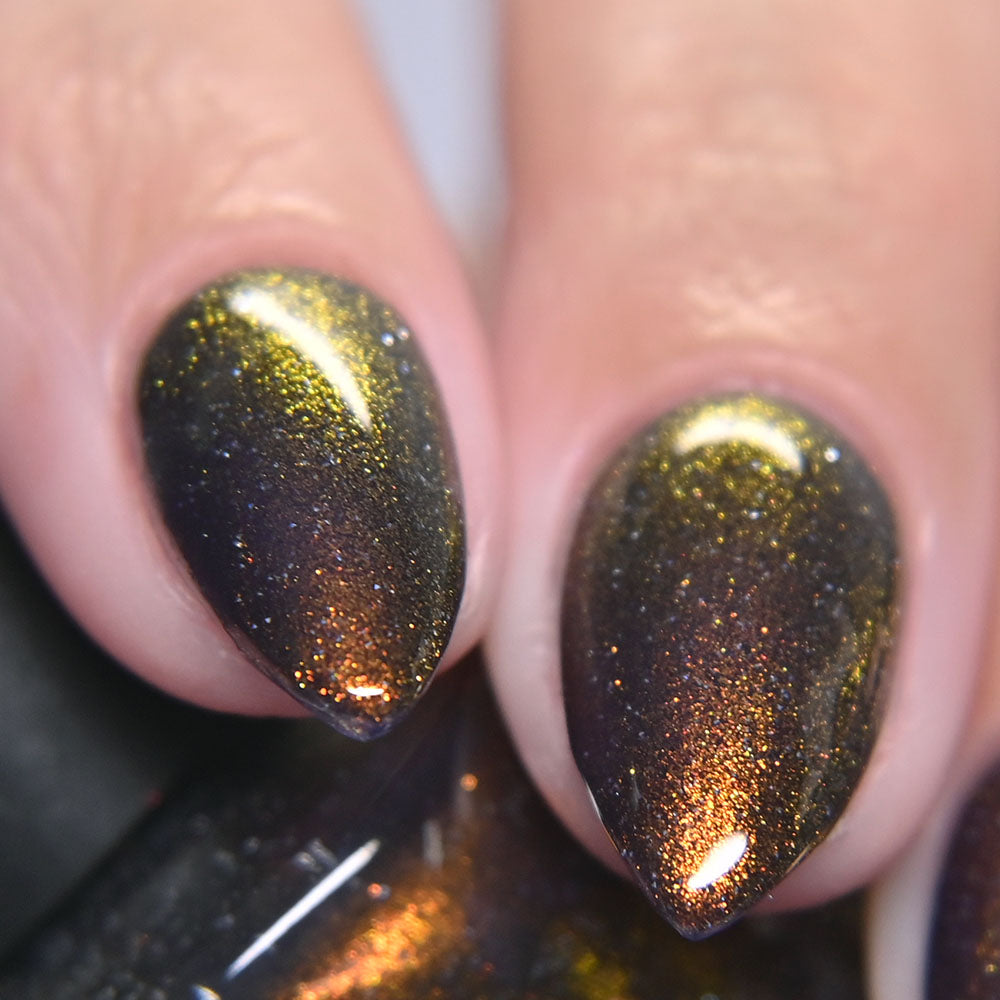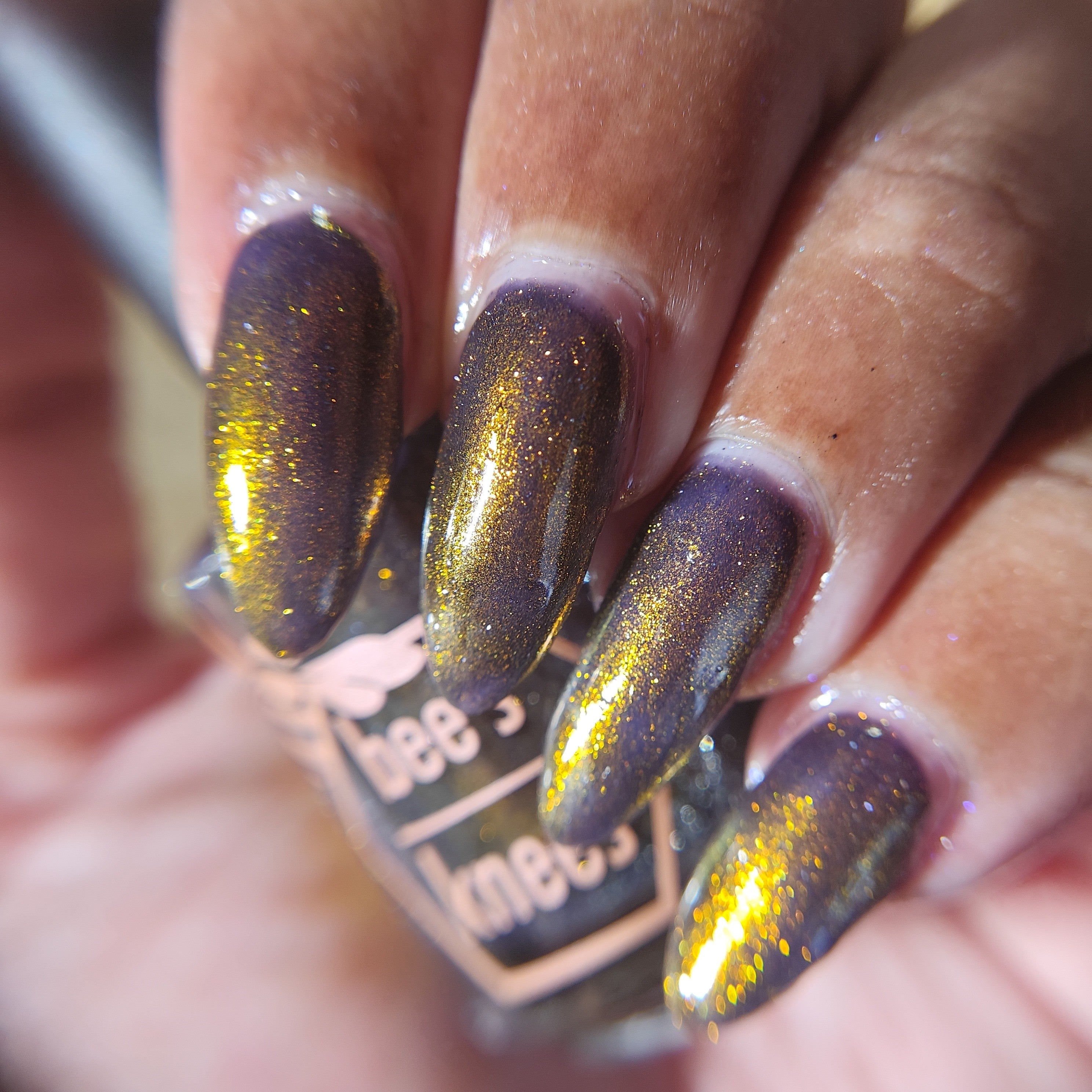 a sheer but buildable indigo with strong gold shimmer and a scattering of silver light reflective glitter