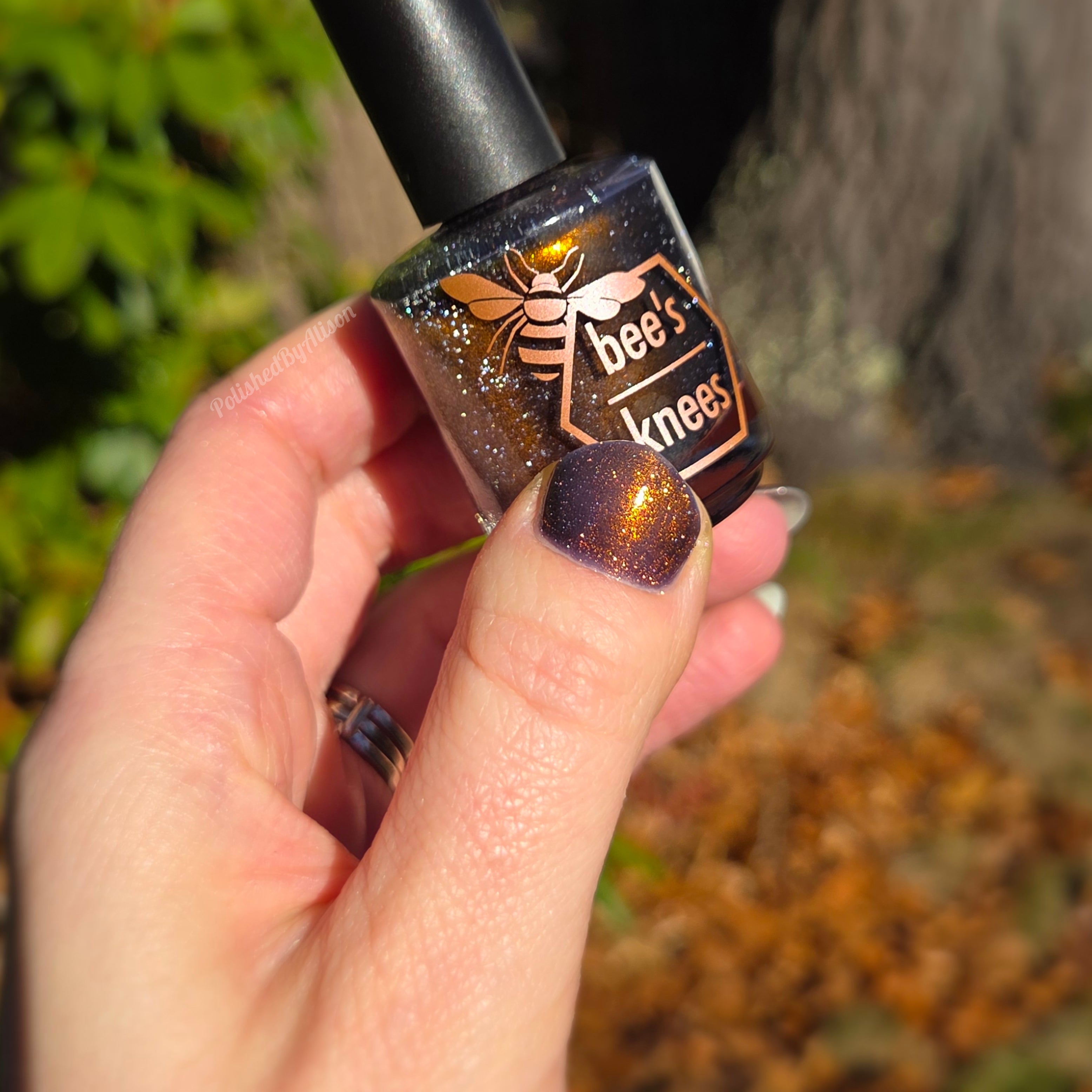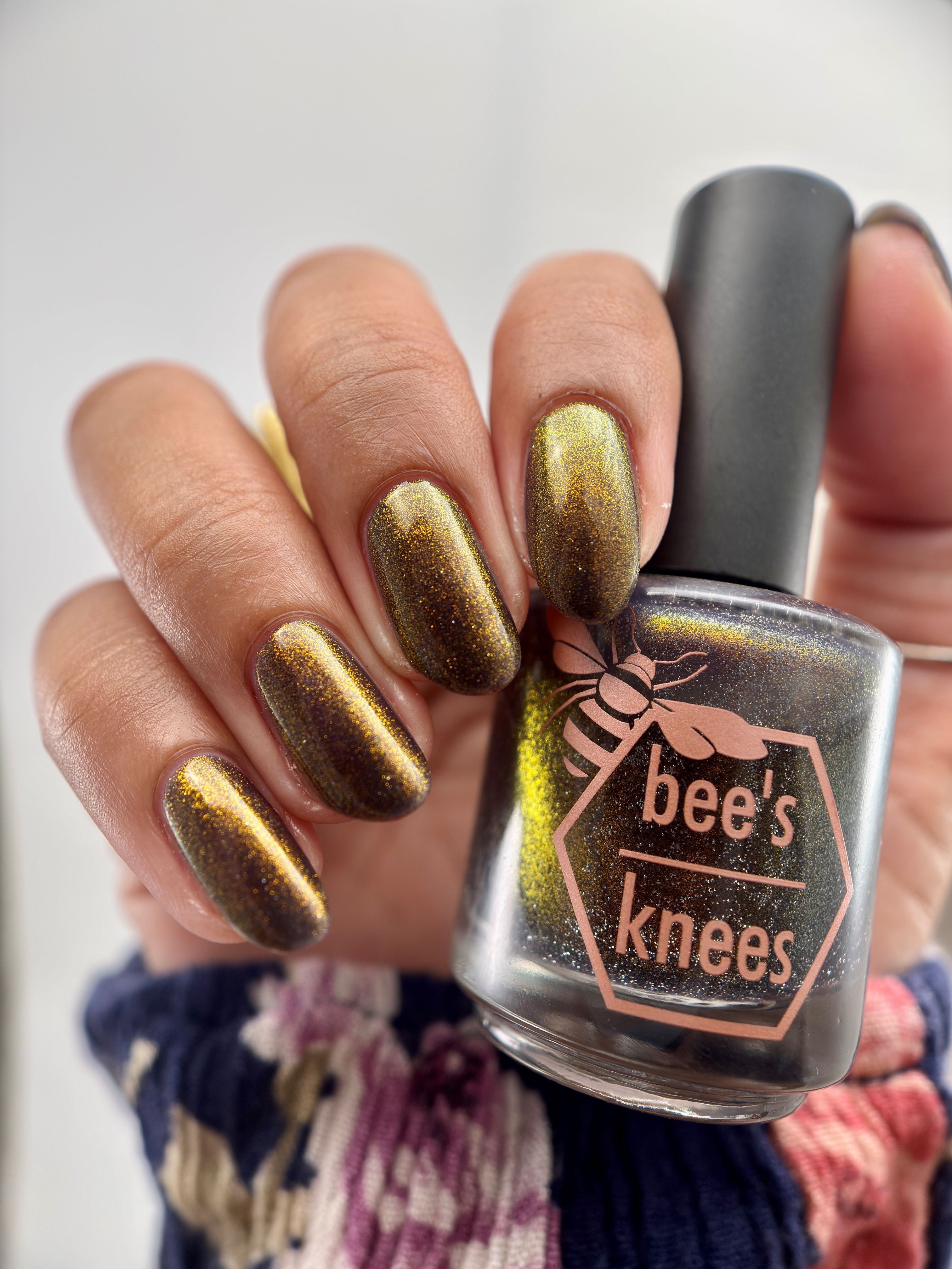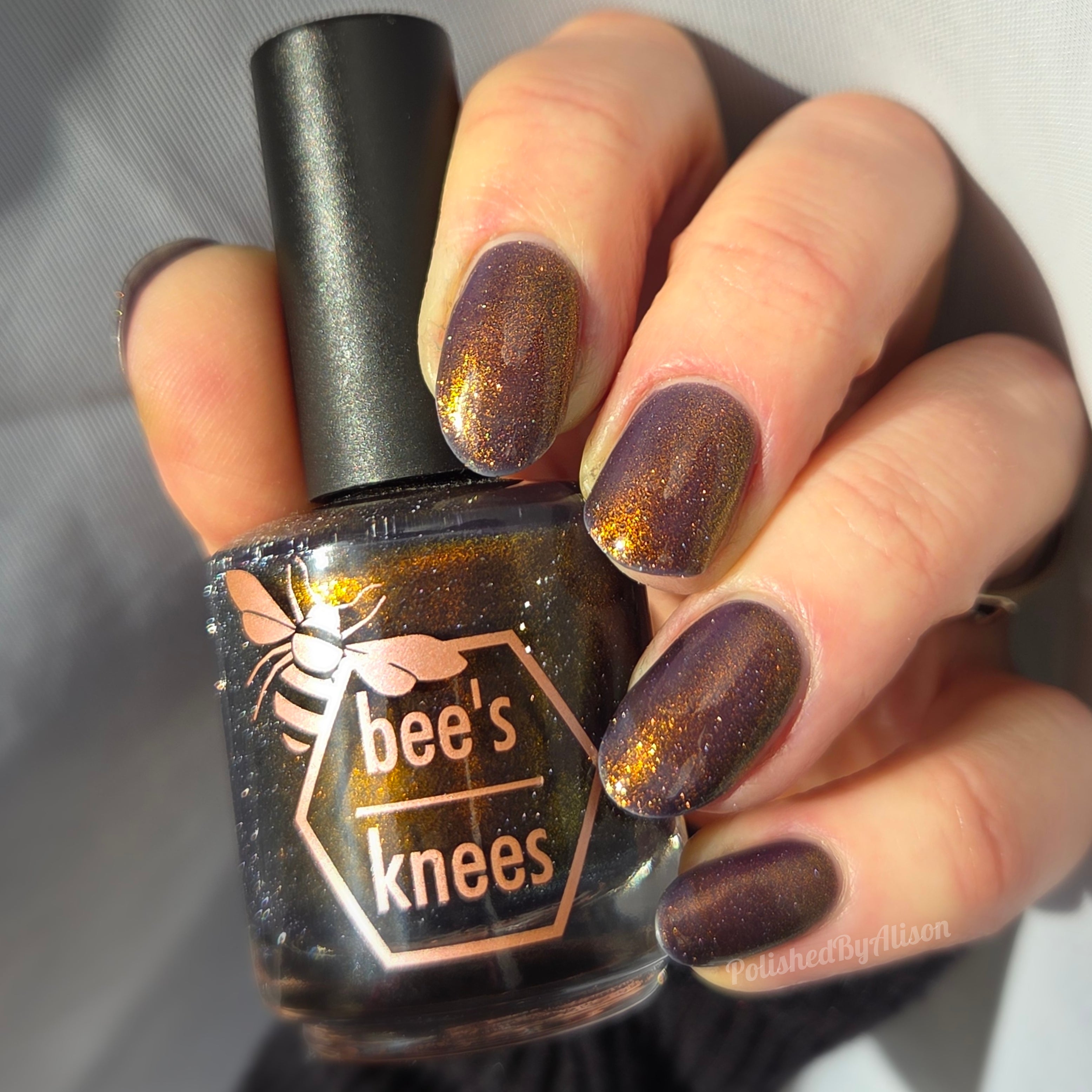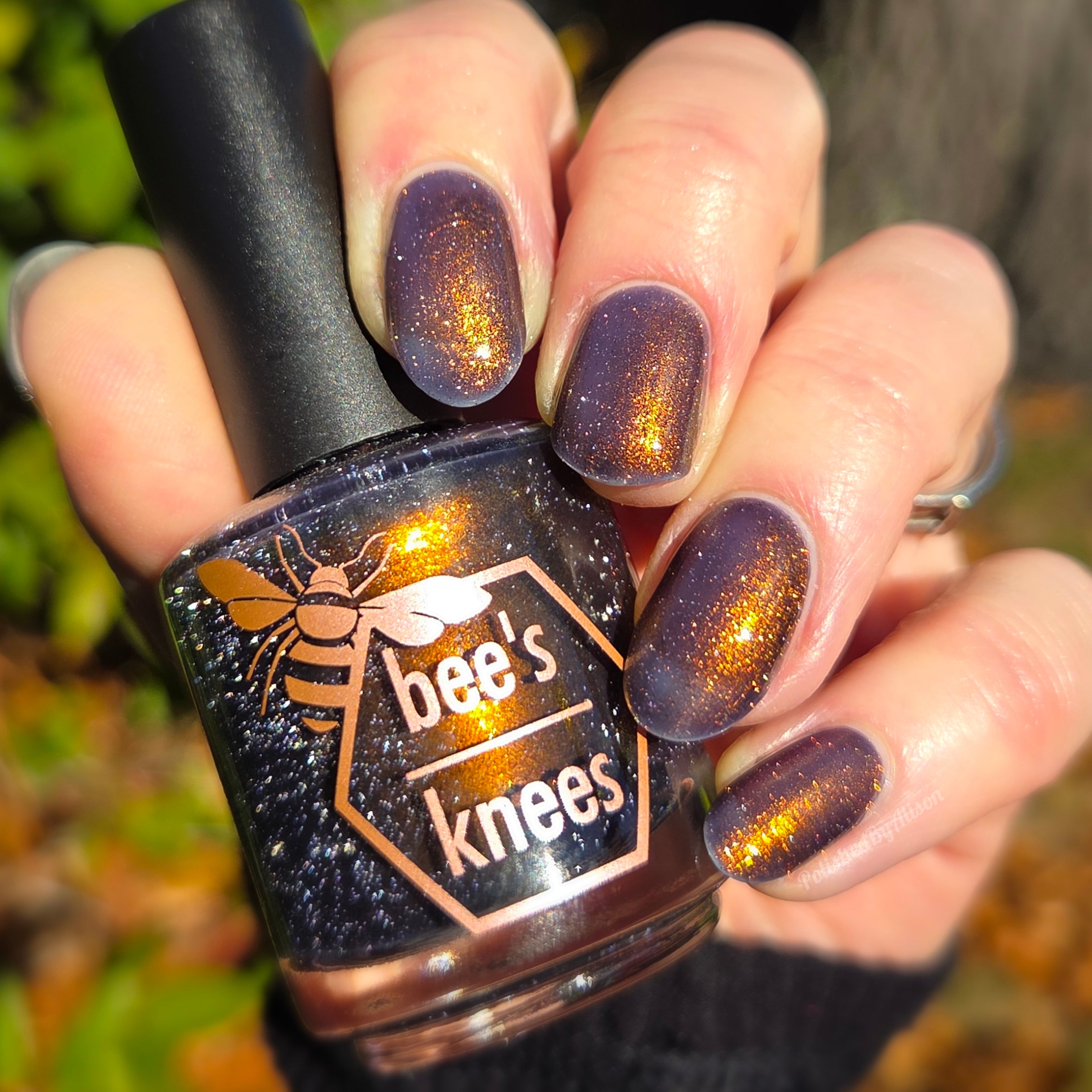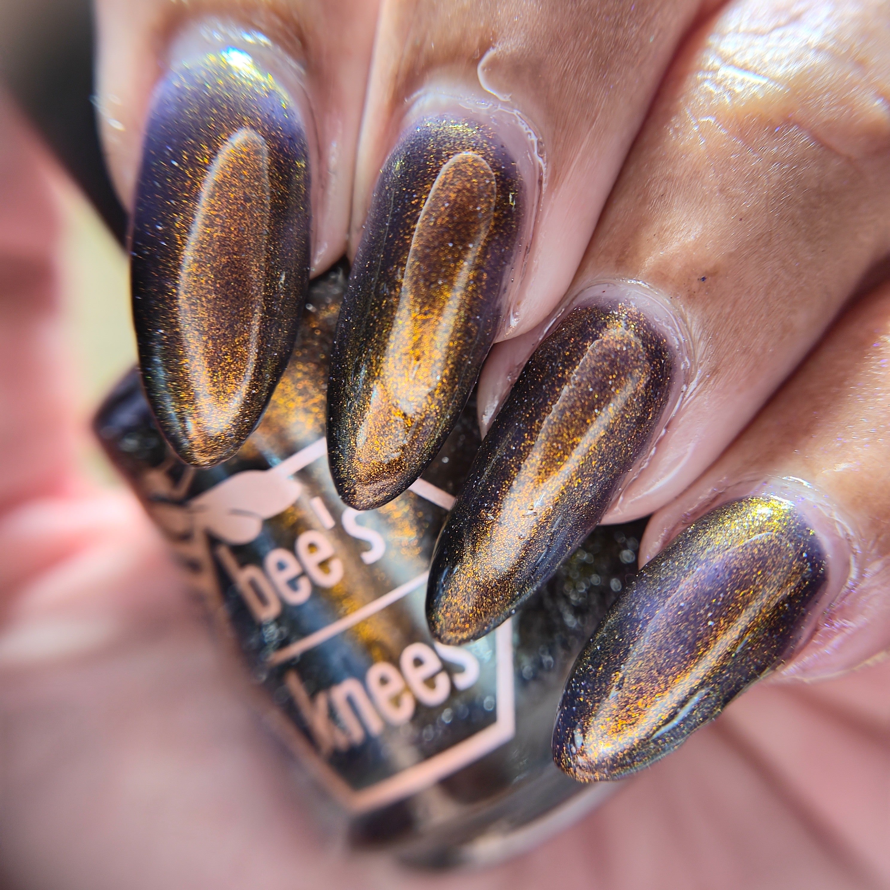 a sheer but buildable indigo with strong gold shimmer and a scattering of silver light reflective glitter