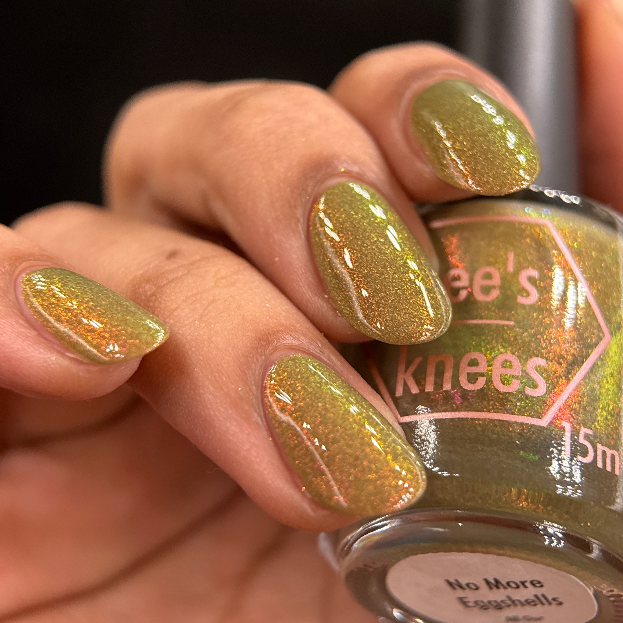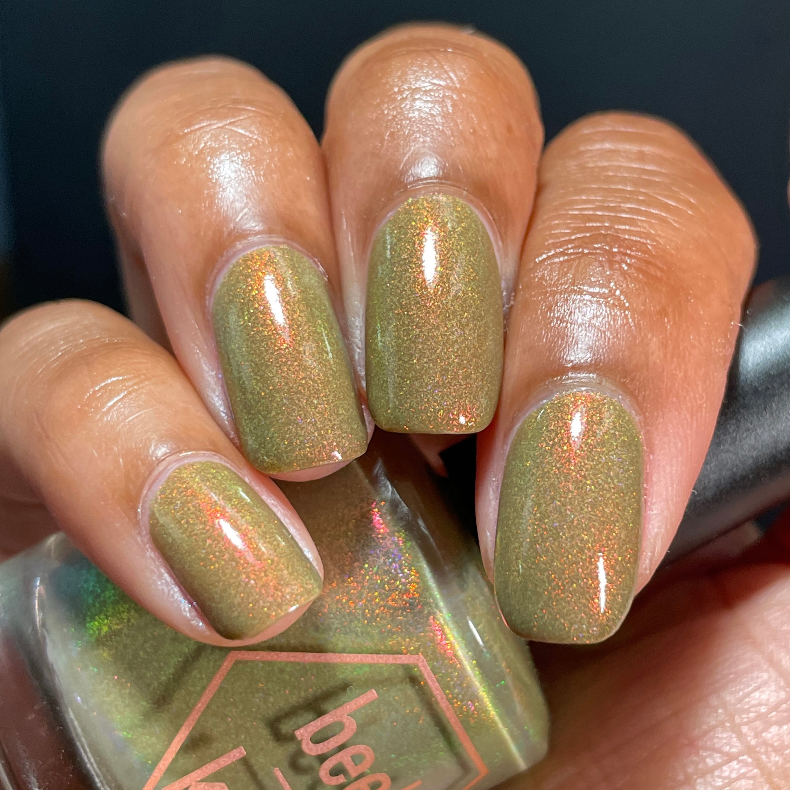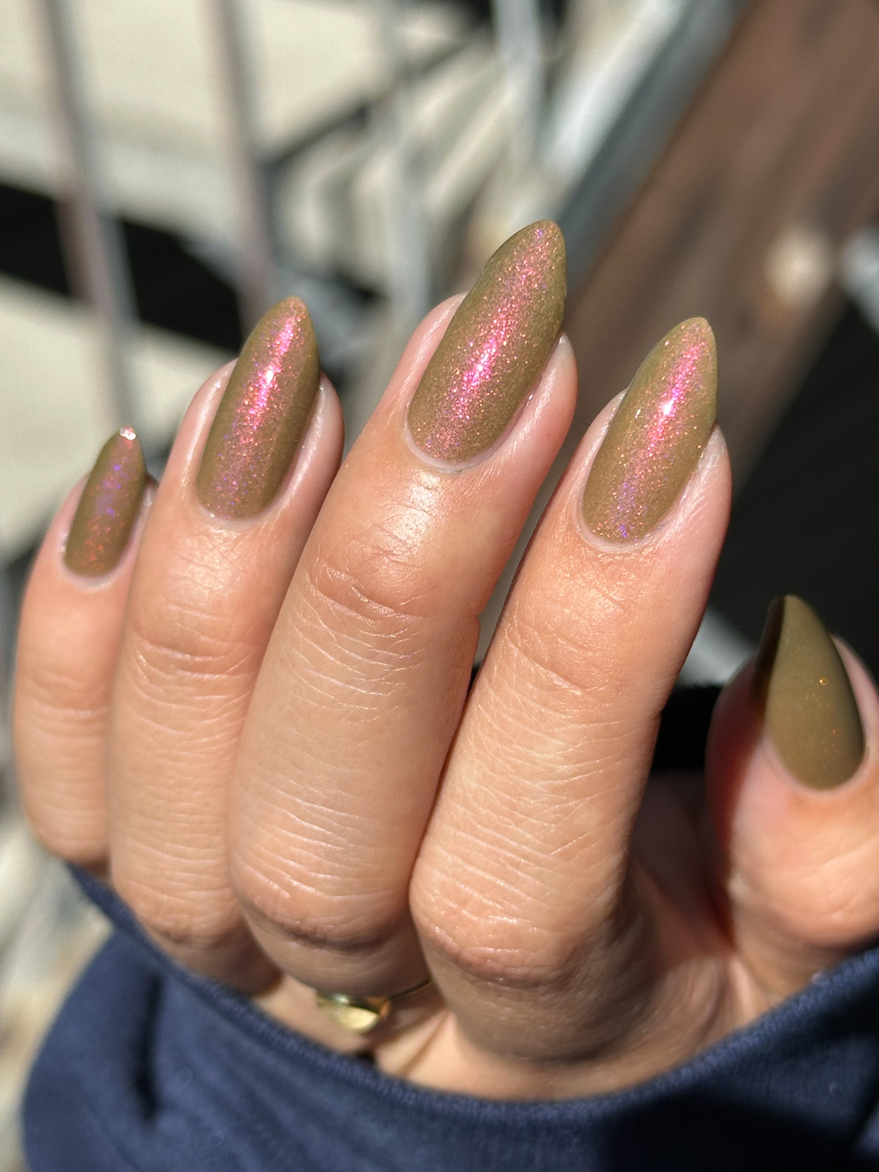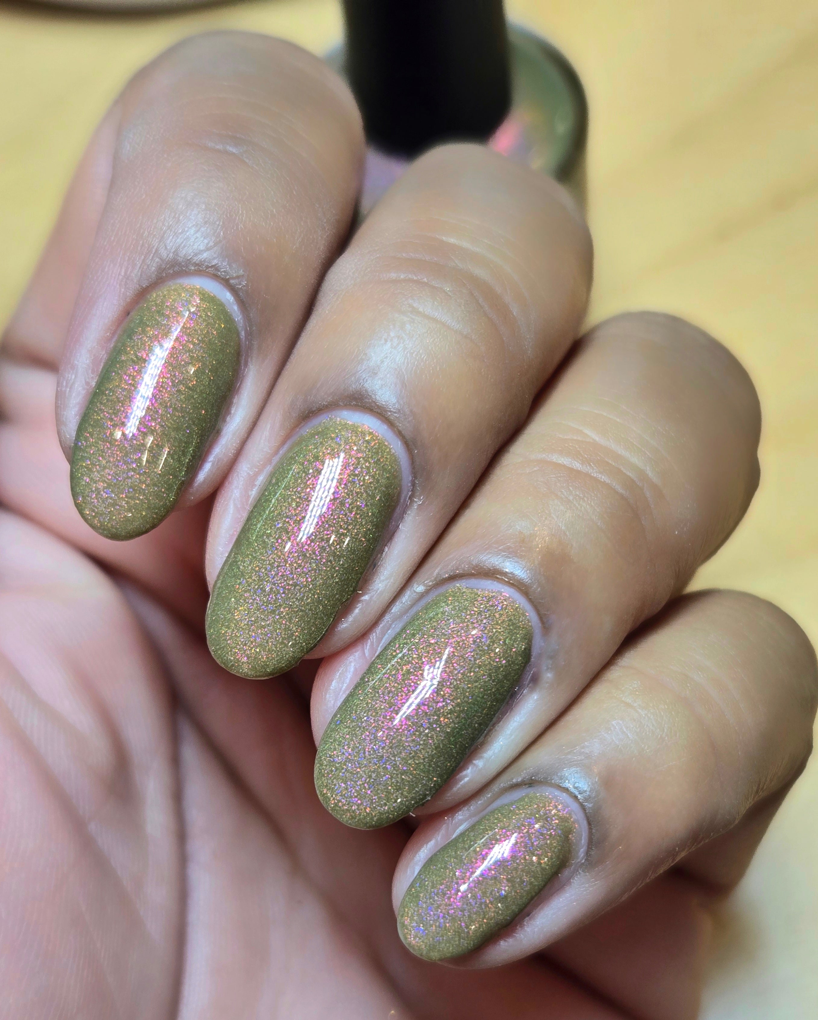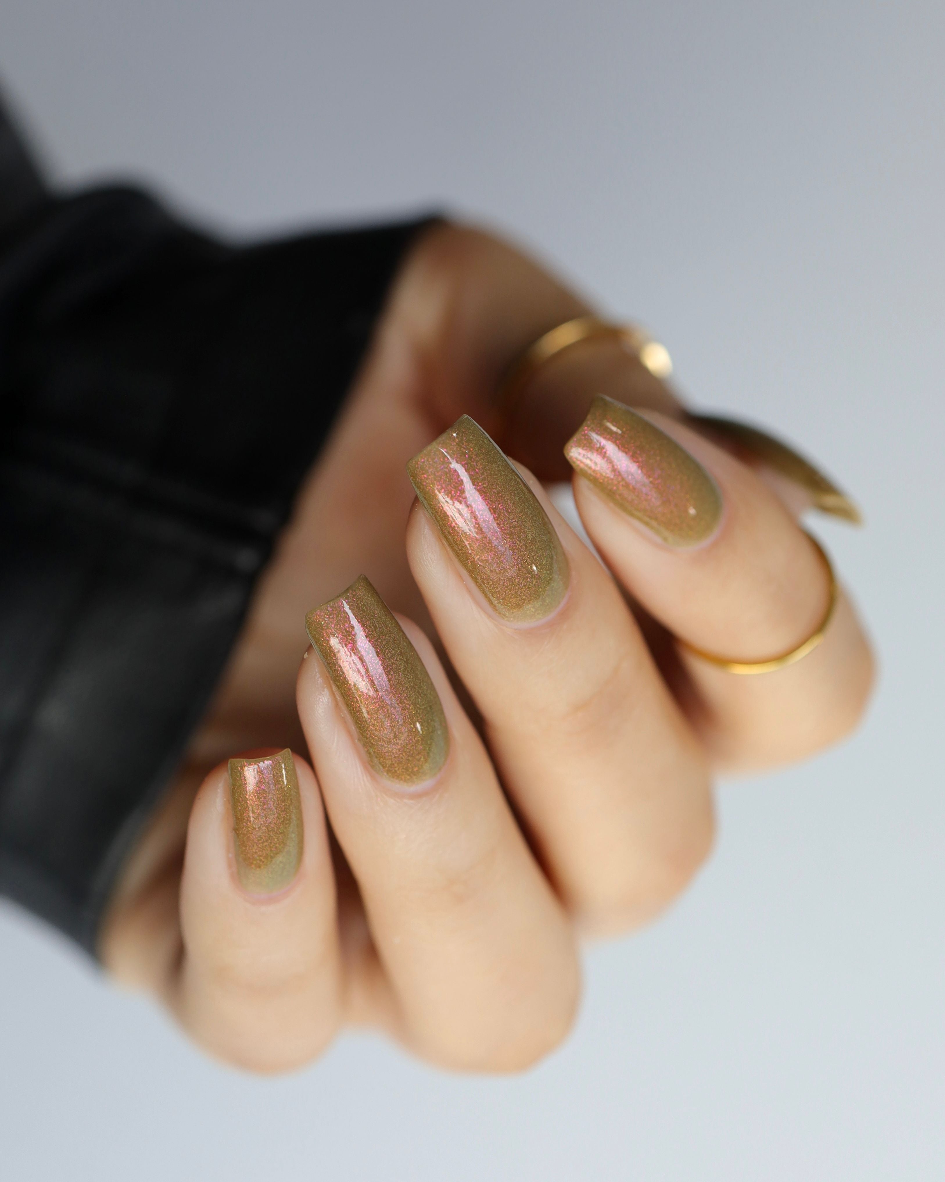a dirty eggshell tan with pink to green shimmer and a subtle holo effect