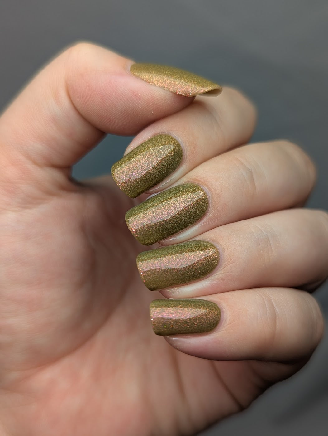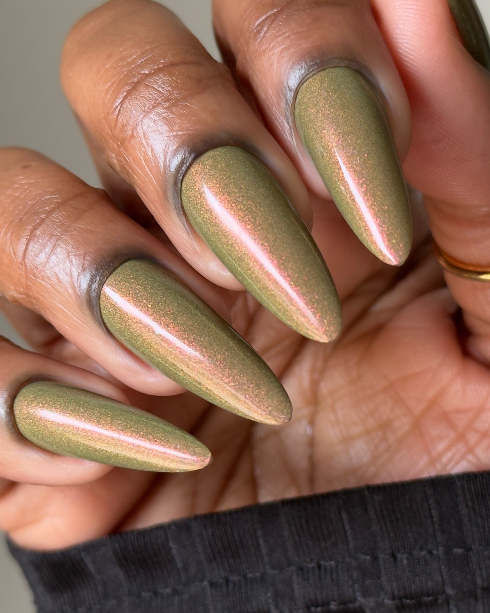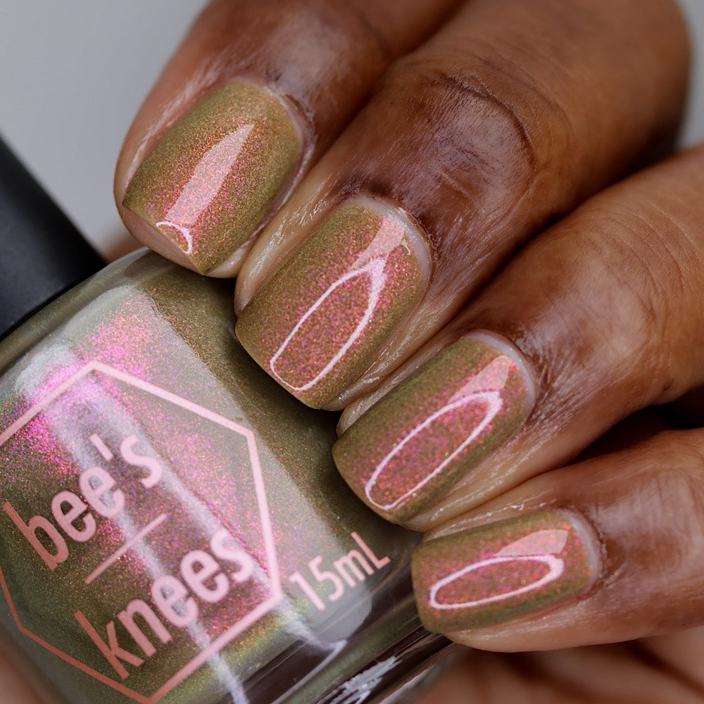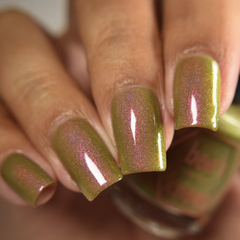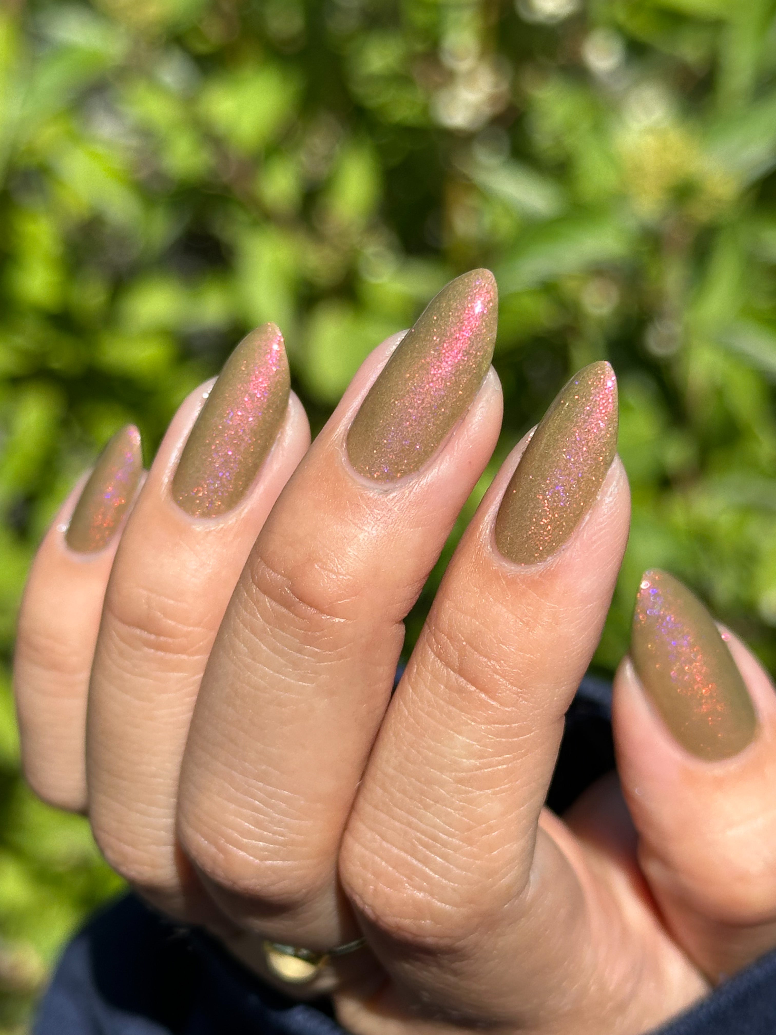 a dirty eggshell tan with pink to green shimmer and a subtle holo effect