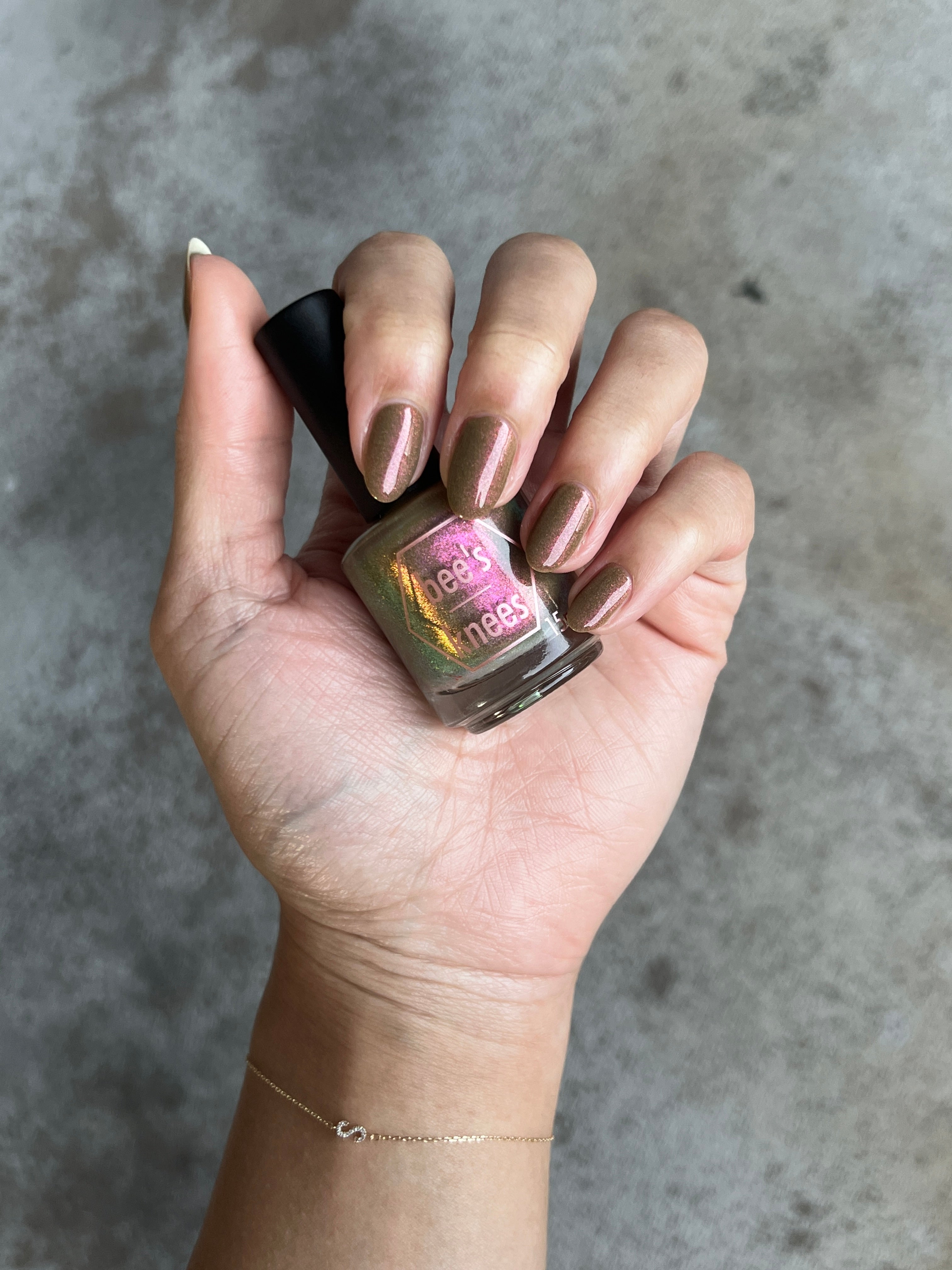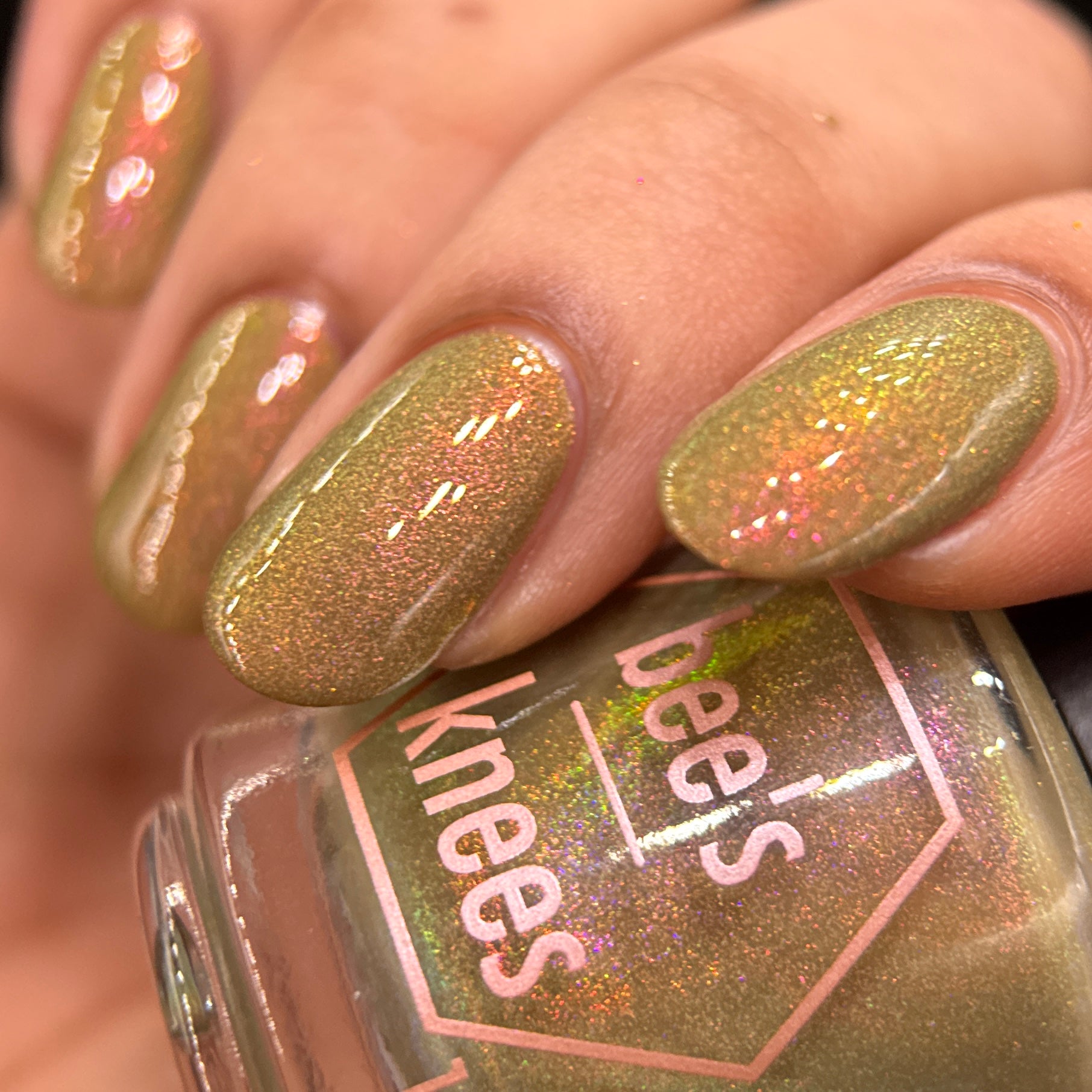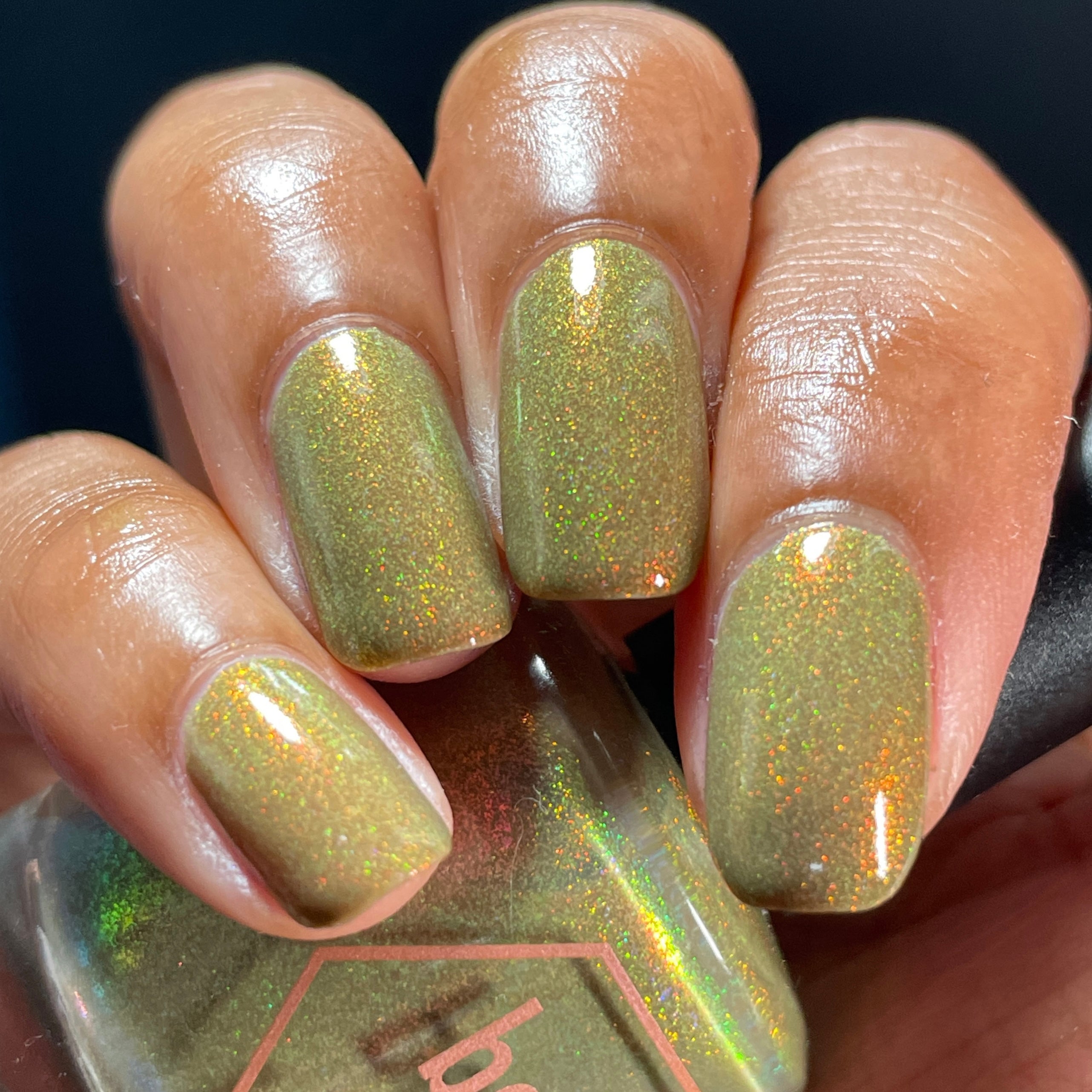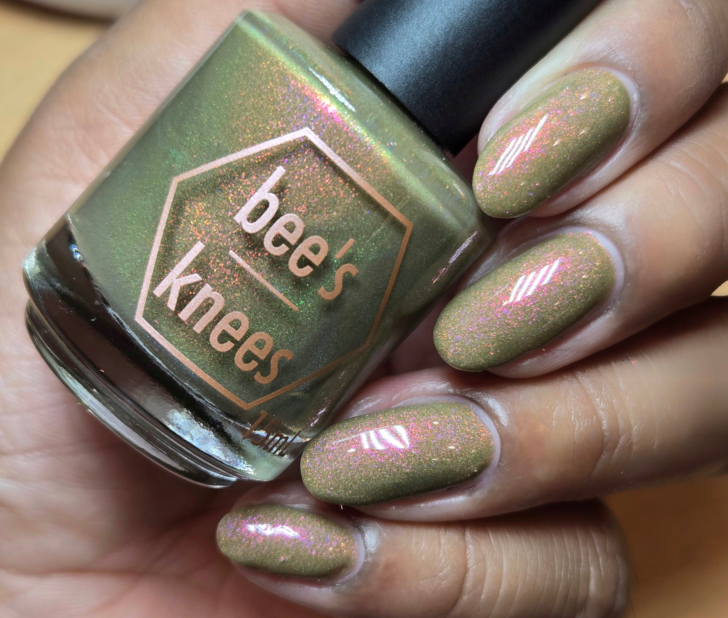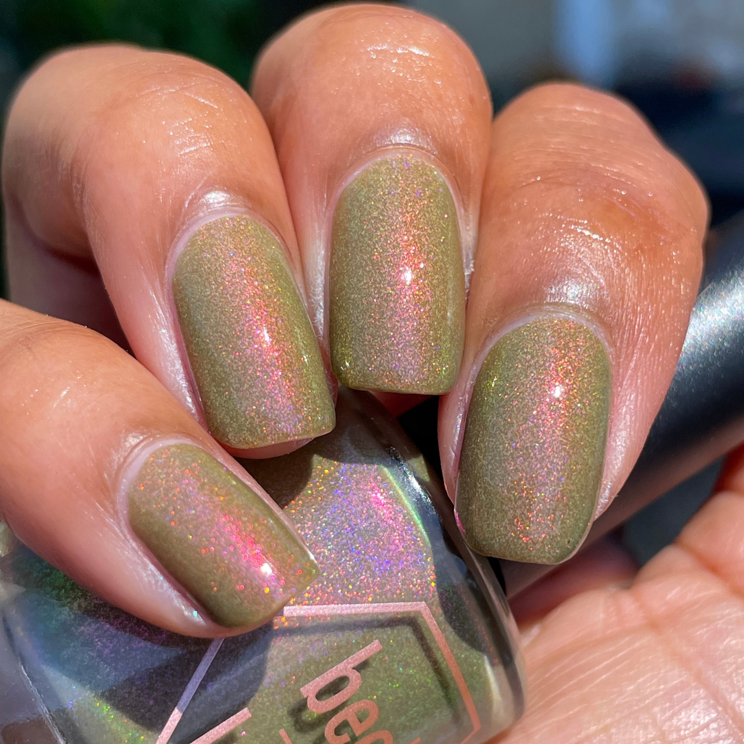 a dirty eggshell tan with pink to green shimmer and a subtle holo effect