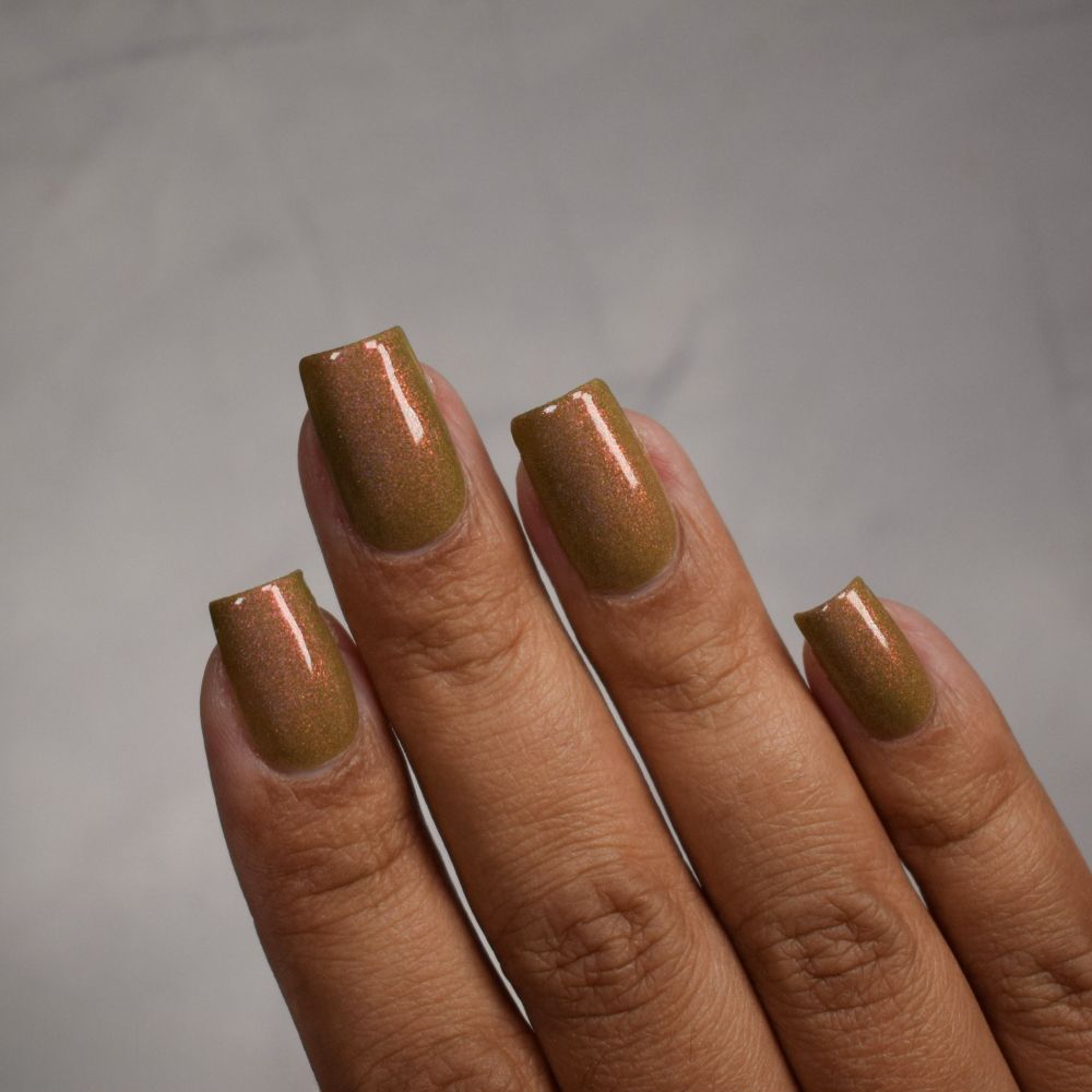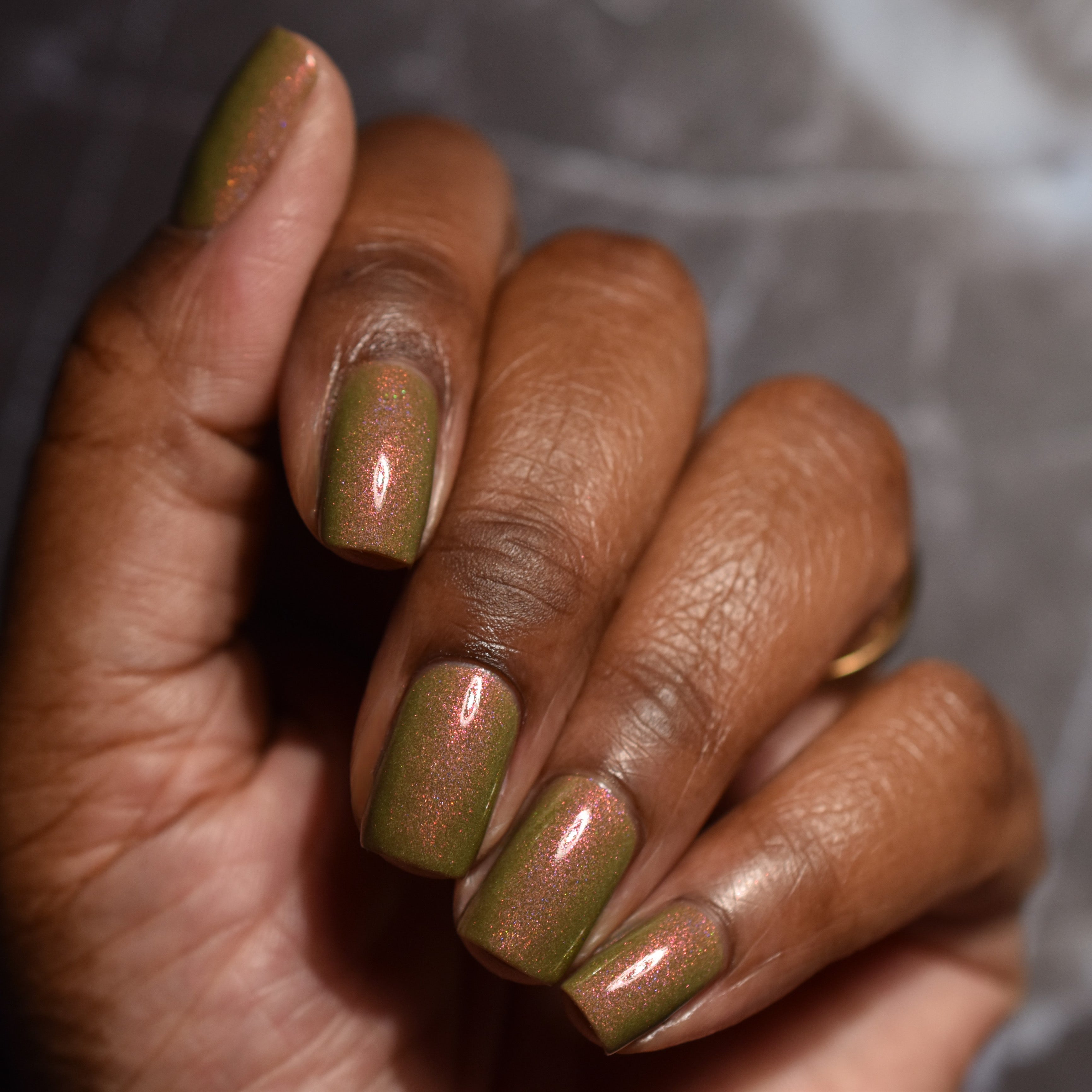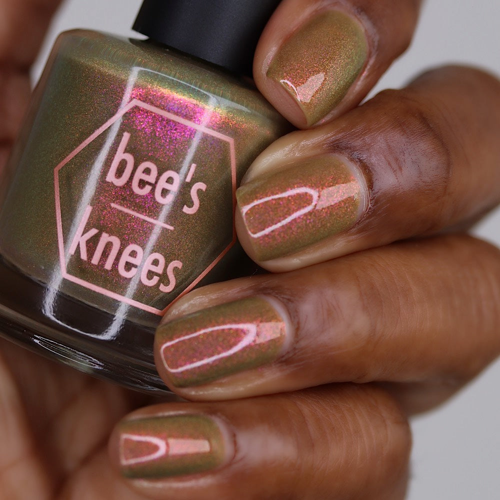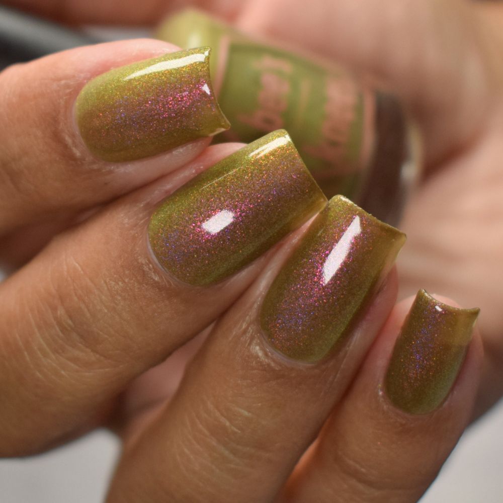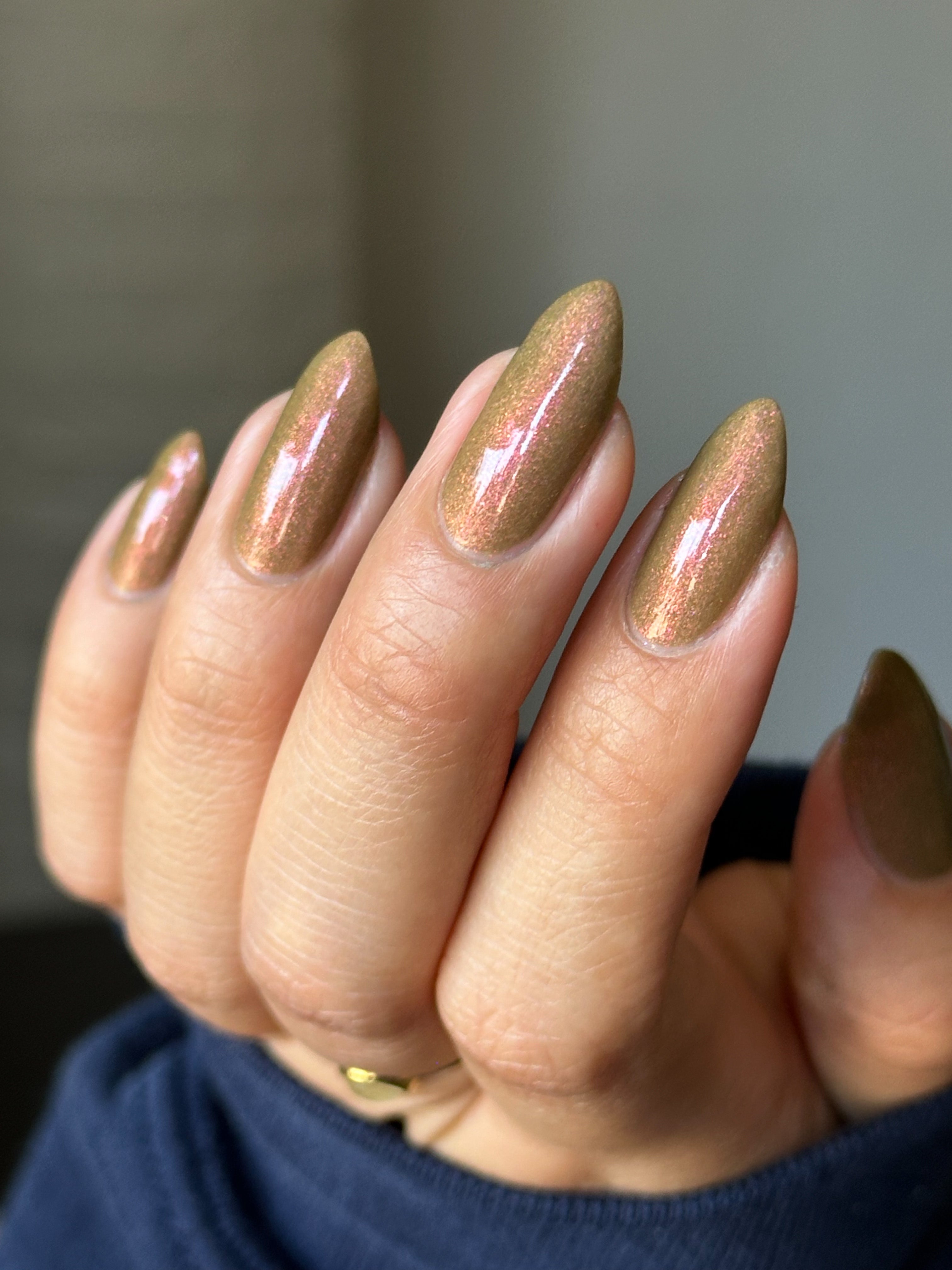 a dirty eggshell tan with pink to green shimmer and a subtle holo effect