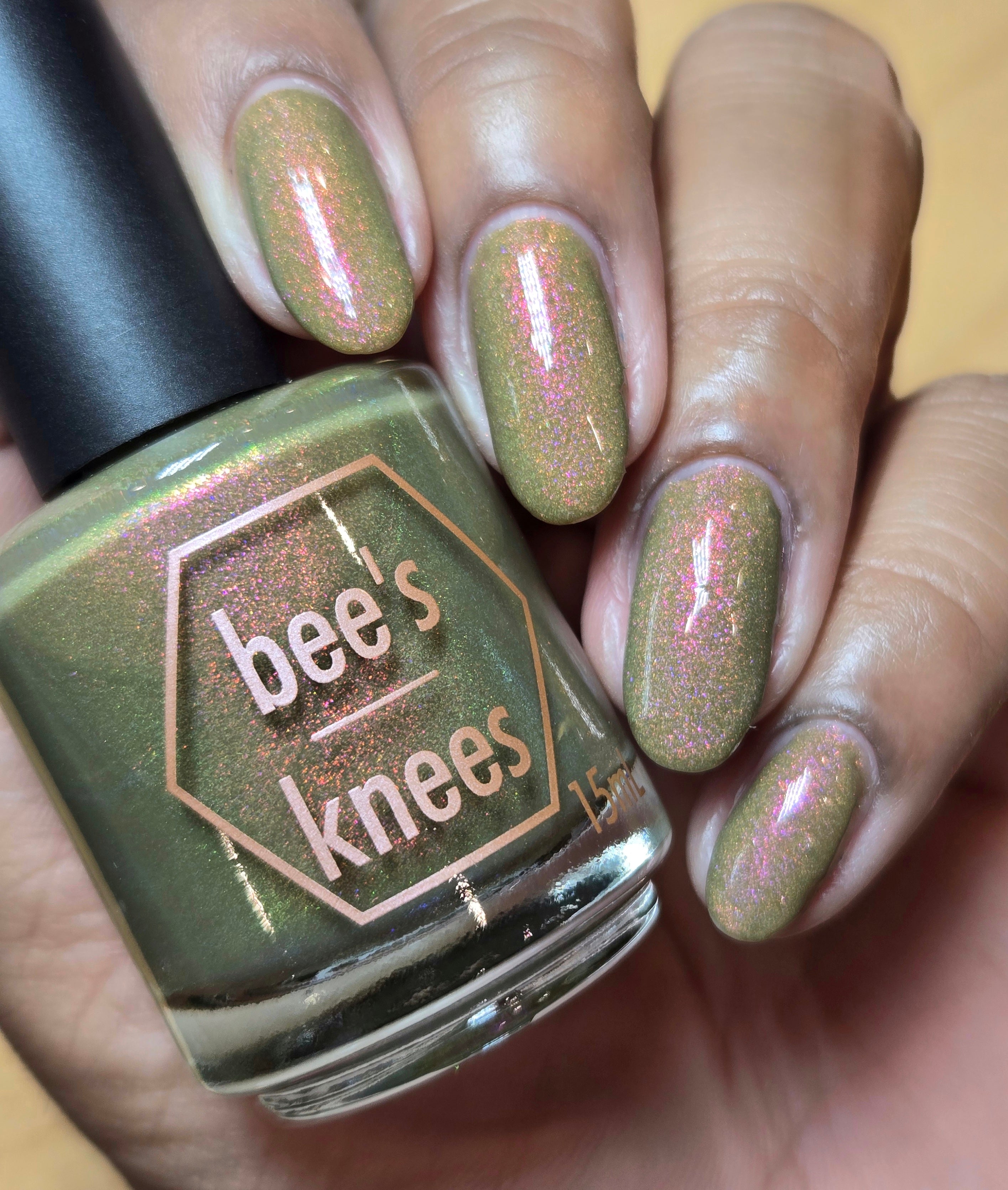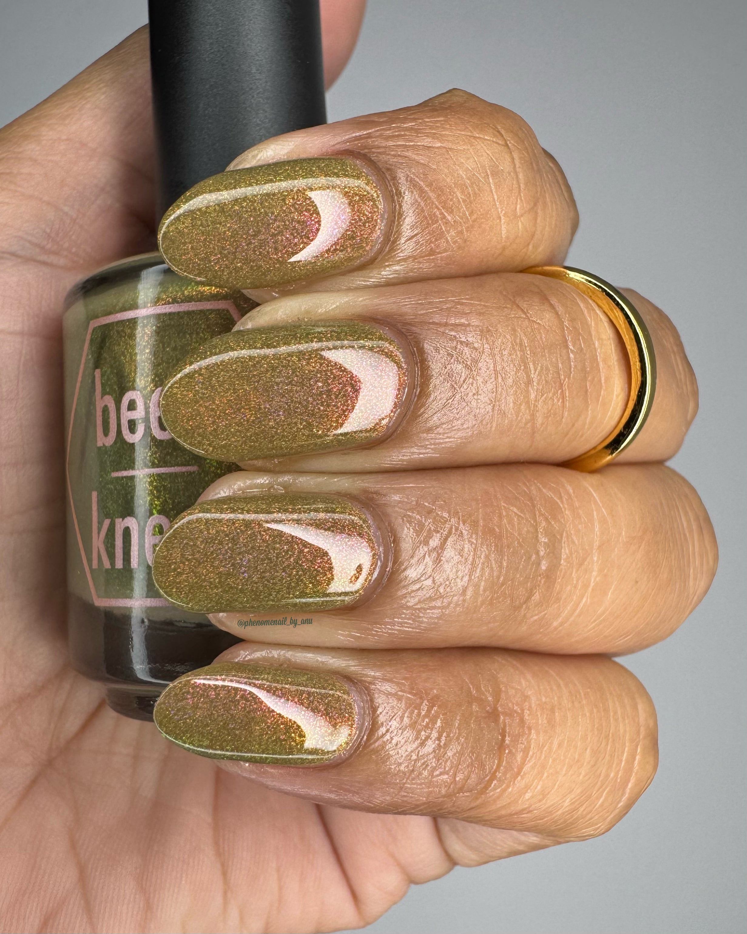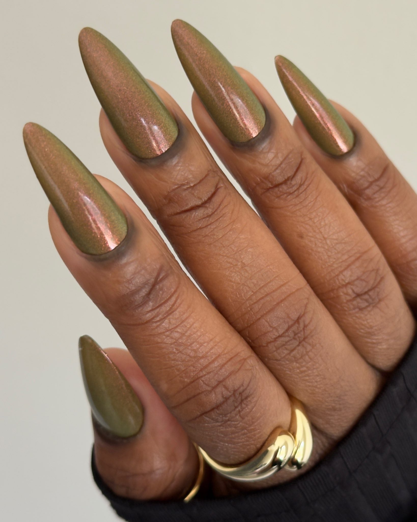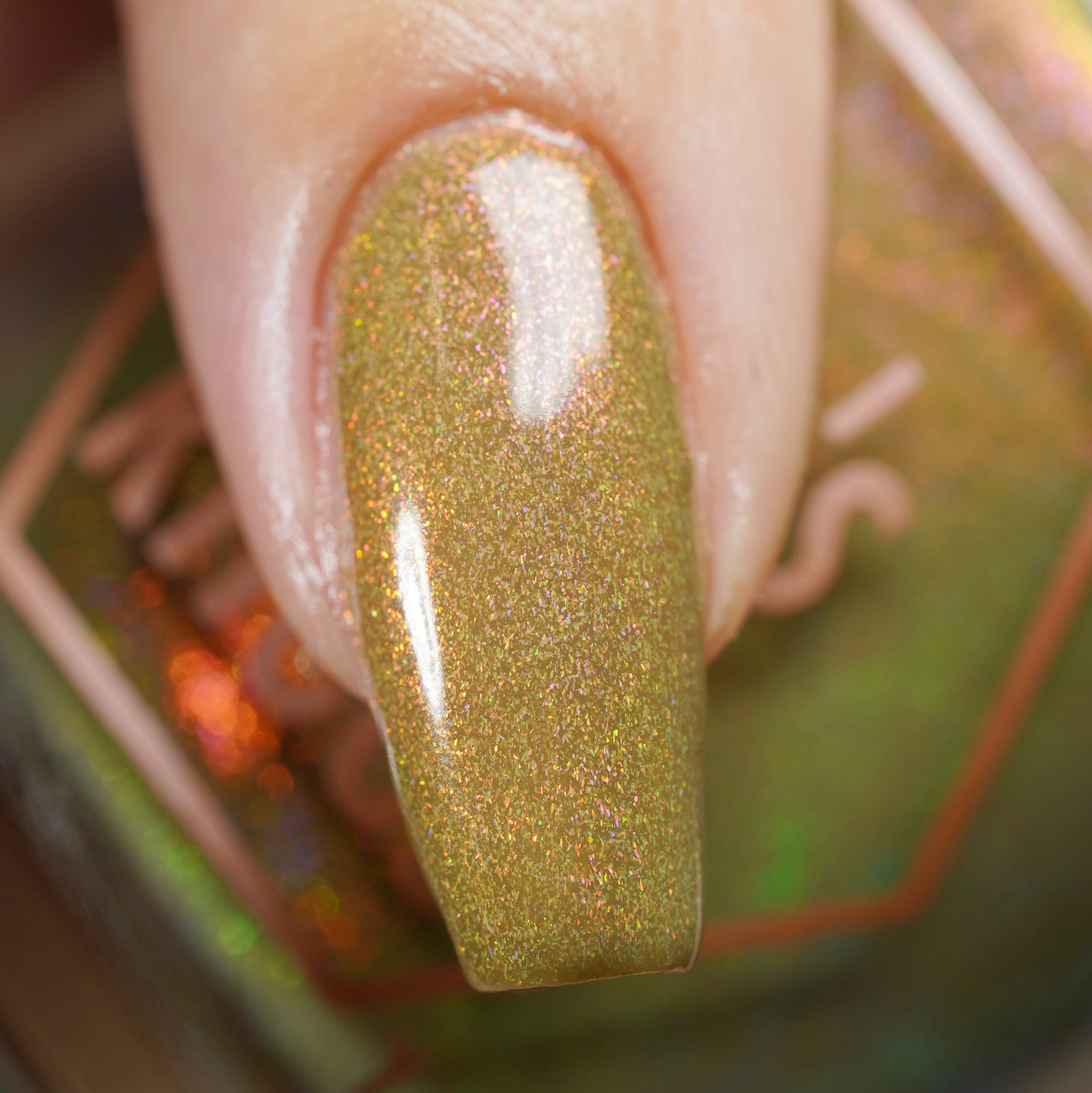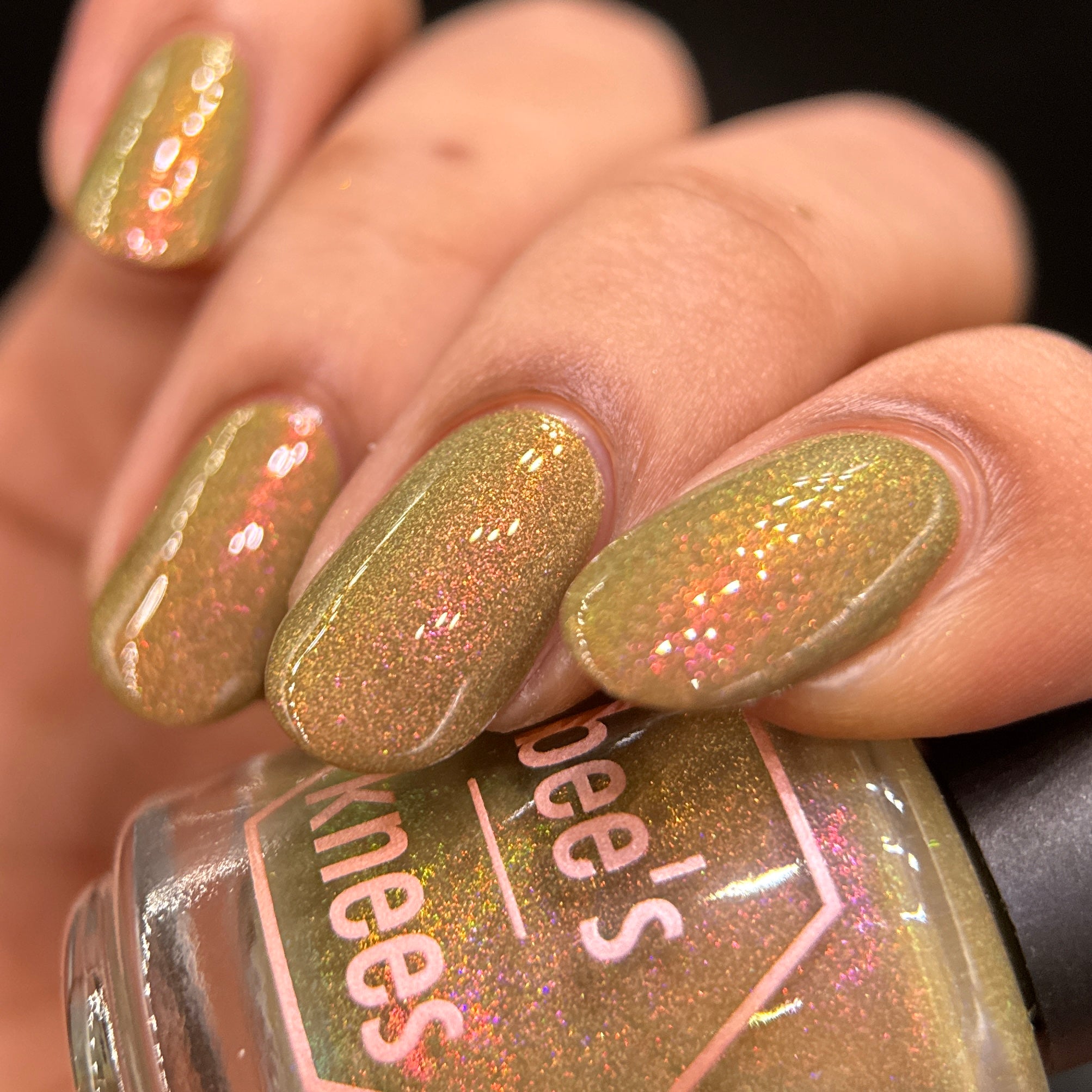 a dirty eggshell tan with pink to green shimmer and a subtle holo effect