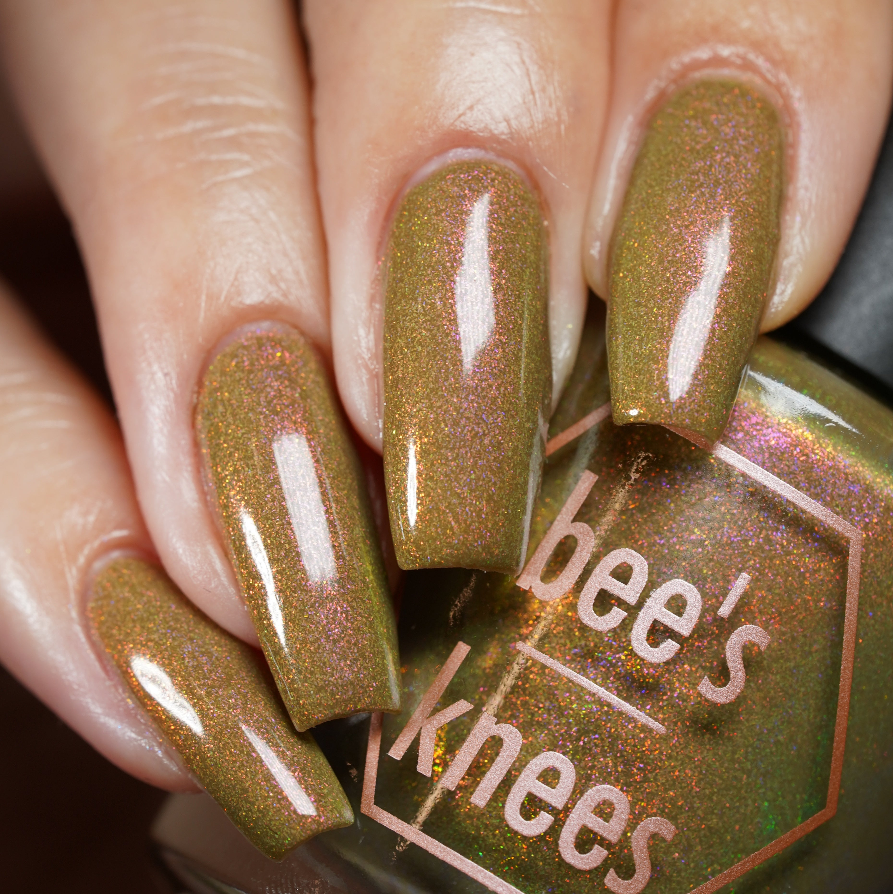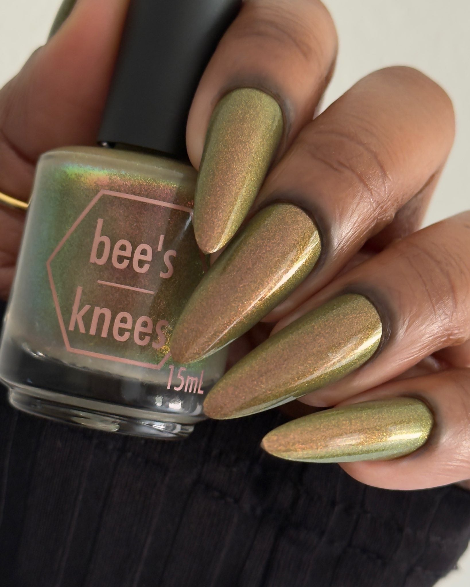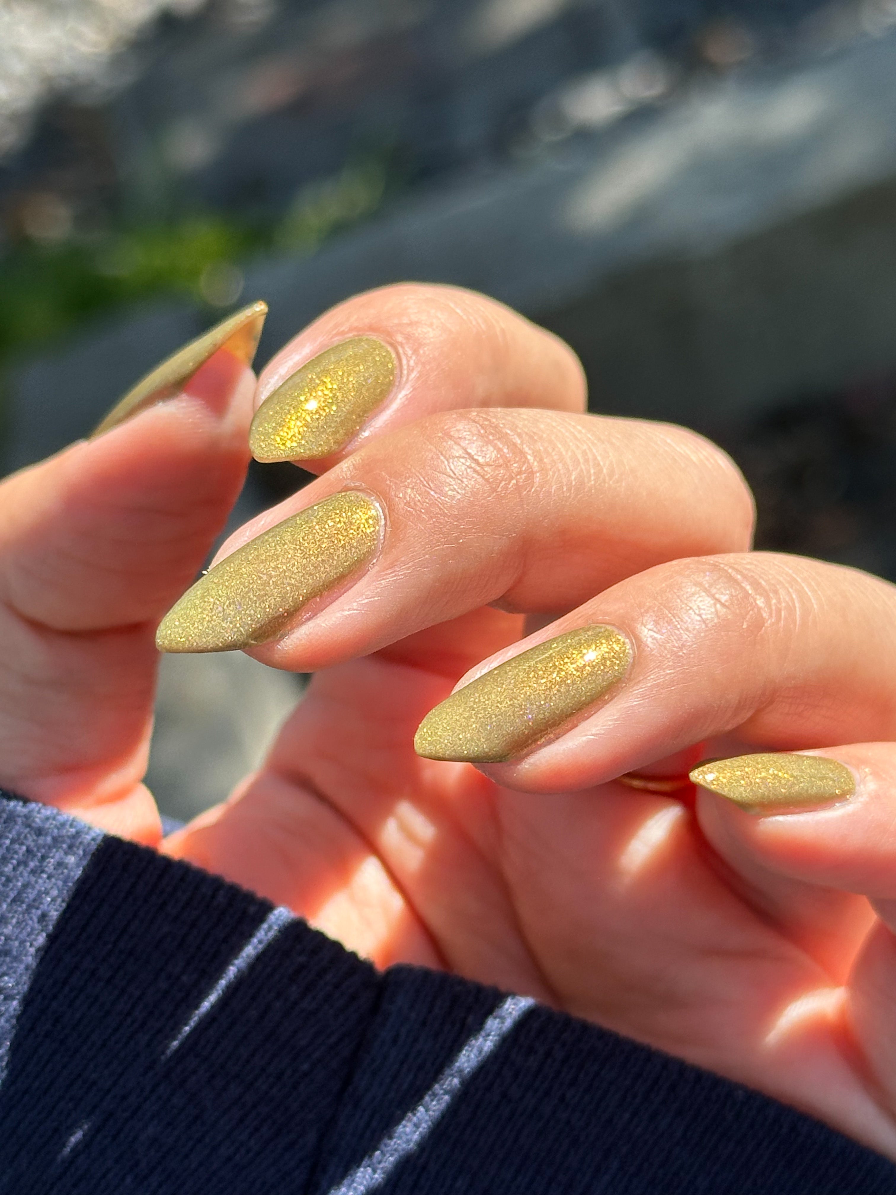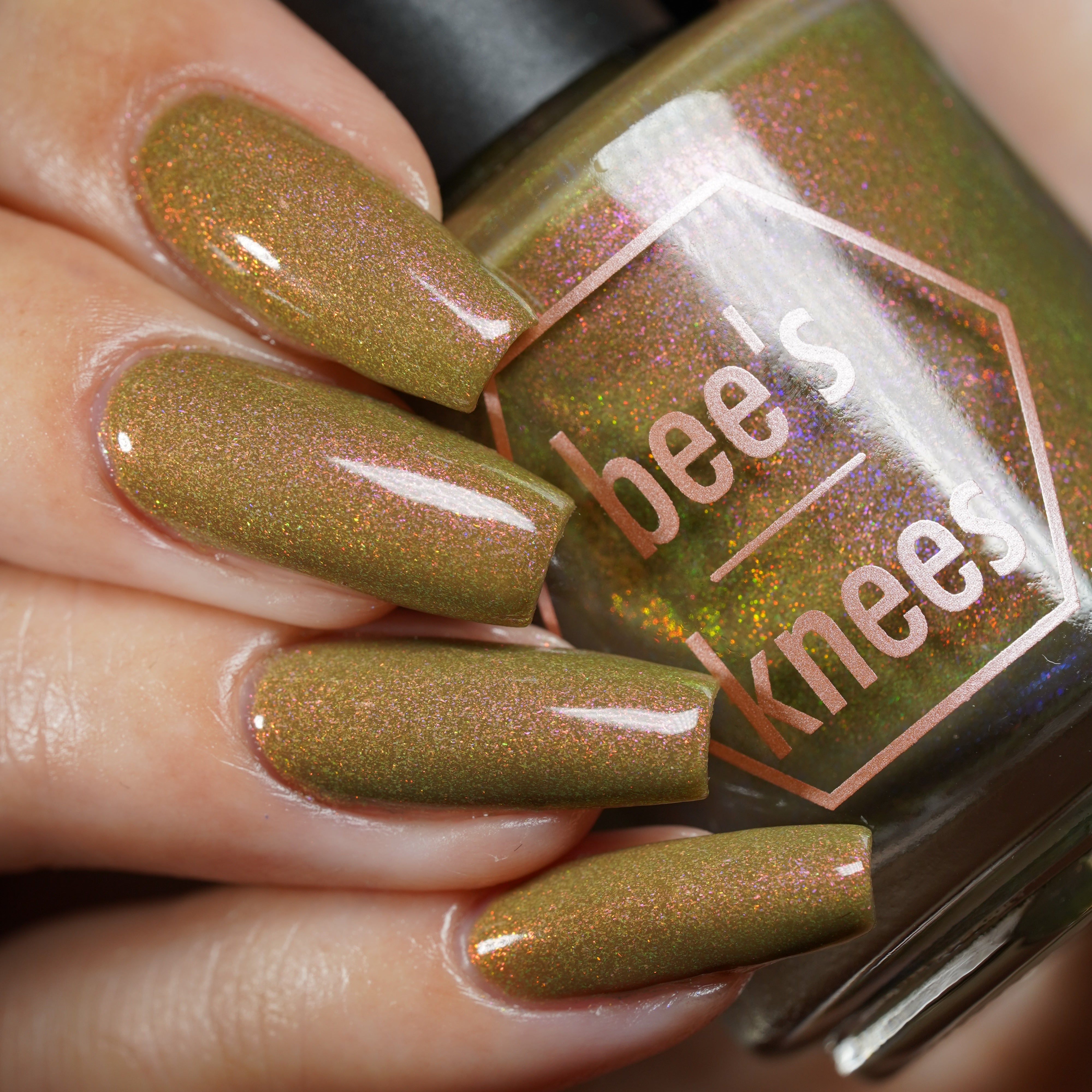 a dirty eggshell tan with pink to green shimmer and a subtle holo effect