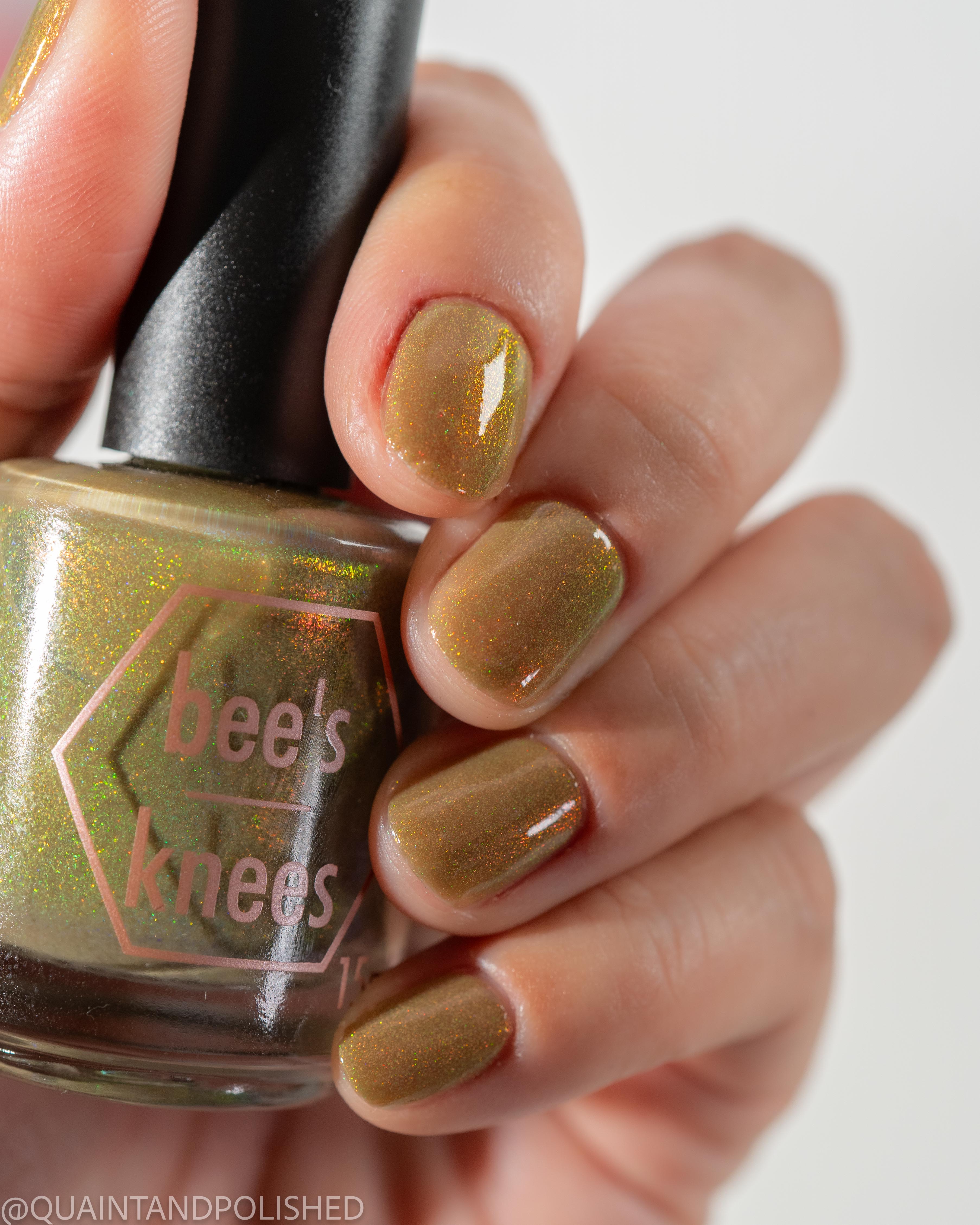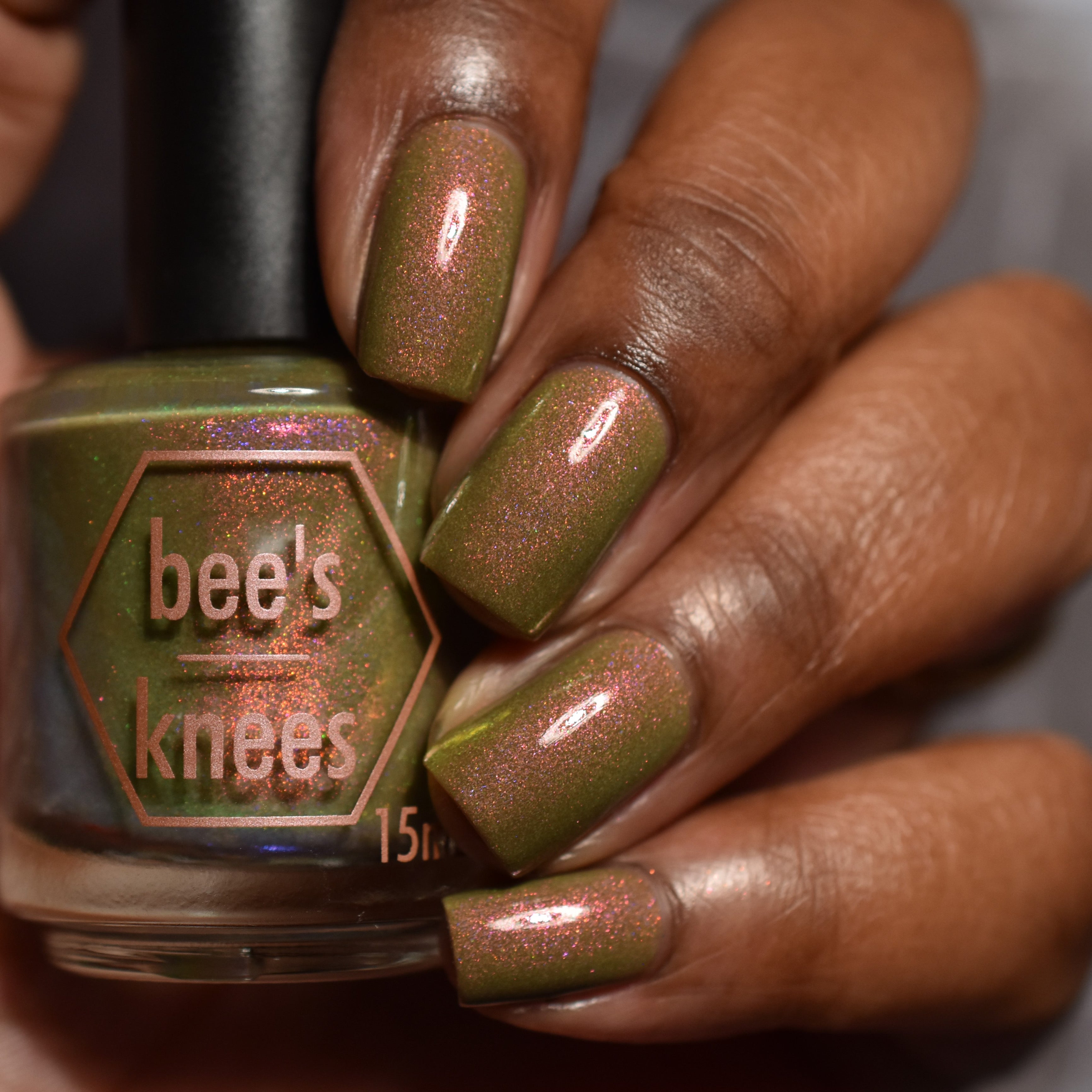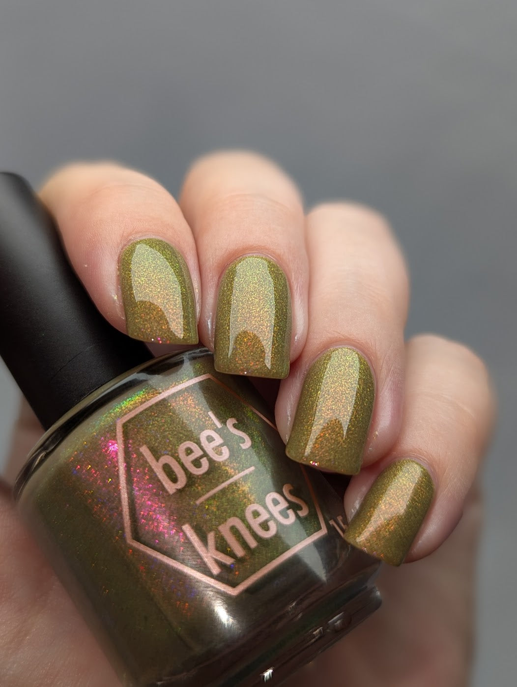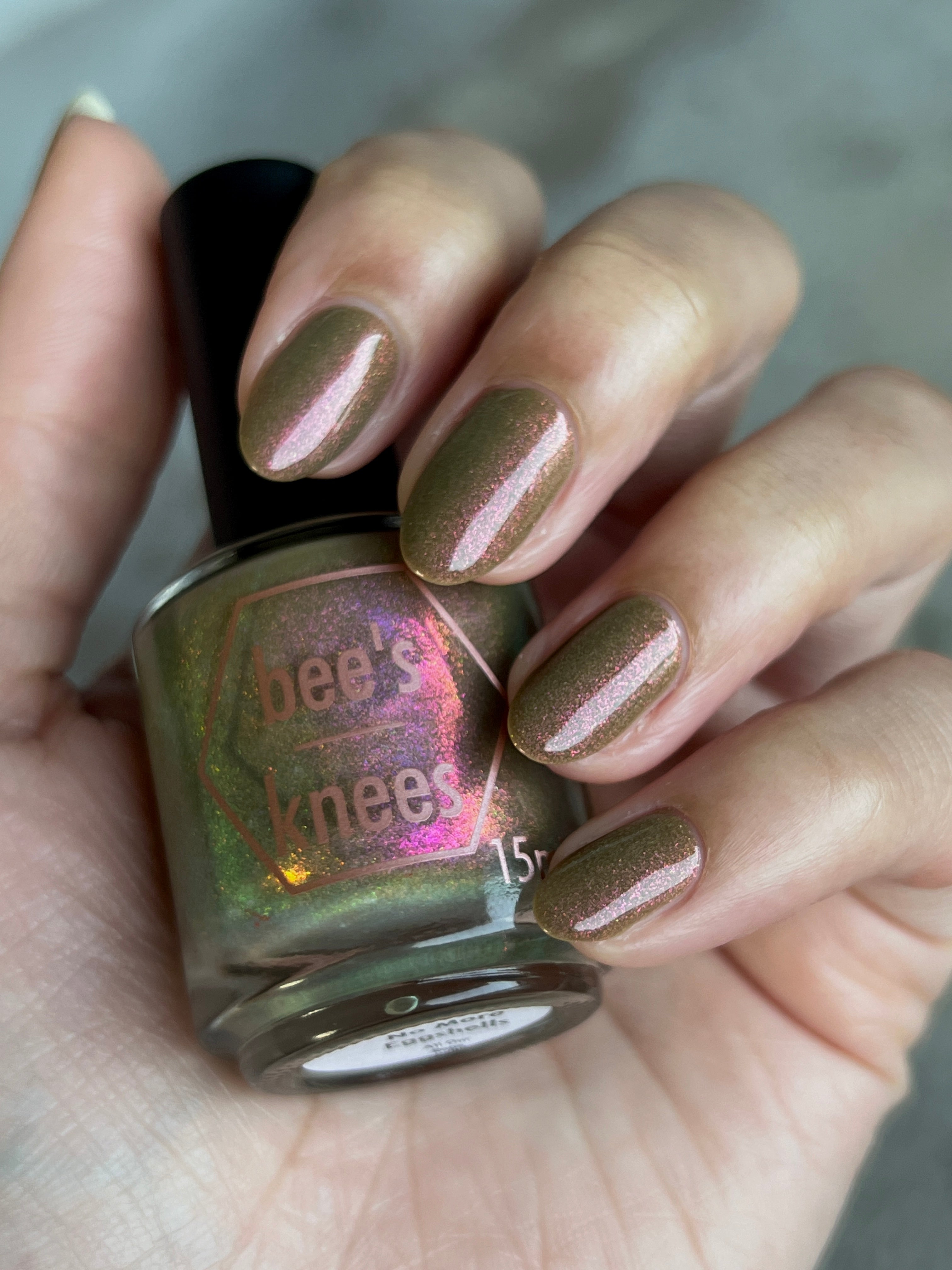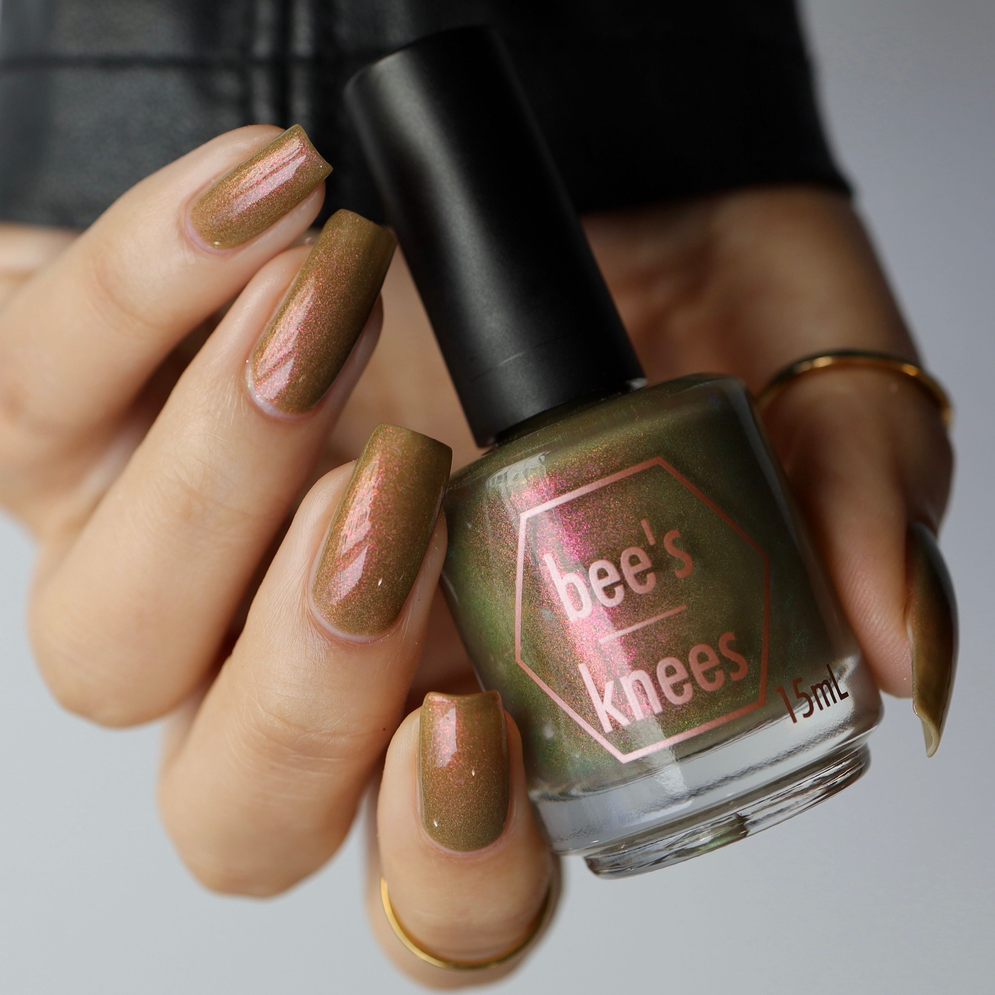 a dirty eggshell tan with pink to green shimmer and a subtle holo effect