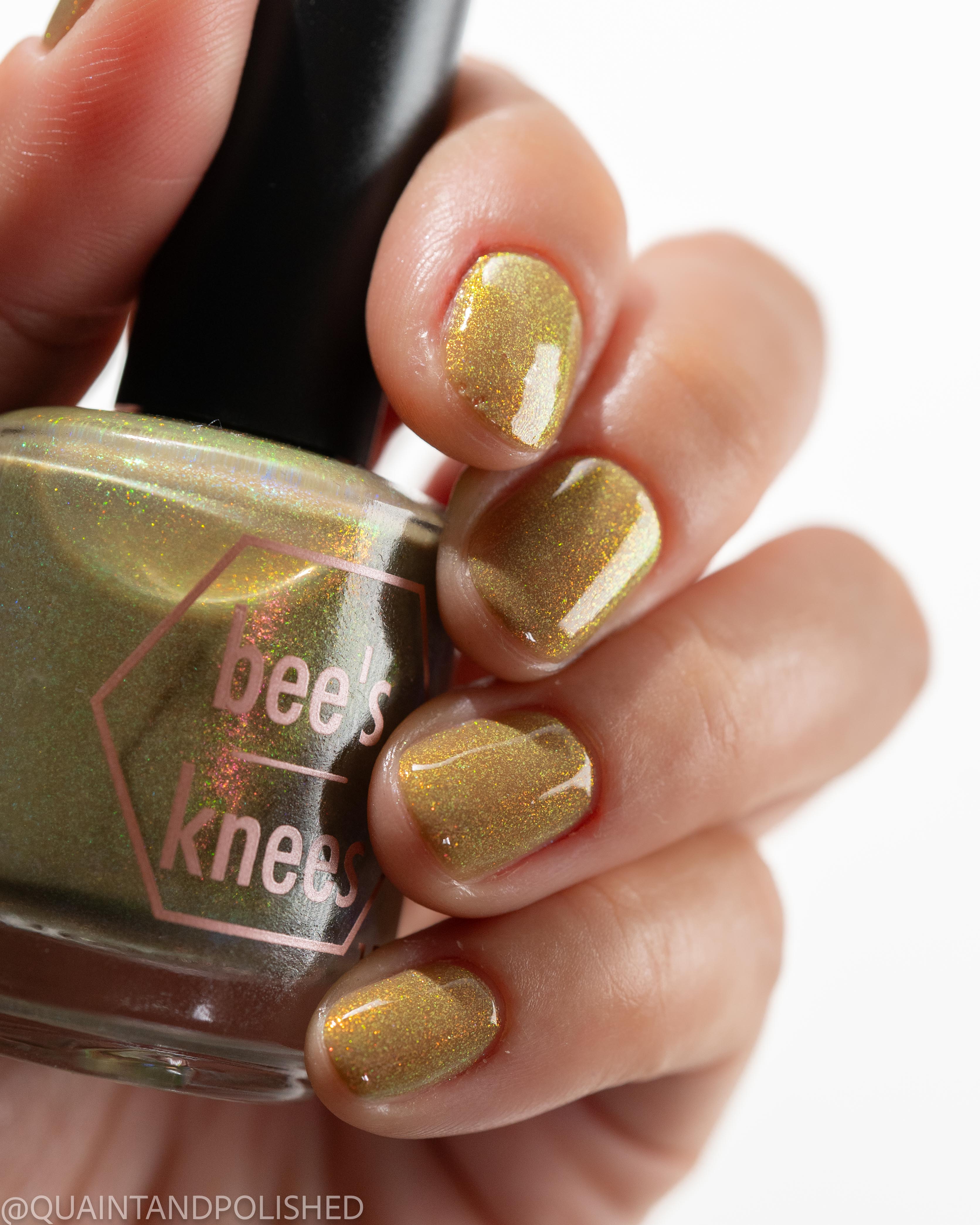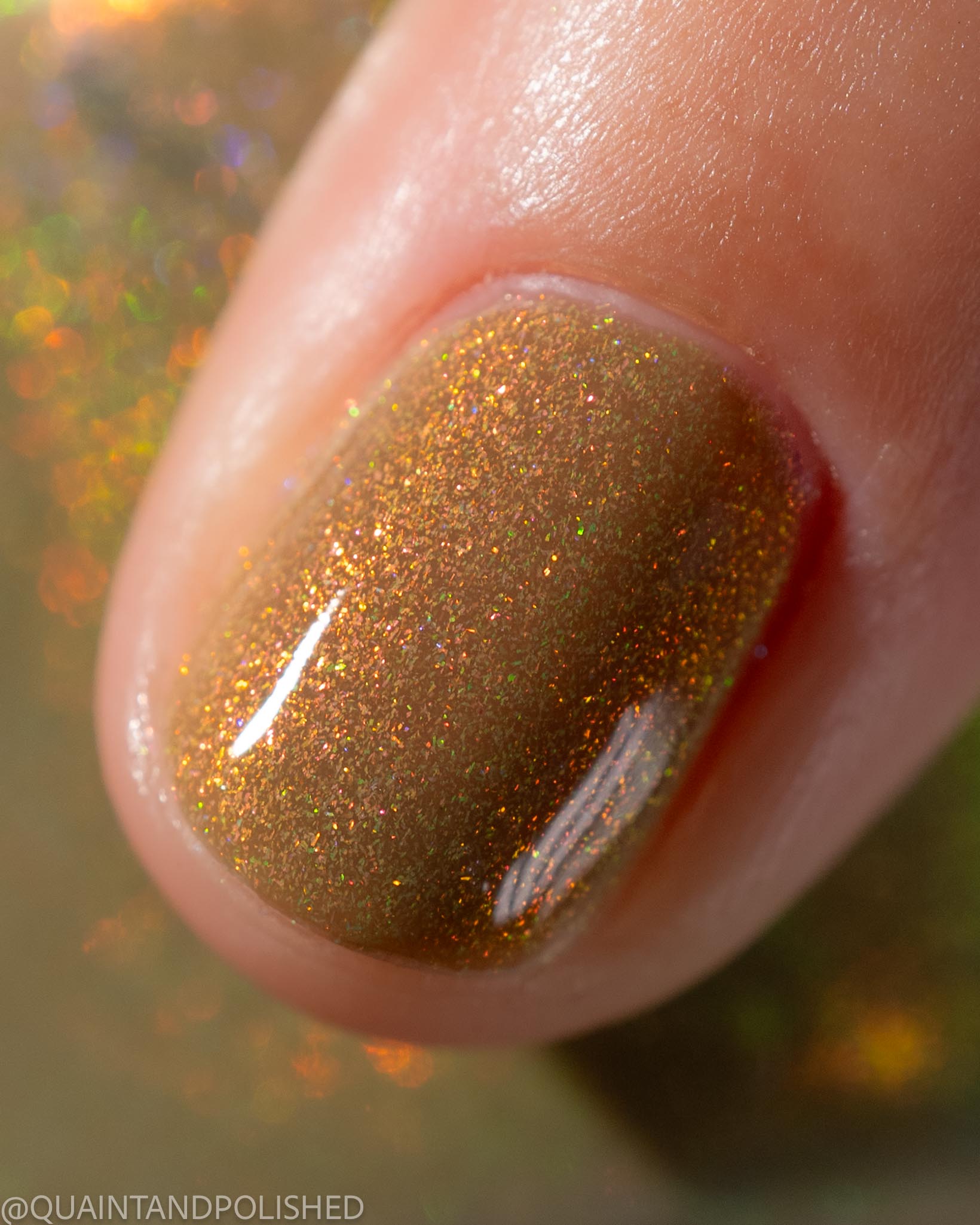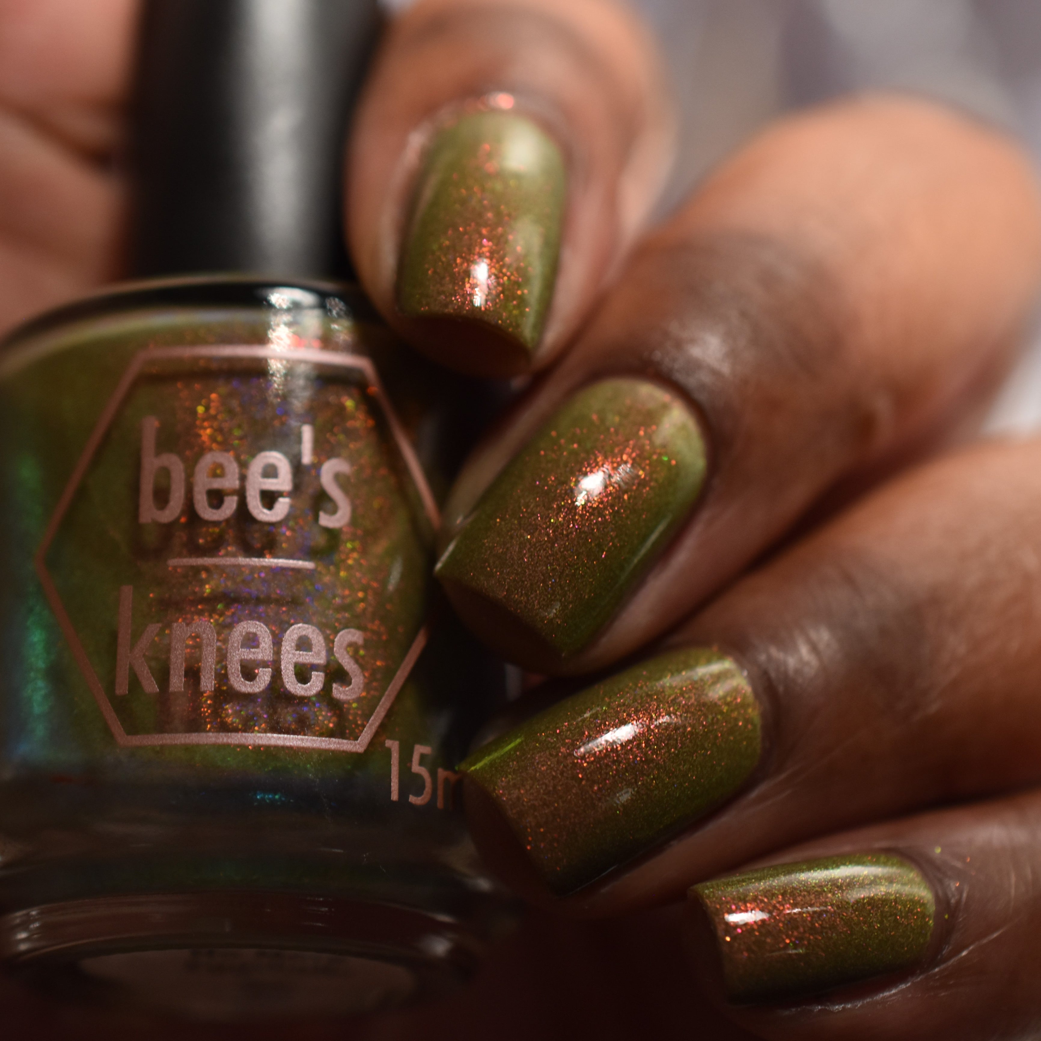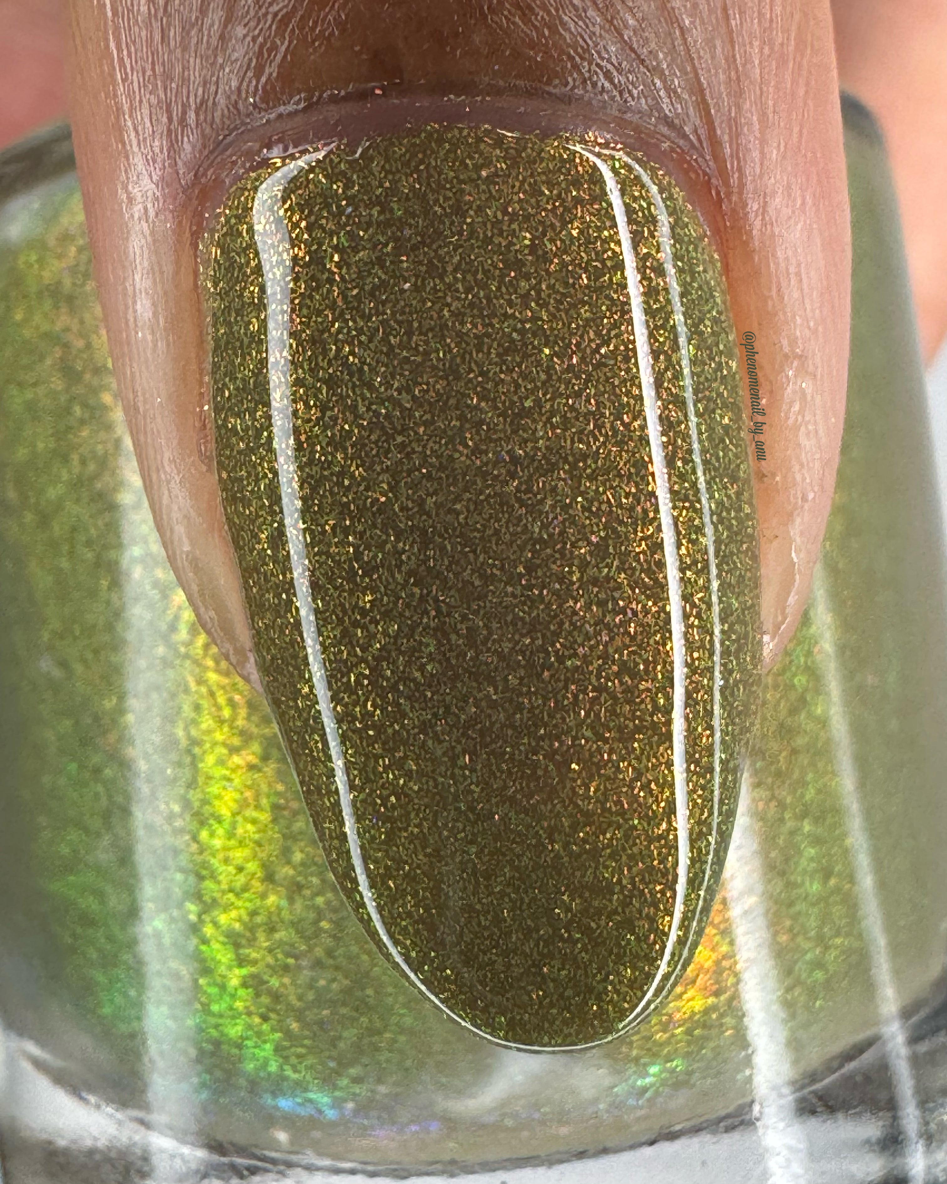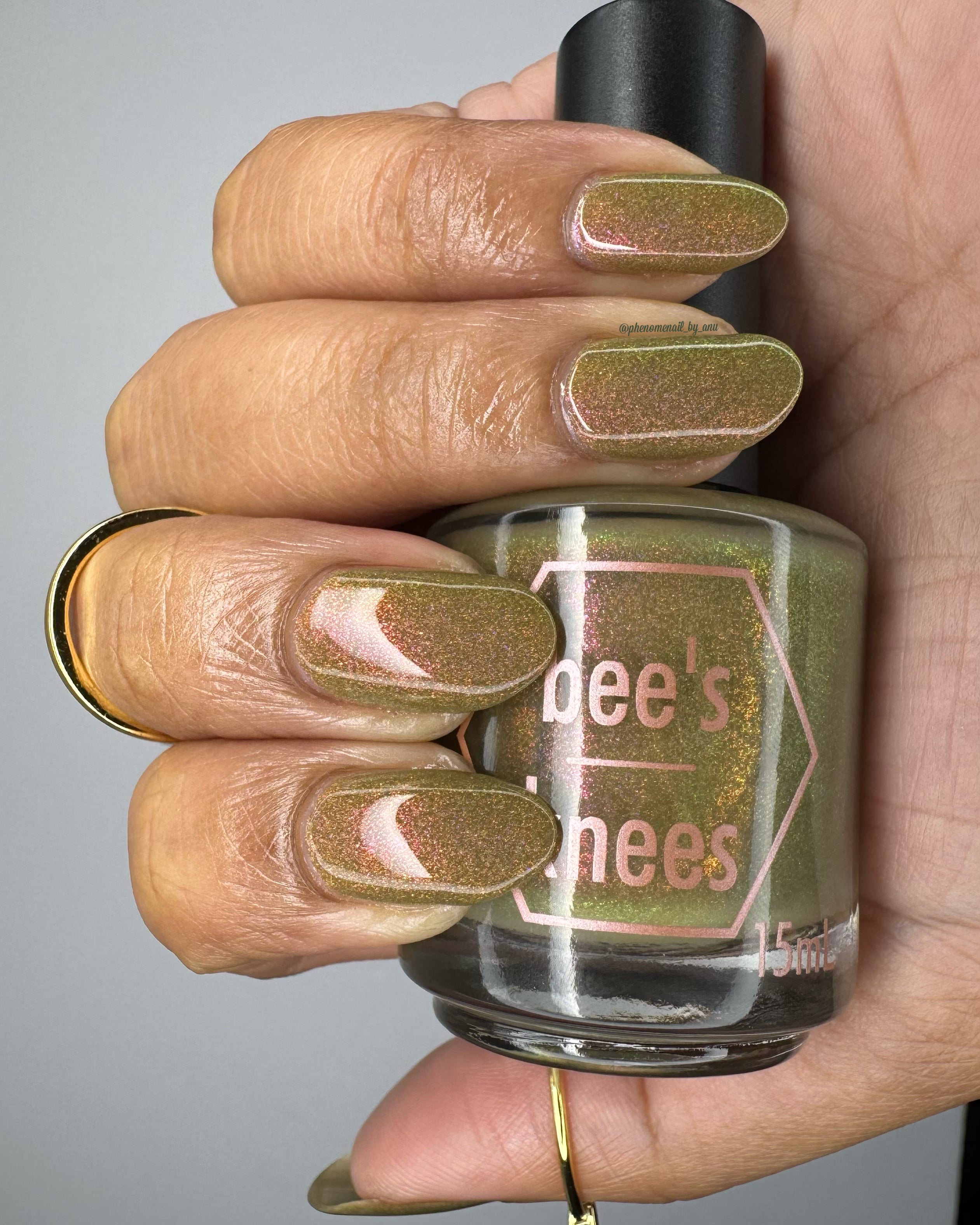 a dirty eggshell tan with pink to green shimmer and a subtle holo effect