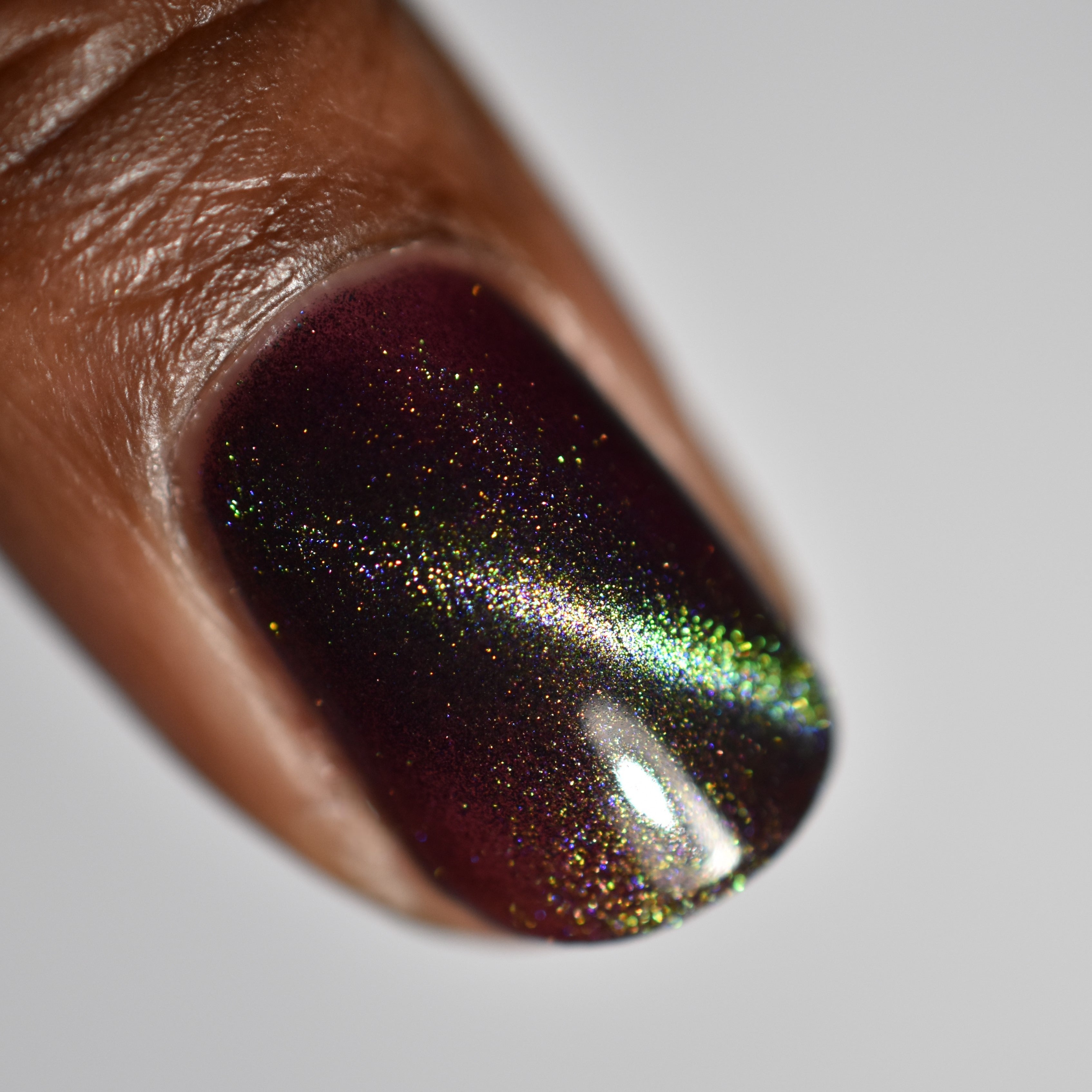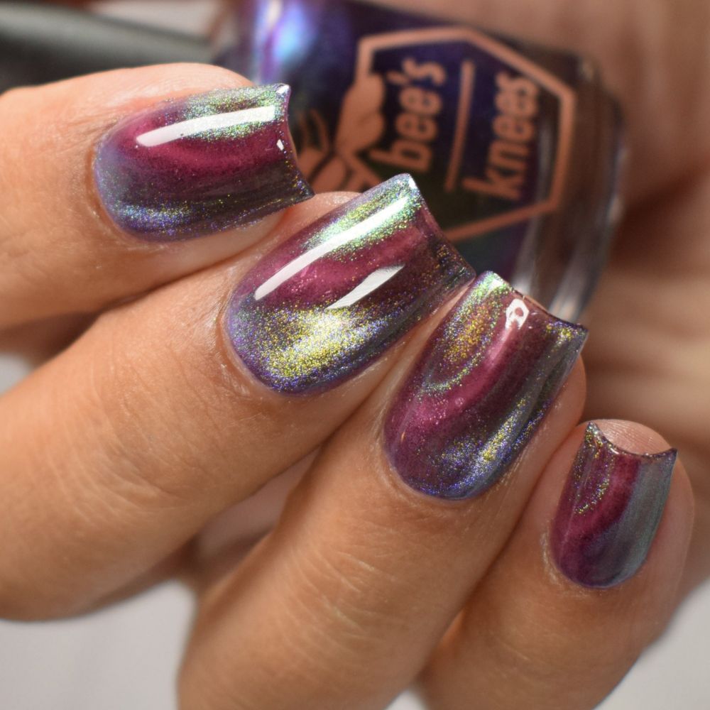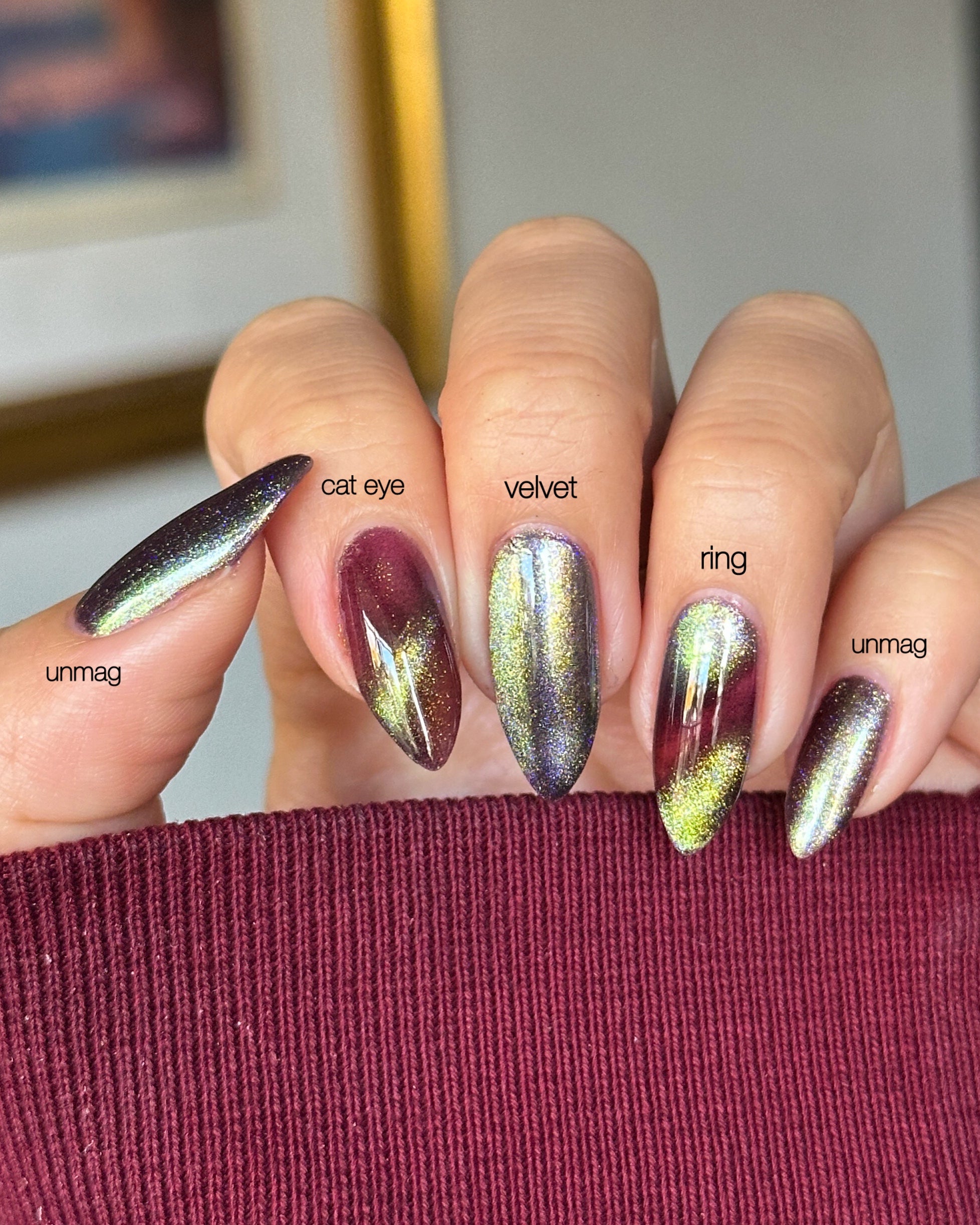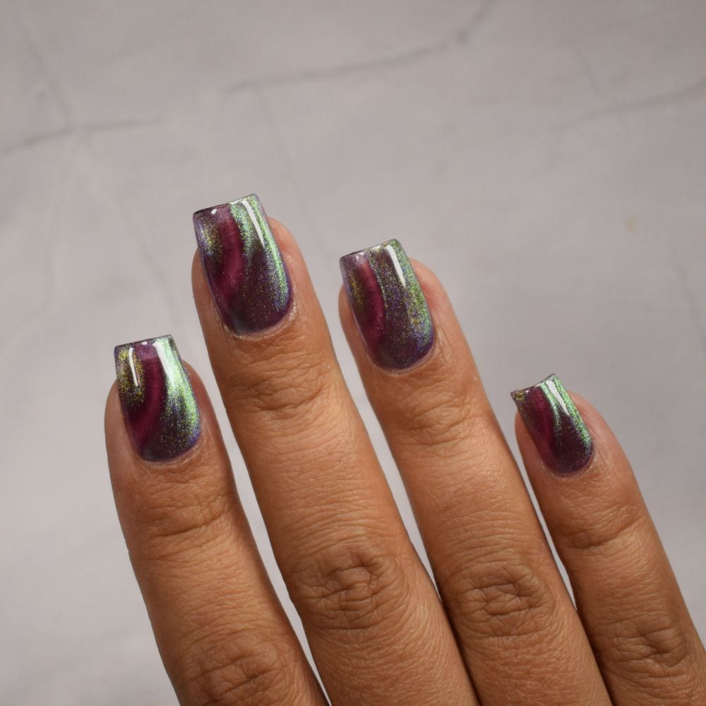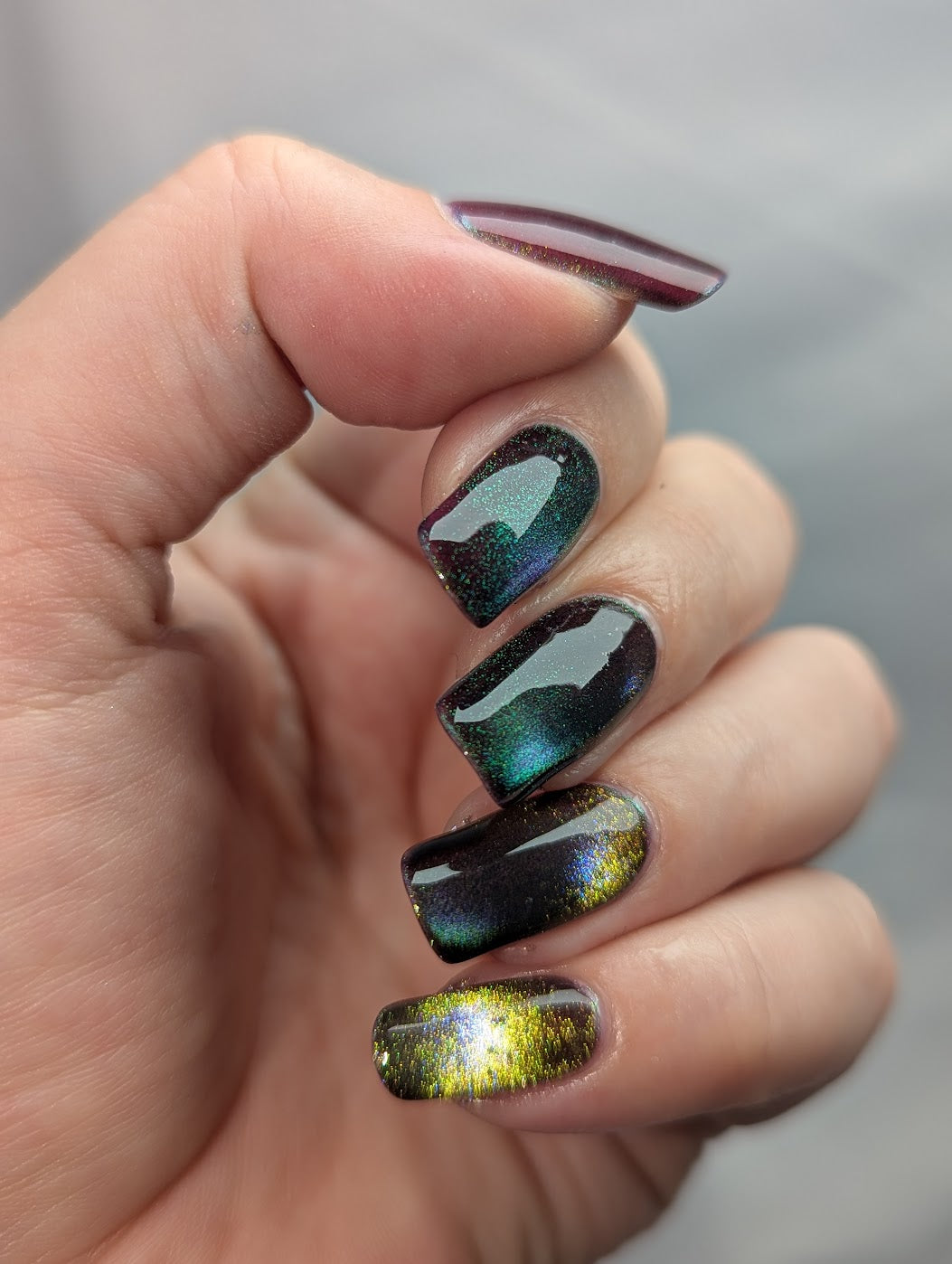 imperial purple with a mosaic magnetic that upon first glance looks like an ordinary green multichrome. When magnetized you will see both a bright green as well as a powder blue magnetic pigment