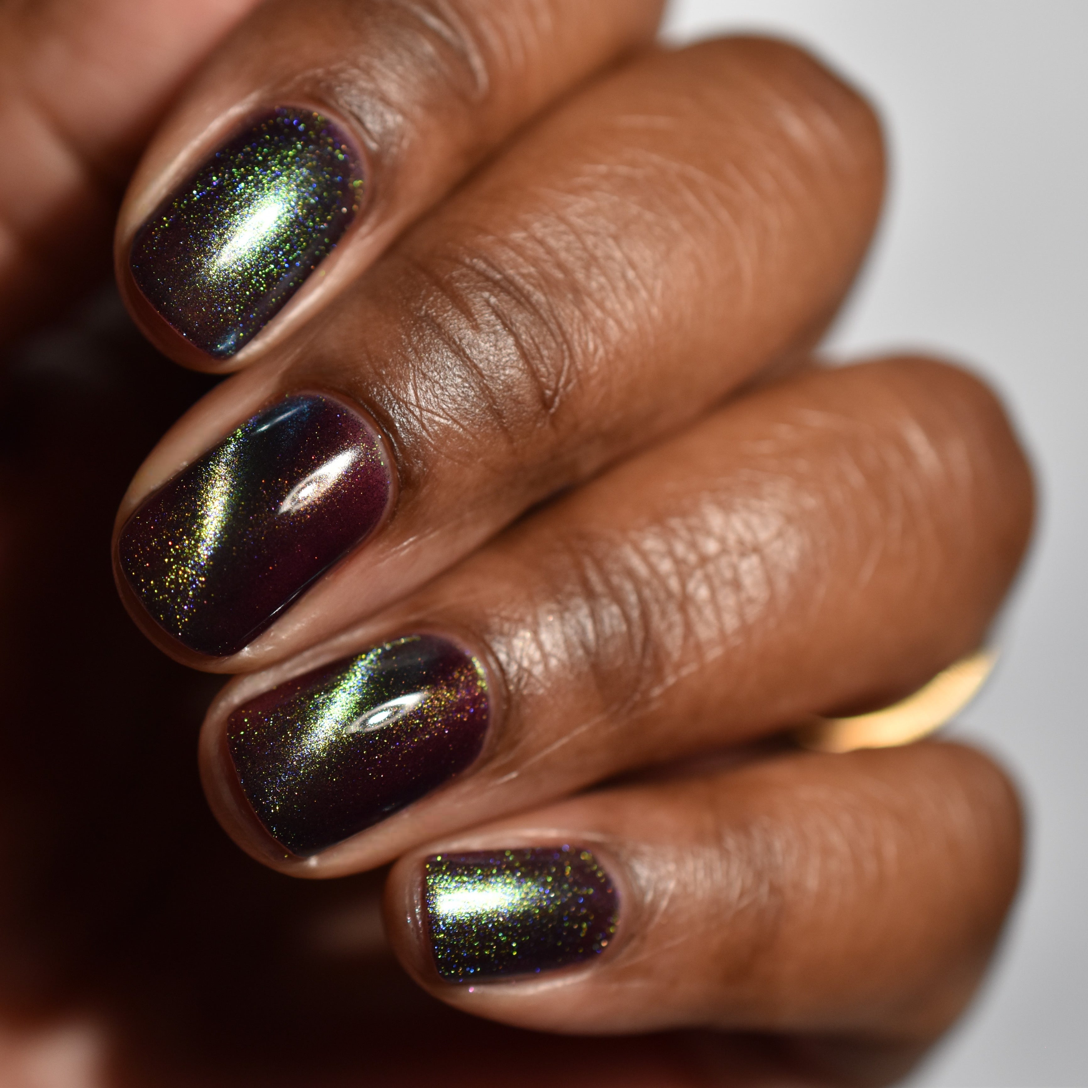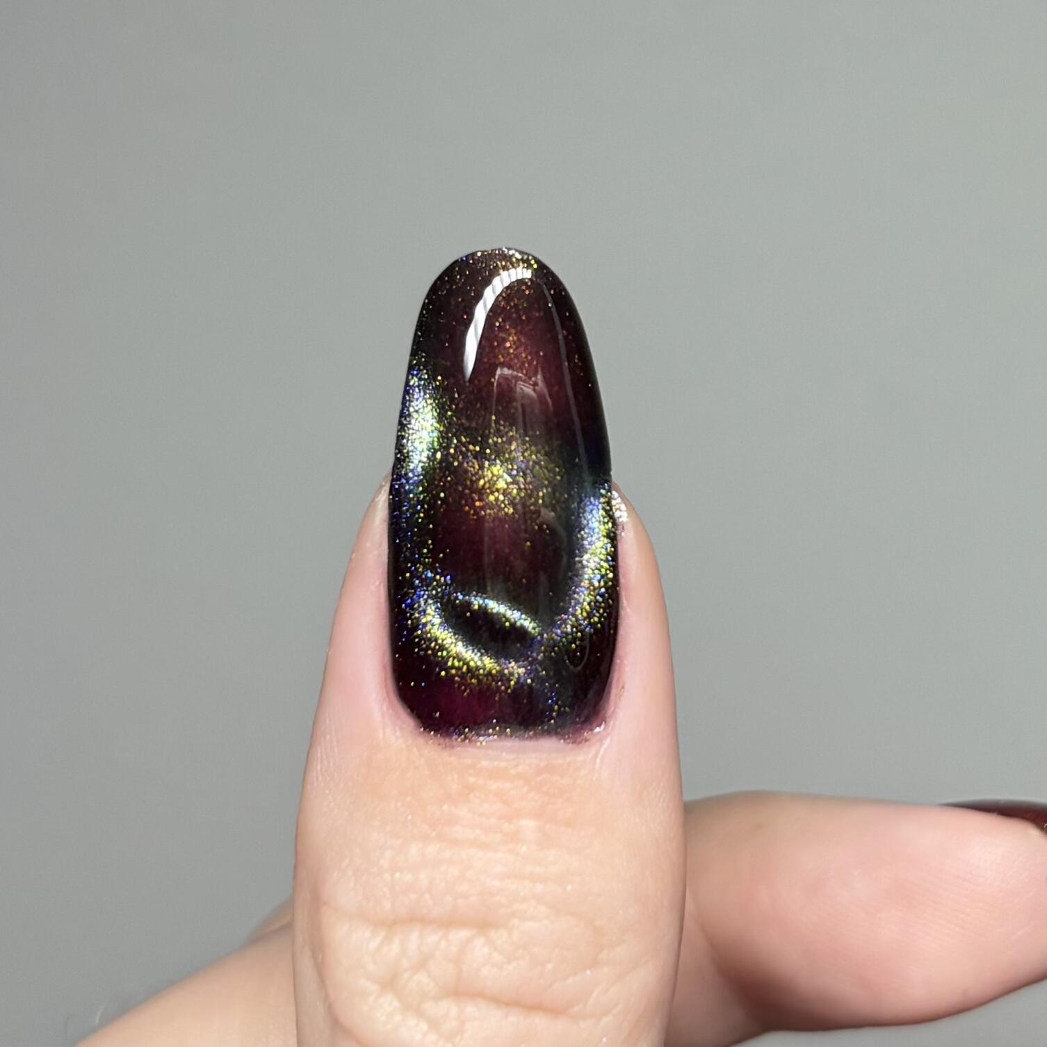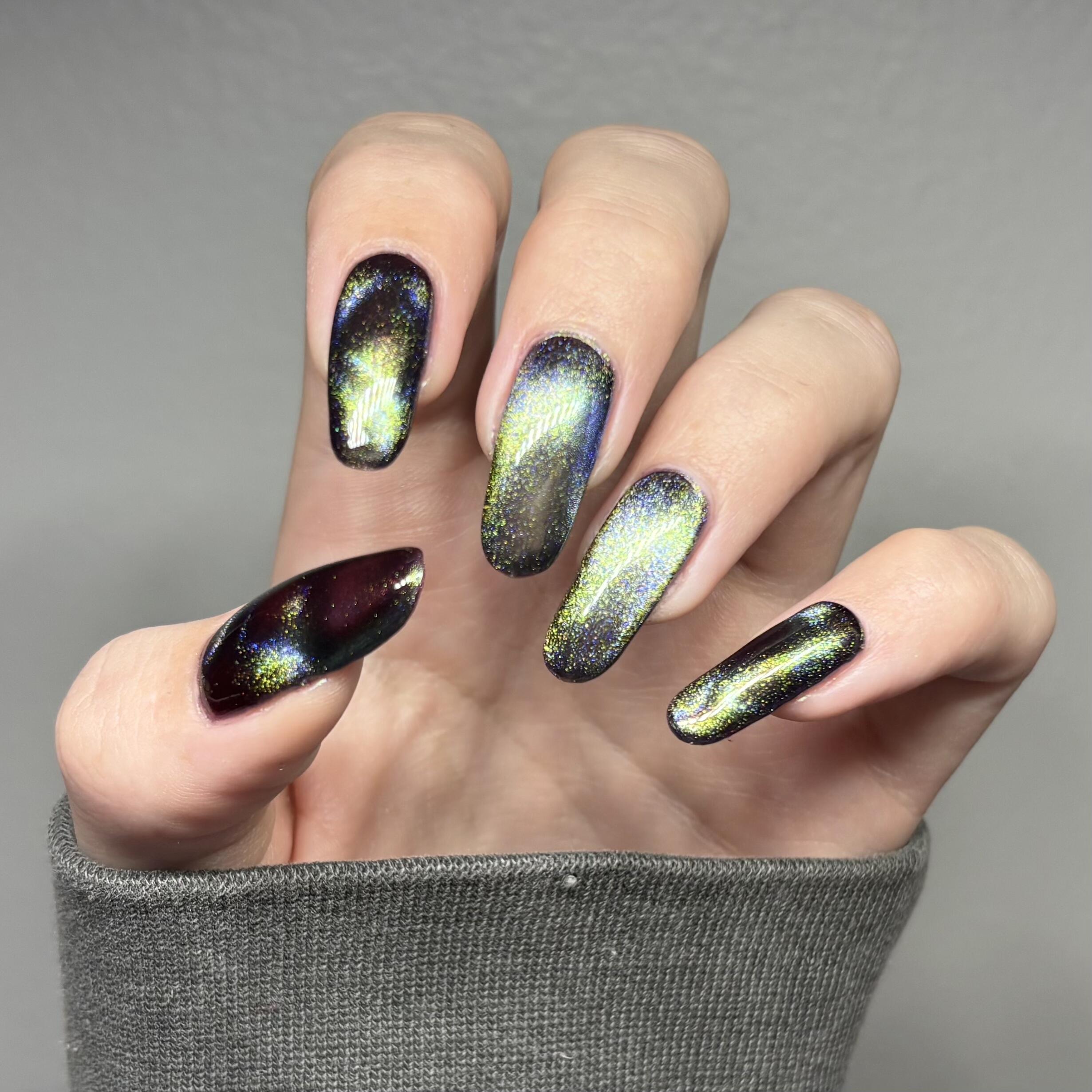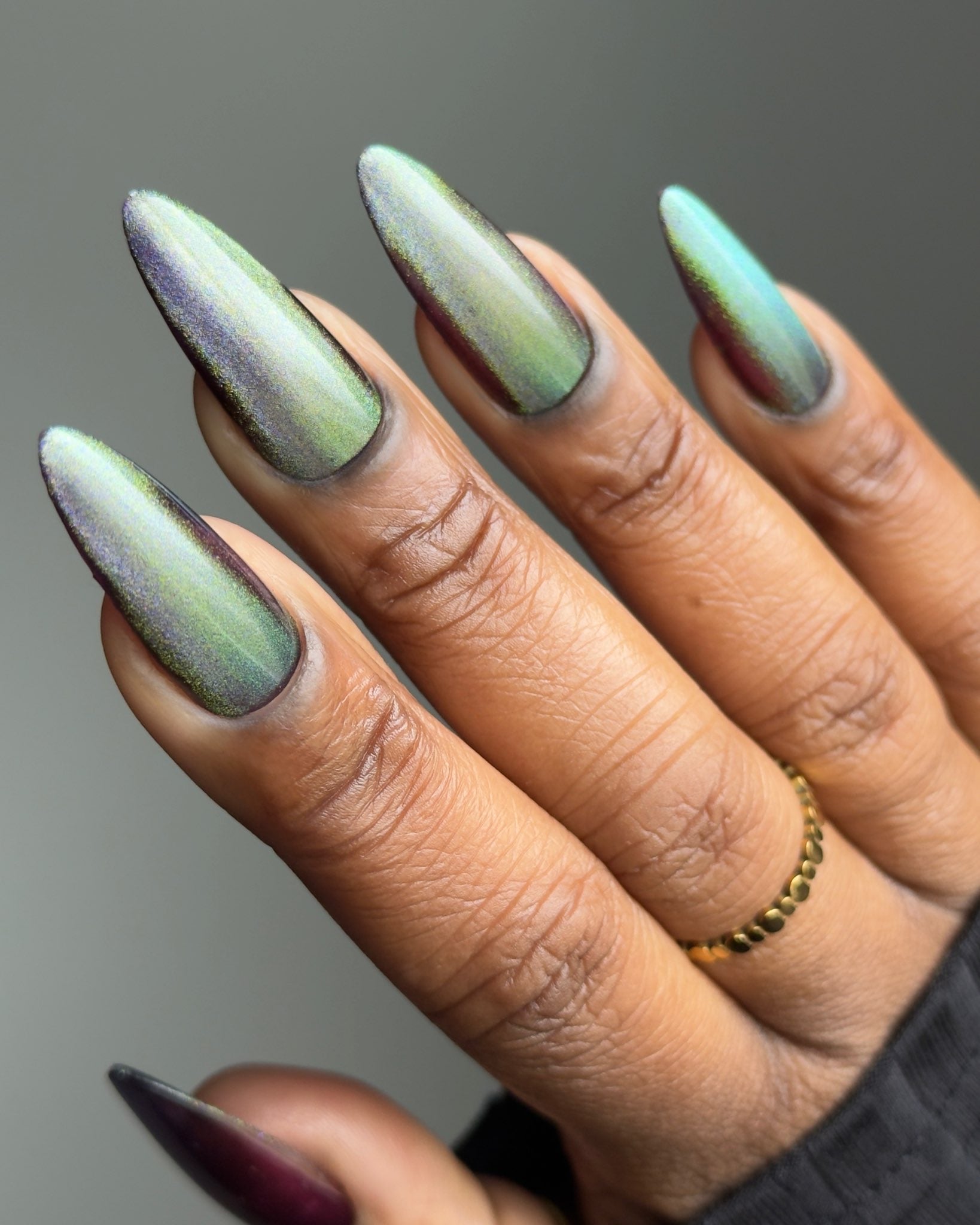 imperial purple with a mosaic magnetic that upon first glance looks like an ordinary green multichrome. When magnetized you will see both a bright green as well as a powder blue magnetic pigment