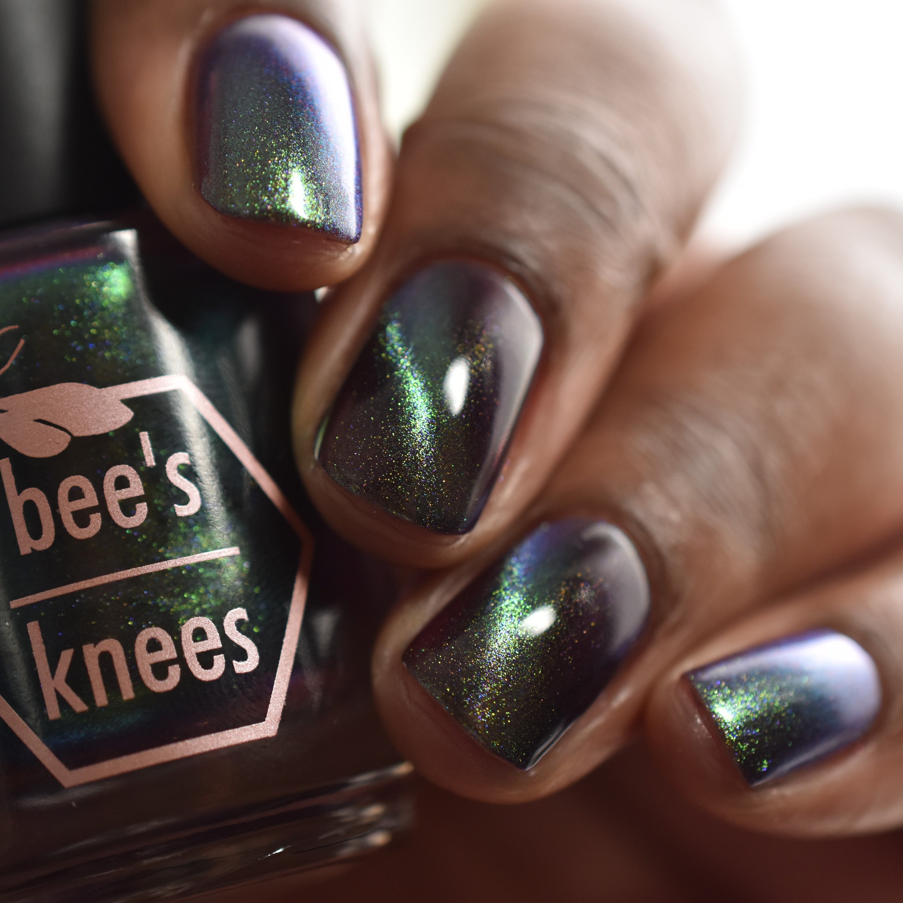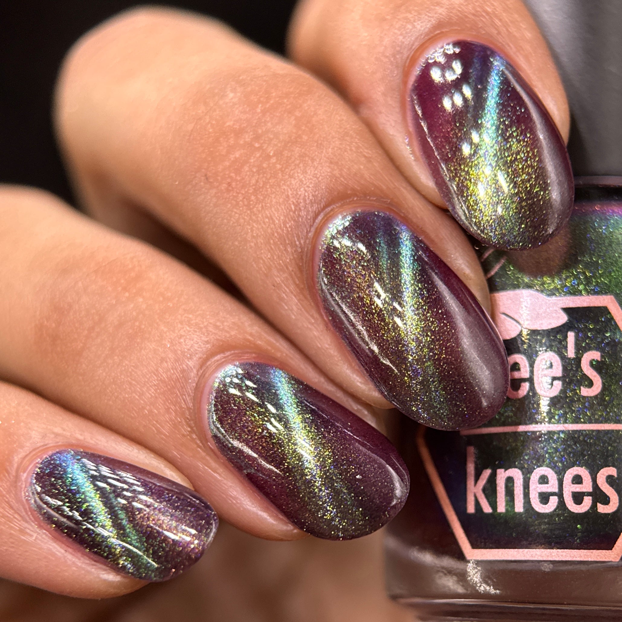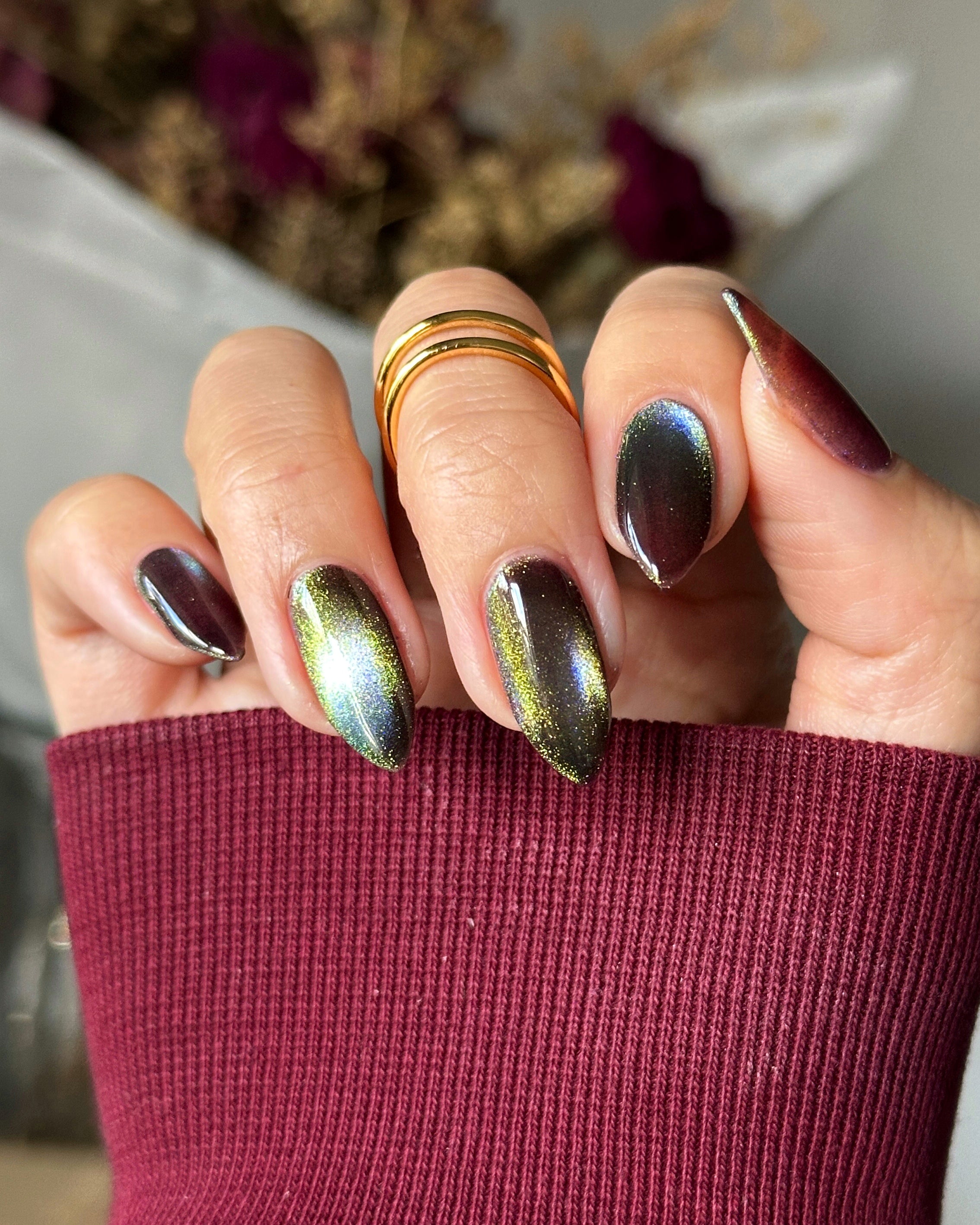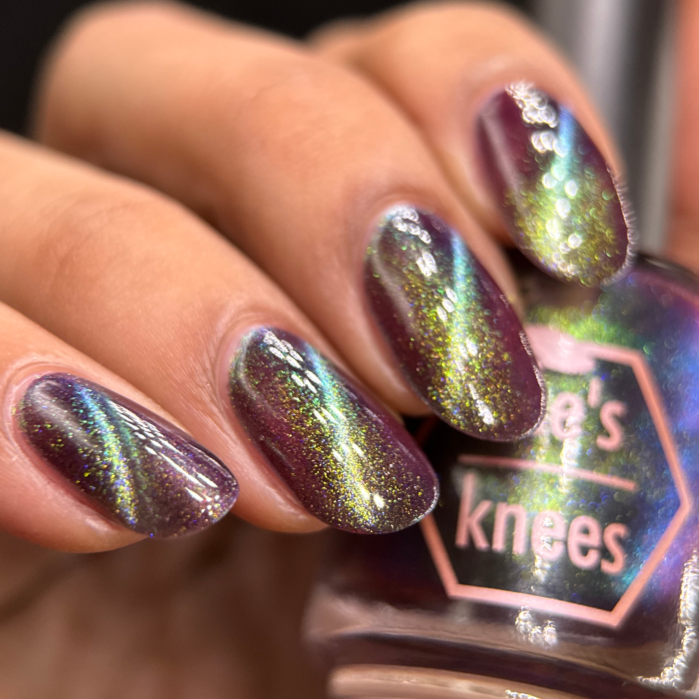 imperial purple with a mosaic magnetic that upon first glance looks like an ordinary green multichrome. When magnetized you will see both a bright green as well as a powder blue magnetic pigment