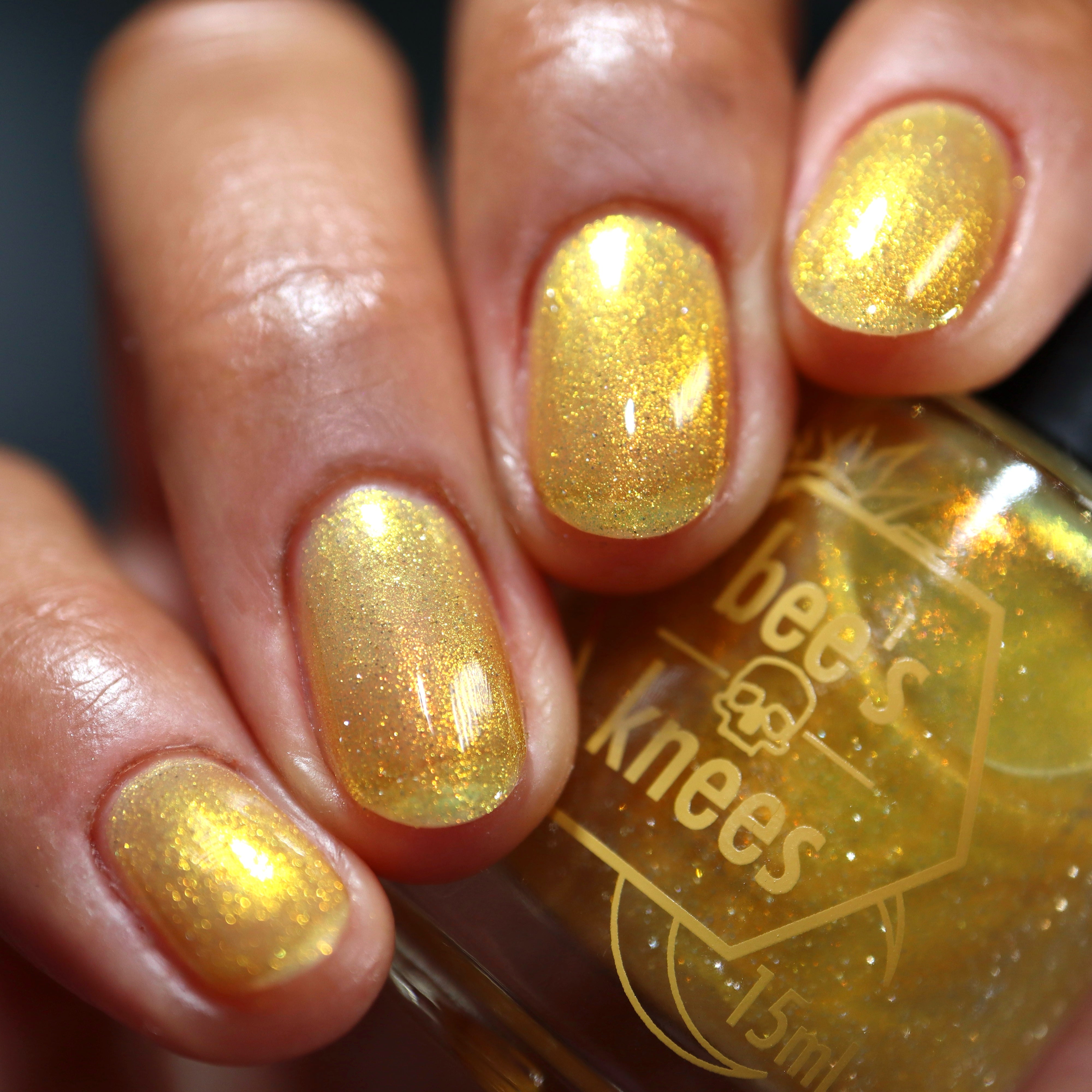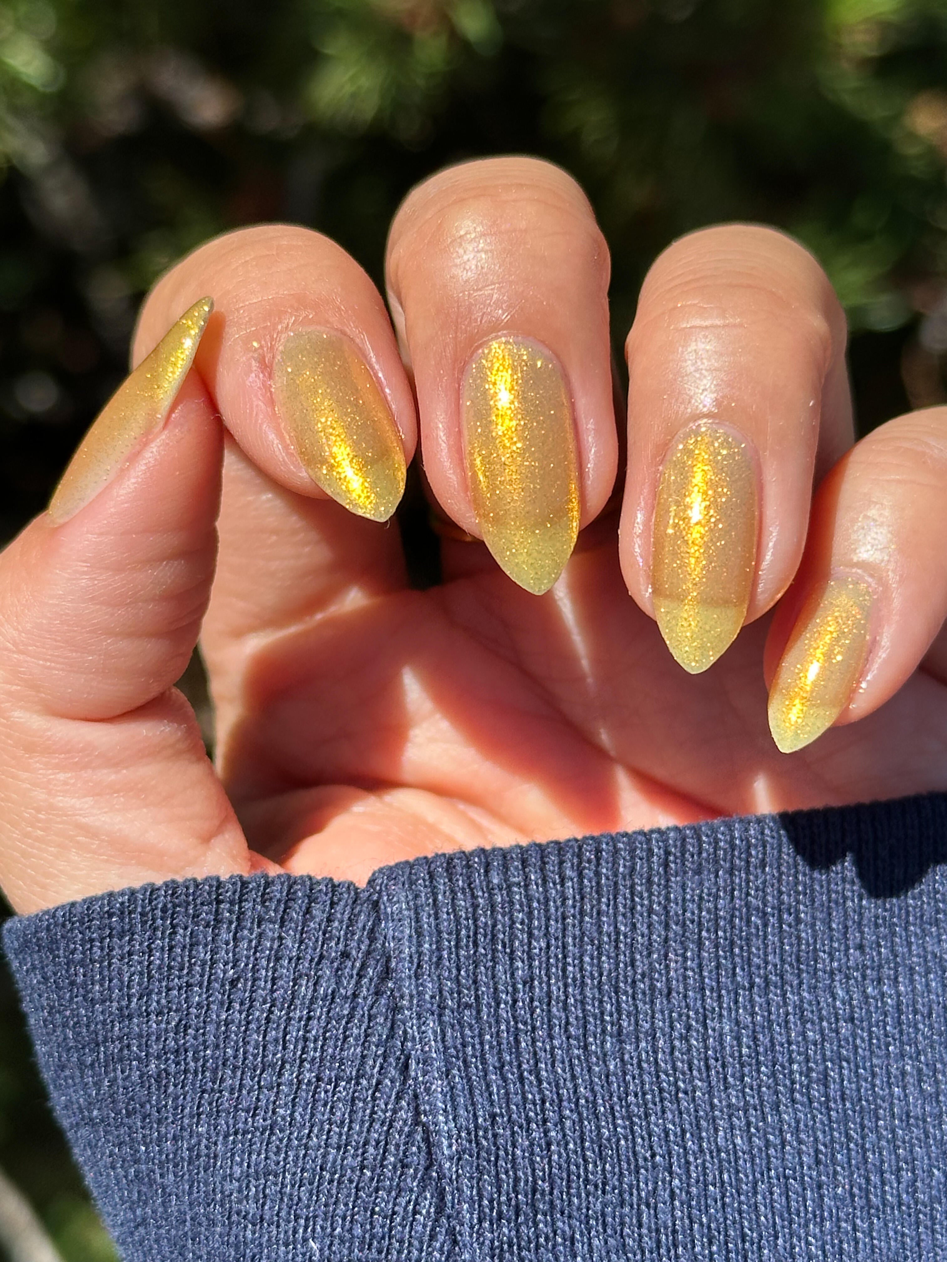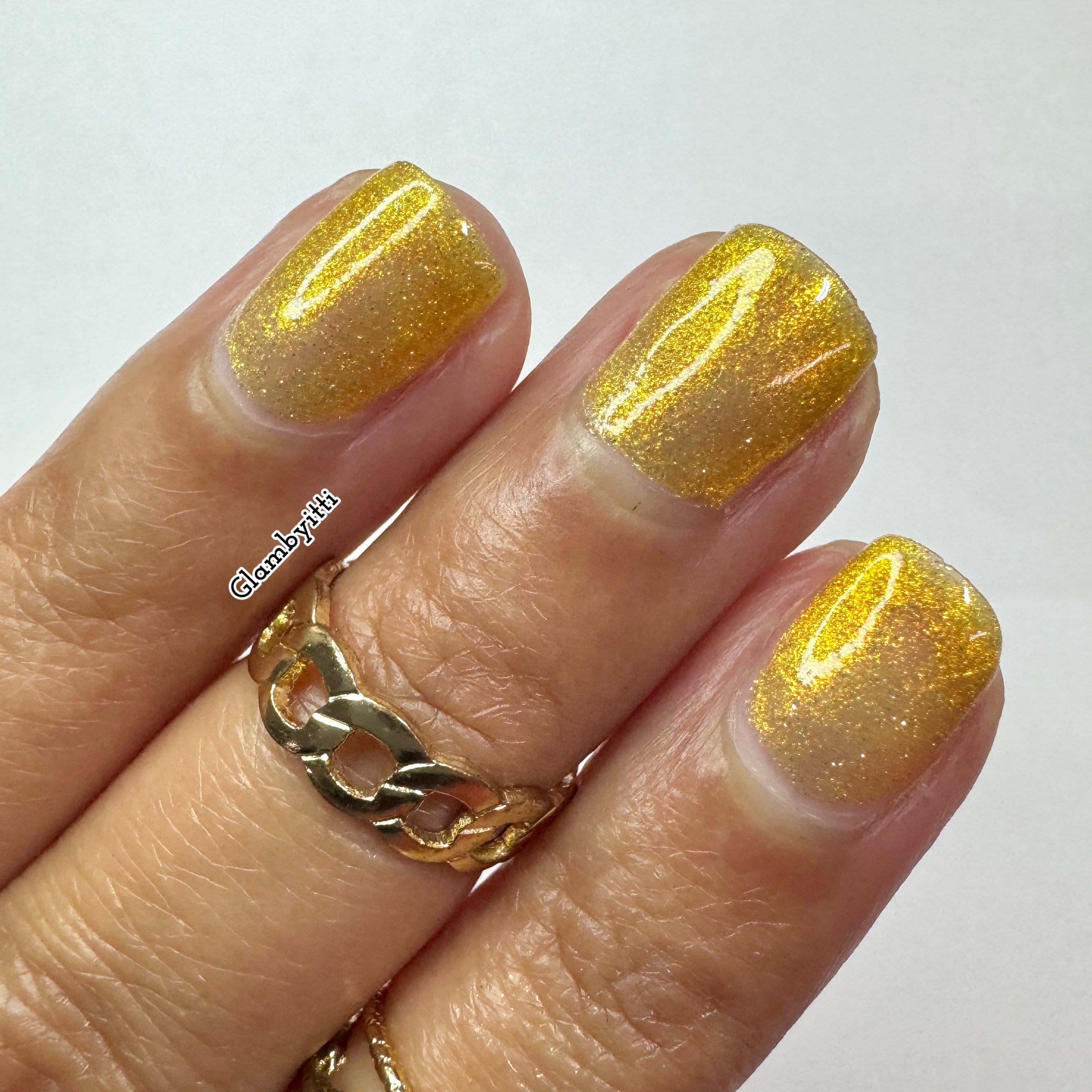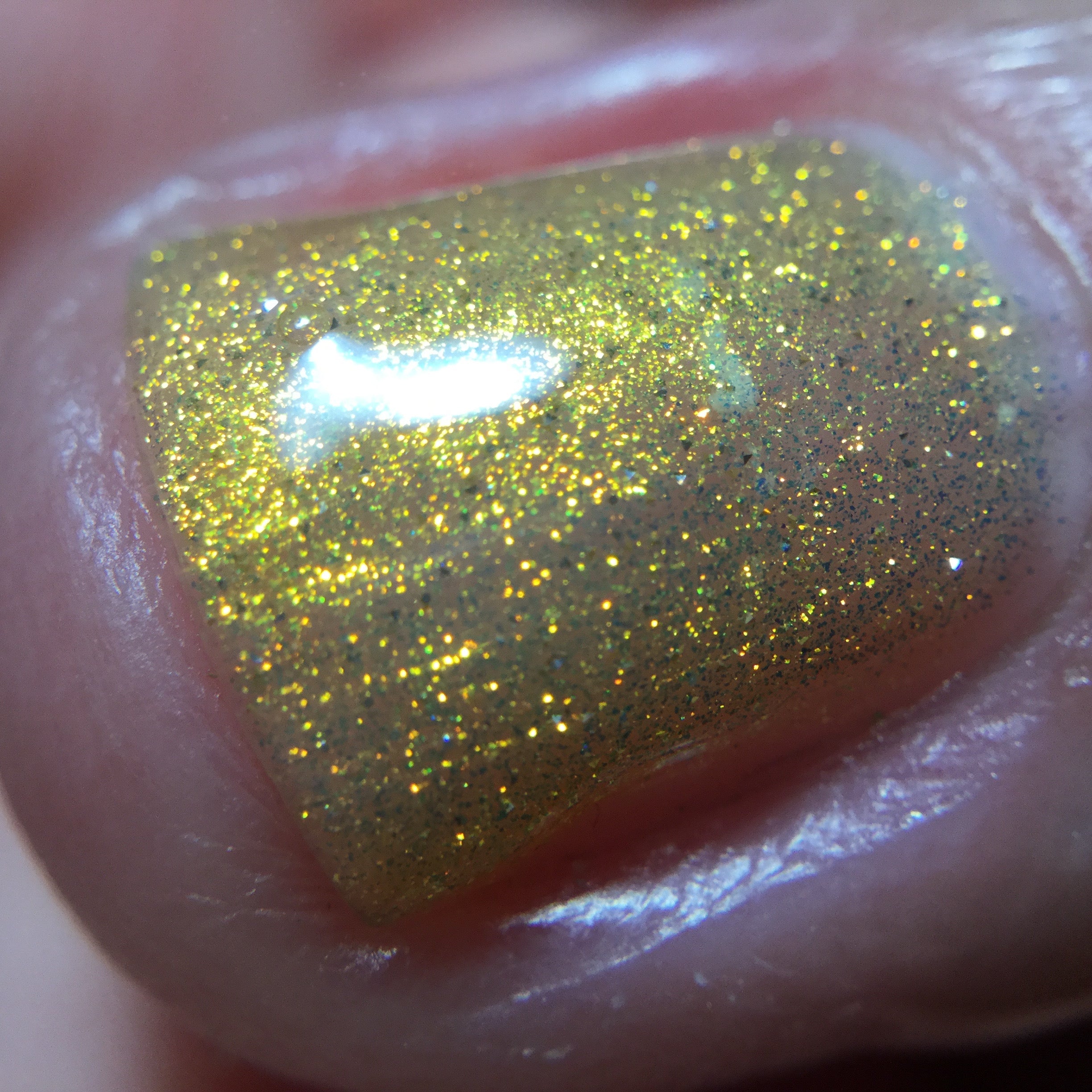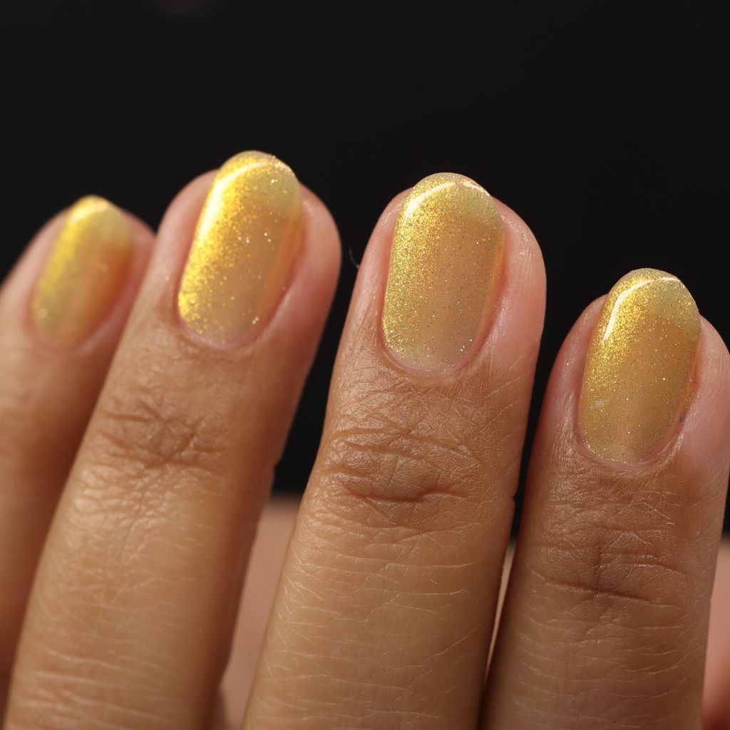 a bright sunny yellow with gold shimmer and a scattering of silver light reflective glitter