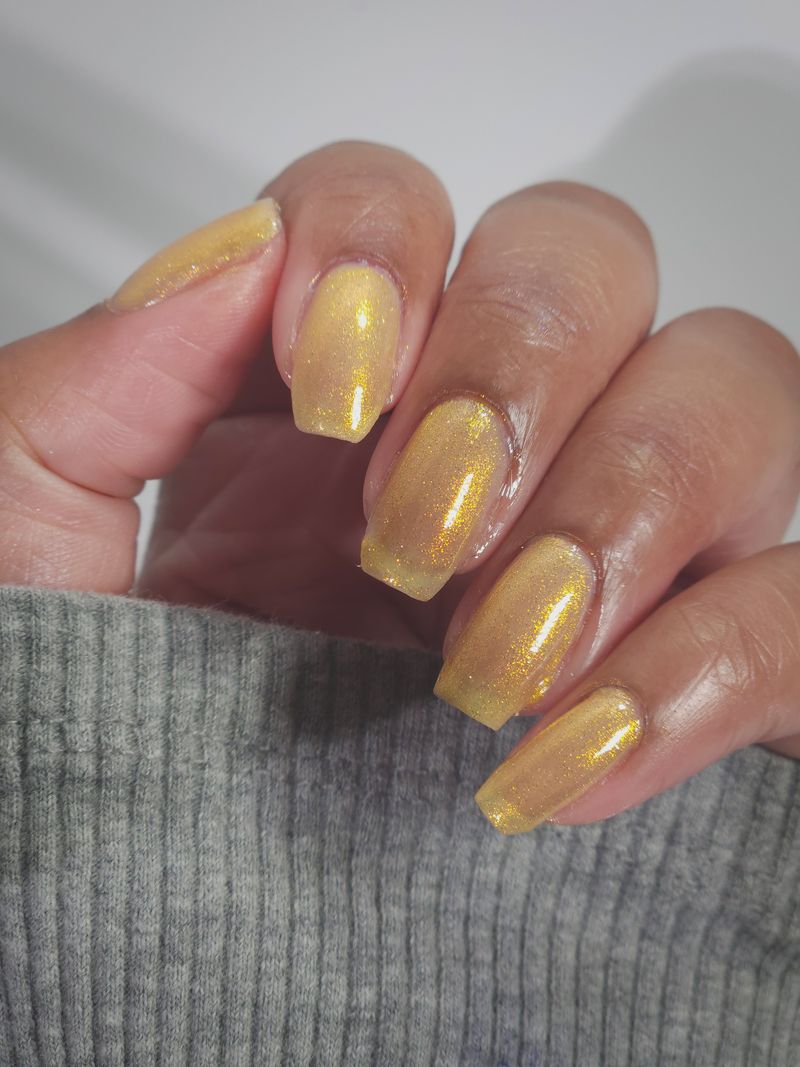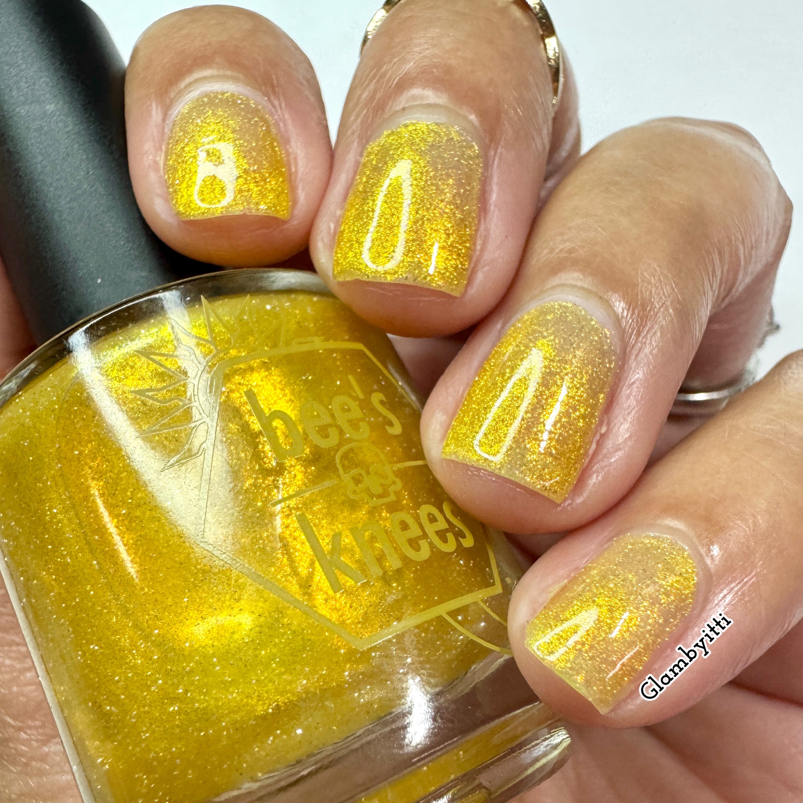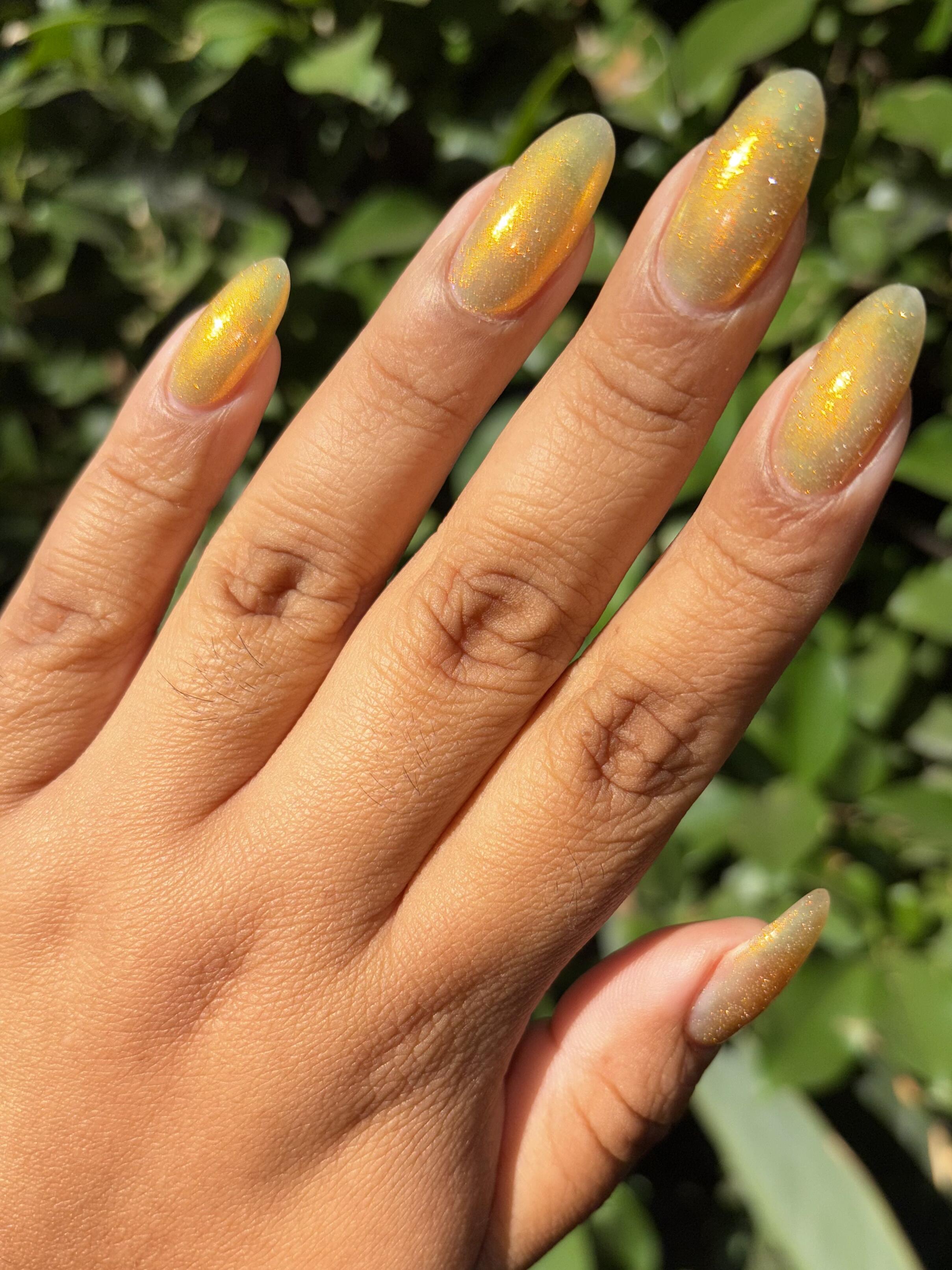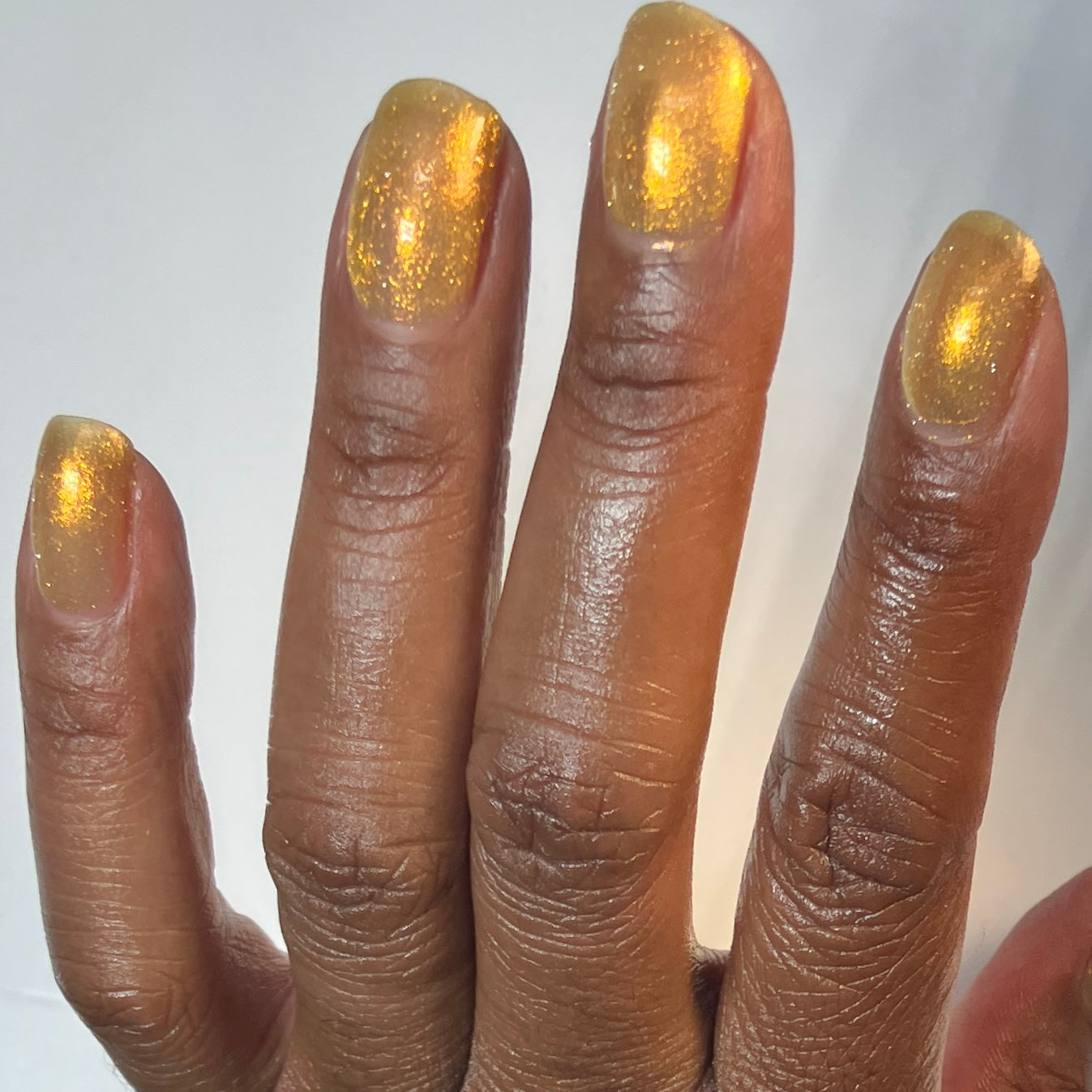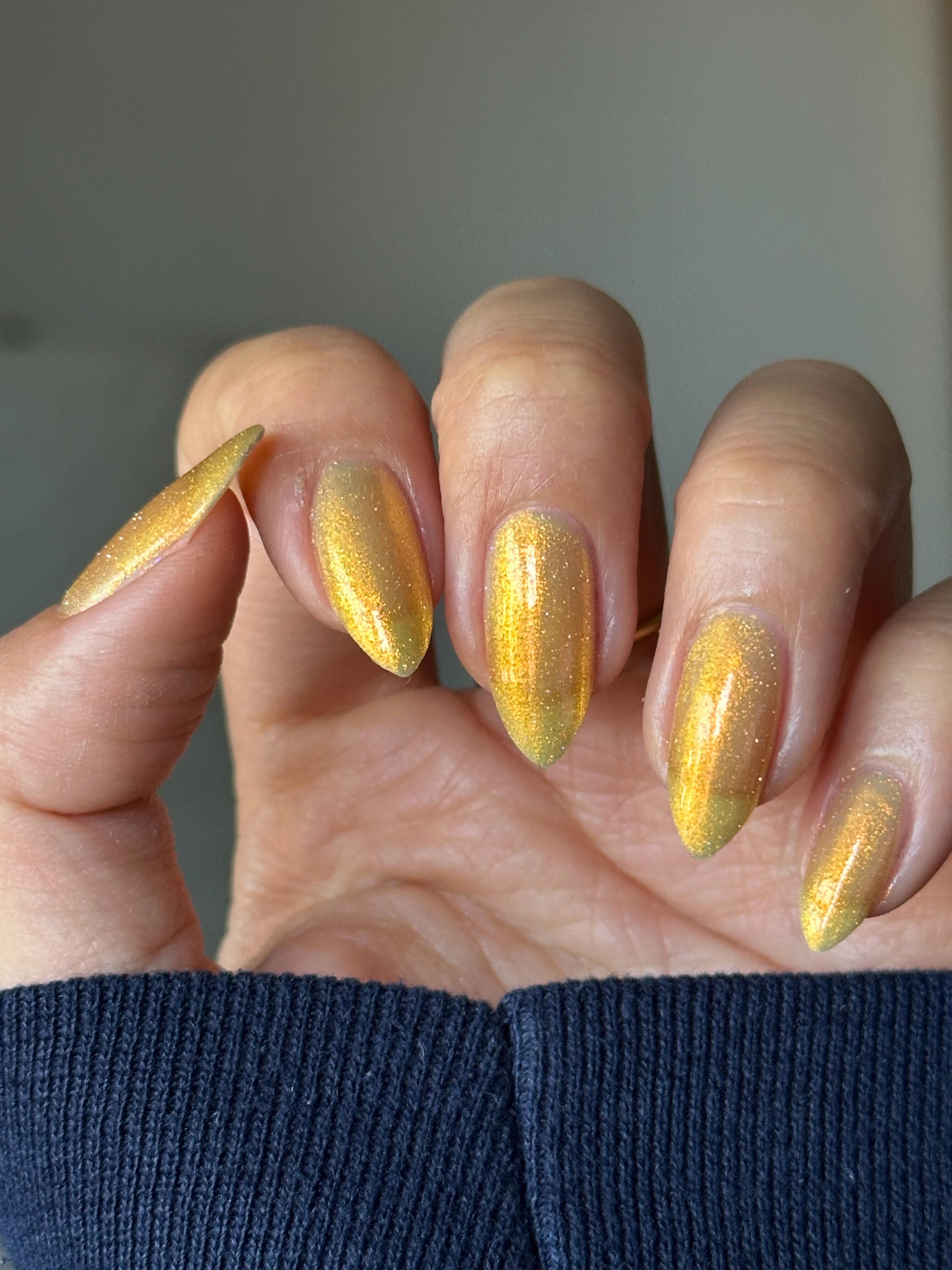 a bright sunny yellow with gold shimmer and a scattering of silver light reflective glitter