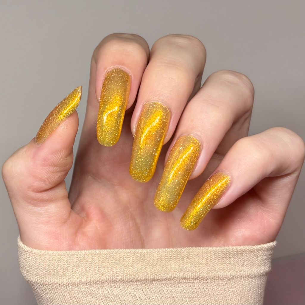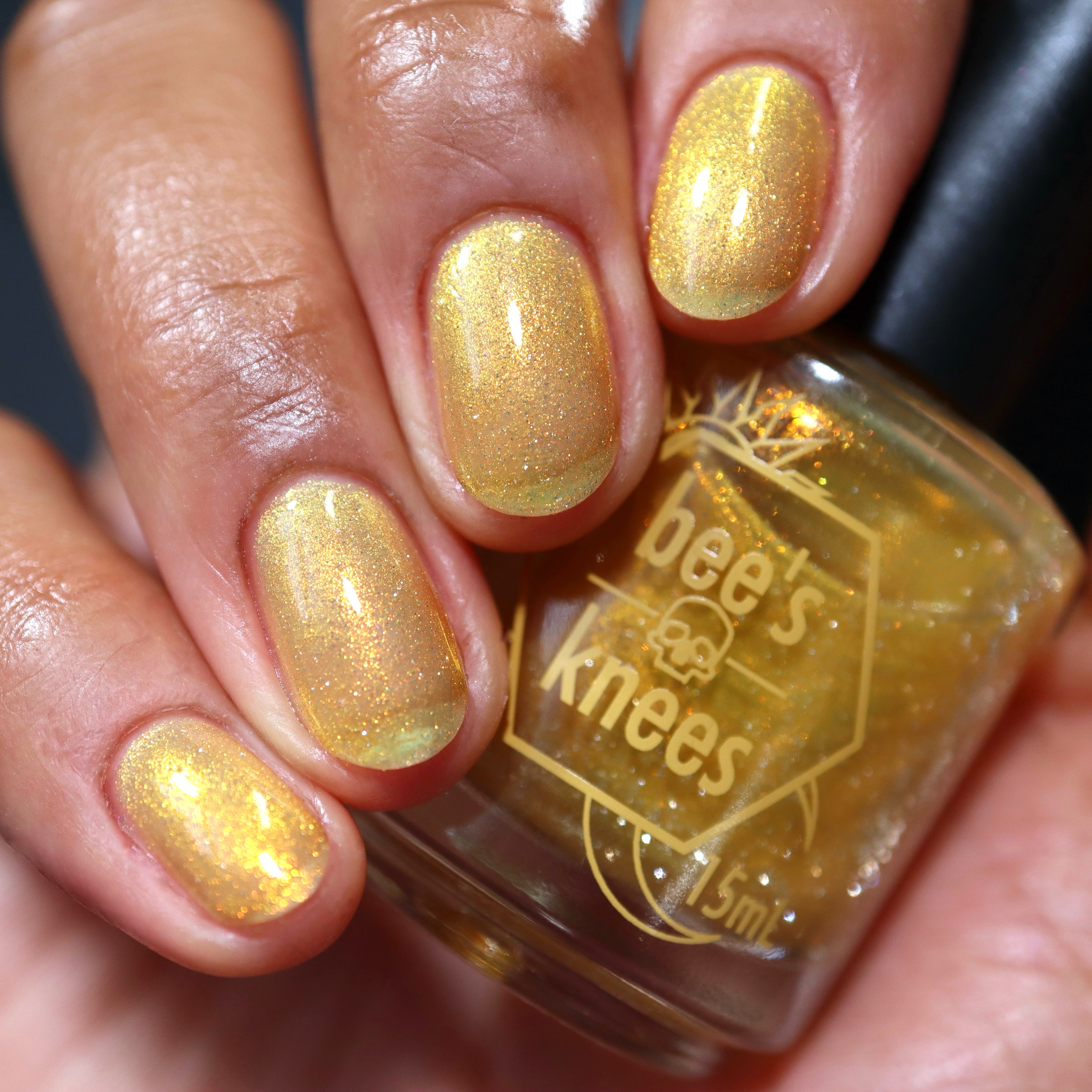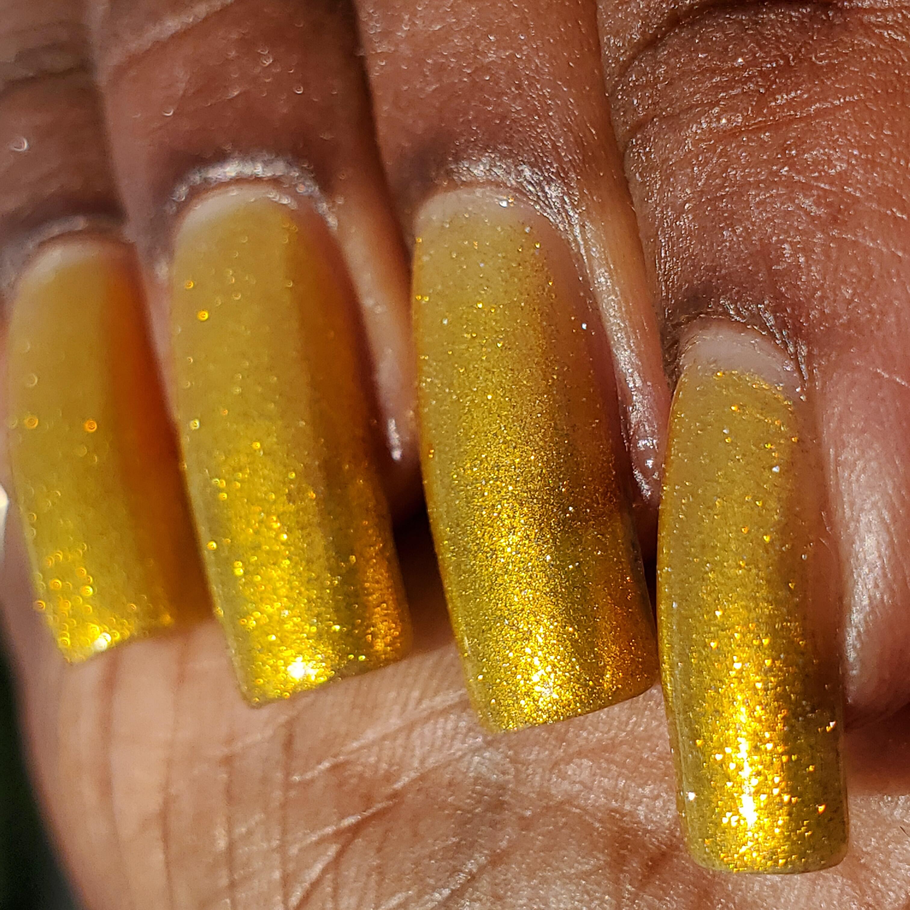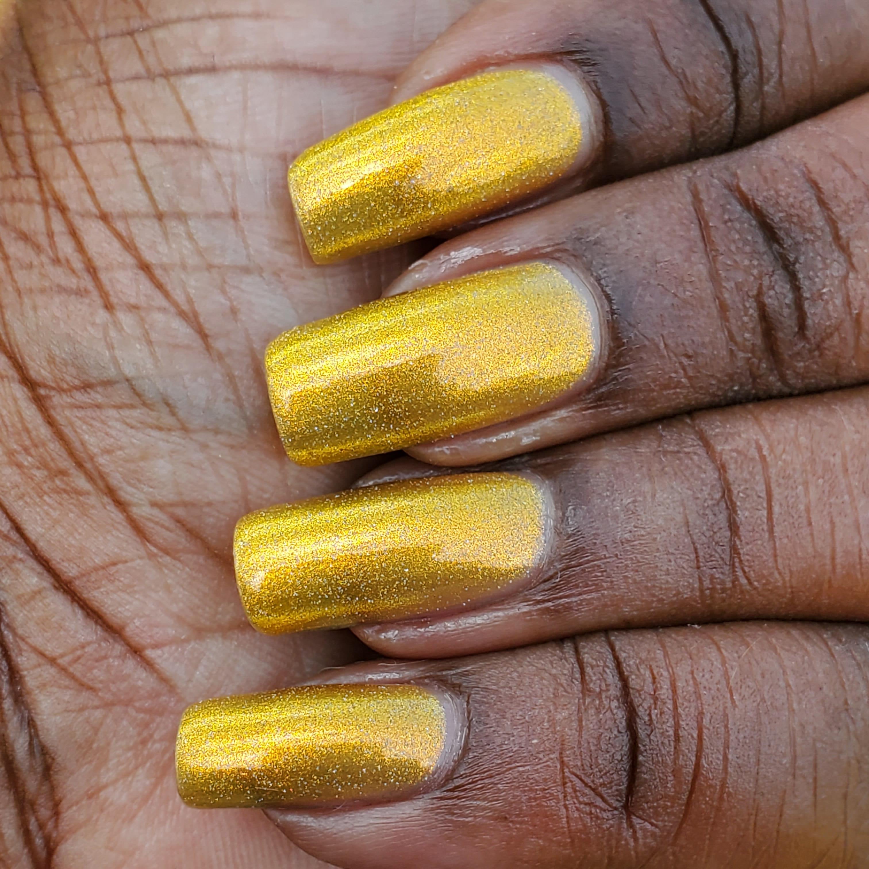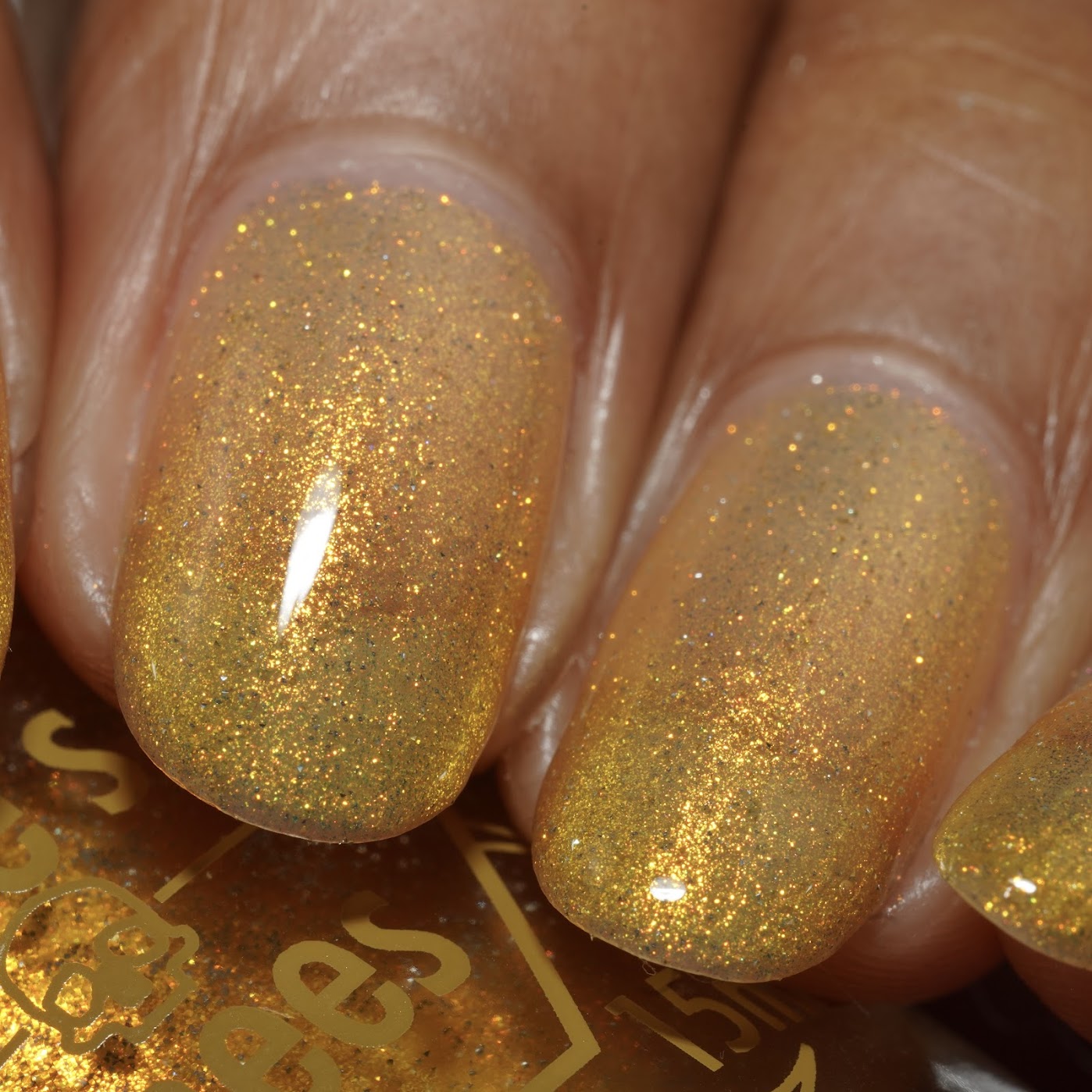 a bright sunny yellow with gold shimmer and a scattering of silver light reflective glitter