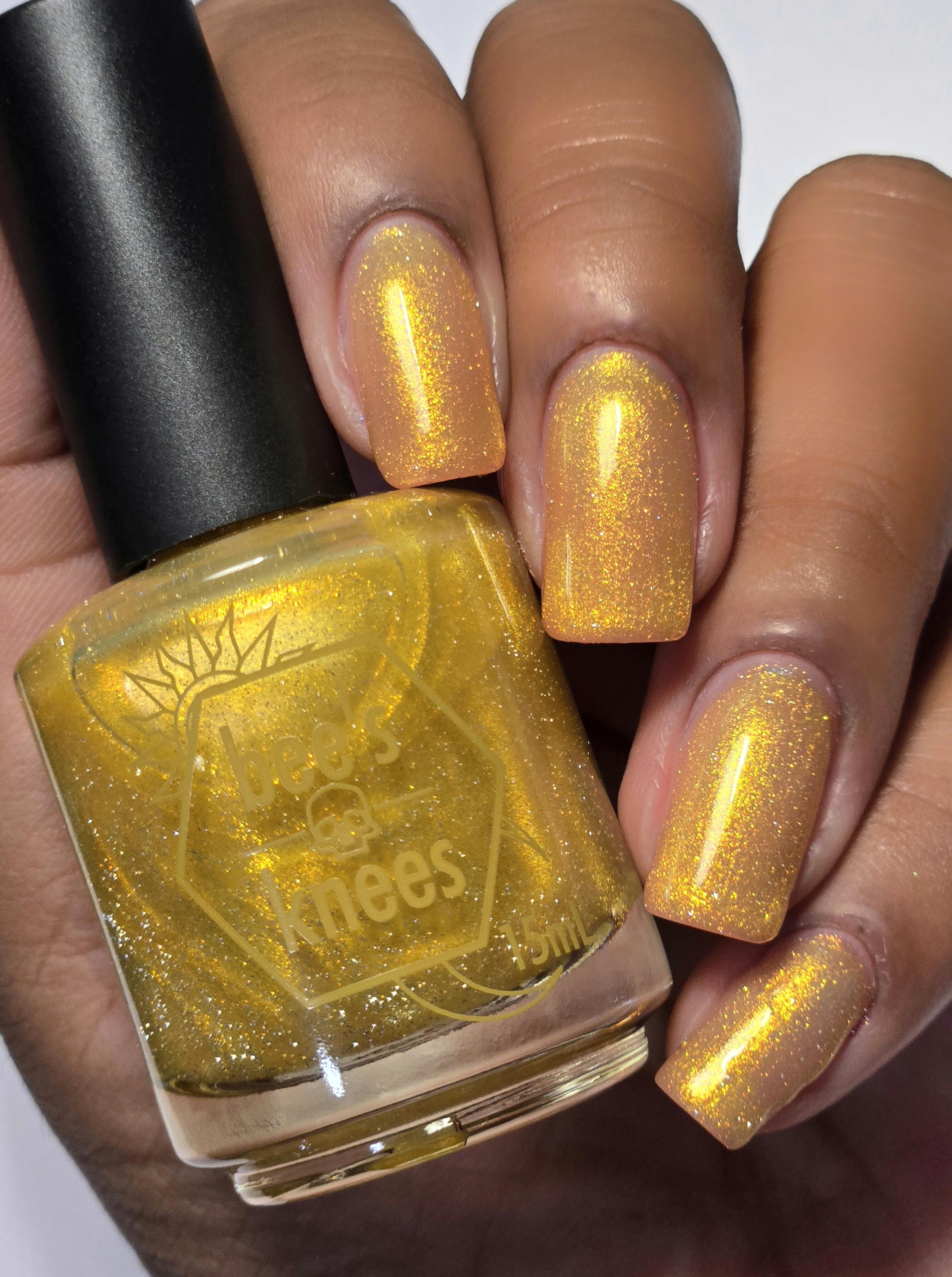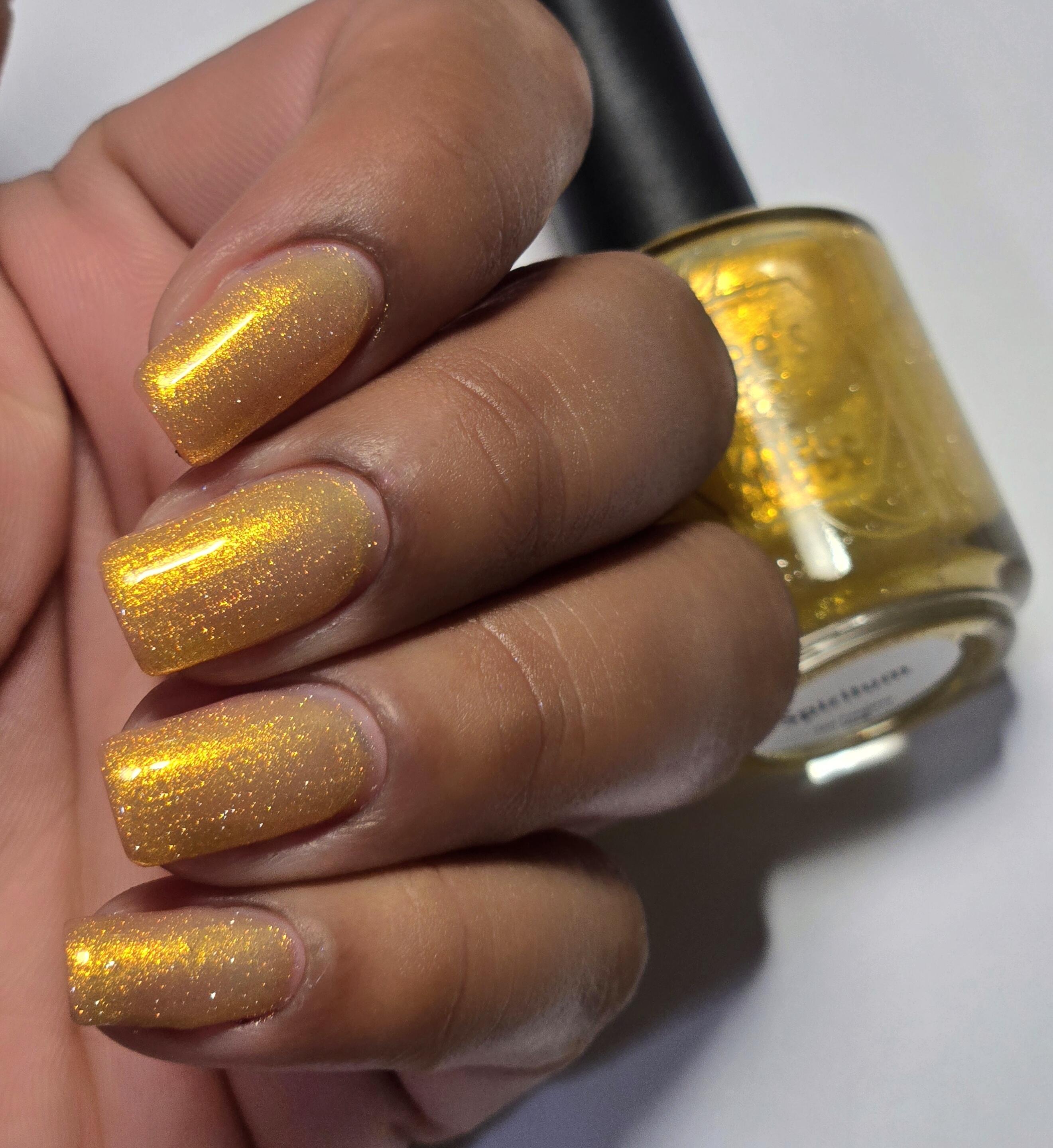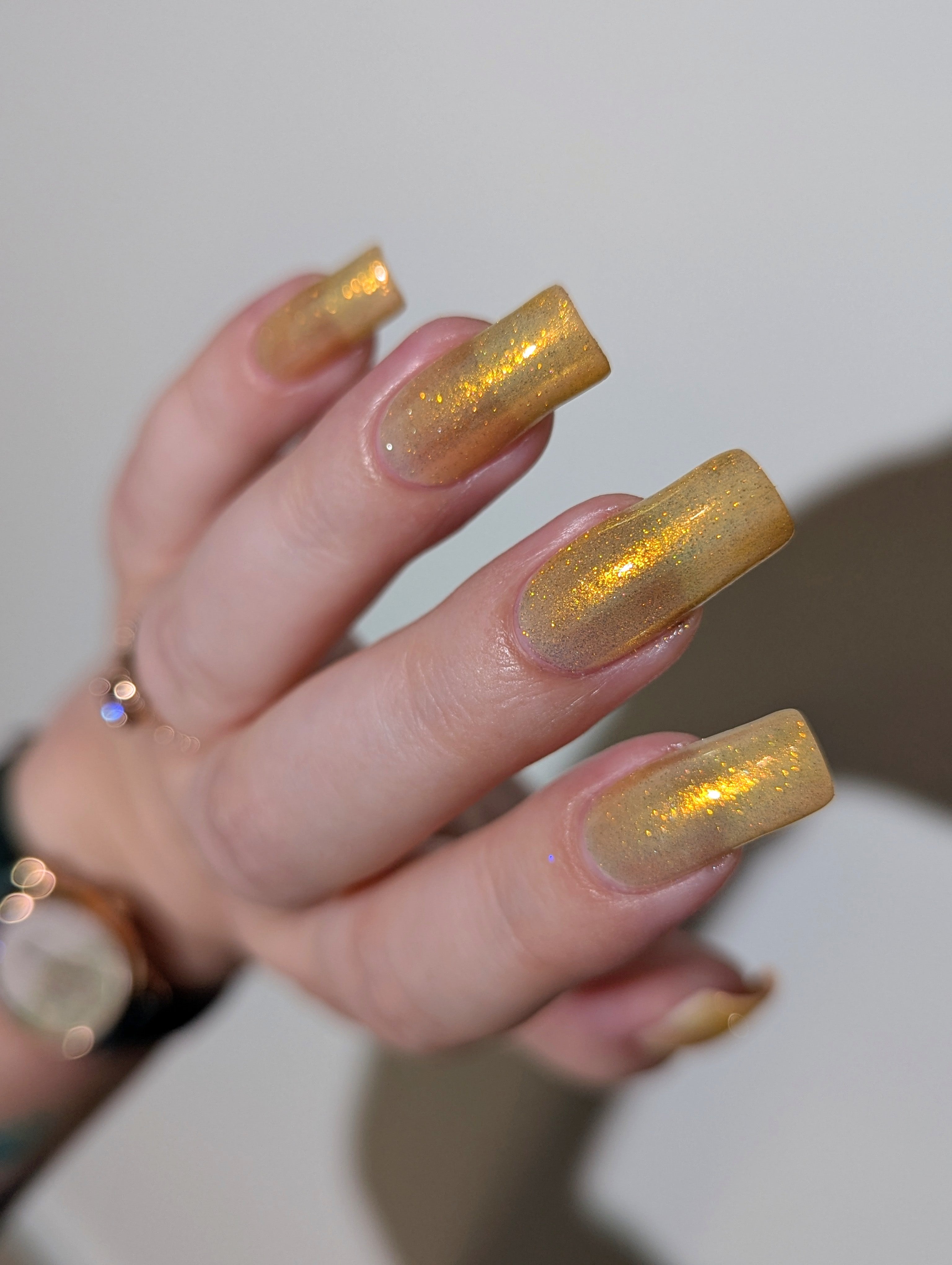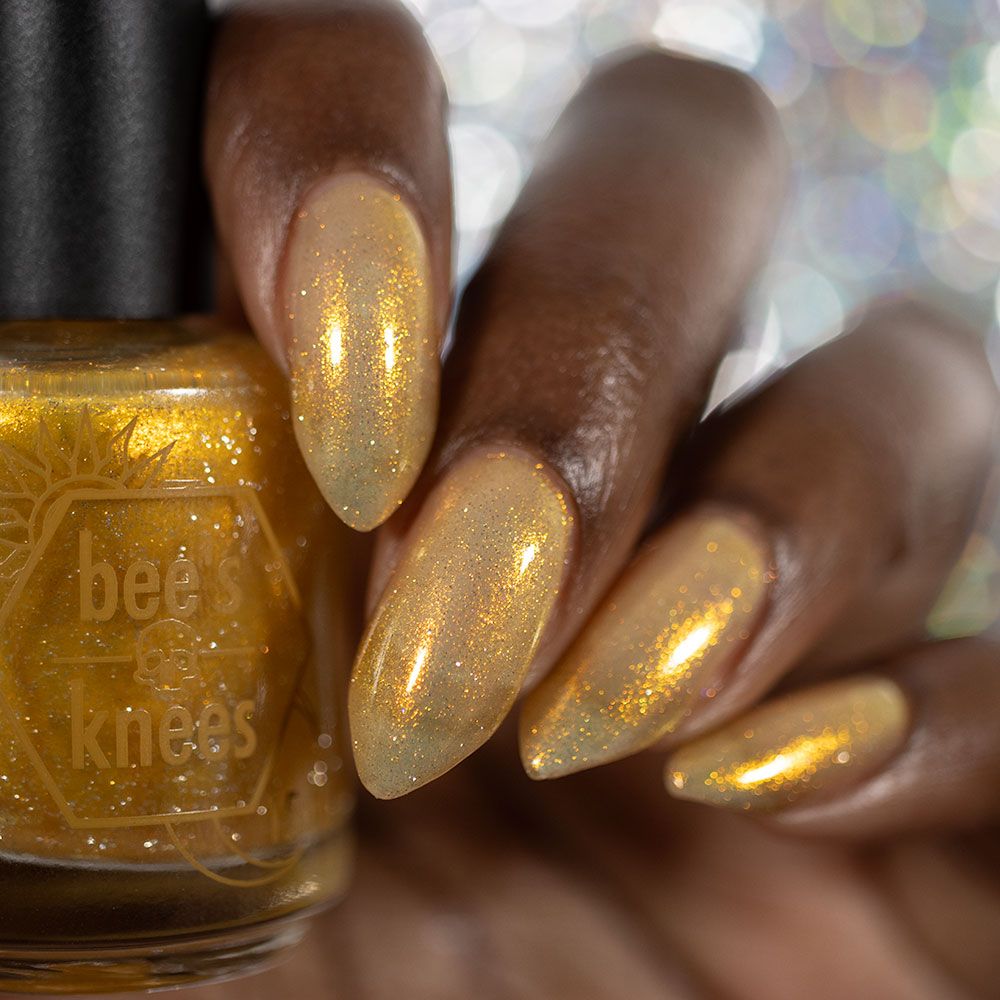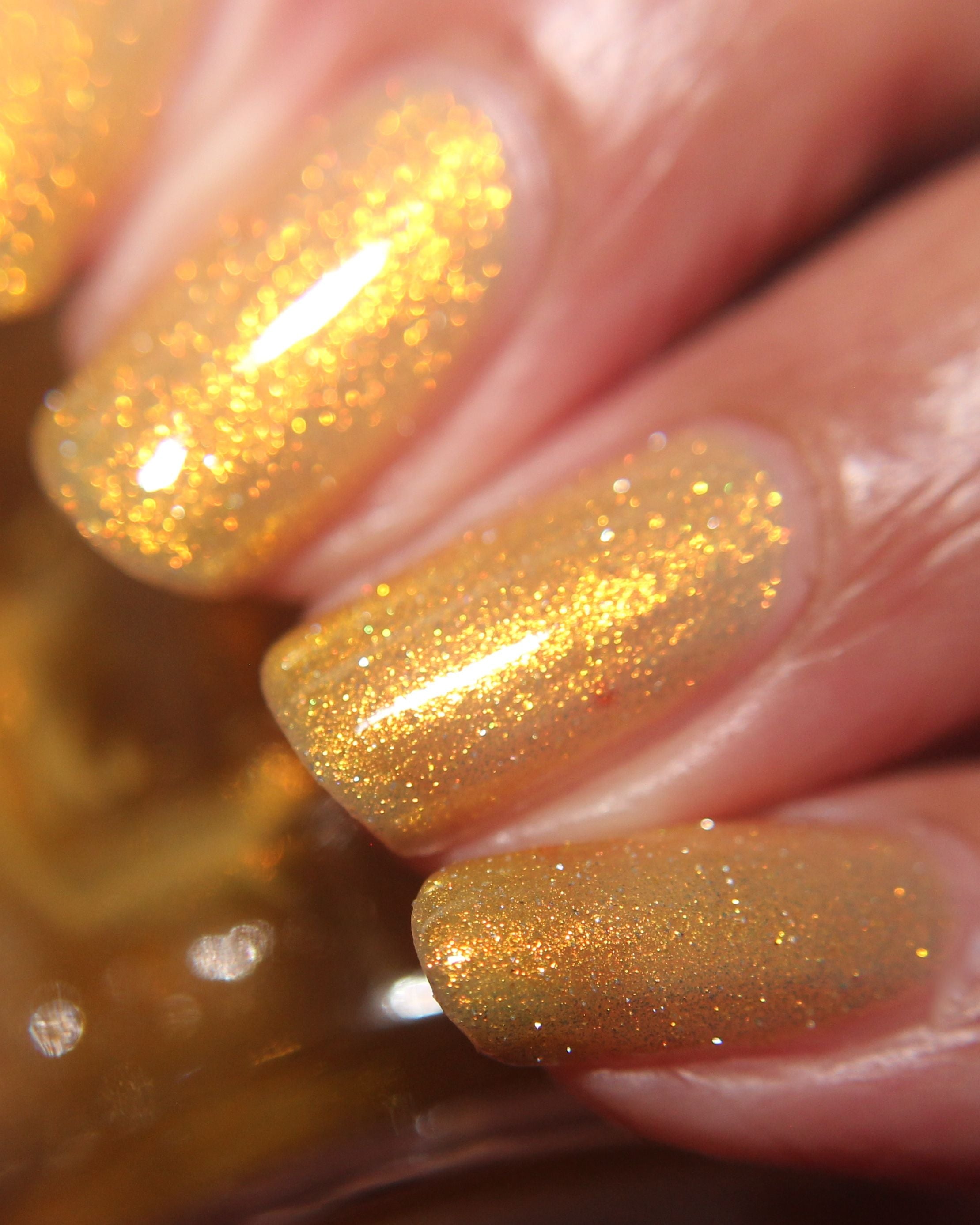 a bright sunny yellow with gold shimmer and a scattering of silver light reflective glitter