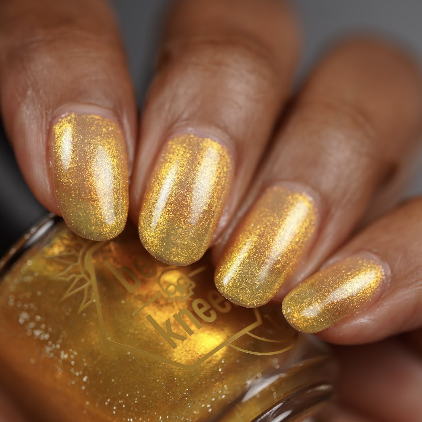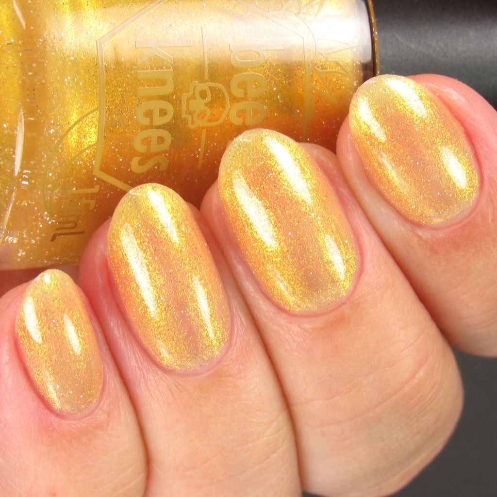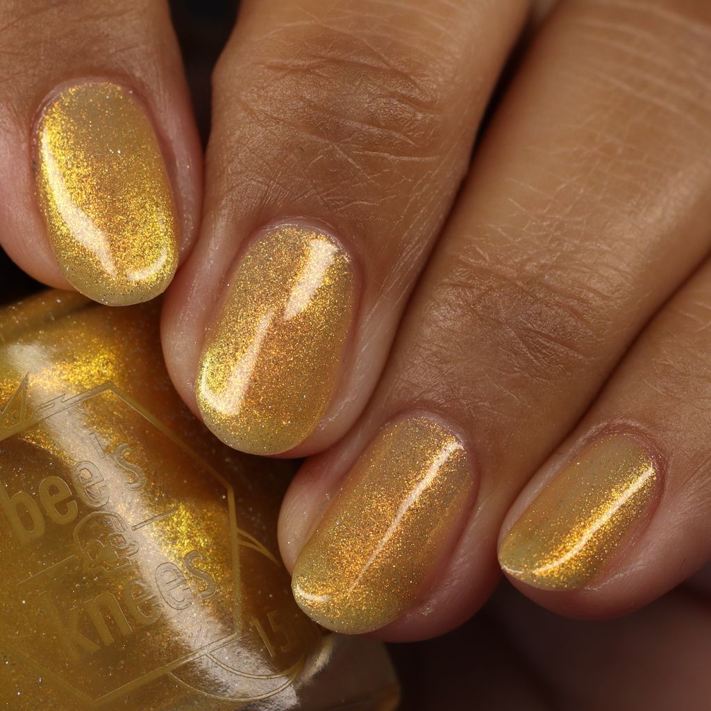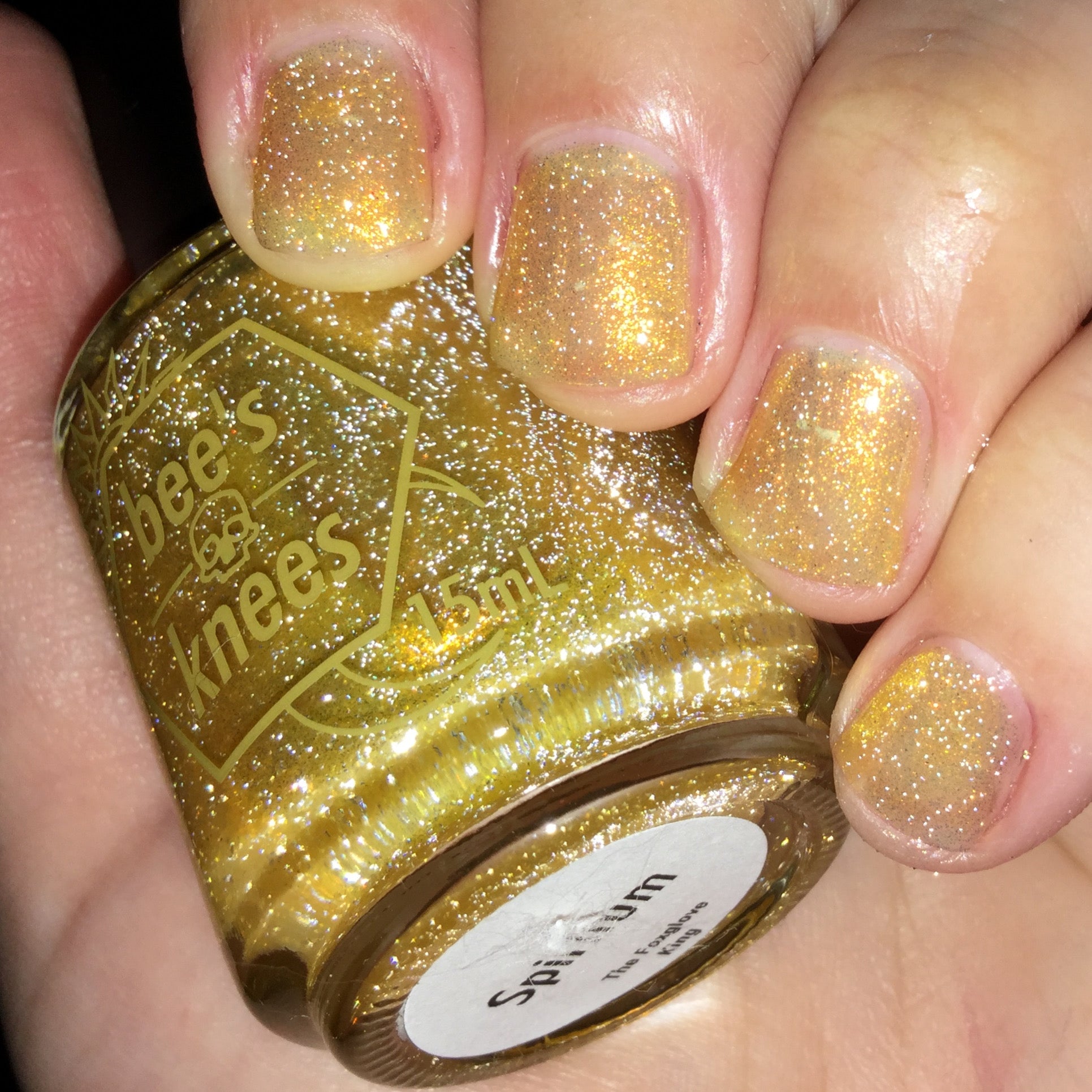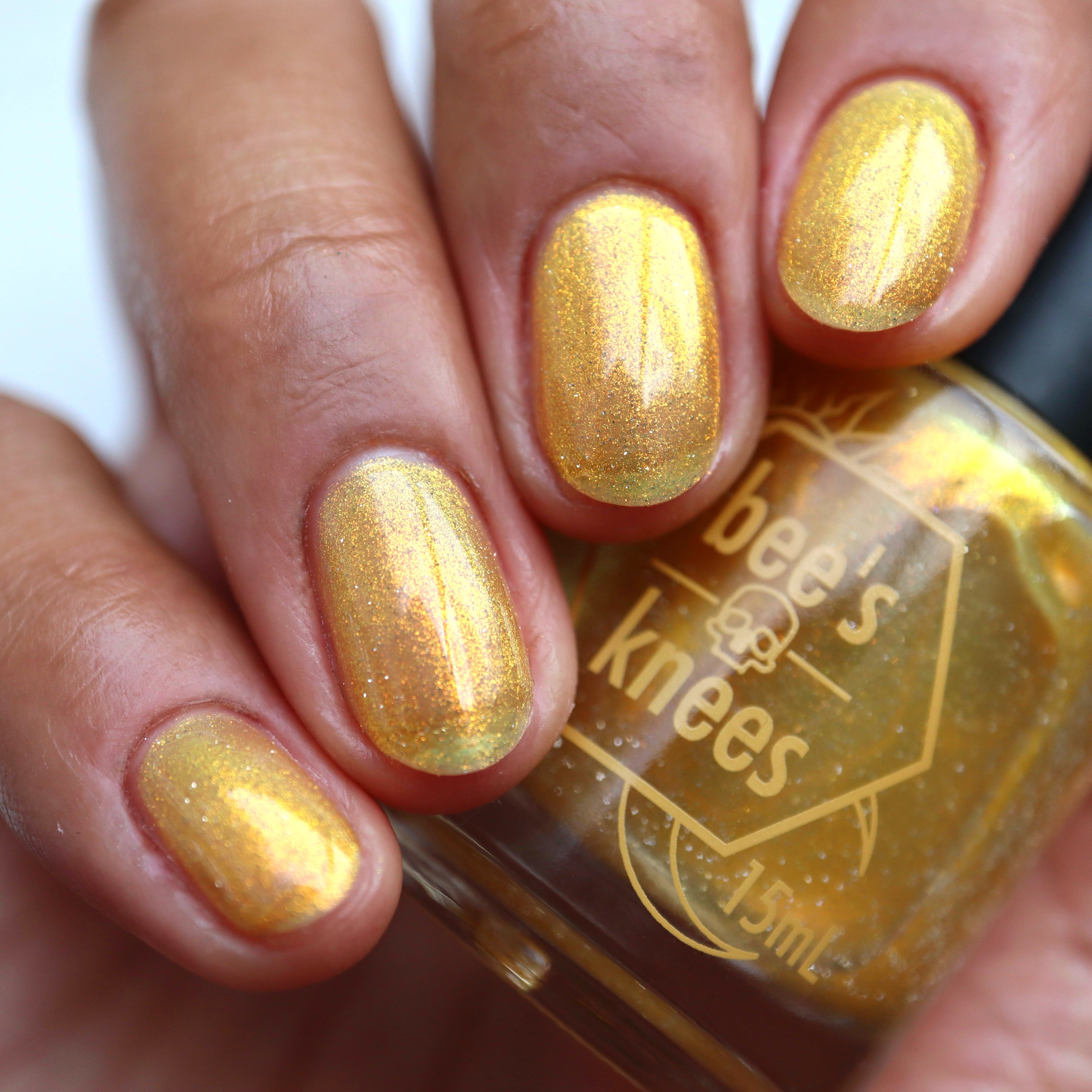 a bright sunny yellow with gold shimmer and a scattering of silver light reflective glitter