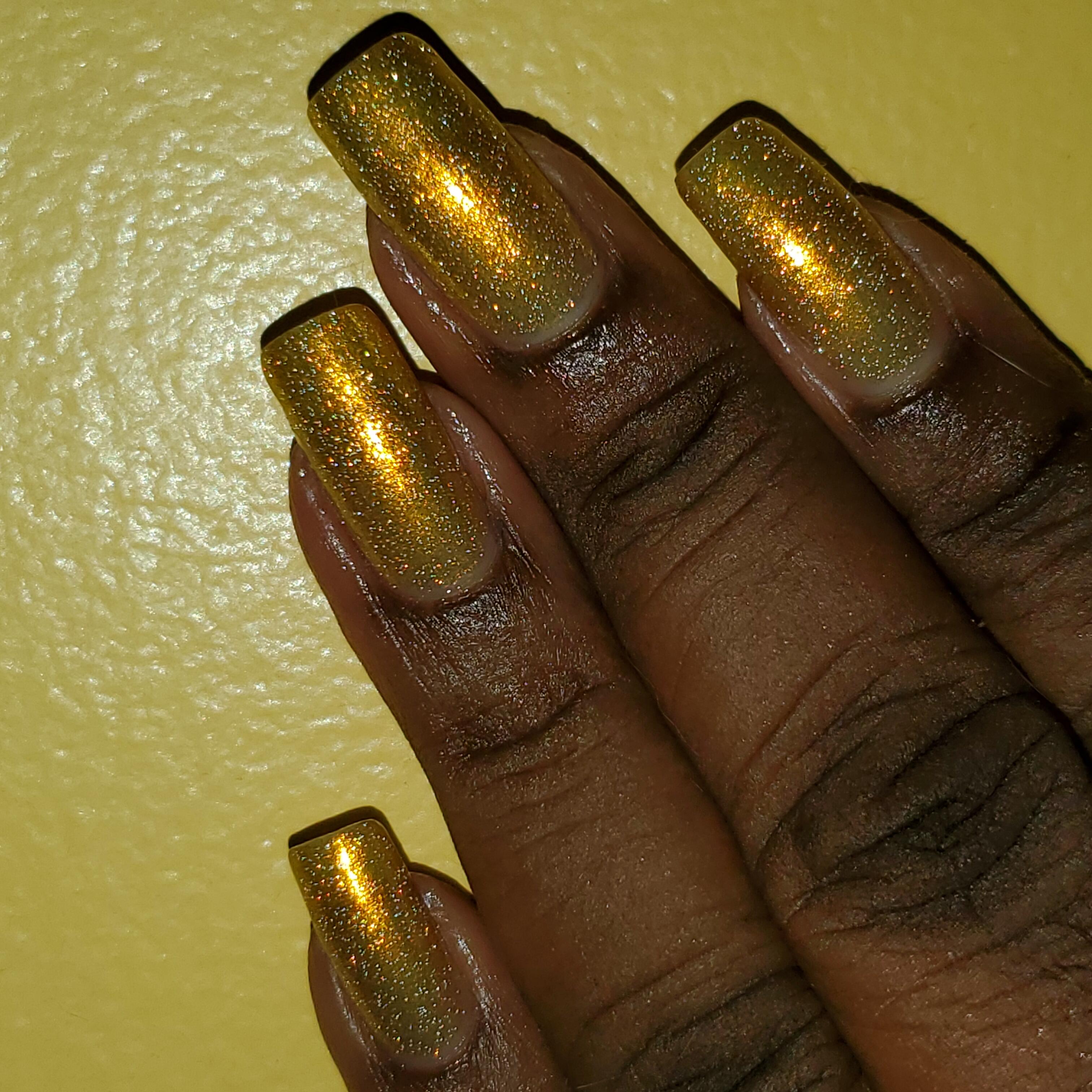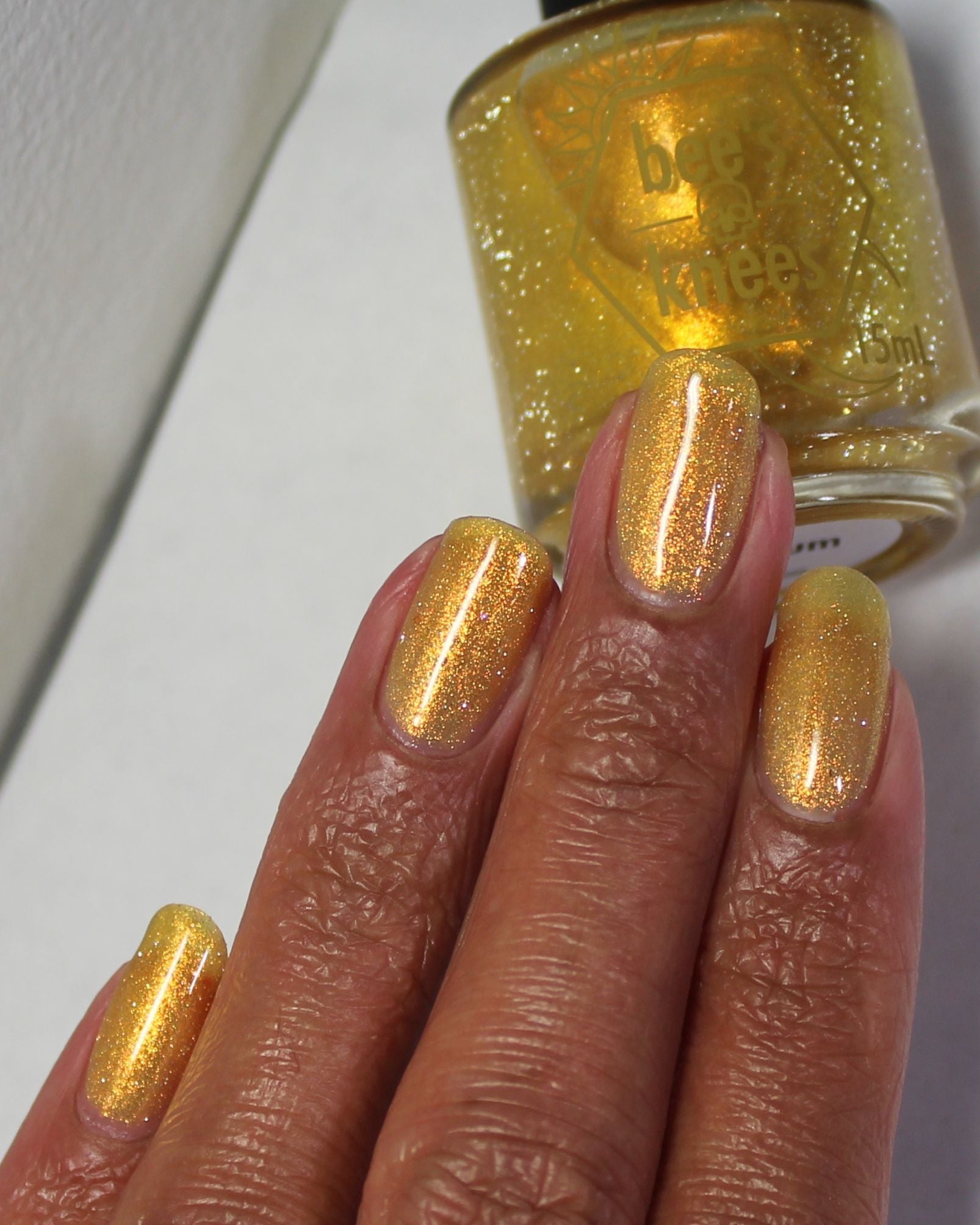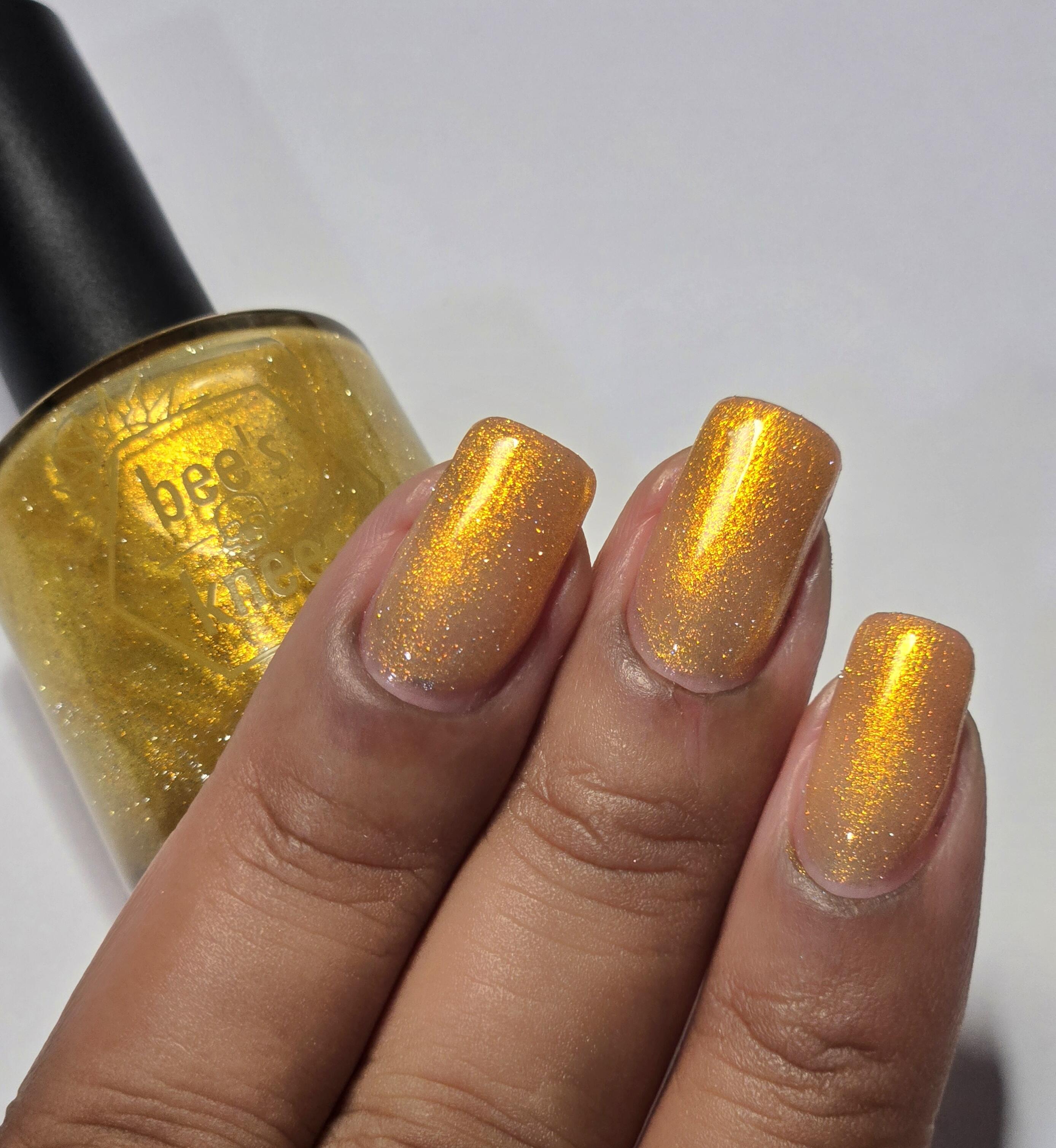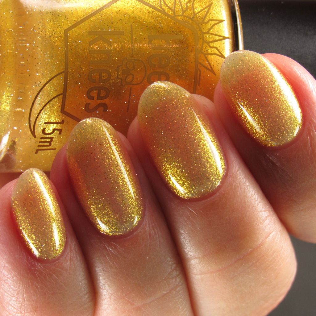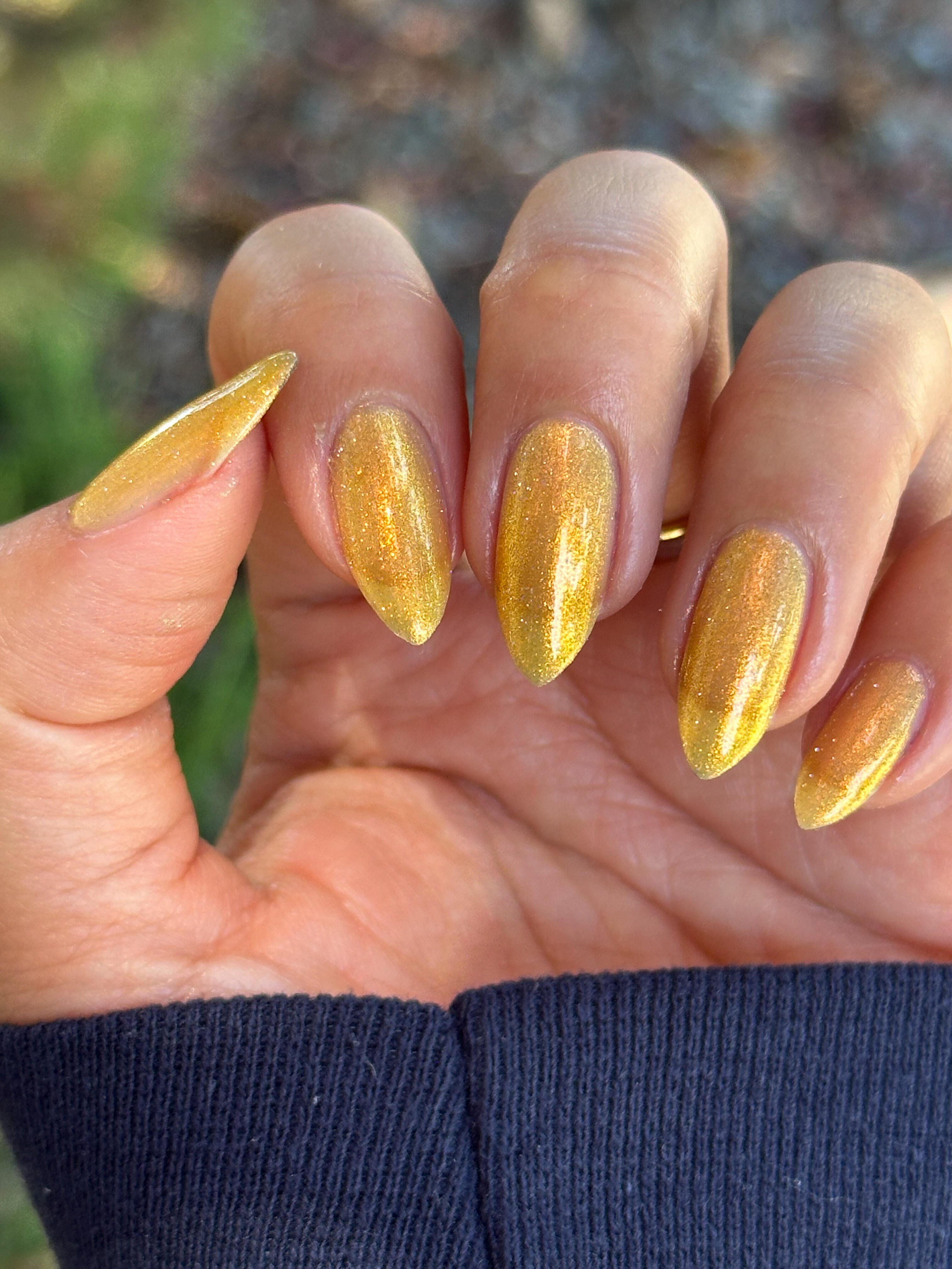 a bright sunny yellow with gold shimmer and a scattering of silver light reflective glitter