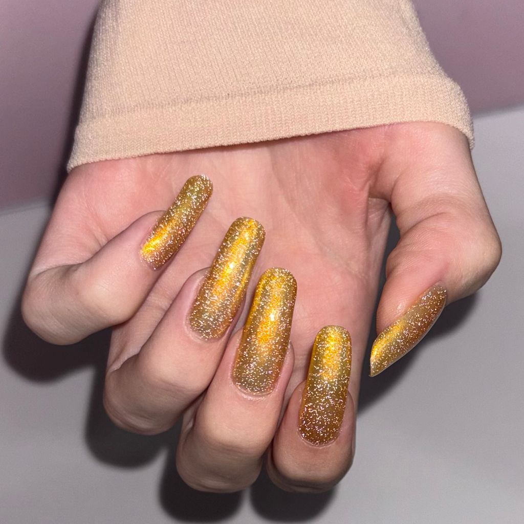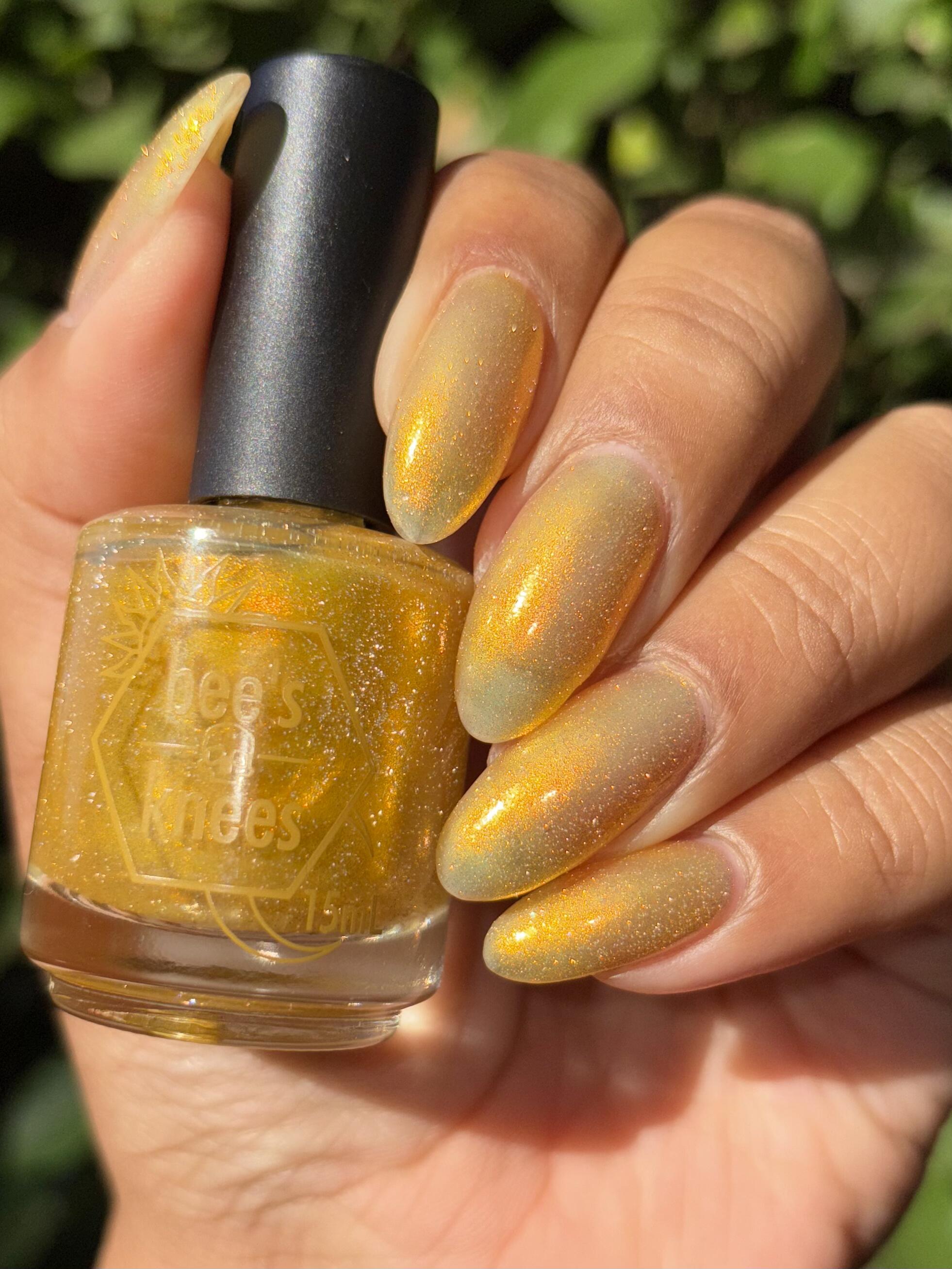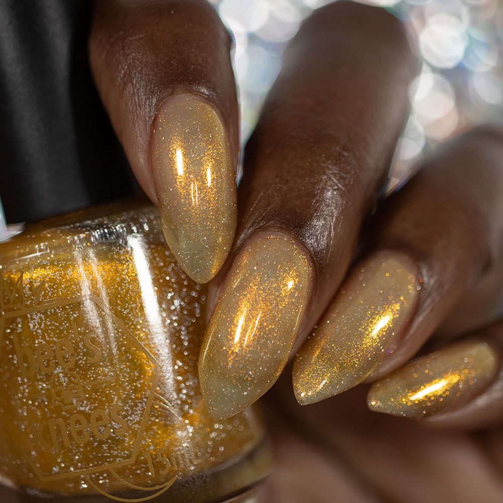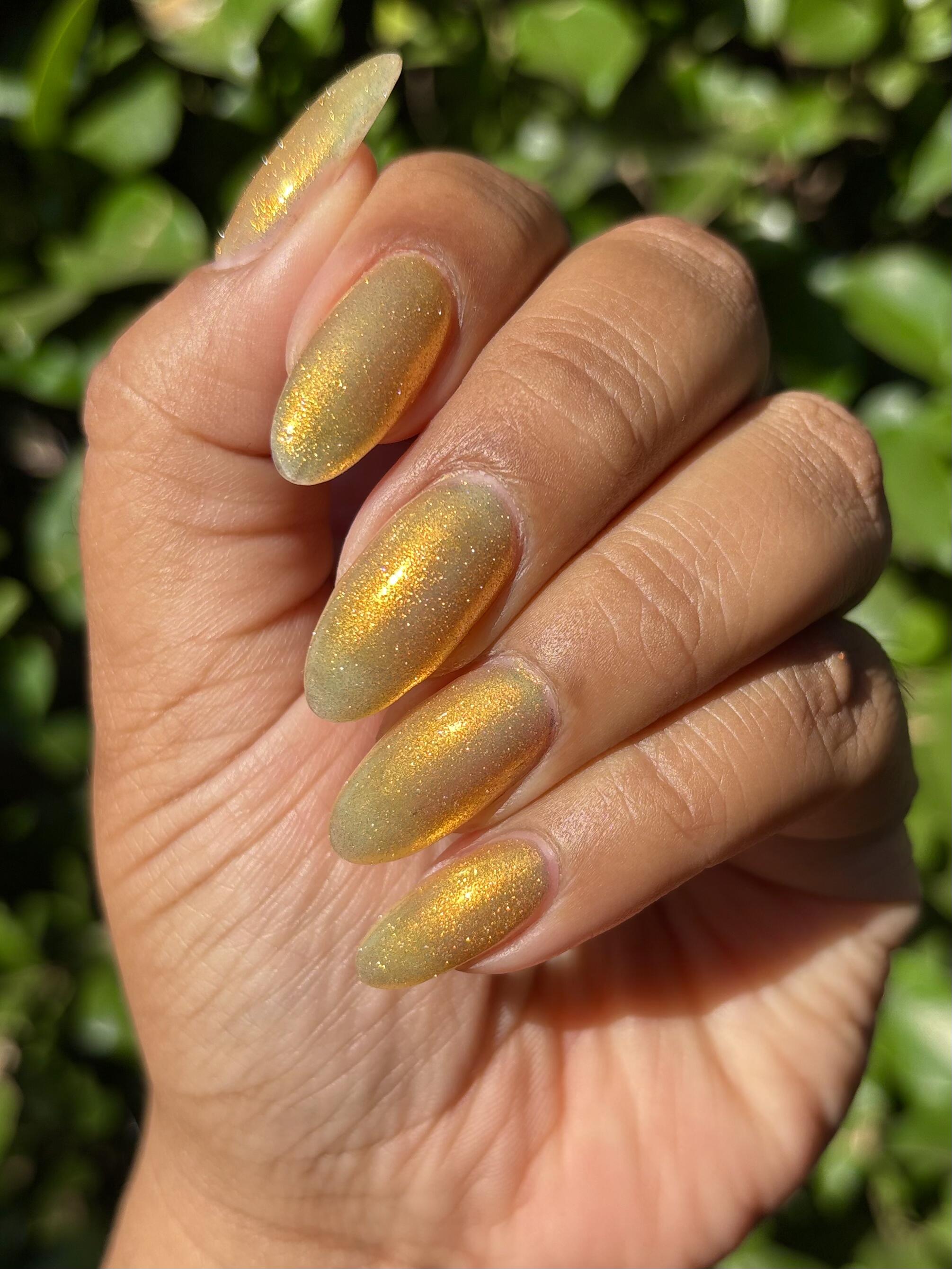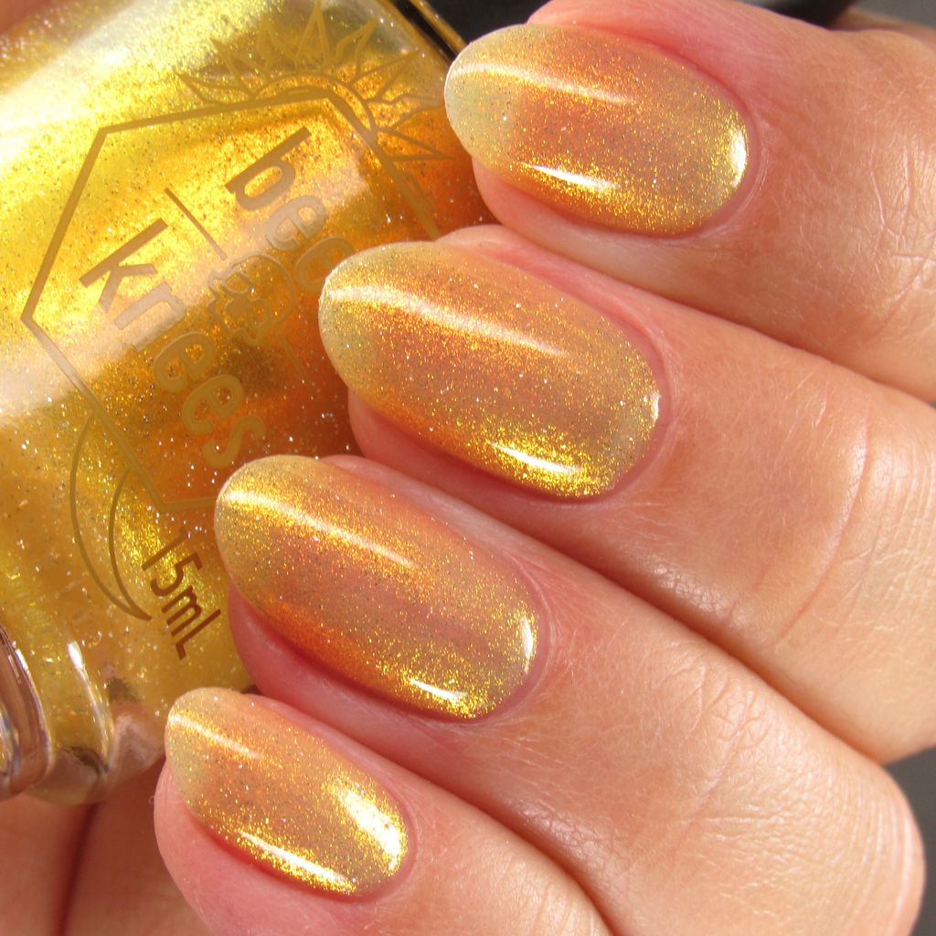 a bright sunny yellow with gold shimmer and a scattering of silver light reflective glitter